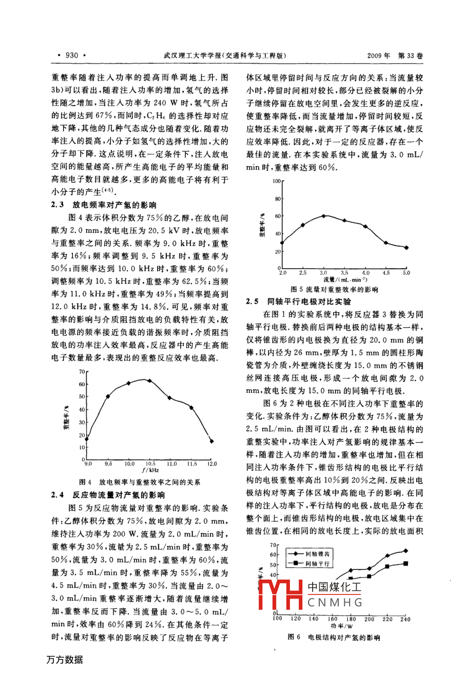 第33卷第5期武漢理工大學學報(駕科)ol. 33 No2009年10月Journal of Wuhan University of TechnologyOet.2009( Transportation Science Engineering含水乙醇低溫等離子體重整制氫研究胡又平12)李格升3)高孝洪3)嚴立1(大連海事大學材料工藝研究所大連116026)(武漢理工大學理學院2武漢430063)(武漢理工大學能動學院3)武漢430063)摘要:基于對含水乙醇等離子體重整制氫的實驗研究,實現(xiàn)了利用錐齒形電極結(jié)構(gòu)介質(zhì)阻擋放電等離子體對乙醇進行重整制氫.實驗結(jié)果表明:乙醇重整效率及產(chǎn)物中氫氣的選擇性與反應物初始濃度、注入功率、電源頻率、反應物流量等因素有關,含水乙醇體積分數(shù)為75%時,氫氣的選擇性最大;氫氣的選擇性隨著反應器中注入功率增加而增大;放電電源的頻率接近負載的諧振頻率時,重整率最高;對一定的反應器,反應物的流鰍太大和太小,都不利于重整反應的進行.錐齒形電極結(jié)構(gòu)介質(zhì)阻擋放電等離子體反應器的重整效率高于同軸平行電極.乙醇等離子體重整制氫的主要氣態(tài)產(chǎn)物有H2,CO,CH4,CO2,C2H4,C2H4等,在乙醇體積分數(shù)為75%放電間距為2.0mm,頻率為10.5kHz,注入功率為240W的條件下,得到重整率為65%,產(chǎn)物中氫的體積比為67關鍵詞:乙醇重整制氫;等離子體;錐齒形電極中圖法分類號:U664.122DOI:10.3963/j.issn.1006-2823.209.05,0290引言1實驗系統(tǒng)作為一種可再生的生物能源,乙醇的開發(fā)利錐齒形電極介質(zhì)阻擋放電含水乙醇重整制氫用已成為當今能源研究領域的熱點.目前我國部研究的實驗系統(tǒng)如圖1所示,容器1中的含水乙分地區(qū)推廣使用的乙醇汽油方案,是在汽油中添醇經(jīng)過蒸發(fā)器2變成蒸氣,進入到錐齒形電極介加10%的純乙醇,可以實現(xiàn)載運工具上部分替代質(zhì)阻擋放電反應器3中,經(jīng)等離子體處理后的產(chǎn)化石能源.這一方案所使用的純乙醇成本較高物流過冰水冷凝器9后,進入產(chǎn)物收集器10.反且只能實現(xiàn)部分替代化石能源,為此,本文提出了應器的高壓端接自制的高頻高壓電源4,放“含水乙醇富氫燃料發(fā)動機”技術路線,是將含水乙醇通過等離子體重整變?yōu)楦粴涞娜剂蠚怏w直接供給汽車發(fā)動機燃燒.這一技術路線的實現(xiàn),可以利用較低成本的含水乙醇對化石能源部分或完全替代,而且不需改變現(xiàn)有的發(fā)動機結(jié)構(gòu)和載運工具的燃料供給方式,供給汽車發(fā)動機的富氫燃料是含氫量低于60%的富氫氣體,不同于以氫為燃料的電動汽車必須是高純度的氫氣,有可能成為氫燃料汽車之前的過渡方案.本文是在前期對錐齒形介質(zhì)阻擋放電特性研究的基礎上(,實驗圖1乙醇重整實驗系統(tǒng)圖研究含水乙醇低溫等離子體重整制氫的影響因素器2蒸發(fā)器:3反應器;4高壓電源;5示波器:6計算機;;10-產(chǎn)物收集及其規(guī)律中國煤化工收稿日期:2009-03-15CNMHG胡又平:男,43歲,博士,副教授,主要研究領域為等離子物理·武漢市科技攻關計劃項目(批準號:20066002065),湖北省國際科技合作重點項目(批準號:2006CA012)資助第5期胡又平,等:含水乙醇低溫等離子體重整制氫研究929電的電壓電流波形通過示波器5采集到計算機6記錄,等離子體處理后的產(chǎn)物由GC7900氣相色譜儀7分析處理,8為連接色譜的計算機.實驗所用的自制高壓電源參數(shù)為:頻率在~15kHz、電壓為0~25kV之間可調(diào).其放電的電壓由P6015A無源高壓探頭采集,電流信號由串聯(lián)在放電極上的200電阻采樣,所得的電壓和電流信號分別輸入到 Tek TDS210記憶示波器乙醇體積分數(shù)/%上,并連接到計算機,由 Wavestar軟件處理獲得口其他電壓電流波形日C:H錐齒形結(jié)構(gòu)介質(zhì)阻擋放電電極是以長度為■C:H600mm、內(nèi)徑為26mm、壁厚為1.5mm的圓柱C02夏CH形陶瓷管為介質(zhì),外壁纏繞不銹鋼絲為高壓電極,內(nèi)電極是在金屬桿上套有幾片外徑為22mm的圓形鎢鋼刀片,與陶瓷管及外高壓電極形成錐齒形放電電極乙醇體積分數(shù)/%圖2乙醇初始體積分數(shù)對產(chǎn)氫率及產(chǎn)物選擇性的影響2實驗結(jié)果與討論2.2注入功率對產(chǎn)氫的影響圖3a),b)分別為注入功率對重整率及產(chǎn)物2.1乙醇初始乙醇體積分數(shù)對產(chǎn)氫的影響選擇性的影響實驗條件:乙醇體積分數(shù)為75%圖2a),b)分別為乙醇初始體積分數(shù)對重整流量為2.5mL/min,保持電源的頻率為10.5率及產(chǎn)物選擇性的影響實驗條件為:放電電壓為kHz,調(diào)節(jié)電源電壓,改變電源的注入功率圖3a)20.1kV,頻率為10.0kHz,流量為3.0mL/min.可以看出,調(diào)節(jié)注入功率為100W時,重整率為圖2a)可以看出,當乙醇體積分數(shù)為65%時,重整13%,注入功率加大到120W時,重整率變?yōu)槁蕿?1%當乙醇體積分數(shù)為75%時,重整率為18%,注人功率為180W時重整率為45%注入47%,當乙醇體積分數(shù)為85%時重整率為48%,功率為200W時,重整率為47%注入功率為當乙醇體積分數(shù)為95%時,重整率為31%可見,240W時,重整率為65%在實驗條件的范圍內(nèi),乙醇體積分數(shù)與重整率不是線性的關系,當乙醇體積分數(shù)在75%到85%之間時,重整率相對較高.乙醇等離子體重整制氫的反應是部分氧化反應,反應所需的O元素由水提供,一定比例的含水乙醇所得到的反應產(chǎn)物使得氫氣的選擇性最高.圖2b)可以看出,典型的氣態(tài)產(chǎn)物成分有001201401601802002202402,CO,CH4,CO2,C2H4,C2H6等.