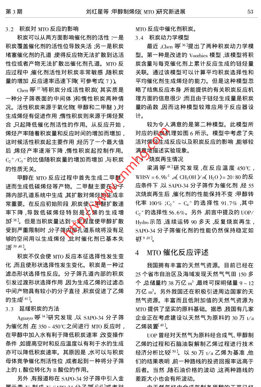 第3期劉紅星等:甲醇制烯烴( MTO )研究新進展甲醇制烯烴(MTO)研究新進展劉紅星'”謝在庫2張成芳'陳慶齡?( 1.華東理工大學(xué)化工工藝所274信箱上海200237 2.上海石油化工研究院上海201208 )摘要綜述了SAP0-34分子篩上進行的MTO反應(yīng)機理、反應(yīng)動力學(xué)和反應(yīng)過程中的積炭研究。MTO 反應(yīng)機理可以分成三步在分子篩表面生成甲氧基、形成第一個C-C鍵、生成C、C。反應(yīng)動力學(xué)較有代表性的是Bos等I ]提出的涉及積炭反應(yīng)的12反應(yīng)模型。反應(yīng)過程中的積炭包括積炭生成機理、積炭對MTO反應(yīng)的影響、延緩積炭的方法、積炭動力學(xué)模型、燒炭再生等內(nèi)容。關(guān)鍵詞:MTO ;甲醇制烯烴SAPO- 34分子篩積炭中圖分類號:0643.3文獻標(biāo)識碼:A .文章編號:1001-9219 2002 )03-49-07性的SAP0-34分子篩(UOPMTO-100)為催化0前言劑生產(chǎn)負(fù)荷0.75t甲醇/d ,連續(xù)平穩(wěn)運轉(zhuǎn)90多低碳烯烴中乙烯、丙烯是現(xiàn)代化學(xué)工業(yè)的基天取得了良好的結(jié)果,甲醇轉(zhuǎn)化率保持100% ,乙本有機原料其需求量將越來越大。制取乙烯、烯和丙烯的收率達80%以上9 ,10]。丙烯的傳統(tǒng)路線是通過石腦油裂解生產(chǎn)這種路SAPO-34分子篩催化甲醇制烯烴反應(yīng)正處線的缺點是過分依賴石油。對于石油而言短時于工業(yè)化的前夕。本文對SAPO-34分子篩上的期內(nèi)有價格上漲、供應(yīng)不穩(wěn)定的問題;長時期有MTO的反應(yīng)機理、反應(yīng)動力學(xué)、反應(yīng)積炭等方面資源儲藏量有限,從而產(chǎn)生石油危機”的問最新的研究成果進行綜述。題23]。天然氣經(jīng)由甲醇制乙烯、丙烯等低碳烯烴1 MTO反應(yīng)機理( Methanol-to-0lefin簡稱MTO )是最有希望替代石MTO反應(yīng)過程可以分為3步在分子篩表面腦油路線制烯烴的工藝4。我國的天然氣資源生成甲氧基,生成第一個C- C鍵和生成C3及豐富年產(chǎn)量不斷增加,為MTO提供了堅實的原C4。料基礎(chǔ)。由天然氣制甲醇(經(jīng)由合成氣)的工藝1.1形成表面甲氧基已經(jīng)具備相當(dāng)高的技術(shù)水準(zhǔn)以甲醇制低碳烯烴穩(wěn)定的表面甲氧基是分子篩催化反應(yīng)中的( MTO )是該替代路線的關(guān)鍵環(huán)節(jié)。重要中間體11-16]。在較高的溫度( 400C)下表1984年,UCC開發(fā)了SAPO-n系列分子面甲氧基活性很強易于參加反應(yīng)15]。MTO反篩56]其中SAP0-34已被公認(rèn)為MTO的最佳催應(yīng)過程中,甲醇脫掉一分 子水生成二甲醚,甲醇/化劑。SAP0-34具有8元環(huán)構(gòu)成的橢球形籠和二甲醚迅速形成平衡混合物[17]。甲醇/二甲醚三維孔道結(jié)構(gòu)孔口直徑為0.43 ~0.50nmo這種.分子與SAP0-34分子篩上酸性位作用生成甲氧分子篩的小孔結(jié)構(gòu)、中等酸性及良好的水熱穩(wěn)定基,而且可能有兩種甲氧基生成[ 18.19。性是其具有良好的MTO催化性能的原因所第一種由甲醇/二甲醚分子和B酸位作用生在78。成這種甲氧基在MTO反應(yīng)過程中生成第一個C國內(nèi)的大連化物所國外的UOP、Nosk Hy--C鍵時起關(guān)鍵作用;第二種是甲醇/二甲醚分dro、Mobil等公司對SAP0-34分子篩進行了很多子與端羥基作用生成在MTO反應(yīng)過程中可能研究。UOP 和Norsk Hydro已經(jīng)建立了一套UOP/不起作用。甲氧基的形成過程如圖1所示兩種Hydro- MTO示范裝置,以流化床為核心設(shè)備改甲氧基的結(jié)構(gòu)如圖2所示。修改稿日期2003-05-08 ;作者簡介:劉紅星( 1976- ),男,碩土;*通氣聯(lián)教據(jù)e-mail :hx-hx @ 2len. como50天然氣化工2002年第27卷CHsOHz0HCHzOH, AISi~HzOCH3AISi 、SCHOCHCH3OHCH3-CHsOHsi圖1 SAP0-34 分子篩上表面甲氧基的形成過程1415]Fig. 1 Formation of surface methoxy1 groups on the SAPO-34 14.15]cHsotype ItypeIT圖2 SAP0-34 分子篩上的兩種甲氧基Fig.2 Two types of methoxy groups on SAPO-34. 1.2 生成第一個C-C鍵和Rake機理等20]。以O(shè)xium ylide機理為例:甲.甲氧基生成后,如何生成第- -個C-C鍵眾氧基中一個C-H質(zhì)子化生成C-H+與甲醇分說紛紜相關(guān)機理有20余種之多。但基本上可子中- OH作用形成氫鍵然后生成乙基氧C ]進以歸為以下幾類:0xium ylide機理、Carbene機理、而生成第一個C- C鍵,詳細(xì)過程如圖3所示。Carbocationic機理、自由基機理、Carbon pool 機理HO,HCHz+H2C-CH2+H2O圖3表面 甲氧基和甲醇作用生成第一個C- C鍵的過程21]Fig.3 Formation of the first C- C bond via a concerted reaction of thesurface methoxy group with a methanol molecule 21]1.3 C3、C4的生成過程沒有Cs以上的產(chǎn)物。C3、C4 的生成有以下5種SAPO-34分子篩催化MTO反應(yīng)時產(chǎn)物分布路線:較簡單,以C2~C4特別是乙烯、丙烯為主幾乎路線122232]:51劉紅星等:甲醇制烯烴( MITO研究新進展第3期+methylated SAP-34etheneHydride abstrctionbeta-elimonatopmn/alkanealkene路線21241:methylated SAP0-34 + methanolvi ako alkene/ alkane路線3-25]:CH2CH3CHzCH2CHzCH3H一+ CH:CH=CHCH+C=C一一toE三Al~sAI'~SAI~Si路線42627]:CH3CHCH2 Prpeatin H/9C(CH)2absorbedpbaseAl-siA1-deompxstion==..oomopstion = ==releasedbydroxil+HxC=CH-CH3+HCCH=CH-CHs Besousproducts+H:C=CH2+HzO+H2O路線s( Carbon pol機理S38-31:CzH4C3H6CHOH一
