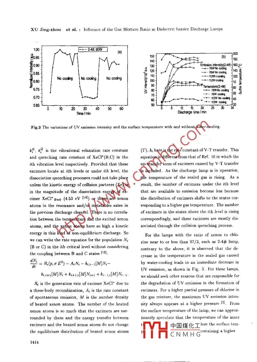 logy Vol 4, No 4(2002)Influence of the gas Mixture Ratio on theCorrelations Between the Excimer XeCI*Emission and the Sealed Gas Temperaturen Dielectric Barrier Discharge LampsO AXU Jing-zhou(徐金洲), LIANG Rong-qing(梁榮慶), REN Zhao-xing(任兆杏)Institute of Plasma Physics, Chinese Academy of Sciences, Hefei 230031, ChinaAbstract For dielectric barrier discharge lamps filled with various gas mixture ratios, the cor-relations between the excimer XecI"emission and the sealed gas temperature have been founded,and a qualitative explication is presented. For gas mixture with chlorine larger than 3%, theemission intensity increases with the sealed gas temperature, while with chlorine about 2%, theemission intensity decreases with the increase in the gas temperature, and could be improved bycooling water. However, if chlorine is less than 1.5%, the discharge appears to be a mixture modeth filaments distributedhegKeywords: dielectric barrier discharge lamps, gas mixture ratio, XeCl emissionPACS:52.80.-s1 IntroductionThe gas temperature inside filamentary dischargcan be determined by emission spectrum (6, 7, 8)There are quite a number of factors involved with the influence of the gas mixture ratio on the corre-improvements in efficiency of excimer lamps, such as lation between the excimer XeCl" emission and thethe gas ratio [1, 2 1, power supply (3.4, discharge char- sealed gas temperature is rarely reported. In this pa-acteristics and the structure of lamp [5 etc. For the per, the correlations are presented, and aoperat ion at high gas pressure, dielectric barrier dis-charge or filament discharge generates more heat owing to the frequent collisions among the particles suchas energetic electron, excited atoms or active species2 Experimental set-upinside discharge channels and atoms/ molecules inground state inside/ near these discharge channelsAs a result, the coaxial tubes are heating up by theheated gas till achieving a thermal equilibrium be-In our experiments, the dielectric barrier dischargetween the heat input and the loss through the tubes. lam中國煤化工 quartz tubes,This work is supported by Jiangsu Suzhou Purification Group Co.YHaCNMHG1411xU Jing-zhou et al: Influence of the Gas Mixture Ratio in Diclectric barrier Discharge L ampsgss gap: 4.0mmERsE88丐Seria numberFig 1 Discharge lamps display according to their relative UV intensity.which are served as two dielectric barrier layers. The qualitatively determined by this waylamp structure and gas-filling procedure was fully de-scribed in [2, 4). When the total pressure reached apreset level, the gas was sealed immediately. The 3 Results and discussionslamp samples prepared are shown in Fig. 1 according to their relative UV emission intensities(mainlyat 308 nm). The operation and gas parameters(theFrom Fig. 1, it is clear that the emission intenformer indicates the initial gas ratio, the latter showssity depends on the gas mixture ratio and gas pres-the total gas pressure)are also given respectively. sure. In our experiment, the optimum gas pressureThe power supply and instruments for electrical and is located at about 60 kPa with a gas mixture ratioptical measurement was also described elsewhere(chlorine) in the rang of 1.8%- 2.2%. Because of151. The surface temperature of lamp is monitoredthe non-uniformity of electric field in the dischargethrough Raytek 3i(LRL2, 8 N 14 um). Becausegap, the gas temperature rises rapidly on the surfacethere is noof inner tube during the early stage of discharge, ande/Cl2), it is then reach a constant afler a period of timdifficult to measure accurately the gas temperaturepressure, it is interesting that the gas mixture ratioFrom the surface temperature, we can approximatelyhas different influences on the correlations betweenspeculate the temperature on the surface of the inthe emission intensity and the gas temperature. Forner tube. As the Joule heat is proportional to the 1-1# and 2-2#, the emission intensity of excimernergy density jEXecI'(mainly at 308 nm) shows a decrease from atof the inner tube surface is determined roughly byr/r? To. The varying trend of gas temperature isTYH中國煤化工the radiationCNMHGPlasma Science Technology, Vol 4, No 4 (2002)55# 5, not calibrated by monochromator fac10tors)in the total gas pressure range of 21.3- 76 kPaSo it can be concluded that the steady-state XeCl品史876(B, C)vibration distribution mainly locates at lowerlevels at high pressure of bufer gas(here xenon). InNo coolingLamp2-2#DBD. the excimer xecl" is formed when a micro-20Wdischarge is extinguished (10) and so the quenchingof excimer due to electrons collision may be ignoredbecause of enhanced electron attachment to chlorineunder a lower electric field, contributing to the negative ions Cl. for the same reason that the concentration[] decreases in the discharge chFig.2 The variations of UV emission intensity withoutthe UV loss due to the absorption [11] of the radiaand with inner coolingtion parallel to the axis of channel is smaller, also thecollision quenching process of chlorine with excimercharacteristicsd obin this region may be also ignored. A. N. Panchenkoig. 2, 4 respectivelyet al (12 pointed out that the UV output was lim-Under a lower gas pressure, the excimer XeCI. ited due to overheating of the gas mixture causedcould be generated through the reactive quenching by the discharge constriction. This limitation can beof resonance states or metastable states of Xe witlgnored, as there is not any noticeable varietion inCl2 by a resonance radiation technique or a flowingdischarge channel size. Because the vibration relaxafterglow method (91. The spectrum shows obviously ation of high-lying B-states is considered as a possithe vibrational relaxations with the increase in theble mechanism for the repopulation of the low-lyingressure of buffer gas, especially in the shorter wave- levels [13 the excimers(Xeci)contributed to UVlength region of B-X band. The intensity ratio of emission 