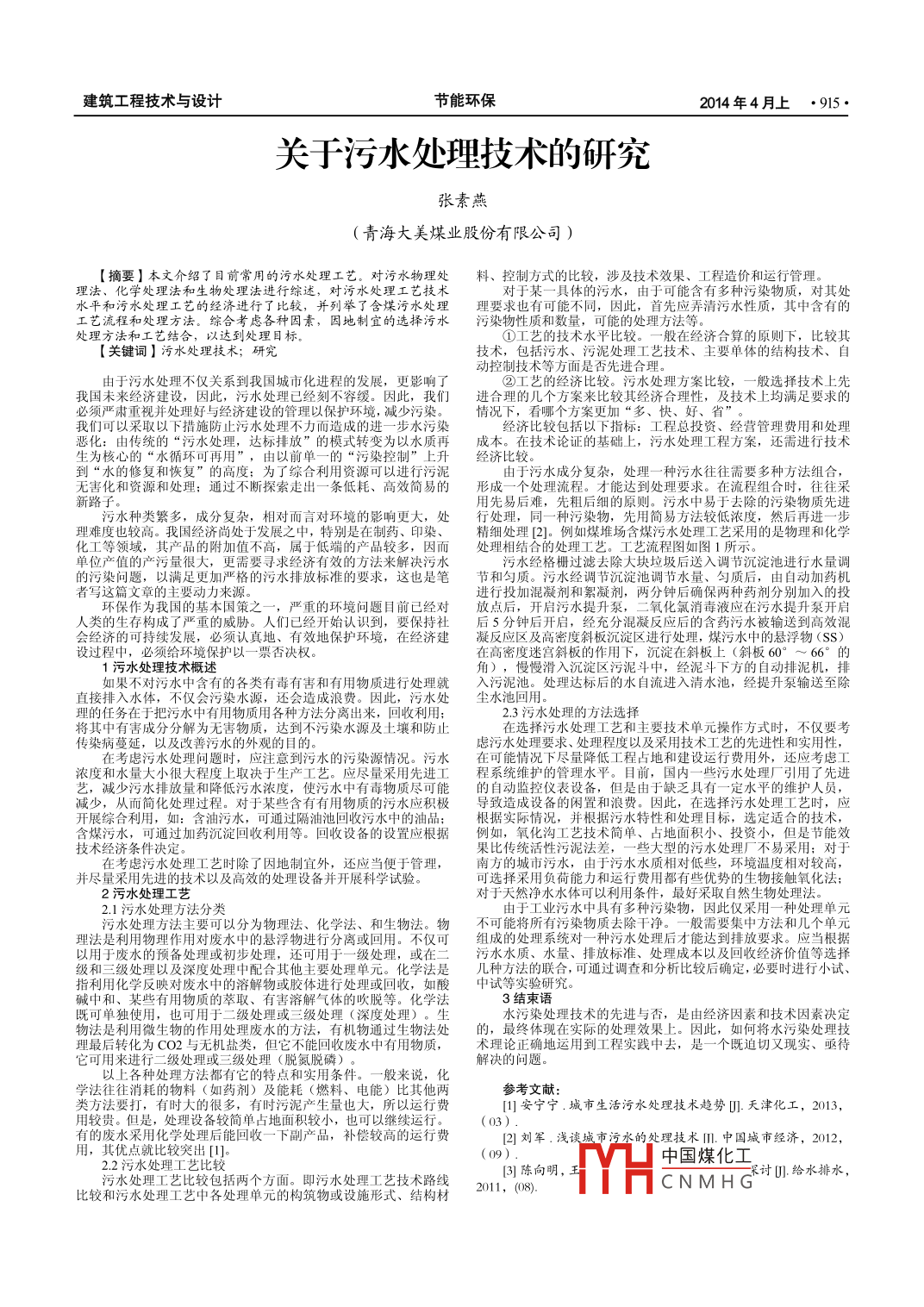 建筑工程技術(shù).與設(shè)計(jì)節(jié)能環(huán)保2014年4月上●.915.關(guān)于污水處理技術(shù)的研究張素燕(青海大美煤業(yè)股份有限公司)[摘要]本文介紹了目前常用的污水處理工藝。對(duì)污水物理處 料、控制方式的比較,涉及技術(shù)效果、工程造價(jià)和運(yùn)行管理。理法、化學(xué)處理法和生物處理法進(jìn)行綜述,對(duì)污水處理工藝技術(shù)對(duì)于某一.具體的污水,由于可能含有多種污染物質(zhì),對(duì)其處水平和污水處理工藝的經(jīng)濟(jì)進(jìn)行了比較,并列舉了含煤污水處理理 要求也有可能不同,因此,首先應(yīng)弄清污水性質(zhì),其中含有的工藝流程和處理方法。綜合考慮各種因素,因地制宜的選擇污水污 染物性質(zhì)和數(shù)量,可能的處理方法等。處理方法和工藝結(jié)合,以達(dá)到處理目標(biāo)。①工藝的技術(shù)水平比較。般在經(jīng)濟(jì)合算的原則下,比較其[關(guān)鍵詞]污水處理技術(shù);研究技術(shù),包括污水、污泥處理工藝技術(shù)、主要單體的結(jié)構(gòu)技術(shù)、自由于污水處理不僅關(guān)系到我國(guó)城市化進(jìn)程的發(fā)展,更影響了動(dòng)控制技術(shù)等方面是否先進(jìn)合理。?工藝的經(jīng)濟(jì)比較。污水處理方案比較,一般選擇技術(shù)上先我國(guó)未來(lái)經(jīng)濟(jì)建設(shè),因此,污水處理已經(jīng)刻不容緩。因此,我們進(jìn) 合理的幾個(gè)方案來(lái)比較其經(jīng)濟(jì)合理性,及技術(shù)上均滿足要求的必須嚴(yán)肅重視并處理好與經(jīng)濟(jì)建設(shè)的管理以保護(hù)環(huán)境,減少污染。情況下,看哪個(gè)方案更加“多、快、好、省我們可以采取以下措施防止污水處理不力而造成的進(jìn)一步水污染經(jīng)濟(jì)比較包括以下指標(biāo):工程總投資、經(jīng)營(yíng)管理費(fèi)用和處理惡化:由傳統(tǒng)的“污水處理,達(dá)標(biāo)排放”的模式轉(zhuǎn)變?yōu)橐运|(zhì)再戈本。在技術(shù)論證的基礎(chǔ)上,污水處理工程方案,還需進(jìn)行技術(shù)生為核心的“水循環(huán)可再用”,由以前單一的“污染控制”上升經(jīng)濟(jì)比較。到“水的修復(fù)和恢復(fù)”的高度;為了綜合利用資源可以進(jìn)行污泥由于污水成分復(fù)雜,處理- - 種污水往往需要多種方法組合,無(wú)害化和資源和處理:通過(guò)不斷探索走出一- 條低耗、高效簡(jiǎn)易的形成一 個(gè)處理流程。 才能達(dá)到處理要求。在流程組合時(shí),往往采用先易后難,先粗后細(xì)的原則。污水中易于去除的污染物質(zhì)先進(jìn)污水種類繁多,成分復(fù)雜,相對(duì)而言對(duì)環(huán)境的影響更大,處行處理,同- 一種污染物,先用簡(jiǎn)易方法較低濃度,然后再進(jìn)一一步理難度也較高。我國(guó)經(jīng)濟(jì)尚處于發(fā)展之中,特別是在制藥、印染、精細(xì)處理[2]。例如煤堆場(chǎng)含煤污水處理工藝采用的是物理和化學(xué)化工等領(lǐng)域,其產(chǎn)品的附加值不高,屬于低端的產(chǎn)品較多,因而處理相結(jié)合的處理工藝。工藝流程圖如圖1 所示單位產(chǎn)值的產(chǎn)污量很大,更需要尋求經(jīng)濟(jì)有效的方法來(lái)解決污水污水經(jīng)格柵過(guò)濾去除大塊垃圾后送入調(diào)節(jié)沉淀池進(jìn)行水量調(diào)的污染問(wèn)題,以滿足更加嚴(yán)格的污水排放標(biāo)準(zhǔn)的要求,這也是筆節(jié)和勻質(zhì)。污水經(jīng)調(diào)節(jié)沉淀池調(diào)節(jié)水量、勻質(zhì)后,由自動(dòng)加藥機(jī)者寫這篇文章的主要?jiǎng)恿?lái)源。進(jìn)行投加混凝劑和絮凝劑,兩分鐘后確保兩種藥劑分別加入的投環(huán)保作為我國(guó)的基本國(guó)策之嚴(yán)重的環(huán)境問(wèn)題目前已經(jīng)對(duì)放點(diǎn)后,開(kāi)啟污水提升泵,二氧化氯消毒液應(yīng)在污水提升泵開(kāi)啟人類的生存構(gòu)成了嚴(yán)重的威脅。人們已經(jīng)開(kāi)始認(rèn)識(shí)到,要保持社后5分鐘后開(kāi)啟,經(jīng)充分混凝反應(yīng)后的含藥污水被輸送到高效混會(huì)經(jīng)濟(jì)的可持續(xù)發(fā)展,必須認(rèn)真地、有效地保護(hù)環(huán)境,在經(jīng)濟(jì)建凝反應(yīng)區(qū)及高密度斜板沉淀區(qū)進(jìn)行處理,煤污水中的懸浮物(SS)設(shè)過(guò)程中,必須給環(huán)境保護(hù)以一- 票否決權(quán)。在高密度迷宮斜板的作用下,沉淀在斜板上(斜板60° ~66°的1污水處理技術(shù)概述角),慢慢滑入沉淀區(qū)污泥斗中,經(jīng)泥斗下方的自動(dòng)排泥機(jī),排古拉如果不對(duì)污水中含有的各類有毒有害和有用物質(zhì)進(jìn)行處理就入污泥池。 處理達(dá)標(biāo)后的水自流進(jìn)入清水池,經(jīng)提升泵輸送至除直按排入水體,不僅會(huì)萬(wàn)染水源,還會(huì)道成很貿(mào)。因此,污水處:2.3 污水處理的方法選擇理的任務(wù)在于把污水中有用物質(zhì)用各種方法分離出來(lái),回收利用:法水小陽(yáng)平安翔;要技術(shù)單元操作方式時(shí),不僅要考將其中有害成分分解為無(wú)害物質(zhì),達(dá)到不污染水源及土壤和防止慮污水處理要求、處理程度以以及采用技術(shù)工藝的先進(jìn)性和實(shí)用性,傳染病蔓延,以及改善污水的外觀的目的。在考忠污水處理問(wèn)題時(shí),應(yīng)注意到污水的污染源情況。污水在可 能情況下盡量