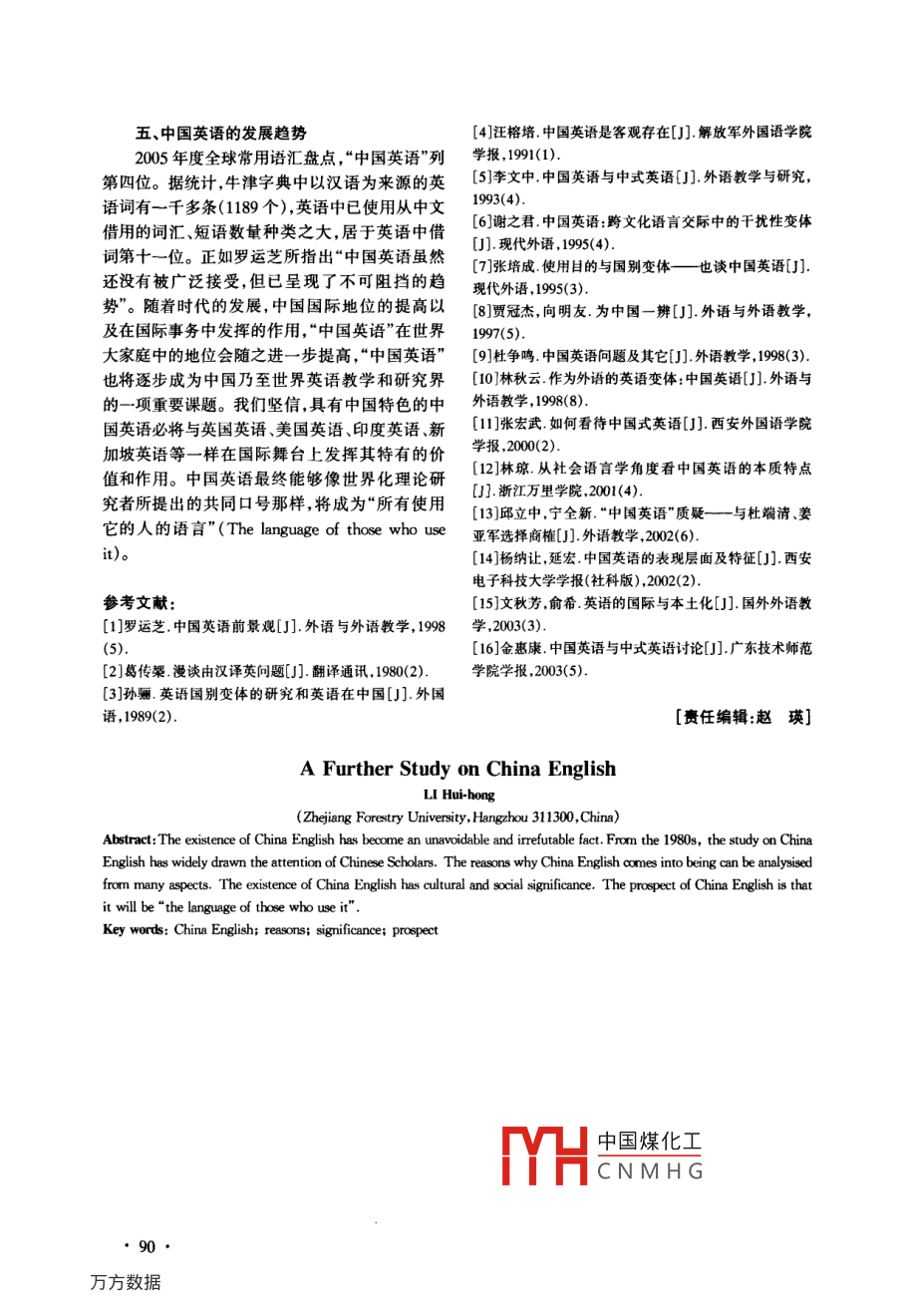 2008年9月太原大骨報(bào)第9卷第3期第35期Journal of Taiyuan UnVol. 9No 3 SumNo 35文章編號(hào):1671-5977(2008)03-0087-04也談中國(guó)英語(yǔ)李惠紅(浙江林學(xué)院浙江杭州311300摘要:中國(guó)英語(yǔ)的存在己經(jīng)成為一種不可避免和無(wú)可爭(zhēng)議的事實(shí)。對(duì)中國(guó)英語(yǔ)的研究從20世紀(jì)80年代至今,己得到國(guó)內(nèi)學(xué)者的廣泛關(guān)注和探討。中國(guó)英語(yǔ)產(chǎn)生的原因可從社會(huì)語(yǔ)言學(xué)、語(yǔ)言文化、應(yīng)用語(yǔ)言學(xué)等角度剖析。中國(guó)英語(yǔ)的存在具有文化和社會(huì)意義。中國(guó)英語(yǔ)發(fā)展趨勢(shì)是它將成為“所有使用它的人的語(yǔ)言”。關(guān)鍵詞:中國(guó)英語(yǔ);原因;意義;發(fā)展趨勢(shì)中圖分類(lèi)號(hào):H310.1文獻(xiàn)標(biāo)識(shí)碼:A引言確立了中國(guó)英語(yǔ)研究的地位和意義。英語(yǔ)自19世紀(jì)進(jìn)入中國(guó)以來(lái)經(jīng)歷了三個(gè)變孫驪在其《英語(yǔ)國(guó)別變體的的研究和英語(yǔ)在體階段:洋涇浜英語(yǔ)( Chinese Pidgin English)、中中國(guó)》一文中提出“目前討論在中國(guó)使用的英語(yǔ)式英語(yǔ)( Chinglish)和中國(guó)英語(yǔ)( China english)。是否應(yīng)當(dāng)做為語(yǔ)言學(xué)上的一種變體條件尚不成隨著經(jīng)濟(jì)全球化科學(xué)技術(shù)國(guó)際化以及國(guó)際交流熟”,認(rèn)為“英語(yǔ)在中國(guó)客觀上并不具備使其成為的日趨頻繁,中國(guó)英語(yǔ)順時(shí)應(yīng)勢(shì),逢時(shí)而生。正制度化變體的政治社會(huì)條件”。3如“像美國(guó)人說(shuō)帶有美國(guó)人自己創(chuàng)造的具有美國(guó)汪榕培寫(xiě)出了專(zhuān)門(mén)論述 China english是客文化內(nèi)涵的美國(guó)英語(yǔ)一樣,中國(guó)人理應(yīng)說(shuō)中國(guó)人觀存在的長(zhǎng)文章,認(rèn)為“中國(guó)英語(yǔ)是英語(yǔ)國(guó)家使自己創(chuàng)造的蘊(yùn)涵中國(guó)文化內(nèi)涵的中國(guó)英語(yǔ)l用的英語(yǔ)跟中國(guó)特有的社會(huì)文化相結(jié)合的產(chǎn)中國(guó)英語(yǔ)在中國(guó)正在形成一種獨(dú)具特色的國(guó)際物?!彼齻€(gè)內(nèi)容:(1)在中國(guó)本土上使用的,交流工具,這已引起國(guó)內(nèi)外語(yǔ)言學(xué)家的關(guān)注和高(2)以標(biāo)準(zhǔn)英語(yǔ)為核心的;(3)具有中國(guó)特點(diǎn)度重視。的。二、關(guān)于中國(guó)英語(yǔ)的研究李文中對(duì) China english作出全面界定,認(rèn)為最早提出“中國(guó)英語(yǔ)"的人是葛傳榮先生?!爸袊?guó)英語(yǔ)是一種客觀存在”,“它以規(guī)范英語(yǔ)為他在《漫談漢譯英問(wèn)題》一文中指出:“各國(guó)有各核心,表達(dá)中國(guó)社會(huì)文化諸領(lǐng)域特有事物,不受?chē)?guó)的情況。就我國(guó)而言,不論是舊中國(guó)還是新中母語(yǔ)干擾和影響,通過(guò)音譯、譯借、及語(yǔ)義再生諸國(guó),講或?qū)懹⒄Z(yǔ)時(shí)都有些我國(guó)所特有的東西需要手段進(jìn)入英語(yǔ)交際,具有中國(guó)特點(diǎn)的詞匯、句式表達(dá)”。2葛先生認(rèn)為 China english主要是指用和語(yǔ)篇”。5李文中擴(kuò)展了汪榕培的“本土化”概于表達(dá)中國(guó)特有事物的英語(yǔ)詞匯,諸如 eight念,指出不應(yīng)該把“中國(guó)英語(yǔ)”的使用局限于中國(guó)legged essay(八股文), Xiucai(秀才), four modern-本土,它亦可超越本土。他還認(rèn)為標(biāo)準(zhǔn)英語(yǔ)沒(méi)有ization(四個(gè)現(xiàn)代化)等。統(tǒng)一模式,因此應(yīng)把那些合乎英語(yǔ)語(yǔ)言普遍規(guī)對(duì)中國(guó)英語(yǔ)的研究從20世紀(jì)80年代至今可則、為講英語(yǔ)國(guó)家所接受和理解的英語(yǔ)作為其核分為二個(gè)主要階段:(1)排斥和全盤(pán)否定階段。心。李文中分別從詞匯、句式和語(yǔ)篇等層面分析主要觀點(diǎn)是把中國(guó)英語(yǔ)與中式英語(yǔ)或洋涇浜英了中國(guó)英語(yǔ)的構(gòu)成。語(yǔ)混為一談,采取排斥和否定態(tài)度,但缺乏嚴(yán)肅何自然在一篇綜述我國(guó)語(yǔ)用學(xué)研究的文章系統(tǒng)的理論研究。(2)概念確立和劃分階段。確中肯定了中國(guó)英語(yǔ)研究的價(jià)值,并建議從語(yǔ)用學(xué)定了中國(guó)英語(yǔ)的基本概念,在理論上給予界定,和翻譯中國(guó)煤化工,深挖中國(guó)英CNMHG收稿日期:20080420作者簡(jiǎn)介;李忠紅(1970-),女,江西臨川人,顧士,講師,研究方向:語(yǔ)言教學(xué)理論與方法,二語(yǔ)習(xí)得。語(yǔ)的“認(rèn)知”根源。語(yǔ)”的本質(zhì)特點(diǎn),明確指出:中國(guó)英語(yǔ)只是受母語(yǔ)謝之君認(rèn)為“中國(guó)英語(yǔ)”是跨文化語(yǔ)言交際(漢語(yǔ))干擾的一種英語(yǔ)變異體,它不能等同與加中的干擾性變體?!艾F(xiàn)階段所謂中國(guó)英語(yǔ)就是受拿大英語(yǔ)之類(lèi)的國(guó)別變體。12同年,林瓊又認(rèn)為到漢語(yǔ)語(yǔ)言和文化影響的英語(yǔ)”,“中國(guó)英語(yǔ)和中中國(guó)英語(yǔ)和中國(guó)式英語(yǔ)均是中國(guó)人在學(xué)習(xí)和使式英語(yǔ)都存在漢語(yǔ)干擾。兩者之間并沒(méi)有不可用英語(yǔ)時(shí)因受漢語(yǔ)言、文化影響而產(chǎn)生的中介語(yǔ)逾越的鴻溝6變異體,是一種不可避免的過(guò)渡現(xiàn)象。姜亞軍在“今日英語(yǔ)”( English Today)中,把江曉