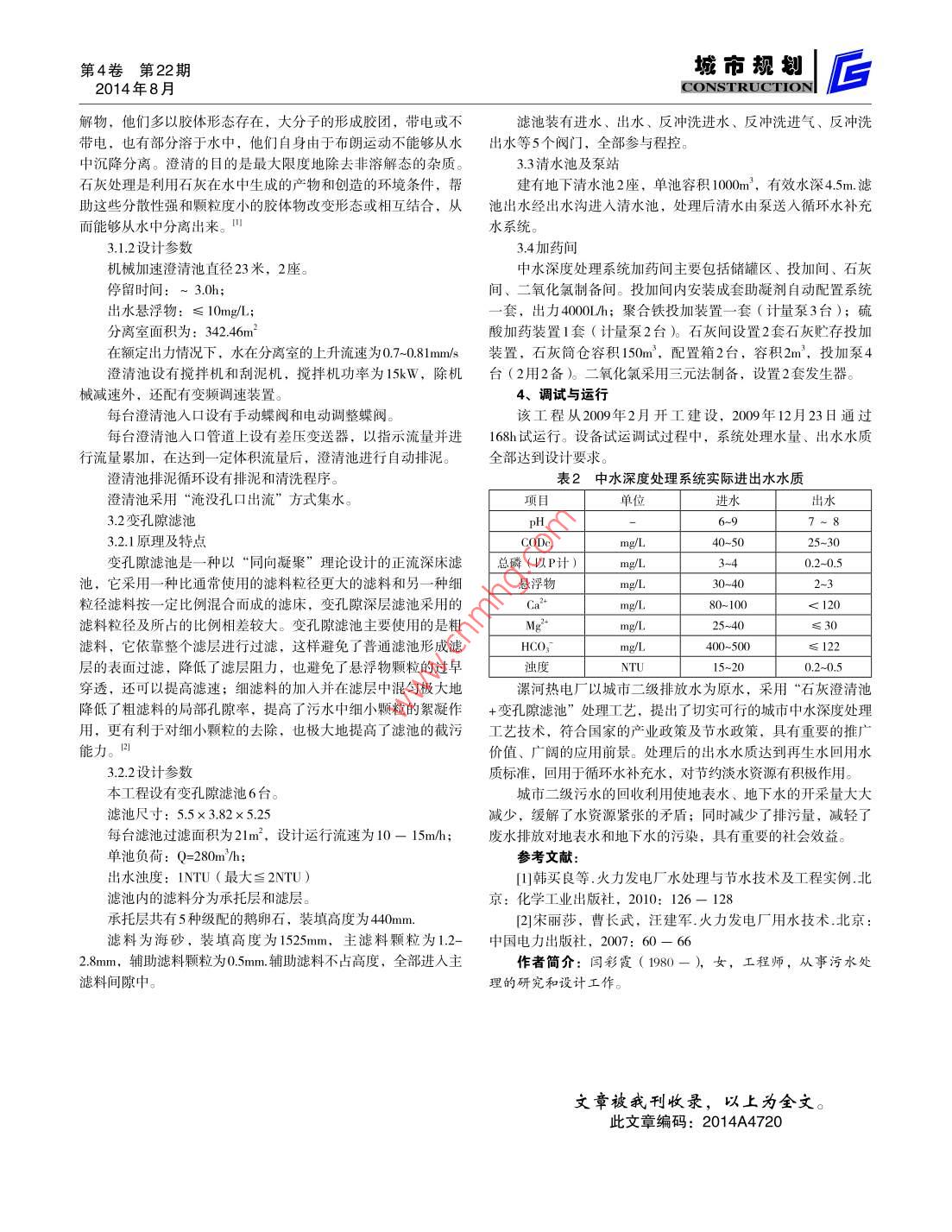 城市規(guī)劃第4卷第22期G|CONSTRUCTION2014年8月城市中水在循環(huán)水補(bǔ)充水中的設(shè)計(jì)和應(yīng)用閆彩霞華電水務(wù)工程有限公司北京100000摘要:漯河熱電廠以城市中水為水源,采用“石灰澄清池+變孔隙濾池”工藝,出水回用于循環(huán)水補(bǔ)充水。該工程節(jié)約了淡水資源,緩解了水資源緊張的矛盾,具有顯著的環(huán)境、經(jīng)濟(jì)、社會效益,具有重要的推廣價(jià)值和廣闊的應(yīng)用前景。關(guān)鍵詞:中水;石灰;澄清池;變孔隙濾池ater on circulatingwater, It saves fresh water resources, alviates the conflict between water resources nervous,with sigmificant benefits on environmental, economy and society, aswell as an important promotion value and a widely used foreground.Key Words: recaimned water ; lime; clarifier; Variable filter中圖分類號: O434文獻(xiàn)標(biāo)識碼: A水是國民經(jīng)濟(jì)發(fā)展中的不可替代的重要資源,也是人類賴石灰乳、聚鐵、助凝劑「硫酸、 二氧化氣以生存和發(fā)展的重要資源。我國水資源總量為2.81x10*億m',居世界第6位,但人均占有量居世界第108位,是世界上21個(gè)城市二級污水石灰處理澄清池一 >[經(jīng)請和過濾水溝 >變孔原健池 ]貧水國家之-根據(jù)《2007年中國水資源公報(bào)》提供的數(shù)據(jù),2007 年全國- >[清水池循環(huán)水補(bǔ)水泵循環(huán)冷卻水系統(tǒng)總用水量5819億m',其中工業(yè)用水占24.1%?;鹆Πl(fā)電廠用水占工業(yè)系統(tǒng)用水量的20%左右,主要包括循環(huán)冷卻水補(bǔ)充水、[ 二氧化氯水力沖灰用水;鍋爐補(bǔ)給水:生活用水,其中循環(huán)冷卻水補(bǔ)水, 分別流人循環(huán)水澄清水溝和過濾水溝、中水澄清水溝和過充水、鍋爐補(bǔ)給水占電廠總用水量的比例分別為50% ~ 80%、濾 水溝。硫酸投加在澄清池澄清水溝上的出水點(diǎn)后,二氧化氣2%- 8%。因此,針對循環(huán)冷卻水的各種節(jié)水技術(shù)的科研開發(fā)投加在澄清池澄清 水溝至過濾水溝轉(zhuǎn)彎跌落處,此處便于藥品和推廣應(yīng)用,已經(jīng)成為目前各個(gè)電廠、科研機(jī)構(gòu)、工程公司的和水的混合,以降低澄清水的pH值,防止過飽和碳酸鈣在變重要課題??紫稙V池中沉淀并防止微生物在濾池表面滋生。加酸、加氯后城市中水回用,即利用城市污水為水源,經(jīng)處理后回用于的中水澄清水進(jìn)人濾池,過濾后的清水在出水溝中再次投加二電廠循環(huán)冷卻水補(bǔ)充水,可大幅度減少新鮮水的取用量,是解氧化氯,以維持成品中水中的余氯。中水清水流人設(shè)在濾池底決電廠水資源緊缺的重要途徑。部的中水清水池,中水清水經(jīng)循環(huán)水補(bǔ)水泵,把澄清水補(bǔ)人電1、工程概況廠循環(huán)冷卻水系統(tǒng)華電漯河熱電廠- .期工程建設(shè)兩臺(2x 330MW )亞臨界變孔隙濾池的反洗水排至回收水池,由兩臺回收水泵打入燃煤抽凝式發(fā)電機(jī)組,該電廠循環(huán)水水源為漯河市污水處理廠澄清池入口母管內(nèi)。二級排放水,備用水源為沙河水,經(jīng)深度處理后的二級排放水澄清池污泥靠重力自流進(jìn)人污泥池,污泥由污泥輸送泵輸作為循環(huán)水補(bǔ)充水。該工程設(shè)計(jì)進(jìn)出水水質(zhì)指標(biāo)為送到離心脫水機(jī)中離心脫水,脫水后的污泥用螺桿輸送機(jī)送至表1設(shè)計(jì)進(jìn)、 出水水質(zhì)電動泥斗,待汽車外運(yùn)。序號項(xiàng)目單位進(jìn)水水質(zhì)出水水質(zhì)3、主要處理構(gòu)筑物及處理設(shè)備1pH6-97 ~83.1石灰處理澄清池COD.mg/L50≤303.1.1 原理及特點(diǎn)BOD320≤5該石灰處理澄清池是一種引進(jìn)型圓形機(jī)械攪拌澄清池,澄重碳酸根473≤150清池是利用池中積聚的泥渣與原水中的雜質(zhì)顆粒相互接觸、吸總磷(以P計(jì))<0.5附,以達(dá)到清水較快分離的構(gòu)筑物。澄清池內(nèi)部設(shè)置第- -一反應(yīng)懸浮物m/L:5室,第二反應(yīng)室,同時(shí)設(shè)置了機(jī)械攪拌提升裝置,池中設(shè)置底2、工藝流程及說明部刮泥機(jī),底部坡度很小,相當(dāng)于全池刮泥,這樣即保證了較由于漯河污水處理廠出水中的懸浮物、堿度較高,要應(yīng)用重的石 灰處理沉渣良好的排放,又提高了池容積的利用率。于電廠循環(huán)冷卻水系統(tǒng)需去除污水中懸浮物、堿度等。經(jīng)工程該澄清池具有泥渣接觸和泥渣分離兩種功能,可以強(qiáng)制高相關(guān)各方的討論,綜合考慮處理效果、投資及運(yùn)行成本等因倍率循環(huán)以加強(qiáng) 反應(yīng)和溶解,也可以形成動態(tài)泥渣或懸浮泥渣索,確定采用石灰法處理工藝,流程如下: (見下圖)層,利用活性泥渣接觸過程和巨大的接觸表面積,去除較小分來自污水處理廠的二級污水進(jìn)人2座機(jī)械加速澄清池,石子量的有機(jī)物膠體物和無機(jī)膠體物(如膠體硅、鐵、鋁),他灰乳、聚鐵加至機(jī)械加速澄清池混合室( - -反),助凝劑加至們的有 效粒徑約為1-100m,而且無殘留凝聚藥劑及其產(chǎn)物。機(jī)械加速澄清池反應(yīng)室(二反),經(jīng)混合、反應(yīng)并澄清的澄清回用城市中水深度處理的主要目的是去除水中殘存的非溶第4卷第22期城市規(guī)劃2014年8月CONSTRUCTION解物,他們多以膠體形態(tài)存在,大分子的形成膠團(tuán),帶電或不濾池裝有進(jìn)水、出水、反沖洗進(jìn)水、反沖洗進(jìn)氣、反沖洗帶電,也有部分溶于