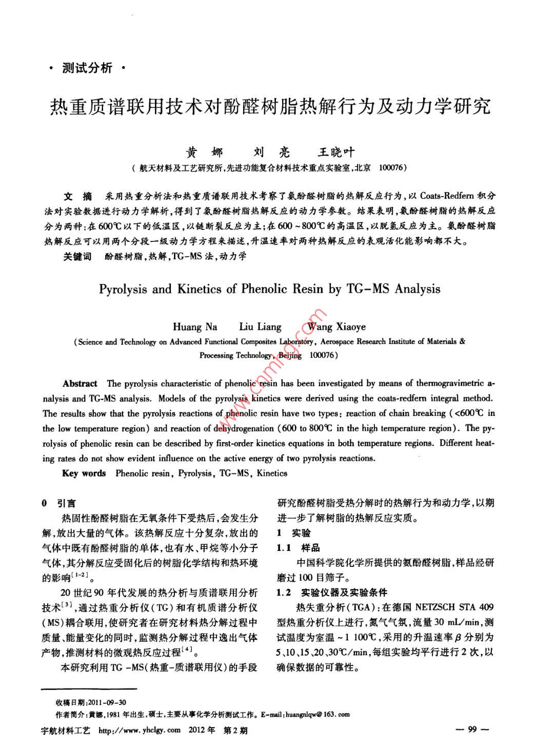 測(cè)試分析●熱重質(zhì)譜聯(lián)用技術(shù)對(duì)酚醛樹(shù)脂熱解行為及動(dòng)力學(xué)研究黃娜劉亮王曉葉(航天材料及工藝研究所,先進(jìn)功能復(fù)合材料技術(shù)重點(diǎn)實(shí)驗(yàn)室,北京100076)文摘采用熱重分析法和熱重質(zhì)譜聯(lián)用技術(shù)考察了氨酚醛樹(shù)脂的熱解反應(yīng)行為,以Cots-Redferm積分法對(duì)實(shí)驗(yàn)數(shù)據(jù)進(jìn)行動(dòng)力學(xué)解析得到了氨酚醛樹(shù)脂熱解反應(yīng)的動(dòng)力學(xué)參數(shù)。結(jié)果表明,氨酚醛樹(shù)脂的熱解反應(yīng)分為兩種:在600C以下的低溫區(qū),以鏈斷裂反應(yīng)為主;在600~800C的高溫區(qū),以脫氫反應(yīng)為主。氨酚醛樹(shù)脂熱解反應(yīng)可以用兩個(gè)分段一級(jí)動(dòng)力學(xué)方程來(lái)描述,升溫速率對(duì)兩種熱解反應(yīng)的表觀活化能影響都不大。關(guān)鍵詞酚醛樹(shù)脂,熱解,TG-MS法,動(dòng)力學(xué)Pyrolysis and Kinetics of Phenolic Resin by TG- MS AnalysisHuang NaLiu LiangWang Xiaoye( Science and Technology on Advanced Functional Composites Laboratory, Aerospace Research Institute of Materials &Processing Technology, Beijing 100076)Abstract The pyrolysis characteristic of phenolic resin has been investigated by means of thermogravimetric a-nalysis and TG-MS analysis. Models of the pyrolysis kinetics were derived using the coats- redfem integral method.The results show that the pyrolyis reactions of phenolic resin have two types: reaction of chain breaking (<600 inthe low temperature region) and reaction of dehydrogenation ( 600 to 8009 in the high temperature region). The py-rolysis of phenolic resin can be described by first-order kinetics equations in both temperature regions. Different heat-ing rates do not show evident influence on the active energy of two pyrolysis reactions.Key words Phenolic resin, Pyrolysis, TG -MS, Kinetics0引言研究酚醛樹(shù)脂受熱分解時(shí)的熱解行為和動(dòng)力學(xué),以期熱固性酚醛樹(shù)脂在無(wú)氧條件下受熱后,會(huì)發(fā)生分進(jìn)一步了解樹(shù)脂的熱解反應(yīng)實(shí)質(zhì)。解,放出大量的氣體。該熱解反應(yīng)十分復(fù)雜,放出的1實(shí)驗(yàn)氣體中既有酚醛樹(shù)脂的單體,也有水、甲烷等小分子1.1 樣品氣體,其分解反應(yīng)受固化后的樹(shù)脂化學(xué)結(jié)構(gòu)和熱環(huán)境中國(guó)科學(xué)院化學(xué)所提供的氨酚醛樹(shù)脂,樣品經(jīng)研的影響-21。磨過(guò)100目篩子。20世紀(jì)90年代發(fā)展的熱分析與質(zhì)譜聯(lián)用分析1.2實(shí)驗(yàn)儀器及 實(shí)驗(yàn)條件技術(shù)[3],通過(guò)熱重分析儀(TC)和有機(jī)質(zhì)譜分析儀熱失重分析(TGA):在德國(guó)NETZSCH STA 409(MS)耦合聯(lián)用,使研究者在研究材料熱分解過(guò)程中型熱重分析儀上進(jìn)行,氮?dú)鈿夥?流量30 mL/min,測(cè)質(zhì)量、能量變化的同時(shí),監(jiān)測(cè)熱分解過(guò)程中逸出氣體試溫度為室溫~1 100C ,采用的升溫速率β分別為產(chǎn)物,推測(cè)材料的微觀熱反應(yīng)過(guò)程“]。5、10、15、20、30C/min,每組實(shí)驗(yàn)均平行進(jìn)行2次,以本研究利用TG -MS(熱重-質(zhì)譜聯(lián)用儀)的手段確保數(shù)據(jù)的可靠性。收稿日期:2011-09-30作者簡(jiǎn)介:黃娜,1981年出生。碩士,主要從事化學(xué)分析測(cè)試工作。E -mail: huangnlqw@ 163. com字航材料工藝htp://www. yhclgy. com 2012年 第2期一99-裂解氣相色譜質(zhì)譜聯(lián)用儀( Py-GC-MS):美國(guó)2結(jié)果與討論CDS2000裂解器,美國(guó)THERMO-FINNIGAN TRACE2.1酚醛樹(shù)脂的熱解特性MS氣相色譜質(zhì)譜聯(lián)用儀。質(zhì)譜條件:電子轟擊離子圖1為氨酚醛樹(shù)脂在不同升溫速率下的熱失重源,源溫2009,電離電壓70eV,裂解溫度575C,裂和失重速率曲線。由圖1(a)可見(jiàn),酚醛樹(shù)脂的主要解時(shí)間5 s;色譜條件:DB-35石英毛細(xì)管柱,30 m,失重溫度區(qū)間為375~800C,其失重約為總失重的中0.25mm,進(jìn)樣口溫度300C,柱溫50~300C,程序85%左右。盡管不同升溫速率下的熱失重曲線相類升溫10C/ min,分流比為1:10。似,且酚醛樹(shù)脂起始失重溫度和終止溫度差異不大,熱重質(zhì)譜聯(lián)用儀(TG -MS) :德國(guó)NETZSCH STA但隨著升溫速率的增大,由于傳熱滯后效應(yīng)的影響,409-MS- Skimmer連接熱重質(zhì)譜聯(lián)用系統(tǒng),氦氣氣圖1(b)中酚醛樹(shù)脂失重速率極值位置向高溫區(qū)移氛,測(cè)試溫度為室溫~1 100C ,升溫速率β為20C/動(dòng) ,當(dāng)升溫速率由5C/min增大至30C/min時(shí),失重min,選擇離子掃描模式。速率極值位置由532C升高到了551C。100①5C/min0④②10C/minato③15C/min①532C,5C/min③④20C/min30③一②533 C.10C/min⑤30C/min③540C,15C/min7o t④544C.209C/min60⑤⑤551 C 30C/min0 200 400 600 800 1000 1200temperature/ C(a)熱失重 曲線(b)失重速率曲線圖酚醛樹(shù)脂在不同升溫速率下的熱失重和失重速率曲線Fig, 1 TG and DTG curves of phenolic resin with different heating rates對(duì)氨酚醛樹(shù)脂樣品利用Py-GC-MS進(jìn)行全離子質(zhì)譜峰的離子流圖,可以看出:在室溫~375C為失重和選擇離子掃描模式分析,得到了氨酚醛樹(shù)脂裂解產(chǎn)的第-個(gè)階段,失重約為2.90%;在375C以后氨酚物主要是:氫氣、水、甲烷、乙醇、一氧化碳、苯、苯酚、2醛樹(shù)脂逐漸開(kāi)始裂解,隨著反應(yīng)溫度進(jìn)一步的升高,-甲基苯酚.4-甲基苯酚、2,6-二甲基苯酚、2,4-二甲其裂解程度加劇,在550C左右達(dá)到其最
