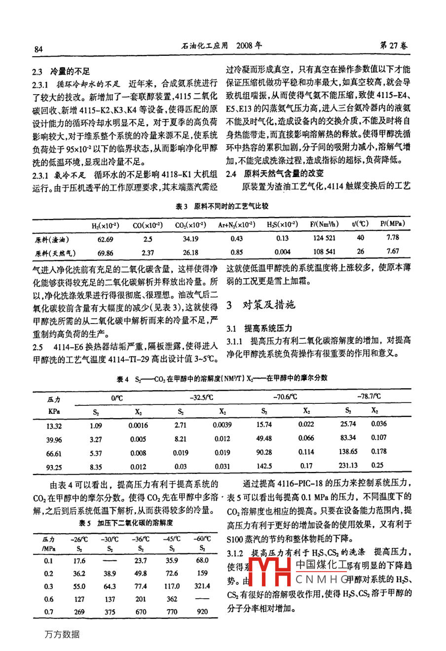 第27卷第2期石油化工應(yīng)用Vol 27 No. 22008年4月PETROCHEMICAL INOUSTRY APPLICATIONApr200883凈化甲醇洗影響高負(fù)荷的原因分析及對(duì)策劉全,孫涌(中國(guó)石油寧夏石化公司寧夏銀川75006)摘要:寧夏石化公司一化肥合成氯裝重凈化甲醇洗工號(hào)由于運(yùn)行時(shí)間較長(zhǎng),長(zhǎng)期沒(méi)有進(jìn)行徹底的檢修、清理系統(tǒng)內(nèi)的殘?jiān)斐伤?、罐、塔盤(pán)、塔板、換熱器等設(shè)備堵塞嚴(yán)重?fù)Q熱效果差,腐蝕程度加刷影響合成雖的高負(fù)荷生產(chǎn),制約著合成氨高負(fù)荷運(yùn)行,生產(chǎn)能力下降。氣化爐雖在10×10負(fù)荷,但是415工號(hào)的負(fù)荷卻只有92×103,剩下的工藝氣由聯(lián)醇裝王消化。使尿產(chǎn)量達(dá)不到預(yù)期值無(wú)法滿(mǎn)足裝置的滿(mǎn)負(fù)荷生產(chǎn)。通過(guò)對(duì)甲醇洗影響高負(fù)荷的原因進(jìn)行分析檢修部分設(shè)備和技術(shù)改造,使其滿(mǎn)足了高負(fù)荷的需求。關(guān)鍵字:溶解度;冷量;摩爾分?jǐn)?shù);微量;鼓氮中國(guó)分類(lèi)號(hào):TQ41421文獻(xiàn)標(biāo)識(shí)碼B文章編號(hào):1673-5285(2008)02083-04來(lái)至氣化工號(hào)的工藝氣,通過(guò)411-6水冷器得合成氨產(chǎn)量和二氧化碳產(chǎn)量不能達(dá)到系統(tǒng)最佳狀后進(jìn)入4115甲醇洗工號(hào)。由于在目前天然氣壓力流態(tài)。氨碳比不平衡氨庫(kù)液位上漲較快尿素產(chǎn)量達(dá)不量充足的前提下,而甲醇洗系統(tǒng)始終難能維持高負(fù)荷到預(yù)期值,無(wú)法滿(mǎn)足裝置的滿(mǎn)負(fù)荷和公司制定的生產(chǎn)運(yùn)行系統(tǒng)的平均負(fù)荷一直在95×102以下見(jiàn)表1。使任務(wù)。甲醇洗工號(hào)成為了制約高負(fù)荷生產(chǎn)的主要原因。衰1不同月份的裝置負(fù)荷年月2006.120073200752007.72007820079原料(天然氣)87.83875386.7986.88912794.372原因分析的硫化物組分。二者相比,同樣的出4114-S-1402的硫化物在200mg與100×102負(fù)荷下,有利于HS的21甲醇洗系統(tǒng)臟溶解而不利于CS2的吸收造成AP-12Ts超標(biāo)。2.1.1設(shè)備未檢修造成甲醇洗裝置至從2003年大進(jìn)入2007年3月氣化負(fù)荷在95×102,工況較平修后4年來(lái)未進(jìn)行徹底的清洗。系統(tǒng)由于機(jī)械雜質(zhì)、穩(wěn),但AP-12一直超標(biāo)通過(guò)調(diào)節(jié)415-FCV6閿位觸媒灰、炭黑沉積,使得換熱器堵塞嚴(yán)重,換熱效果差,發(fā)現(xiàn)FCV-6開(kāi)的越大見(jiàn)表2,415-V3的Ts越高,說(shuō)加之部分塔、罐、塔盤(pán)、塔板長(zhǎng)期未進(jìn)行檢修,腐蝕程度明4115-C1脫硫段Ts上移。脫硫段脫硫不利,指標(biāo)超加劇,氣液分離效果差影響高負(fù)荷生產(chǎn)。標(biāo)。正常指標(biāo)4115AP-12T≤14×106。2.1.24115-℃4(甲醇再生塔)再生不好系統(tǒng)臟,使得2甲醇再生吸收不好,自2007年2月22日開(kāi)始在工況pcAP-12很穩(wěn)定的情況下非操作原因,AP12TS時(shí)常超標(biāo)。閥位(×10“)(×10°)(x10“)(×10°2.1.34115-~5(甲醇/水分離塔)精餾效果差4115-C5塔24×13.2差時(shí)常滿(mǎn)量程使系統(tǒng)甲醇中水含量增加使得裝置溫26×10度高吸收能力下降使裝置難以維持高負(fù)荷。10.14.69622HS組分由CS2組分代替自從使用以天然氣為原料以來(lái),由于4114-R1觸3×10-22.2媒必須在有HS的環(huán)境下才能運(yùn)行,增加了CS2添加裝置。組分的改變對(duì)于4114R1觸媒來(lái)說(shuō)運(yùn)行較穩(wěn)從清出的機(jī)泵雜質(zhì)看雜質(zhì)不是很多但濾網(wǎng)上有定,但對(duì)于甲醇洗裝置卻難以維持。油狀物,將濾網(wǎng)糊住,導(dǎo)致濾網(wǎng)堵。這一現(xiàn)象可以判斷HS、CS2在甲醇中的溶解度隨著壓力的增高而增為有Cs的存在系統(tǒng)內(nèi)的CS是以油狀形態(tài)存在,到高。CS2在甲醇中的溶解度與溫度有關(guān),降低溫度有利了凈化中國(guó)煤化工克到了各塔罐的底于HS、CS2在分子分?jǐn)?shù)的增加。但CS是溶解度最低部造成CNMHG收稿日期:2008-02-15石油化工應(yīng)用2008年第27卷23冷量的不足過(guò)冷凝而形成真空,只有真空在操作參數(shù)值以下才能231循環(huán)冷卻水的不足近年來(lái),合成氨系統(tǒng)進(jìn)行保證壓縮機(jī)做功平穩(wěn)和功率最大如真空較高,就會(huì)導(dǎo)了較大的技改。新增加了一套聯(lián)醇裝置,4115二氧化致機(jī)組喘振,從而使得氣氨不能壓縮,致使4115-E4、碳回收新增411-K2K3K4等設(shè)備,使得匹配的原E5E13的閃蒸氨氣壓力高進(jìn)入三臺(tái)氨冷器內(nèi)的液氨設(shè)計(jì)能力的循環(huán)冷卻水明顯不足,對(duì)于夏季的高負(fù)荷不能及時(shí)氣化造成設(shè)備內(nèi)的交換介質(zhì),不能及時(shí)將自影響較大,對(duì)于維系整個(gè)系統(tǒng)的冷量來(lái)源不足,使系統(tǒng)身熱能帶走,而直接影響溶解熱的釋放。使得甲醇洗循負(fù)荷處于95×102以下的臨界狀態(tài),從而影響凈化甲醇環(huán)中熱容的累積加劇,分子間的吸附力減小,溶解氣增洗的低溫環(huán)境顯現(xiàn)出冷量不足。加,不能完成洗滌過(guò)程造成指標(biāo)的超標(biāo),負(fù)荷降低231氧冷不足循環(huán)水的不足影響411-K1大機(jī)組24原料天然氣含量的改變運(yùn)行。由于壓機(jī)透平的工作原理要求,其末端蒸汽需經(jīng)原裝置為渣油工藝氣化,414觸媒變換后的工藝表3原料不同時(shí)的工藝氣比較H(×103)co(×10-)co4×10)Ar+N×10)HS(x102)F(Nmh)t(