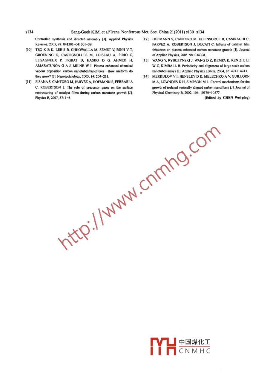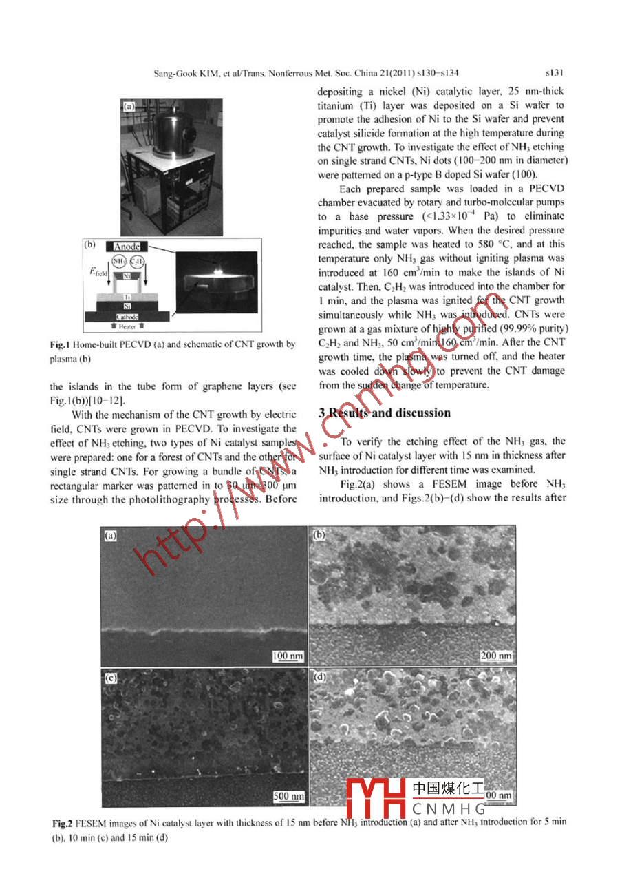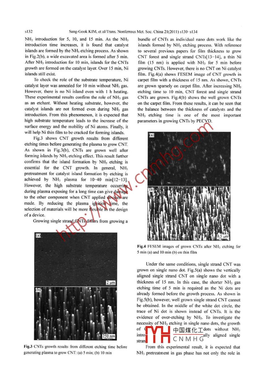 藏當leonlineatwww.sciencedirect.comScience DirectNonferrous MetalsSociety of chinaElsEvier PressTrans. Nonferrous Met. Soc. China 21(2011)s130-s134www.nmsccnEffect of ammonia gas etching on growth oftically aligned carbon nanotubes/nanofibersSang-Gook KIM, Sooh-Yung KIM, Hyung-Woo LEE.1. Department of Mechanical Engineering, Massachusetts Institute of Technology, 77 Massachusetts Ave,Cambridge MA 02139, USA;2. National Core Research Center for Hybrid Materials Solution, Pusan National UniversityReceived 21 April 2010; accepted 10 September 2010Abstract: The etching effect of ammonia(NH,)on the growth of vertically aligned nanotubes/nanofibers( CNTs)was investigatedby direct-current plasma enhanced chemical vapor deposition(DC-PECVD). NH, gas etches Ni catalyst layer to form nanoscaleislands while NH3 plasma etches the deposited amorphous carbon. Based on the etching effect of NH, gas on Ni catalyst, thedifferences of growing bundles of CNTs and single strand CNTs were discussed; specifically, the amount of optimal NH3 gas etchingis different between bundles of CNTs and single strand CNTs. In contrast to the CNT carpet growth. the single strand CNT growthrequires shorter etching time (5 min)than large catalytic pattems (10 min) since nano dots already form catalyst islands for CNTgrowth. Through removing the plasma pretreatment process, the damage from being exposed at high temperature substrate occurringuring the plasma generation time is minimized. High resolution transmission electron microscopy (HTEM)shows fishbone structureof CNTs grown by PECVDKey words: carbon nanotube; ammonia etching: nickel catalyst; plasma enhanced chermical vapor deposition(PECVD)nano devices and technologies [7]. However, the vertical1 IntroductionCnT growth mechanism remains unclear although thereare many studies on the CNT growth by PECVD[8-9Carbon nanotube (CNT)is one of the mostNH3 pretreatment before plasma generation may beanticipated nano-materials because of its small the key control parameter in the Cnt growth with thedimension and excellent mechanical, electrical, thermal, form factors of islands in catalyst layers[ 10]. In this work,and chemical properties[ 1-3]. Various synthesis methods the effect of NH3 gas etching on the growth of CNTs inwere developed, such as laser ablation, arc discharge, forest form and a single strand array was investigated,and chemical vapor deposition (CVD)[(4-5]. Each and different roles of NH3 gas in both forms of CNTsynthesis method has its own advantages over other growth were discussedmethods, and finds its own potentials in terms of quality2 CNT growth in PECVDIn the recent decade, plasma enhanced chemicalvapor deposition( PECVD), has been widely used toVertically aligned CNTs are grown on a patternedgrow CNTs vertically[6]. PECVD's capability of Ni sample using a home- built PECVD shown in Fig. I(a)growing aligned CNTs at relatively low temperature It is generally accepted that CNTs can be grown by threemakes it possible to grow aligned CNTs in an array and steps: the decomposition of the hydrocarbon gas(in thissingle strand configuration together with various work, acetylene( C2H2) was used over a catalytic metalatalytic pattern generation techniques. The controlled (nickel (Ni)), the diffusion of the carbon atoms throughsynthesis of carbon nanotubes/nanofibers(CNTs) by the bulk and the surface of the islands of catalyst layer,PECVD is an essential step for realizing many functional and中國煤化工 rbon atoms beneathFoundation item: Project supported by Intelligent Microsystem Center(IMC). ProjectCN MH Gal Core Research Centerrough the National Research Foundation of Korea funded bychnology, Project( 2010)ported by Pusan National UniversityCorresponding author: Hyung-Woo LEE: Tel: +82-51-510-3160, E-mail: LHW2010@pusan. ac krSang-Gook KIM. et al/Trans. Nonferrous Met. Soc. China 21(2011)s130-s134s131depositing a nickel(Ni) catalytic25 nm-thicktitanium (Ti)layer was depositedSi wafer topromote the adhesion of Ni to the Si wafer and preventcatalyst silicide formation at the high temperature duringthe CNT growth. To investigate the effect of NH; etchingon single strand CNTs, Ni dots(100-200 nm in diameter)were patterned on a p-type B doped Si wafer(100)Each prepared sample was loaded in a PECVDchamber evacuated by rotary and turbo-molecular pumps<1.33x10Pa)to eliminateimpurities and water vapors. When the desired pressure(b) Anodereached, the sample was heated to 580C, and at thistemperature only NH, gas without igniting plasma wasintroduced at 160 cm'i'min to make the islands of Nicatalyst. Then, C2H, was introduced into the chamber forma was ignited forsimultaneously while NH3 was introduced. CNTs weregrown at a gas mixture of highly purified (99.99% purity)Fig. I Home-built PECVD (a) and schematic of CNT growth by C2H, and NH,, 50 cm/min: 1 60 cm/min After the CNTplasma(b)growth time, the plasma was turned off, and the heaterwas cooled down slowly to prevent the CNT damagethe islands in the tube form of graphene layers(see from the sudden change of temperatureFig.l(b)10-121With the mechanism of the CNT growth by electric 3 Results and discussionfield, CNTs were grown in PECVD. To investigate theeffect of NH3 etching, two types of Ni catalyst sampleTo verify the etching effect of the NH, gas,were prepared: one for a forest of CNTs and the other for surface of Ni catalyst layer with 15 nm in thicknesssingle strand CNTs. For growing a bundle of CNTs, a NH, introduction for different time was examinedrectangular marker was patterned in to 30 umx300 umFig 2(a) shows a FESEM image before NH,size through the photolithography processes. Before introduction, and Figs. 2(b)-(d)show the results after200nm中國煤化工CNMHGFig 2 FESEM images of Ni catalyst layer with thickness of 15 nm before N, introduction (a)and after NH, introduction for 5 min(b). 10 min(c)and 15 min(d)s132Sang-Gook KIM. et al/Trans. Nonferrous Met. Soc. China 21(2011)s130-sl34NH, introduction for