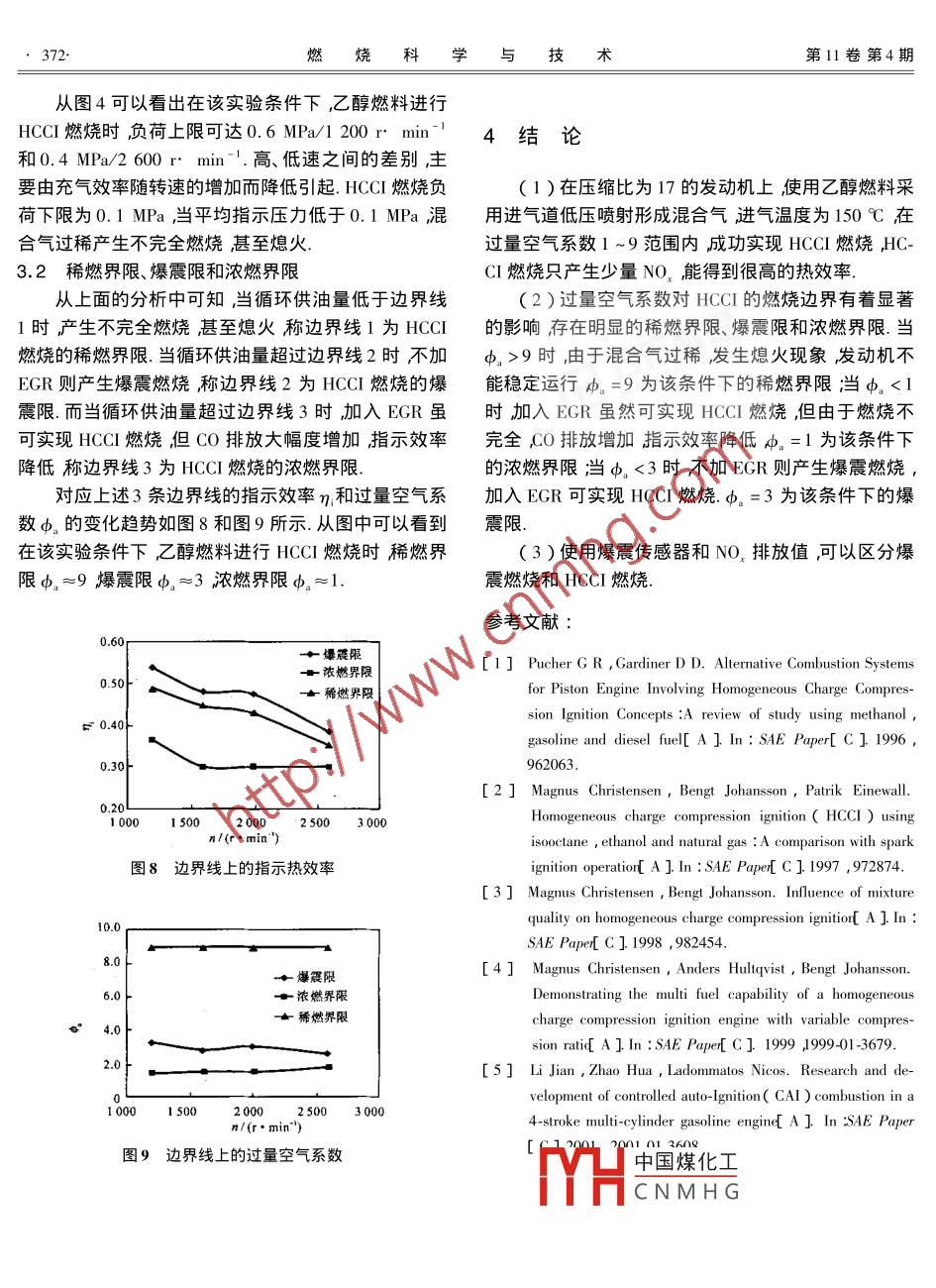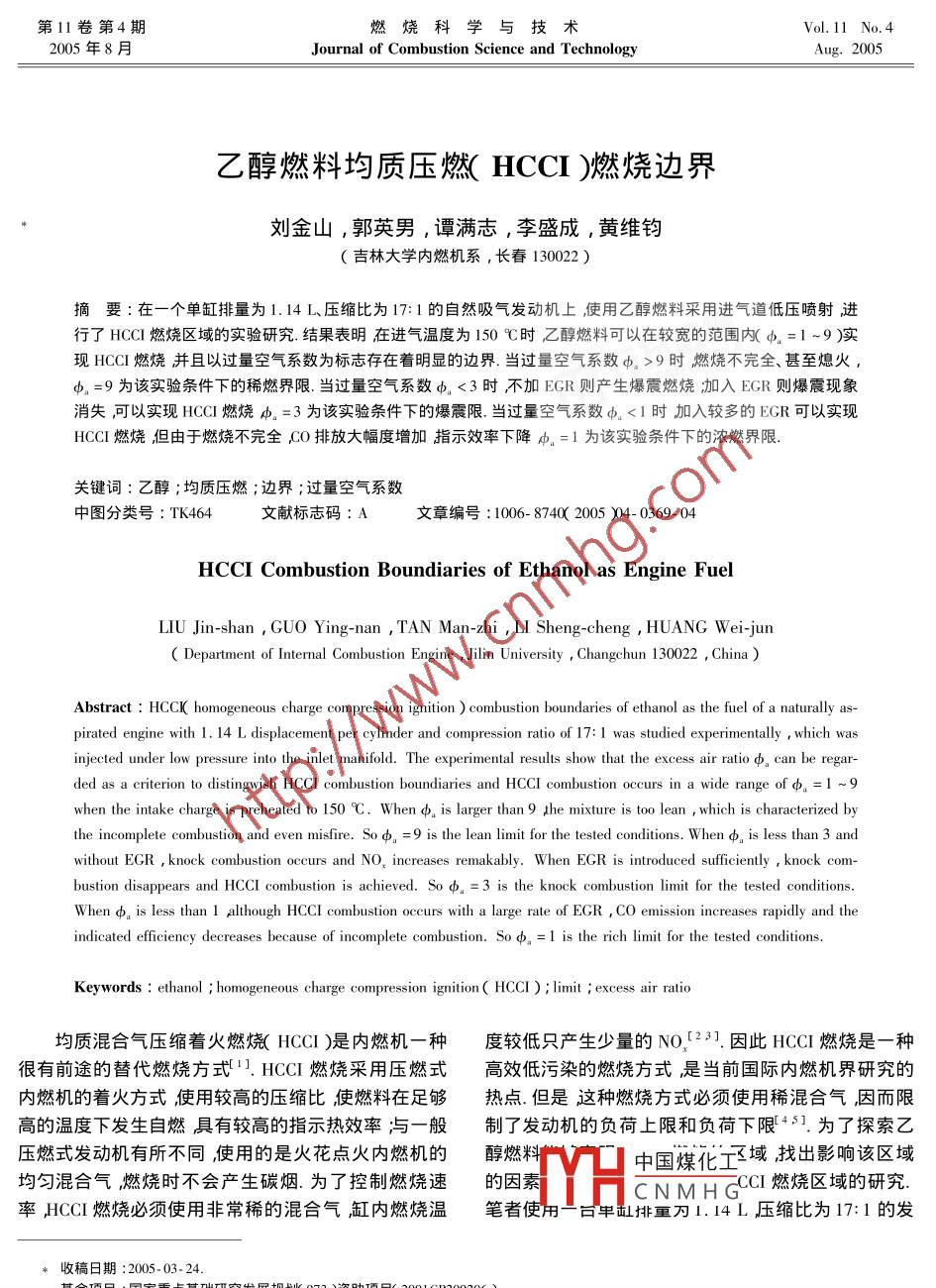 第11卷第4期燃燒科學(xué)與技術(shù)005年8月Journal of Combustion Science and TechnologyAug.2005乙醇燃料均質(zhì)壓燃(HCCⅠ)燃燒邊界劉金山,郭英男,譚滿志,李盛成,黃維鈞吉林大學(xué)內(nèi)燃機(jī)系,長(zhǎng)春130022)摘要∶在一個(gè)單缸排量為1.14Ⅰ壓縮比為17:1的自然吸氣發(fā)動(dòng)機(jī)上使用乙醇燃料采用進(jìn)氣道低壓噴射進(jìn)行了HCI燃燒區(qū)域的實(shí)驗(yàn)研究.結(jié)果表明在進(jìn)氣溫度為150℃時(shí)乙醇燃料可以在較寬的范圍內(nèi)(φ,=1-9)實(shí)現(xiàn)HCI燃燒并且以過量空氣系數(shù)為標(biāo)志存在著明顯的邊界.當(dāng)過量空氣系數(shù)d>9時(shí)燃燒不完全、甚至熄火=9為該實(shí)驗(yàn)條件下的稀燃界限當(dāng)過量空氣系數(shù)d<3時(shí)不加ER則產(chǎn)生爆震燃燒加入EGR則爆震現(xiàn)象消失可以實(shí)現(xiàn)HCI燃燒小。=3為該實(shí)驗(yàn)雜件下的爆震限.當(dāng)過量空氣系數(shù)φ。<1時(shí)加入較多的EGR可以實(shí)現(xiàn)HCCI燃燒但由于燃燒不完全CO排放大幅度增加指示效率下降。=1為該實(shí)驗(yàn)條件下的濃燃界限.關(guān)鍵詞:乙醇;均質(zhì)壓燃;邊界;過量空氣系數(shù)中圖分類號(hào):TK464文獻(xiàn)標(biāo)志碼:A文章編號(hào):1006-87402005)4-0369-04HCCI Combustion Boundiaries of Ethanol as Engine FuelLIU Jin-shan, GUO Ying-nan TAN Man-zhi, LI Sheng-cheng, HUANG Wei-junDepartment of Internal Combustion Engine, Jilin University Changchun 130022, ChinaAbstract: HCCK homogeneous charge compression ignition )combustion boundaries of ethanol as the fuel of a naturally as-pirated engine with 1. 14 L displacement per cylinder and compression ratio of 17: I was studied experimentally which wasinjected under low pressure into the inlet manifold. The experimental results show that the excess air ratio d, can be regar-ded as a criterion to distingwish HCCI combustion boundaries and HCCI combustion occurs in a wide range of d, =1-9when the intake charge is preheated to 150C. When is larger than 9 the mixture is too lean which is characterized bythe incomplete combustion and even misfire. So d. =9 is the lean limit for the tested conditions When d. is less than 3 andwithout EGR, knock combustion occurs and NO, increases remakably. When EGR is introduced sufficiently knock comdisappears and HCCI combustion is achieved. So =3 is the knock combustion limit for the tested conditionsWhen c, is less than I although HCCI combustion occurs with a large rate of EGR, Co emission increases rapidly and thendicated efficiency decreases because of incomplete combustion. So d, l is the rich limit for the tested conditionsKeywords: ethanol homogeneous charge compression ignition( HCCI); limit excess air ratio均質(zhì)混合氣壓縮著火燃燒(HCI)是內(nèi)燃機(jī)一種度較低只產(chǎn)生少量的NO231.因此HCCI燃燒是一種很有前途的替代燃燒方式凵.HcCI燃燒采用壓燃式高效低污染的燃燒方式是當(dāng)前囯際內(nèi)燃機(jī)界研究的內(nèi)燃機(jī)的著火方式使用較高的壓縮比使燃料在足夠熱點(diǎn).但是這種燃燒方式必須使用稀混合氣因而限高的溫度下發(fā)生自燃具有較高的指示熱效率盧一般制了發(fā)動(dòng)機(jī)的負(fù)荷上限和負(fù)荷下限45.為了探索乙壓燃式發(fā)動(dòng)機(jī)有所不同使用的是火花點(diǎn)火內(nèi)燃機(jī)的醇燃中國(guó)煤化工域找出影響該區(qū)域均勻混合氣,燃燒時(shí)不會(huì)產(chǎn)生碳煙.為了控制燃燒速的因素CNMHGCO燃燒區(qū)域的研究率HCCI燃燒必須使用非常稀的混合氣缸內(nèi)燃燒溫筆者使用排重為1.14L壓縮比為17:1的發(fā)*收稿日期:2005-03-24作竭歲周x:生人第英男2370燃燒科學(xué)與技術(shù)第11卷第4期動(dòng)機(jī)進(jìn)行了乙醇燃料HCCⅠ燃燒邊界的實(shí)驗(yàn).行第6缸實(shí)驗(yàn)缸)噴油當(dāng)冷卻水溫、潤(rùn)滑油溫度達(dá)到最佳狀態(tài)(85±5)℃)測(cè)取發(fā)動(dòng)機(jī)的有效扭實(shí)驗(yàn)儀器和設(shè)備躚(T)和轉(zhuǎn)速n然后向第6缸進(jìn)氣道嘖入乙醇燃料第6缸開始參加工作由于測(cè)功機(jī)為恒轉(zhuǎn)速運(yùn)行,實(shí)驗(yàn)是在一臺(tái)6缸自然吸氣式柴油機(jī)基礎(chǔ)上改造這時(shí)的扭距為6缸同時(shí)工作的扭距(T)則第6缸的單缸機(jī)上進(jìn)行的即把柴油機(jī)第6缸的進(jìn)、排氣及供的指示扭矩為油系統(tǒng)獨(dú)立岀來采用進(jìn)氣管噴射形成均勻混合氣用電加熱系統(tǒng)預(yù)熱進(jìn)入氣缸的空氣.用廢氣再循環(huán)控制第6缸的指示功率為爆震的產(chǎn)生.圖1為實(shí)驗(yàn)裝置示意實(shí)驗(yàn)用發(fā)動(dòng)機(jī)的主要技術(shù)參數(shù)如表1主要設(shè)備500儀器如表2第6缸的平均指示壓力為120PPm(6)EGR管路EGR閥Vsi式中:Vs為汽缸工作容積,m3;n為發(fā)動(dòng)機(jī)轉(zhuǎn)速空氣流量計(jì)進(jìn)氣加熱器電控噴油器2.2EGR率的確定噴油泵在混合氣較濃時(shí)為防止產(chǎn)生爆震燃燒高比例廢為其余5缸供治氣再循環(huán)(EGR)是必須的.EGR量通過連接進(jìn)排氣管上的閥門進(jìn)行調(diào)節(jié).EGR率通過測(cè)量進(jìn)排氣中CO乙醇柴油的體積分?jǐn)?shù)計(jì)算得到EGR率的定義為圖1實(shí)驗(yàn)裝置示意Pco, in-cO%Re100%表1實(shí)驗(yàn)機(jī)的主要技術(shù)參數(shù)式中m2m為進(jìn)氣總管內(nèi)氣體CO2的體積分?jǐn)?shù)2h支術(shù)參數(shù)描標(biāo)為周邊環(huán)境大氣中C02的體積分?jǐn)?shù)0為排氣中類型自然吸氣、直列、四沖程、水冷CO2的體積分?jǐn)