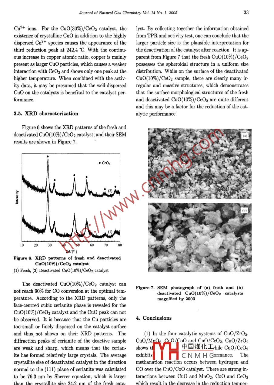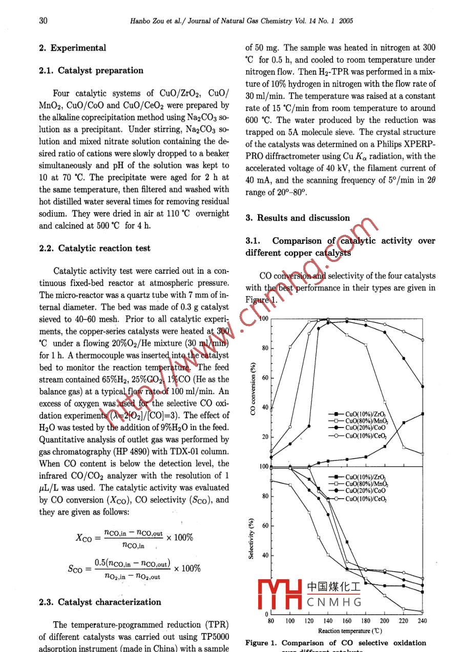 Jourmal NtaralGas ChetisaryJournal of Natural Gas Chemistry 14(2005)29-34SCIENCE PRESSCO Selective Oxidation in Hydrogen-Rich Gas overCopper Series CatalystsHanbo Zou1*,Xinfa Dong',Weiming Lin1,21. Schoo of Chemical and Energy Engineering, South China University of Technology, Guangzhou 510640, China;2. Department of Biological and Chemical Engineering, Guangzhou University, Guangzhou 510405, China[Manuscript received Decenber 13, 2004; revised February 16, 2005]Abstract: The performances of CO selective oxidation in hydrogen-rich gas over four catalytic systemsof CuO/ZrO2, CuO/MnO2, CuO/CoO and CuO/CeO2 were compared. The reducibility of these catalystsand the efect of CuO and CeO2 molar ratio of CuO/CeO2 catalysts on the activity of selective COoxidation are investigated by XRD and TPR methods. The results show that the catalysts with theexception of CuO/ZrO2 have the interactions between CuO and CoO, CeO2 or MnO2, which result in adecrease in the reduction temperature. Among the catalysts studied, CuO/ZrO2 catalyst shows the lowestcatalytic activity while CuO/CeO2 catalyst exhibits the best catalytic performance. The CuO(10%)/CeO2catalyst attains the highest CO conversion and seletivity at 140 and 160 °C. The addition of 9% H20 inthe reactant feed decreases the activity of CuO/CeO2 catalyst but increases its CO selectivity.Key words: hydrogen-rich gas, copper-series catalyst, CuO/CeO2 catalyst, selective oxidation, carbonmonoxide1. Introductionhave desirable activity and long-term stability, thehigh cost may limit their applicability for transporta-tion. Development of non-noble metal catalysts is at-Hydrogen fuelled polymer electrolyte membranetractive. It has been well documented that Cu and Aufuel cells (PEMFC) show considerable potential asshow superior low-temperature performance for selec-a cleaner, more efficient system than the currentlytive oxidation of CO than Pt[4]. It is ilustrated thatused compression engines in automobiles. In orderCuO can produce a strong interaction with severalto avoid problems associated with hydrogen distribu-3d transition metal oxide or rare earth oxide and im-tion and storage, H2 can be produced on-board byproves its catalytic activity[5-7]. In this study, foursteam reforming or autothermal reforming of hydro-types of copper-series catalysts, namely CuO/ZrO2,carbon fuels, such as gasoline and methanol. RemovalCuO/MnO2, CuO/Co0 and CuO/CeO2, are investi-of about 1%CO remaining in hydrogen-rich gas to .gated on the CO selective oxidation with simulated100 μL/L is a critical technology. Selective oxidationreformate gas. The properties of these catalysts wereof CO with oxygen appears to be the simplest andcharacterized by TPR and XRD techniques. Themost efective method for removing CO. The catalystseffects of CuO and CeO2 molar ratio in CuO-CeO2proposed in the literatures for this process are noblecatalys中國煤化工n the fed on themetal- based catalysts, such as Au/- Al2O3[1], Pt/Ce-catalyte also discussed.ZrO2[2], K Rh/SiO2[3]. Although precious catalystsYHCNMHG* Corresponding author. Tel: 020-87111884, E-mail: zoubb2000@sohu.com;This work was financially supported by Guangdong Province Natural Science Foundation of China(000435), the DoctoralProgram Foundation of the Ministry of Education (20010561003) and Guangzhou Municipal Science and Technology Project(2001J1-C0211)30Hanbo Zou et al./ Journal of Natural Gas Chemistry Vol. 14 No.1 20052. Experimentalof 50 mg. The sample was heated in nitrogen at 300°C for 0.5 h, and cooled to room temperature under2.1. Catalyst preparationnitrogen flow. Then H2-TPR was performed in a mix-ture of 10% hydrogen in nitrogen with the flow rate ofFour catalytic systems of CuO/ZrO2, CuO/30 ml/min. The temperature was raised at a constantMnO2, CuO/CoO and CuO/CeO2 were prepared byrate of 15 °C/min from room temperature to aroundthe alkaline coprecipitation method using Na2CO3 so-600 °C. The water produced by the reduction waslution as a precipitant. Under stirring, Na2CO3 so-trapped on 5A molecule sieve. The crystal structurelution and mixed nitrate solution containing the de-of the catalysts was determined on a Philips XPERP-sired ratio of cations were slowly dropped to a beakerPRO diffractrormneter using Cu Ka radiation, with thesimultaneously and pH of the solution was kept toaccelerated voltage of 40 kV, the filament current of10 at 70 °C. The precipitate were aged for 2 h at40 mA, and the scanning frequency of 5°/min in 20the same temperature, then filtered and washed withrange of 20° -80°.hot distilled water several times for removing residualsodium. They were dried in air at 110 °C overnight3. Results and discussionand calcined at 500 °C for 4 h.3.1. Comparison of catalytic activity over2.2. Catalytic reaction testdifferent copper catalystsCatalytic activity test were carried out in a con-CO conversion and selectivity of the four catalyststinuous fixed-bed reactor at atmospheric pressure.with the best performance in their types are given inThe micro-reactor was a quartz tube with 7 mm of in-Figure 1.ternal diameter. The bed was made of 0.3 g catalystsieved to 40- 60 mesh. Prior to all catalytic experi-100ments, the copper series catalysts were heated at 300°C under a flowing 20%O2/He mixture (30 ml/min)for 1 h. A thermocouple was inserted into the catalystbed to monitor the reaction temperature. The feed區(qū)stream contained 65%H2, 25%CO2, 1%CO (He as the60一balance gas) at a typical flow rate of 100 ml/min. Anexcess of oxygen was used for the selective CO oxi-dation experiments (\=2[O2]/[CO]= -3). The effect of+ Cu0(10%)VZrO3H2O was tested by the addition of 9%H2O in the feed.十CuO(20%VCoO- 0- Cu0(10%)CeO,Quantitative analysis of outlet gas was performed bygas chromatography (HP 4890) with TDX-01 column.When CO content is below the detection level, theinfrared CO/CO2 analyzer with the resolution of 1- C(10%)VZrO2μL/L was used. The catalytic activity was evaluated-◆. C0(209%/)Co0by CO conve