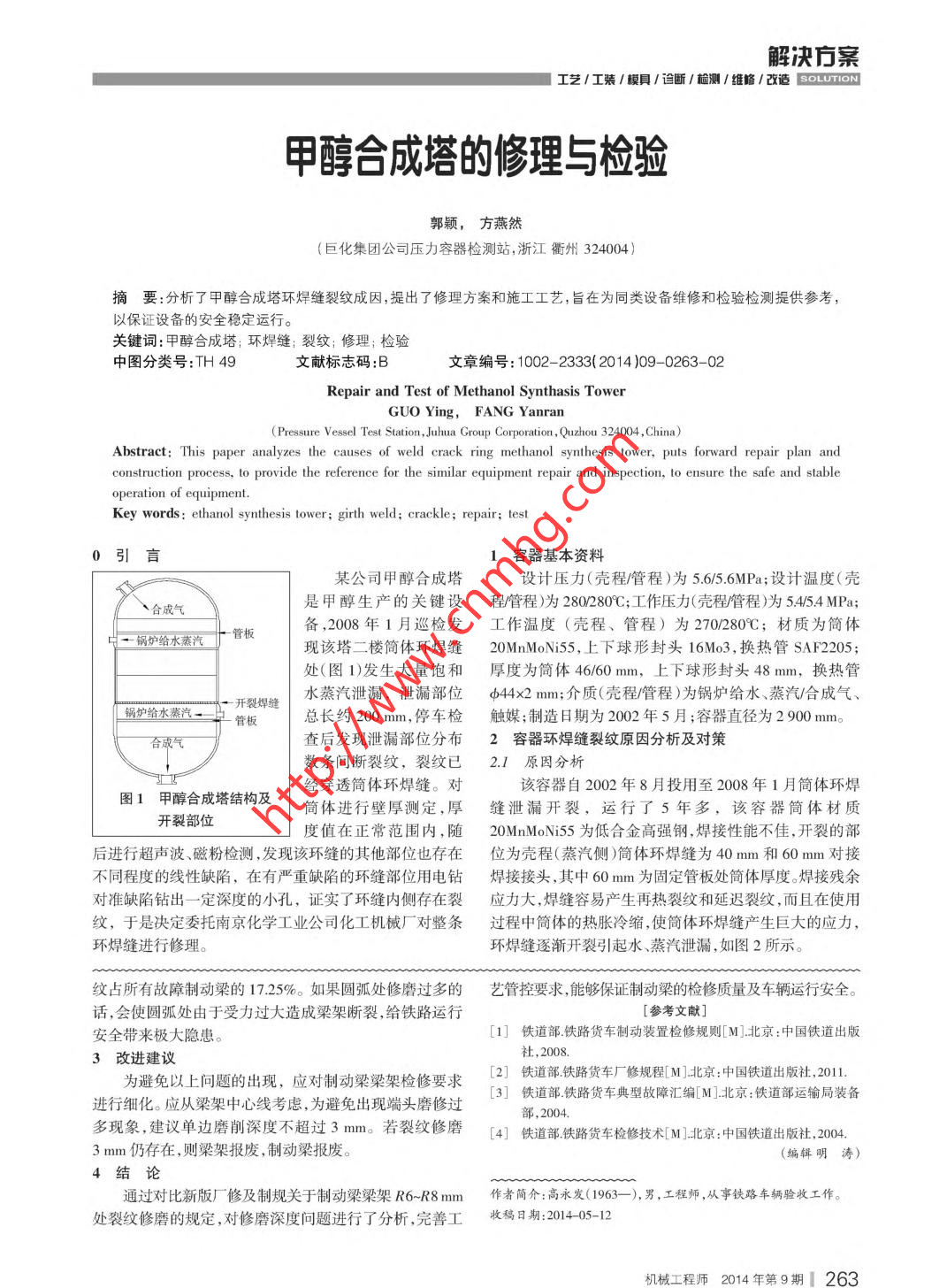 解決方案工藝/工裝/模具/診斷/檢測(cè)1維修/改造SOLUTION甲醇合成塔的修理與檢驗(yàn)郭穎,方燕然(巨化集團(tuán)公司壓力容器檢測(cè)站,浙江衢州324004)摘要:分析了甲醇合成塔環(huán)焊縫裂紋成因,提出了修理方案和施工工藝,旨在為同類設(shè)備維修和檢驗(yàn)檢測(cè)提供參考,以保證設(shè)備的安全穩(wěn)定運(yùn)行。關(guān)鍵詞:甲醇合成塔;環(huán)焊縫;裂紋;修理;檢驗(yàn)中圖分類號(hào):TH 49文獻(xiàn)標(biāo)志碼:B文章編號(hào): 1002- -2333( 2014 )09- -0263 -02Repair and Test of Methanol Synthasis Tower(Pressure Vessel Test Station,Juhua Group Corporation , Quzhou 324004 ,China)Abstract: This paper analyzes the causes of weld crack ring methanol synthesis tower, puts forward repair plan andconstruction process, to provide the reference for the similar equipment repair and inspection, to ensure the safe and stableoperation of equipment.Key words: ethanol synthesis tower; gith weld; crackle; repair; test0引言1容器基本資料某公司甲醇合成塔設(shè)計(jì)壓力(殼程/管程)為5.6/5.6MPa;設(shè)計(jì)溫度(殼、合成是甲醇生產(chǎn)的關(guān)鍵設(shè)程管程)為280/280C;工作壓力(殼程管程)為5.4/5.4 MPa;中一鍋爐給水蒸汽-管板備,2008年1月巡檢發(fā)工作溫度(殼程、管程)為270/280C;材質(zhì)為簡(jiǎn)體現(xiàn)該塔二樓簡(jiǎn)體環(huán)焊縫20MnMoNi55,上下球形封頭16Mo3,換熱管SAF2205;處(圖1)發(fā)生大量飽和厚度為簡(jiǎn)體46/60 mm,上下球形封頭48 mm,換熱管水蒸汽泄漏,泄漏部位φ44x2 mm;介質(zhì)(殼程/管程)為鍋爐給水、蒸汽/合成氣、鍋爐給水蒸汽.- 開裂焊縫總長(zhǎng)約200mm,停車檢觸媒;制造日期為2002年5月;容器直徑為2900mm。- 管板合成氣查后發(fā)現(xiàn)泄漏部位分布2 容器環(huán)焊縫裂紋原因分析及對(duì)策數(shù)條間斷裂紋,裂紋已2.1 原因分析經(jīng)穿透筒體環(huán)焊縫。對(duì)該容器自2002年8月投用至2008年1月簡(jiǎn)體環(huán)焊圖1甲醇合 成塔結(jié)構(gòu)及筒體進(jìn)行壁厚測(cè)定,厚縫泄漏開裂,運(yùn)行了5年多,該容器簡(jiǎn)體材質(zhì)開裂部位度值在正常范圍內(nèi),隨20MnMoNi55為低合金高強(qiáng)鋼,焊接性能不佳,開裂的部后進(jìn)行超聲波、磁粉檢測(cè),發(fā)現(xiàn)該環(huán)縫的其他部位也存在位為殼程(蒸汽側(cè))簡(jiǎn)體環(huán)焊縫為40mm和60mm對(duì)接不同程度的線性缺陷,在有嚴(yán)重缺陷的環(huán)縫部位用電鉆焊接接頭,其中60 mm為固定管板處簡(jiǎn)體厚度。焊接殘余對(duì)準(zhǔn)缺陷鉆出- -定 深度的小孔,證實(shí)了環(huán)縫內(nèi)側(cè)存在裂應(yīng)力大,焊縫容易產(chǎn)生再熱裂紋和延遲裂紋,而且在使用紋,于是決定委托南京化學(xué)IT業(yè)公司化工機(jī)械廠對(duì)整條過程中簡(jiǎn)體的熱脹冷縮,使簡(jiǎn)體環(huán)焊縫產(chǎn)生巨大的應(yīng)力,環(huán)焊縫進(jìn)行修理。環(huán)焊縫逐漸開裂引起水、蒸汽泄漏,如圖2所示。紋占所有故障制動(dòng)梁的17.25%。如果圓弧處修磨過多的藝管控要求,能夠保證制動(dòng)梁的檢修質(zhì)量及車輛運(yùn)行安全。話,會(huì)使圓弧處由于受力過大造成梁架斷裂,給鐵路運(yùn)行[參考文獻(xiàn)]安全帶來極大隱患。[1]鐵道部.鐵路貨車制動(dòng)裝置檢修規(guī)則[M].北京:中國(guó)鐵道出版社,2008.3改進(jìn)建議為避免以上問題的出現(xiàn),應(yīng)對(duì)制動(dòng)梁梁架檢修要求2]鐵道 部.鐵路貨車廠修規(guī)程[ M ].北京:中國(guó)鐵道出版社, 2011.進(jìn)行細(xì)化。應(yīng)從梁架中心線考慮,為避免出現(xiàn)端頭磨修過3] 鐵道部.鐵路貨車典型故障匯編[M].北京:鐵道部運(yùn)輸局裝備部,2004.多現(xiàn)象,建議單邊磨削深度不超過3mm。若裂紋修磨[4] 鐵道部 鐵路貨車檢修技術(shù)[M]北京:中國(guó)鐵道出版,2004.3mm仍存在,則梁架報(bào)廢,制動(dòng)梁報(bào)廢。(編輯明濤)4結(jié)論通過對(duì)比新版廠修及制規(guī)關(guān)于制動(dòng)梁梁架R6~R8mm作者 簡(jiǎn)介:高永發(fā)(1963- -),男,工程師,從事鐵路車輛驗(yàn)收工作。處裂紋修磨的規(guī)定,對(duì)修磨深度問題進(jìn)行了分析,完善工收稿日期:2014-05-12機(jī)械工程師2014年第9期 I 263.