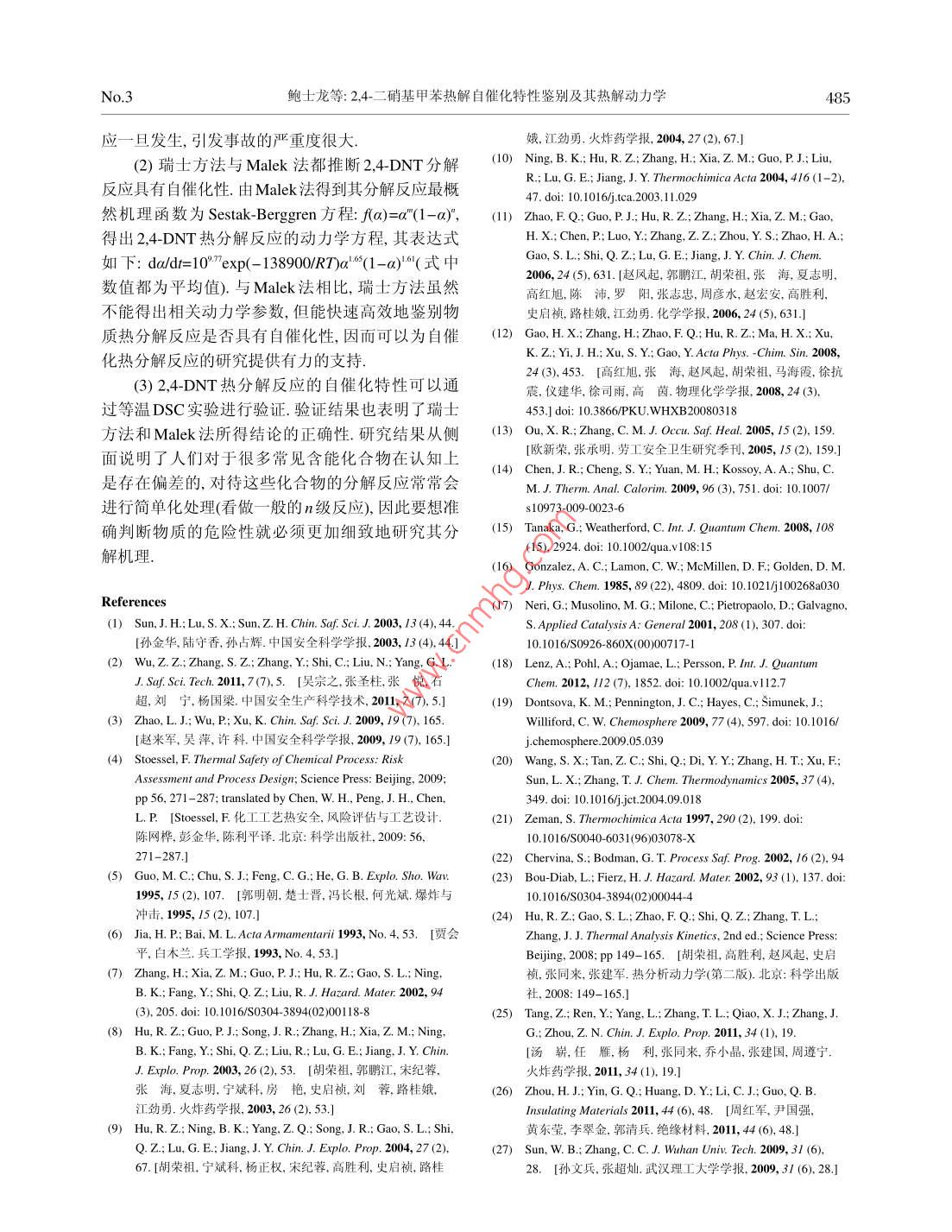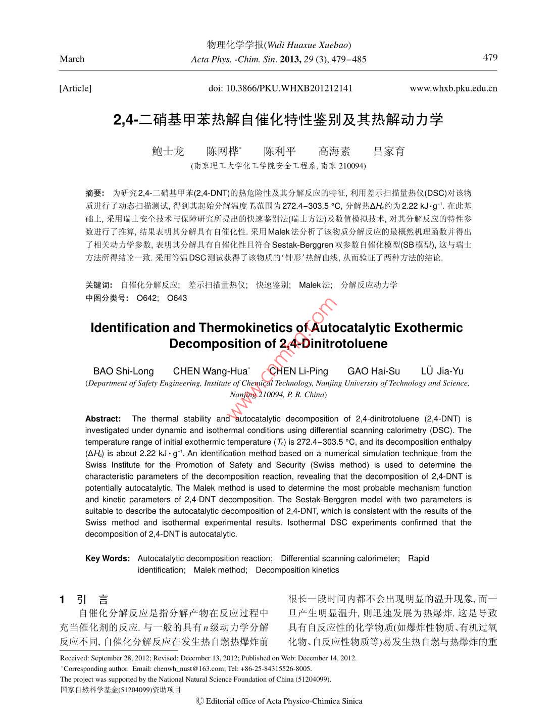 物理化學(xué)學(xué)報( Wuli Huaxue Xuebao)MarchActa Phys. -Chim. Sin. 2013, 29 (3), 479- -485479[Article]doi: 10.3866/PKU.WHXB201212141www.whxb.pku.edu.cn2,4-二硝基甲苯熱解自催化特性鑒別及其熱解動力學(xué)鮑士龍.陳網(wǎng)樺“陳利平高海素呂家育(南京理工大學(xué)化工學(xué)院安全工程系,南京210094)摘要:為研究2,4-二硝基 甲苯(2,4-DNT)的熱危險性及其分解反應(yīng)的特征,利用差示掃描量熱儀(DSC)對該物質(zhì)進行了動態(tài)掃描測試,得到其起始分解溫度To范圍為272.4-303.5。C,分解熱OH約為2.22 kJ.g*.在此基礎(chǔ)上,采用瑞士安全技術(shù)與保障研究所提出的快速鑒別法(瑞士方法)及數(shù)值模擬技術(shù),對其分解反應(yīng)的特性參數(shù)進行了推算,結(jié)果表明其分解具有自催化性.采用Malek法分析了該物質(zhì)分解反應(yīng)的最概然機理函數(shù)并得出了相關(guān)動力學(xué)參數(shù),表明其分解具有自催化性且符合SestakBerggren雙參數(shù)自催化模型(SB模型),這與瑞士方法所得結(jié)論一致.采用等溫DSC測試獲得了該物質(zhì)的‘鐘形’熱解曲線,從而驗證了兩種方法的結(jié)論.關(guān)鍵詞:自 催化分解反應(yīng);差示掃描量熱儀; 快速鑒別; Malek法; 分解反應(yīng)動力學(xué)中圖分類號: 0642; 0643ldentification and Thermokinetics of Autocatalytic ExothermicDecomposition of 2,4-DinitrotolueneBAO Shi-LongCHEN Wang-Hua°CHEN Li-PingGAO Hai-SuLU Jia-Yu(Department of Safety Engineering, Institute of Chemical Technology, Nanjing University of Technology and Science,Nanjing 210094, P R. China)Abstract: The thermal stability and autocatalytic decomposition of 2,4-dinitrotoluene (2,4-DNT) isinvestigated under dynamic and isothermal conditions using difterential scanning calorimetry (DSC). Thetemperature range of initial exothermic temperature (To) is 272.4-303.5。C, and its decomposition enthalpy(OH) is about 2.22 kJ . g'. An identification method based on a numerical simulation technique from theSwiss Institute for the Promotion of Safety and Security (Swiss method) is used to determine thecharacteristic parameters of the decomposition reaction, revealing that the decomposition of 2,4-DNT ispotentially autocatalytic. The Malek method is used to determine the most probable mechanism functionand kinetic parameters of 2,4-DNT decomposition. The Sestak-Berggren model with two parameters issuitable to describe the autocatalytic decomposition of 2,4-DNT, which is consistent with the results of theSwiss method and isothermal experimental results. Isothermal DSC experiments confirmed that thedecomposition of 2,4-DNT is autocatalytic.Key Words: Autocatalytic decomposition reaction; Differential scanning calorimeter; Rapididentification; Malek method; Decomposition kinetics1引言很長--段時間內(nèi)都不會出現(xiàn)明顯的溫升現(xiàn)象,而一自催化分解反應(yīng)是指分解產(chǎn)物在反應(yīng)過程中旦產(chǎn)生明顯溫升,則迅速發(fā)展為熱爆炸.這是導(dǎo)致充當(dāng)催化劑的反應(yīng).與一般的具有n級動力學(xué)分解具有自反應(yīng)性的化學(xué)物質(zhì)(如爆炸性物質(zhì)、有機過氧反應(yīng)不同,自催化分解反應(yīng)在發(fā)生熱自燃熱爆炸前化物、自反應(yīng)性物質(zhì)等)易發(fā)生熱自燃與熱爆炸的重Reccived: September 28. 2012; Revised: December 13, 2012; Published on Web: December 14, 2012.'Corresponding author. Email: chenwh_ nust@ 163.com; Tel: +86-25-843 15526- 8005.The project was supported by the National Natural Science Foundation of China (51204099.國家自然科學(xué)基金(51204099)資助項目C Editorial office of Acta Physico Chimica Sinica480Acta Phys. -Chim. Sin. 2013Vol.29要原因.'在如今危險化學(xué)品安全生產(chǎn)狀況雖然持續(xù)類似2,4二硝基甲苯這樣的含能化學(xué)品分解反好轉(zhuǎn),但是在形勢依然嚴峻的大背景下,3為了正確應(yīng)的特性描述對其生產(chǎn)工藝的研發(fā)及儲運是至關(guān)識別、評價其潛在危險性,并在此基礎(chǔ)上針對性地重要的,而在研究其分解反應(yīng)方面DSC被廣泛應(yīng)采取防控措施,從而確保此類化學(xué)物質(zhì)在儲運及使用.”本文從實驗和理論分析兩方面對2,4-DNT分解用等過程中的安全,必須對其反應(yīng)機理及特性、鑒反應(yīng)的特征及動力學(xué)參數(shù)進行了研究.在此基礎(chǔ)別方法及表征等進行深入研究.上,考慮到等溫測試是對自催化分解反應(yīng)進行實驗國外學(xué)者對自催化分解反應(yīng)進行了大量研究,驗證的最可靠方法,對該物質(zhì)在等溫條件下熱行為并取得了許多研究成果,提出了三種描述自催化反進行了測試,并將測試結(jié)果與理論分析進行了印證應(yīng)的模型,分別是Prout-Tompkins模型(簡稱PT模比較.型), Benito-Perez模型(簡稱BP模型)和源自柏林學(xué)院的柏林模型:雖然近二十年來,國內(nèi)(含臺灣地區(qū))2儀器與測試條件的熱分析研究得到了迅猛發(fā)展,但總體而言,在物實驗樣品:2,4-DNT(純度9%,國藥(沃凱)試質(zhì)1物料自催化分解反應(yīng)的熱測試與表征方面的研劑).設(shè)備: DSC-1專業(yè)型,瑞士METTLER TOLEDO究開展較少.上世紀90年代,國內(nèi)學(xué)者先后研究討公司生產(chǎn).論了JH9105炸藥與奧克托今炸藥(HMX)的自催化實驗條件:不銹鋼密封坩堝,實驗中測試氣氛特性,但這些研究所沒有得出相關(guān)的動力學(xué)參數(shù)及維持不變,分別以50和100 mL.s'的N2為反應(yīng)氣和模型.502000年以后,Zhang等利用非等溫差示掃描干燥氣.動態(tài)實驗中升溫速率分別為1.2.4、8 °C.量熱儀(DS