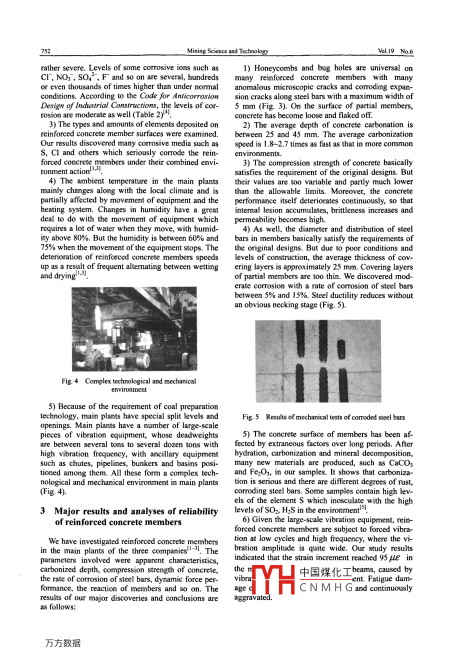 Availableonlineatwww.sciencedirect.comMINING. Science DirectSCIENCE ANDTECHNOLOGYELSEVIERMining Science and Technology 19(2009)0750-0755www.elsevier.com/locate/jcumtDamage and deterioration mechanism and curing technique ofconcrete structure in main coal cleaning plantsLV Heng-lin", ZHAO Cheng-ming, SONG Lei, MA Ying, XU Chun-huaSchool of Architecture and Civil Engineering, China University of Mining Technology, Xuzhou, Jiangsu 221116, China2State Key Laboratory for Geomechanics and Deep Underground Engineering, Xuzhou, Jiangsu 221008, chinaWuhan Design& Research Institute of Sinocoal International Engineering Group, Wuhan, Hubei 430064, ChinaAbstract: Concrete structures in main coal cleaning plants have been rebuilt and reinforced in the coal mines of the Shanghai Da-nun Energy Sources Co. Ltd, the first colliery of the Pingdingshan Coal Co. Ltd. and the Sanhejian mine of the Xuzhou MiningGroup Co. Ltd. In these projects, the operating environment and reliability of concrete structures in the main plants of the threeompanies were investigated and the safety of the structures inspected. Qualitative and quantitative analyses were made on the spe-cial natural, technological and mechanical environments around the structures. On the basis of these analyses, we discuss thelong-term, combined actions of the harsh natural (corrosive gases, liquids and solids) and mechanical environments on concretestructures and further investigated the damage and deteriorating mechanisms and curing techniques of concrete structures in thmain coal cleaning plants. Our study can provide a theoretical basis for ensuring the reliability of concrete structures in main coalcleaning plantsKeywords: main coal cleaning plants; concrete structure; operating environment; reliability detection and inspection; damage anddeteriorating mechanisms; curing technique1 Introductioncontent have improved or modified some large-scalevibration equipment in the main plants of the threeThe main coal cleaning plants of the Shanghai Da- companies, where partial members needed to be re-n Energy Sources Co. Ltd, the first coal mine of built. To ensure that the plants can meet their re-the Pingdingshan Coal Co. Ltd. and the Sanhejian quirements in terms of function and durability aftercoal mine of the Xuzhou Mining Group Co. Ltd, the improvements, we have carried out a comprehenbuilt during the 1980s have served for more than 20 sive study of the natural environments, the technolyears( Fig. I). The special uses and processes of main ogy used and the mechanical environment and thecleaning plants worsen their intemal environment. reliability of reinforced concrete members in threeThey result in increases in the amounts of corrosive main plants between 2005 to 2008. Based onases and liquids and solids accumulate on member these studies and assessments, structures were redes-surfaces with the frequent alternation of wetting and igned for checking the safety of relevant membersdrying( Fig. 2). Simultaneously, vibration loads from and overall structures. Further improvements for re-power equipment have serious consequences. Thus pair, reinforcement and maintenance were designedmost reinforced concrete members exhibit serious separately. The damage and deteriorating mechanismdamage and deterioration phenomena, such as con- of concrete structures in the main plants, which showcrete spalling, clouds of micro-cracks, crack propaga- the worst natural and special mechanical environ-tion, exposed steel corrosion etc( Fig. 3). Many hid- ments were studied and effective reinforcement andden dangers already exist in normal production and maintenance techniquesdiscussedthe safety of concrete members.structures which had been damaged or allowed toIn order to meet the requirements of transforming deteriorate. Thus the long-term safety and durabilitycoal prepararation processes, recent improvements in of the structures can now be ensuredthe yield and quality of coal and reductions in slime中國煤化工Received 1I February 2009: accepted 26 May 2009CNMHGProject BK2008128 supported by the Natural Science Foundation of Jiangsu ProvinceCorrespondingauthor.Tel:+86-516-83590601;E-mailaddress:henglinlv@cumt.edu.cnFig. I Picture of main coal cleaning plantFig 2 Accumulation of corrosive media in main coal cleaning plantFig 3 Serious damage and deterioration of reinforced concrete membersTable 1 Results of gases discovered in the environmentLocation00141Outside Sanhejian main plant00191Inside Datun main plant00181Outside Datun main pla00152021130.05620.0824Table 2 Results of liquids discovered in the environmentLocationSO4H valueInside Sanhejian main plant1319Outside Sanhejian main plantOutside Pingdingshan main plant16233Inside Datun main plant2 Major results and analyses of operating structures of the main coal cleaning plants are locatedenvironmentsis the worst. The levels of many corrosive gaseousmedia such as H,S, HCl, SO, Cl and others areCompared with more general buildings, the main dozens to hundreds times higher than under normalcoal cleaning plants have a unique operating envi- conditions. According to the Code for Anticorrosionronment which entail the worst natural. as well as花- nd judging by thecomplex technological and mechanical environments. corro中國煤lbers, the levelsThe results discovered and analyses of the operating of theCNMHGnsidered moderateenvironments are as followsI)The gaseous environment in which the concrete2)The liquid environment of the main plants752Mining Science and TechnologVol 19 No 6rather severe Levels of some corrosive ions such as1)Honeycombs and bug holes are universalCl, NO3, SO4, F and so on are several, hundreds many reinforced concrete members with manyor even thousands of times higher than under normal anomalous microscopic cracks and corroding expanconditions. According to the Code for Anticorrosion sion cracks along steel bars with a maximum width ofDesign of Industrial Constructions, the levels of cor- 5 mm( Fi