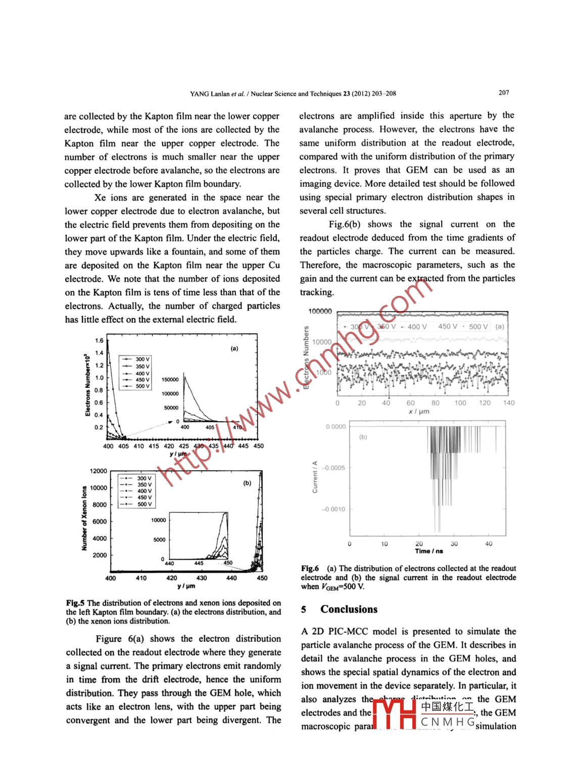 Nuclear Science and Techniques 23 (2012) 203- -208Amplification process of a gas electron multiplier simulated byPIC-MCC modelYANG Lanlan TU Yan Harm Tolner ZHONG XuefeiZHANG Panpan QIN NanaMA ShanleSchool of Elecronic Science and Engineering, Southeast University, Nanjing 210096, ChinaAbstract The performance of a single gas electron multiplier (GEM) in pure Xe at an atmospheric pressure isinvestigated by Particle in Cell-Monte Carlo Collision (PIC-MCC) model. The micro development processes withelectrons and ions distributions in space have been revealed. Based on the micro development processes, themacroscopic parameters such as GEM gain and the effective eficiency have also been obtained. The simulationresults indicate that after tens of nanoseconds, electrons are collected by the readout electrode while the ions still existin the gas space for several microseconds. The main signal current is formed by the electrons ariving at the readoutelectrode, but electrons and ions are also cllected by the copper electrodes near the GEM hole and the thin Kaptonfilm boundary. The simulated gain of GEM exponentially increases with the applied GEM voltage. With thePIC-MCC simulations, both the physical amplification and charging mechanisms in the GEM device can be wellunderstood, which is beneficial to the device design.Key words Gas electron multiplier, Particle in Cell-Monte Carlo Collision, Gainmultiplication processes in GEM holes, which an1 Introductionimportant for understanding the GEM amplificationGas electron multiplier (GEM) is a robust device forand charging mechanisms. In this paper, aproportional amplification of electrons released in anParticle-ln-Cell/Monte-Carlo Collision (PIC-MCC)iradiated gas by charged particles or photons. A GEMsimulation method is used to simulate the electronconsists of a thin polymer film, coated on each sideavalanche in GEM, which can distinctly reveal thewith metal, applied with suitable bias voltage, andavalanche process in the GEM apertures. Also, it canperforated by a high density of holes. It is used in ainvestigate the electron and ion motions in the devicewide range of conditions and gas fllings, for detectingseparately, and can analyze the charge distributions inGEM electrodes and GEM foils.charged particles, X-rays and single photoelectrons.The advantages of GEM-based detectors include high2 GEM simulation cell structurecounting rate, excellent spatial resolution, goodimaging capability, operation in magnetic field, largeThe basic component of GEM is a metal-coated thinsensitive area and low costl-51.Kapton film, chemically pierced with a high density ofSimulations based on the GARFIELD code andholes, typically φ50- 100 μum in a 100 -200 μm pitch.MAXWELL/ ANSYS eletric field analyzer 68 areThe polymer film is 50-μm thick, with 5-um copperuseful for optimizing electrical and geometricalcoating on both sides!9!. The holes are made byparameters of a GEM. However, a GARFIELDchemical erosion, and their typical geometry structuresimulation often fails to provide detailed particleis double-conical. The drift electrode is placed severalSupported by the Nationsl Natural Science Foundation of China under Contract No.50907009 and 60871015.中國煤化工cholarsorSoutheast University●Corresponding author, E-mail adres: jujube. yang@seu.edu.cn'fHCNMHG .Received date: 2012-02-23YANG Lanlan er al.1 Nuclear Science and Techniques 23 (2012) 203- 208203.(aBecause of their heavy mass and smaller2.5|velocity, the Xe ion distribution in space can depict the- Electronsavalanche shape. During the avalanche process, theXenon lons曼.。electrons and Xe ions are collected by the Kapton filmg 1.5boundaries and the lower copper electrodes. At 31 ns,1.0 tmost electrons pass through the aperture and move0:toward the readout electrode. And the ions movingupwards are collected by the upper copper electrode.00 200 300 400 500 600Finally, the residual electrons are collected by theTime /nsreadout electrode and generate a signal current, while0012m800F 31ims-(ban ion will either to be collected by GEM upper Cu600600-electrode or move towards the drift electrode. The里400一專400i號400process lasts for several microseconds, depending on00 ttheir drift velocity. In our simulation model, the whole50 10x1umx1 umprocess is simulated by Monte-Carlo method, which isclose to the real physical mechanisms, but moreB00F 75mprecise results can be achieved with the PIC-MCCsimulation in longer computer hours.I a00E..oo200GEM characteristics50 100x/um4.1 GEM gainFig.2 Changes in the number of electrons and xenon ions (a),While knowing the number of electrons and ions inand electron (b) distributions and xenon ion (c) distributions inspace as a function of time, we need to know thethe amplification process in the GEM.macroscopic parameters, such as the gain and theThe amplification process of electrons andeffective efficiency, so as to compare the simulationxenon ions can be observed clearly in Fig.2(b) andresults with experimental data. Here, we define the2(c). Within one nanosecond, the primary electronsvariables as follows: The total GEM gain, Gror=No/Nini,emit from the drift electrode. Then until 12ns, thewhere Not is the total number of electrons afterelectrons are at the drift region and move towards themultiplication and Nini is the number of primaryGEM hole by the drift electric field. The primaryelectrons. The effective GEM gain, Gef =Nt!Nini,electrons may collide with gas atoms, but nowhere Nerr is the number of electrons collected by theionization occurs in the drift region as the elecric fieldreadout electrode to generate a signal current.is not strong enough to cause ionization; hence noappearance of xenon ions in the drift region. In theirmovement to the GEM hole, some electrons may ber Simulated, PIC-MCC合Gep Measured, Ref[13]collected by the upper copper electrodes, while theGot= 0.1274@0196Vothers enter into the GEM hole. However, a 100%transparency of primary electrons 