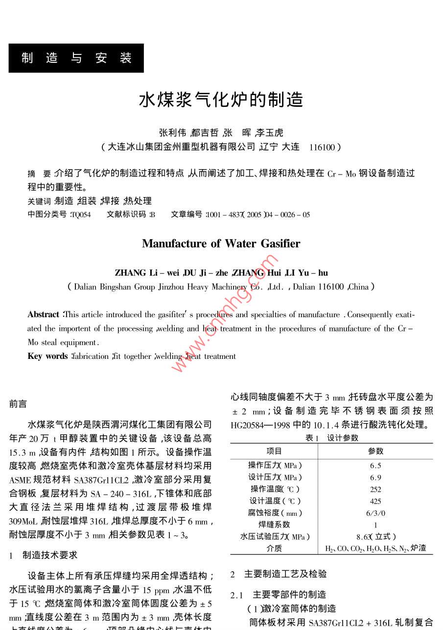 制造與安裝水煤漿氣化爐的制造張利偉都吉哲張暉李玉虎(大連冰山集團金州重型機器有限公司遼寧大連116100)摘要介紹了氣化爐的制造過程和特點從而闡述了加工、焊接和熱處理在Cr-Mo鋼設(shè)備制造過程中的重要性。關(guān)鍵詞制造組裝焊接熱處理中圖分類號:TQ054文獻標識碼 :B文章編號:1001 - 4837( 2005 )04 - 0026- 05Manufacture of Water GasifierZHANG Li- wei ,DU Ji- zhe ZHANG Hui LI Yu- hu( Dalian Bingshan Group Jinzhou Heavy Machinery Co. ,Ltd. , Dalian 116100 China )Abstract :This article introduced the gasifiter' s procedures and specialties of manufacture . Consequently exati-ated the importent of the processing ,welding and heat treatment in the procedures of manufacture of the Cr -Mo steal equipment.Key words fabrication ;血together iwelding heat treatment心線同軸度偏差不大于3 mm托磚盤水平度公差為前言土2 mm;設(shè)備制造完畢不銹鋼表面須按照水煤漿氣化爐是陜西渭河煤化工集團有限公司HG20584- 1998 中的10. 1.4條進行酸洗鈍化處理。年產(chǎn)20萬t甲醇裝置中的關(guān)鍵設(shè)備,該設(shè)備總高表1設(shè)計參數(shù)15.3m設(shè)備有內(nèi)件結(jié)構(gòu)如圖1所示。設(shè)備操作溫項目參數(shù)度較高燃燒室殼體和激冷室殼體基層材料均采用操作壓力( MPa)6.5ASME規(guī)范材料SA387Gr11CL2激冷室部分采用復(fù)設(shè)計壓力( MPa)6.9操作溫度( C)252合鋼板復(fù)層材料為SA - 240- 316L,下錐體和底部設(shè)計溫度( C )大直徑法蘭采用堆焊結(jié)構(gòu),過渡層帶極堆焊腐蝕裕度( mm)6/3/0309MoL耐蝕層堆焊316L堆焊總厚度不小于6 mm ,焊縫系數(shù)耐蝕層厚度不小于3 mm相關(guān)參數(shù)見表1~3。水壓試驗壓力( MPa)8.63( 立式)介質(zhì)H2、Co. C02、H20、HS. N2、爐渣1制造技術(shù)要求設(shè)備主體上所有承壓焊縫均采用全焊透結(jié)構(gòu);2主要制造工藝及檢驗水壓試驗用水的氯離子含量小于15 ppm,水溫不低2.1主要零 部件的制造于15C燃燒室筒體和激冷室筒體圓度公差為土5(1)激冷室筒體的制造mm直線度公差在3 m范圍內(nèi)為土3 mm殼體長度筒體板材采用SA387Gr11CL2 + 316L軋制復(fù)合第22卷第4期玉力容器總第149期板共分三節(jié)筒體厚度為δ 95+4筒體縱、環(huán)向接節(jié)下料每節(jié)軸向留20 mm環(huán)向坡口加工余量周向頭坡口型式見圖2。制造加工工序如下。按中徑展開+3 mm焊縫收縮量+ 200 mm壓頭量下料同時號出8(95+4)mmx200mmx1200mm悍燒嘴法蘭蓋接試板一塊。為保證筒體直線度,下料時控制對角凸緣法蘭線之差<2mmo球封頭40°20/王燃燒室簡體.中2794e中16762X150l0.5105加強短節(jié)托磚盤支撐錐中279465°士5°變徑段激冷環(huán)(a)激冷室簡體縱縫圖DH自12°+2°3200冷卻水管中960QJ8、H激冷室簡體l 1300.815°激冷室內(nèi)件寸支座_70°士5°a大1500.8(b)激冷室筒體環(huán)縫圖圖2中2250氣割氣割前預(yù)熱150~200 C。下錐體150-0003油壓:中溫壓頭,壓頭時筒節(jié)應(yīng)放正圓弧處用底部法蘭01870↓樣板嚴格檢查壓頭質(zhì)量。圖1劃線劃坡口切割線,控制對角線允差土2.5下料考慮布管位置及板幅寬度要求簡體分三mm筒體周長允差士1.5 mm。表2主體材料及性能主體材料標準|抗拉強度常溫屈服強度高溫屈服強度硬度|常溫夏比沖擊功延伸率x系數(shù)|J系數(shù)o6 MPa)o( MPa)σ45"( MPa)HBAx(J)&% )|(ppm)(% )SA387Gr11CL2| ASME SA387 515~ 650310~ 515≥224≤225≥54≥22≤25≤120SA182F11CI2| ASME SA182| 485~ 618275 ~ 515≥199143 ~ 207≥20氣割半自動氣割切除筒節(jié)直邊段按圖樣坡口縱向接頭基層無損檢測:100% RT檢測,符合型式切割縱向焊接接頭坡口打磨焊接坡口至金屬JB4730- -94 中的I級要求;內(nèi)、 外表面100% MT檢光澤并保證坡口尺寸。測符合JB4730- -94 中的I級要求。坡口無損檢測坡口表面100% MT無損檢測??v向接頭過渡層堆焊:過渡層采用MOW方式滾圓采用三輥卷板機卷圓筒節(jié)采用累計測算堆焊E309MoL。的方式防止串角、錯邊。縱向接頭過渡層無損檢測表面100% PT檢測,縱向接頭基層焊接:采用SMAW + SAW組合方符合JB4730- -94 中的I級要求。式焊接焊前預(yù)熱、焊后消氫??v向接頭耐蝕層堆焊:耐蝕層采用MOW方式熱處理焊后消氫熱處理曲線見圖3。堆焊316L并將表面沿圓弧打磨光滑。CPVT水煤漿氣化爐的制造Vol22. No42005表3主體材料焊接參 數(shù)主體材料焊接焊接材料焊材規(guī)格電流種類預(yù)熱溫度|層間溫度 焊接電流| 焊接電壓| 焊接速度方法(C)(A)(V)(cm/min)SMAWTL- 86B204.0 ,05.0 DCEP≥150 .≤250200 ~ 22022~2415~20SA387Gr11C12| SAW TSW- F22 TF510|04.0DCEP≥150600~ 65028~3240~45+ 316LMOWTS - 309MoL130~ 14022~ 2420~25TS- 316L≥20≤150SsOwD309L SI3460x0.5800~ 850288SA387Gr11CI2sSowD316L SJ36900GTAWTIG- 1CM02.0DCEN100~ 11010~ 126~8SA182F11CI2160~ 18015~ 20TS- 309MoL0)4.0≤20020~ 2:≤150 .INCOLOY 825 SMAWTNC- 70C316LTGS- 31690~ 110注SMAW手工電弧焊SAW埋弧自動焊;Mow手工電弧堆焊ssow帶極埋弧堆焊;GTAW :鎢極氣體保護電弧焊。間的焊接坡口加工后坡口表面100% MT檢測。320去20C保溫4h色620主20C臣y保溫Ih第≤400C≤400C人爐溫度出爐溫度一時間(h)圖4圖3縱向接頭耐蝕層無損檢測表面100% PT檢測,待整體組裝。(2)下錐體的制造符合JB4730- -94 中的I級要求。筒節(jié)校圓:要求筒節(jié)同-端面上的最大直徑和下錐體基體材料為SA387Gr11CL2鋼板,最小厚度為105mm考慮熱壓減薄量基體毛坯厚度選用最小直徑差值e≤5 mm。.縱向接頭無損檢測:進行20%UT檢測,符合.δ108厚鋼板。下錐體采用先分瓣壓制后拼接成JB4730- 94中的I級要求;外表面100% MT
