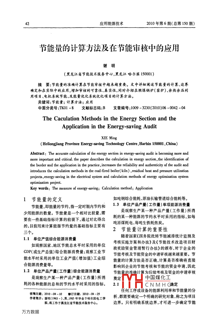 應(yīng)用能源技術(shù)2010年第6期(總第150期)節(jié)能量的計(jì)算方法及在節(jié)能審核中的應(yīng)用謝明(黑龍江省節(jié)能技術(shù)服務(wù)中心,黑龍江哈爾濱150001)摘要:節(jié)能量的準(zhǔn)確計(jì)算在節(jié)能審核中越來(lái)越重要。文中詳細(xì)闡述節(jié)能量的計(jì)算、邊界確定和在實(shí)際中的應(yīng)用,增加審核的可靠性、真實(shí)性,同時(shí)介紹在燃煤鍋爐(窯爐)、余熱余壓利用項(xiàng)目、電機(jī)系統(tǒng)節(jié)能、及能量?jī)?yōu)化系統(tǒng)優(yōu)化項(xiàng)目的計(jì)算方法。關(guān)鍵詞:節(jié)能量;計(jì)算方法;應(yīng)用中圖分類號(hào):TK01-8文獻(xiàn)標(biāo)志碼:B文章編號(hào):009-3230(2010)06-0042-04The Caculation Methods in the Energy Section and theApplication in the Energy-saving AuditXIE MinHeilongjiang Province Energy-saving Technology Centre, Harbin 150001, China)Abstract: The accurate calculation of the energy section in energy-saving audit is becoming more andmore important and ctitical the paper describes the calculation in energy section, the identification ofthe border and the application in the practice, increases the reliability and authenticity of the audit andintroduces the calculation methods in the coal-fired boiler( kiln), residual heat and pressure utilizationprojects, energy-saving in the electrical system and calculation methods of energy optimization systemKey words: The measure of energy-saving; Calculation method; Application1節(jié)能量的定義如噸鋼綜合能耗,原油長(zhǎng)輸管道綜合能耗等。節(jié)能量即能量的節(jié)約指一定時(shí)期內(nèi)節(jié)約和1.3單位產(chǎn)品產(chǎn)量(工作量)單項(xiàng)能源消費(fèi)量少用能源的數(shù)量。節(jié)能量是一個(gè)相對(duì)比較量需是觀察生產(chǎn)某一種產(chǎn)品產(chǎn)量(工作量)所消要在一些基礎(chǔ)指標(biāo)計(jì)算的前提下通過(guò)對(duì)比得出耗的某一種能源的節(jié)約水平時(shí)采用的指標(biāo)如每的,目前用來(lái)計(jì)算能源節(jié)約量的基礎(chǔ)指標(biāo)主要有噸原煤耗電,每噸生鐵耗焦炭。個(gè)2節(jié)能量計(jì)算的重要性1.1單位產(chǎn)值綜合能源消費(fèi)量隨著國(guó)家《國(guó)務(wù)院批轉(zhuǎn)節(jié)能減排統(tǒng)計(jì)監(jiān)測(cè)及如觀察國(guó)家、地區(qū)節(jié)能總水平時(shí)采用的單位考核實(shí)施方案和辦法》及《節(jié)能技術(shù)改造項(xiàng)目財(cái)GDP(或生產(chǎn)總值)綜合能源消費(fèi)量;觀察工業(yè)節(jié)觀察工業(yè)芬政獎(jiǎng)勵(lì)資金管理暫行辦法》的頒布對(duì)于企業(yè)的節(jié)能考核及節(jié)能資金的申請(qǐng)審核越來(lái)越重要。節(jié)能水平時(shí)采用的單位工業(yè)產(chǎn)值(增加值)工業(yè)綜能量的計(jì)算方法是否正確,計(jì)算是否準(zhǔn)確將直接合能源消費(fèi)量等影響到企業(yè)的節(jié)能考核和節(jié)能的資金申請(qǐng),因此12單位產(chǎn)品產(chǎn)量(工作量綜合能源消費(fèi)量節(jié)能量的準(zhǔn)確計(jì)算為后續(xù)考核及資金的申請(qǐng)審核是觀察生產(chǎn)某一種產(chǎn)品產(chǎn)量(工作量)所消奠定中國(guó)煤化工耗的各種能源的總和的節(jié)約水平時(shí)采用的指標(biāo),2.1CNMHG確定任何工序或設(shè)備的能源利用率和節(jié)能量的分作者簡(jiǎn)介:謝明(%3-),男,185年畢業(yè)于哈爾濱電工學(xué)析都需要確定一個(gè)明確的研究對(duì)象稱之為項(xiàng)目院現(xiàn)工作于黑龍江省節(jié)能技術(shù)服務(wù)中心。邊界。只有明確系統(tǒng)邊界,才可進(jìn)一步確定節(jié)能2010年第6期(總第150期)應(yīng)用能源技術(shù)量監(jiān)測(cè)所需要的計(jì)量?jī)x表,才有可能最終對(duì)節(jié)能6422-86)規(guī)定了如下邊界確定方法。量進(jìn)行計(jì)算和分析。若選擇的系統(tǒng)范圍過(guò)大,則產(chǎn)用煤分析監(jiān)測(cè)成本過(guò)大,且抓不住主要矛盾;若選擇的購(gòu)入幾儲(chǔ)存工轉(zhuǎn)換系統(tǒng)范圍過(guò)小,則有可能造成分析監(jiān)測(cè)漏項(xiàng),節(jié)能活用煤量計(jì)算不準(zhǔn)確。從的L企業(yè)2.2項(xiàng)目邊界確定和舉例2.2.2實(shí)際舉例22.1國(guó)家在《企業(yè)能耗計(jì)量與測(cè)試導(dǎo)則》(GB邊界磨煤機(jī)所有鍋爐本體蒸汽其他輔機(jī)設(shè)備3節(jié)能量計(jì)算步驟(3)計(jì)算公式準(zhǔn)確完成節(jié)能量計(jì)算步驟有助于提高節(jié)能量△E。=計(jì)算結(jié)果的準(zhǔn)確性事實(shí)驗(yàn)證,在項(xiàng)目改造前的邊界描述、節(jié)能量的統(tǒng)計(jì)的準(zhǔn)確性是十分必要的。其中:△E——單臺(tái)改造鍋爐節(jié)能量,單位為噸標(biāo)(1)項(xiàng)目邊界描述。準(zhǔn)煤;用文字和框圖描述且標(biāo)注所有計(jì)量表安裝位置。改造前單臺(tái)鍋爐效率,單位為%(2)項(xiàng)目改造前基準(zhǔn)能耗指標(biāo)的核實(shí)情況。改造后單臺(tái)鍋爐效率,單位為%;E(3)上年度項(xiàng)目邊界內(nèi)能耗或?qū)徍四壳?2改造前單臺(tái)鍋爐年耗能量,單位為個(gè)月項(xiàng)目邊界內(nèi)能耗(如上一年未能正常生產(chǎn)查噸標(biāo)準(zhǔn)煤。前三年的能耗情況,取平均值)。將所有改造鍋爐的節(jié)能量相加,得到項(xiàng)目節(jié)(4)所有不同能源的能耗應(yīng)折算成標(biāo)煤。能總量。此公式區(qū)別于以往的節(jié)能量計(jì)算,在于(5)項(xiàng