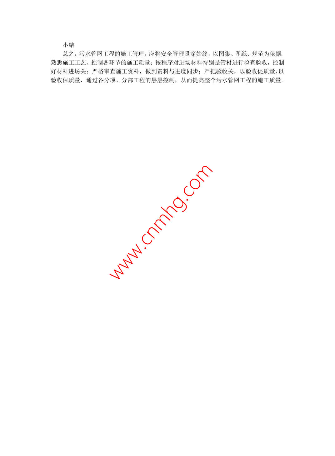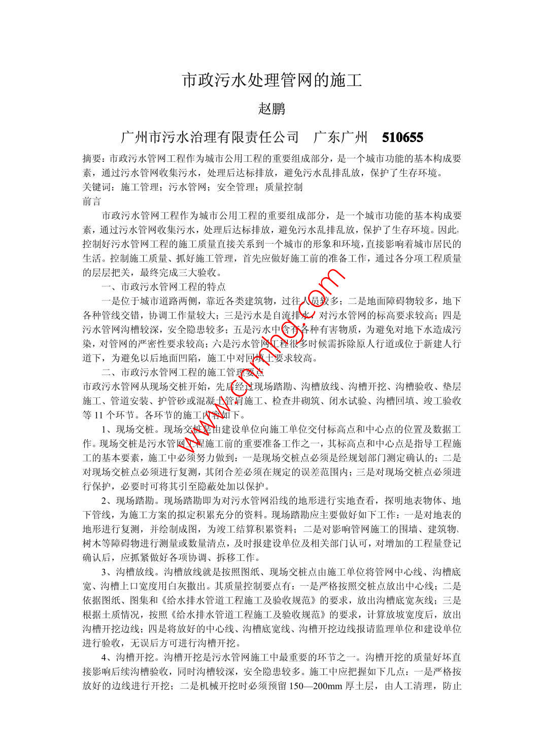市政污水處理管網(wǎng)的施工趙鵬廣州市污水治理有限責(zé)任公司廣 東廣州510655摘要:市政污水管網(wǎng)工程作為城市公用工程的重要組成部分,是一個(gè)城市功能的基本構(gòu)成要素,通過污水管網(wǎng)收集污水,處理后達(dá)標(biāo)排放,避免污水亂排亂放,保護(hù)了生存環(huán)境。關(guān)鍵詞:施工管理;污水管網(wǎng);安全管理;質(zhì)量控制前言市政污水管網(wǎng)工程作為城市公用工程的重要組成部分,是一個(gè)城市功能的基本構(gòu)成要素,通過污水管網(wǎng)收集污水,處理后達(dá)標(biāo)排放,避免污水亂排亂放,保護(hù)了生存環(huán)境。因此,.控制好污水管網(wǎng)工程的施工質(zhì)量直接關(guān)系到一一個(gè)城市的形象和環(huán)境,直接影響著城市居民的生活??刂剖┕べ|(zhì)量、抓好施工管理,首先應(yīng)做好施工前的準(zhǔn)備工作,通過各分項(xiàng)工程質(zhì)量的層層把關(guān),最終完成三大驗(yàn)收。一、市政污水管網(wǎng)工程的特點(diǎn)一是位于城市道路兩側(cè),靠近各類建筑物,過往人員較多;二是地面障礙物較多,地下各種管線交錯(cuò),協(xié)調(diào)工作量較大;三是污水是自流排水,對(duì)污水管網(wǎng)的標(biāo)高要求較高;四是污水管網(wǎng)溝槽較深,安全隱患較多;五是污水中含有各種有害物質(zhì),為避免對(duì)地下水造成污染,對(duì)管網(wǎng)的嚴(yán)密性要求較高;六是污水管網(wǎng)工程很多時(shí)候需拆除原人行道或位于新建人行道下,為避免以后地面凹陷,施工中對(duì)回填土要求較高。二、市政污水管網(wǎng)工程的施工管理要點(diǎn)市政污水管網(wǎng)從現(xiàn)場(chǎng)交樁開始,先后經(jīng)過現(xiàn)場(chǎng)踏勘、溝槽放線、溝槽開挖、溝槽驗(yàn)收、墊層施工、管道安裝、護(hù)管砂或混凝土管肩施工、檢查井砌筑、閉水試驗(yàn)、溝槽回填、竣工驗(yàn)收等11個(gè)環(huán)節(jié)。各環(huán)節(jié)的施工內(nèi)容如下。1、現(xiàn)場(chǎng)交樁?,F(xiàn)場(chǎng)交樁是由建設(shè)單位向施工單位交付標(biāo)高點(diǎn)和中心點(diǎn)的位置及數(shù)據(jù)工作?,F(xiàn)場(chǎng)交樁是污水管網(wǎng)工程施工前的重要準(zhǔn)備工作之-一, 其標(biāo)高點(diǎn)和中心點(diǎn)是指導(dǎo)工程施工的基本要素,施工中必須努力做到:一是現(xiàn)場(chǎng)交 樁點(diǎn)必須是經(jīng)規(guī)劃部門測(cè)定確認(rèn)的:二是對(duì)現(xiàn)場(chǎng)交樁點(diǎn)必須進(jìn)行復(fù)測(cè),其閉合差必須在規(guī)定的誤差范圍內(nèi);三是對(duì)現(xiàn)場(chǎng)交樁點(diǎn)必須進(jìn)行保護(hù),必要時(shí)可將其引至隱蔽處加以保護(hù)。2、現(xiàn)場(chǎng)踏勘?,F(xiàn)場(chǎng)踏勘即為對(duì)污水管網(wǎng)沿線的地形進(jìn)行實(shí)地查看,探明地表物體、地下管線,為施工方案的擬定積累充分的資料?,F(xiàn)場(chǎng)踏勘應(yīng)主要做好如下工作:一是對(duì)地表的地形進(jìn)行復(fù)測(cè),并繪制成圖,為竣工結(jié)算積累資料:二是對(duì)影響管網(wǎng)施工的圍墻、建筑物、樹木等障礙物進(jìn)行測(cè)量或數(shù)量清點(diǎn),及時(shí)報(bào)建設(shè)單位及相關(guān)部門認(rèn)可,對(duì)增加的工程量登記確認(rèn)后,應(yīng)抓緊做好各項(xiàng)協(xié)調(diào)、拆移工作。3、溝槽放線。溝槽放線就是按照?qǐng)D紙、現(xiàn)場(chǎng)交樁點(diǎn)由施工單位將管網(wǎng)中心線、溝槽底寬、溝槽上口寬度用白灰撒出。其質(zhì)量控制要點(diǎn)有:一是嚴(yán)格按照交樁點(diǎn)放出中心線;二是依據(jù)圖紙、圖集和《給水排水管道工程施工及驗(yàn)收規(guī)范》的要求,放出溝槽底寬灰線:三是根據(jù)土質(zhì)情況,按照《給水排水管道工程施工及驗(yàn)收規(guī)范》的要求,計(jì)算放坡寬度后,放出溝槽開挖邊線;四是將放好的中心線、溝槽底寬線、溝槽開挖邊線報(bào)請(qǐng)監(jiān)理單位和建設(shè)單位進(jìn)行驗(yàn)收,無誤后方可進(jìn)行溝槽開挖。4、溝槽開挖。溝槽開挖是污水管網(wǎng)施工中最重要的環(huán)節(jié)之一。溝槽開挖的質(zhì)量好壞直接影響后續(xù)溝槽驗(yàn)收,同時(shí)溝槽較深,安全隱患較多。施工中應(yīng)把握如下幾點(diǎn):一是嚴(yán)格按放好的邊線進(jìn)行開挖;二是機(jī)械開挖時(shí)必須預(yù)留150- 200mm 厚土層,由人工清理,防止對(duì)原狀士產(chǎn)生擾動(dòng);三是用水準(zhǔn)儀、經(jīng)緯儀對(duì)標(biāo)高和中心線進(jìn)行測(cè)量,確保標(biāo)高和中心線位置準(zhǔn)確無誤;四是按規(guī)范要求放坡,確定因地形受限不能放坡或放坡不到位的,必須按批準(zhǔn)的支護(hù)方案對(duì)槽壁進(jìn)行支撐;五是槽邊堆土不能過高,堆土邊緣距槽壁最小距離不應(yīng)小于0.8m,多余的土必須先行運(yùn)走;六是開挖溝槽及溝槽開挖后必須對(duì)施工沿線進(jìn)行安全圍護(hù),防止鄰近人員誤入,造成安全事故。5、溝槽驗(yàn)收。溝槽驗(yàn)收是在溝槽清理到位、標(biāo)高和中心線復(fù)測(cè)無誤后,由監(jiān)理單位、建設(shè)單位、設(shè)計(jì)單位、施工單位、地質(zhì)勘探單位共同參加、監(jiān)督人員到場(chǎng)的情況下進(jìn)行的,是污水管網(wǎng)工程三大驗(yàn)收之一。溝槽驗(yàn)收的基本條件有:施工資料齊全;安全防護(hù)措施