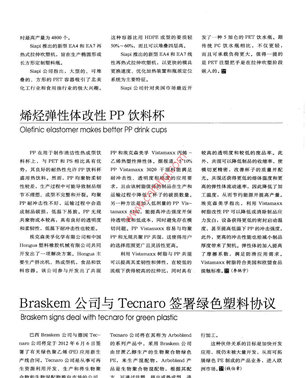 時(shí)最高產(chǎn)量為4800個(gè)。這種容器比用HDPE成型的要質(zhì)輕發(fā)了一種5加侖的PET飲水瓶。跟Siapi推出的新型EA4和EA7再50%~ 60%,而且可以堆疊四層高。傳統(tǒng)PC飲水瓶相比,不僅更輕,熱式拉伸吹塑機(jī),旨在生產(chǎn)橢圓形或Siapi推出的新型EA4和EA7線而且可承載負(fù)荷更大。值得一-提的長(zhǎng)方形定制塑料瓶。性再熱式拉伸吹塑機(jī),以更快的模具是PET注塑把手是在拉伸吹塑階段Siapi公司指出,大型的、可堆更換速度、優(yōu)化加熱裝置和瓶頸定位嵌人的。 圖疊的、方形的PET容器吸引了北美系統(tǒng)為主要特征。化工行業(yè)和食用油行業(yè)的極大興趣。Siapi公司針對(duì)美國(guó)市場(chǎng)最近開(kāi)烯烴彈性體改性PP飲料杯.Olefinic elastomer makes better PP drink cupsPP在用于制作清潔性熱成型飲PP和??松梨赩istamaxx 丙烯-較高的透明度和較低的廢品率。此料杯上,與PET和PS相比具有優(yōu)乙烯熱塑性彈性體。據(jù)報(bào)道,5~ 10%外,共混可以降低制品的收縮率,使勢(shì),其良好的耐熱性允許PP飲料杯PP Vistamaxx 3020 干混料能滿足模切更精密,改善杯子的質(zhì)量并配盛用熱飲料。然而,PP均聚物柔韌耐沖擊性、透明度和剛度的應(yīng)用要光。共混還獲得更低的熔體溫度和更性較差,生產(chǎn)過(guò)程中可能導(dǎo)致制品細(xì)求,且由該樹(shù)脂值得的制品在生產(chǎn)和高的彈性體流動(dòng)速率,因此降低了加節(jié)不理想、成型不完整和開(kāi)裂。均聚運(yùn)輸過(guò)程中降低了杯子的破損數(shù)量。工溫度,從而節(jié)約能源并提高產(chǎn)量。PP耐沖擊性不好,運(yùn)輸過(guò)程中會(huì)造另一種方法是加入低劑量的PP Vis-??松梨?指出,利用Vistamaxx成制品破損,低溫下易脆。PP無(wú)規(guī)tamaxx6102,能提高沖擊強(qiáng)度并保樹(shù)脂改性PP可以降低或消除制品應(yīng)共聚物成本較高,具有良好的透明度持透明度和低成本,同時(shí)避免存在模力發(fā)白,設(shè)備獲得更低的密封啟動(dòng)溫和柔韌性,低溫下耐沖擊性也較差。切問(wèn)題。PP Vistamaxx 容易與均聚度,甚至提高低溫下PP的沖擊強(qiáng)度。??松梨诨瘜W(xué)有限公司和中國(guó)PP和無(wú)規(guī)共聚PP共混,這使得用戶此外,更高的沖擊性能也給減小制品Hongua塑料橡膠機(jī)械有限公司共同的選擇范圍更廣且靈活性更高。厚度帶來(lái)了契機(jī)。彈性體的加入提高開(kāi)發(fā)出了一項(xiàng)解決方案。Hongua 主利用Vistamaxx樹(shù)脂與PP共混了摩擦系數(shù),滿足防滑應(yīng)用需求。要生產(chǎn)擠出機(jī)、熱成型機(jī),食品和飲可以提高其柔韌性和彈性,在較低的Vistamaxx樹(shù)脂符合美國(guó)和歐盟食品料容器。該公司參與開(kāi)發(fā)出了共混流痕下獲得較高的拉伸比,同時(shí)具有接觸標(biāo)準(zhǔn)。麗(李馳宇)Braskem公司與Tecnaro簽署綠色塑料協(xié)議Braskem signs deal with tecnaro for green plastic巴西Braskem公司與德國(guó)Tec-Tecnaro公司將在其稱為Arboblend行加工。naro公司將定于2012年6月6日簽的系列產(chǎn)品中,采用Braskem公司這種伙伴關(guān)系的目標(biāo)是加快開(kāi)發(fā)署了有關(guān)綠色聚乙烯(PE)應(yīng)用新生由甘蔗乙醇生產(chǎn)的生物聚合物綠色應(yīng)用,現(xiàn)仍未被大量開(kāi)發(fā),從而可拓產(chǎn)線合同。Tecnaro 公司是從事可再PE,來(lái)生產(chǎn)混配物,Arboblend 產(chǎn)展綠色PE制成的產(chǎn)品業(yè)務(wù),進(jìn)入歐生資源利用開(kāi)發(fā)、生產(chǎn)和將生物聚品是生物聚合物混配物,根據(jù)其配洲市場(chǎng)。圍(錢(qián)伯章)合物和1生物混西2物推向市場(chǎng)的公司1可通計(jì)汁朝墳中武執(zhí)卡刑