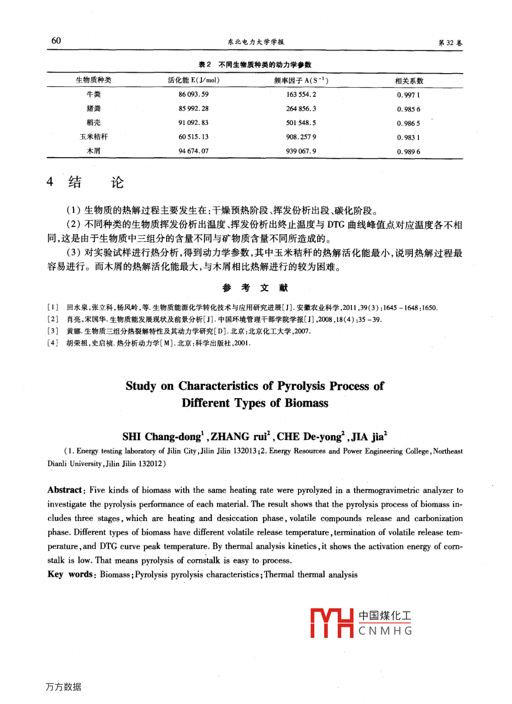 第32卷第1期東北電力大學(xué)學(xué)報Vol 32, No. 12012年2月Journal Of Northeast Dianli UniversityFeb.,2012文章編號:1005-2992(2012)01-0057-04不同種類生物質(zhì)熱解特性研究史長東1,張銳2,車德勇2,賈嘉2(1.吉林市能源測試檢驗所,吉林吉林132013;2東北電力大學(xué)能源與動力工程學(xué)院,吉林吉林132012)摘要:在熱重分析儀上,豬糞、稻殼、玉米秸稈、木屑等五種生物質(zhì)進(jìn)行熱解實驗研究。研究發(fā)現(xiàn),生物質(zhì)的熱解過程可分為干燥預(yù)熱階段、揮發(fā)份析出段、碳化階段。不同種類的生物質(zhì)揮發(fā)份析出溫度、揮發(fā)份析出終止溫度、最大失重速率對應(yīng)溫度均不相同。通過動力學(xué)計算可知玉米秸稈的熱解活化能較小,說明它的熱解過程最容易進(jìn)行。關(guān)鍵詞:生物質(zhì);熱解;熱分析中圖分類號:TK6文獻(xiàn)標(biāo)識碼:A生物質(zhì)能是一種豐富的可再生能源。利用生物質(zhì)能在對于調(diào)整能源結(jié)構(gòu)、緩解能源危機(jī)和控制溫室氣體排放等方面意義重大。生物質(zhì)的熱化學(xué)轉(zhuǎn)換應(yīng)用一直倍受關(guān)注。熱化學(xué)轉(zhuǎn)換可快速將低品質(zhì)的生物質(zhì)能轉(zhuǎn)化成高品位的合成氣、生物油及焦炭。而熱解技術(shù)是生物質(zhì)熱化學(xué)反應(yīng)應(yīng)用的基礎(chǔ),對進(jìn)一步進(jìn)行生物質(zhì)的液化、氣化等研究有著重要的指導(dǎo)意義。依據(jù)來源的不同,將生物質(zhì)分為林業(yè)資源農(nóng)業(yè)資源、生活污水和工業(yè)有機(jī)廢水、城市固體廢物和畜禽糞便等五大類。本文在熱重分析儀上研究了木屑,秸稈、稻殼和牛糞、豬糞的熱解特性,并進(jìn)行了熱動力學(xué)分析,比較其活化能大小關(guān)系,為進(jìn)一步研究生物質(zhì)的熱化學(xué)轉(zhuǎn)化提供基礎(chǔ)數(shù)據(jù)。1實驗材料與物性分析本實驗選用的實驗樣品分別為吉林市養(yǎng)殖場的牛糞與豬糞,吉林市木材加工廠的廢棄物木屑,稻米加工廠的稻殼以及農(nóng)田里的廢棄玉米秸稈。實驗前將樣品充分干燥后研磨至0.2mm以下密封保存。實驗儀器采用TA公司的 SDTQ600型熱重分析儀。試驗采用非等溫法,升溫速率為10℃/min,溫度范圍為室溫到800℃,通入高純氮?dú)庾鳛檩d氣。2實驗結(jié)果及分析圖1-5分別為升溫速率10℃/min下牛糞豬糞、稻殼、玉米秸稈、木屑的TG及DTG曲線。圖6為五種生物質(zhì)的熱解失重曲線比較。中國煤化工收稿日期:2011-11-20CNMHG作者簡介:史長東(1967-),男,吉林省吉林市人,吉林市能源測試檢驗所高級工程師,主要研究方向:能量平衡測試、石油化工分析等東北電力大學(xué)學(xué)報第32驀100.001s800.300005300100200300400500600700800900400500600700800900圖1牛糞在升溫速率10℃/min的熱解曲線圖2豬糞在升溫速率10℃/min的熱解曲線0.11-00.40,100200300400500600700800900圖3稻殼在升溫速率10℃/min的熱解曲線圖4玉米秸稈在升溫速率10℃/min的熱解曲線00一牛糞b-豬糞▲-稻殼V玉米秸稈一木屑60040.8圖5木屑在升溫速率10℃/min的熱解曲線圖6五種生物質(zhì)在升溫速率10℃/min下熱解曲線比較由生物質(zhì)熱解曲線可知,熱解主要分為三個階段:干燥預(yù)熱階段、揮發(fā)份析出段碳化階段。隨著加熱的進(jìn)行,生物質(zhì)中的水分析出,在100℃-120℃左右,干燥基V凵中國煤化工出溫度時,試樣質(zhì)量再次出現(xiàn)下降,DTG曲線開始快速下降,并出現(xiàn)峰值。這CNMHG維素、木質(zhì)素吸收了大量的熱量發(fā)生化學(xué)反應(yīng)并析出揮發(fā)份。當(dāng)揮發(fā)份析出段結(jié)束,DTG曲線恢復(fù)平穩(wěn),物料緩慢第1史長東等:不同種類生物質(zhì)熱解特性研究失重,此階段為生物質(zhì)碳化階段。圖6中可以看出,不同種類生物質(zhì)失重各不相同,木屑的在揮發(fā)份析出段的失重量最大。表1為不同生物質(zhì)的揮發(fā)份析出溫度t1揮發(fā)份析出終止溫度2與DTG曲線峰值點(diǎn)對應(yīng)溫度l3。表1不同生物質(zhì)種類揮發(fā)份析出溫度與、揮發(fā)份析出終止溫度與與DTG曲線峰值點(diǎn)對應(yīng)溫度與樣品℃牛糞192.88343.42378.31豬糞稻殼00.26335.77371.21玉米秸稈65.17木屑05.15358.77由表1可知,不同的生物質(zhì)種類熱解的溫度區(qū)間不同,DTG的峰值點(diǎn)溫度不同。這是由于生物質(zhì)三組分含量不同以及礦物質(zhì)含量與種類不同導(dǎo)致的。木質(zhì)素,纖維素,半纖維素的揮發(fā)份析出溫度段各不相同,所以不同種類的生物質(zhì)的主要熱解段的溫度范圍也不相同。而生物質(zhì)內(nèi)所含礦物質(zhì)可對生物質(zhì)熱解過程產(chǎn)生催化作用。3熱解動力學(xué)參數(shù)根據(jù)試樣的TC曲線我們可以得到試樣的質(zhì)量隨溫度的變化。試樣在實驗中的質(zhì)量變化比用轉(zhuǎn)化率來表示,寫作其中:mo為試樣初始質(zhì)量,mg;m,為試樣任意時刻質(zhì)量,mg;m為試樣終止質(zhì)量,mg生物質(zhì)熱解動力學(xué)方程式可表示為da=k·f(a),dt(2)f(a)為熱解機(jī)理函數(shù)的微分形式,根據(jù)以往經(jīng)驗選用一級反應(yīng)動力學(xué)機(jī)理f(a)=(1-a)k為反應(yīng)速率常數(shù),根據(jù) Arrhenius定律Ek Aexp(-pm)4R將公式(3)和公式(4)帶人公式(2),積分后得到InAR2RTEDE(1E(5)其中φ為升溫速率,A為頻率因子,E為活化能對不同時間段的lnIn(1-a)T進(jìn)行直線擬合得到的直線斜率為,節(jié)距為ln5(12g