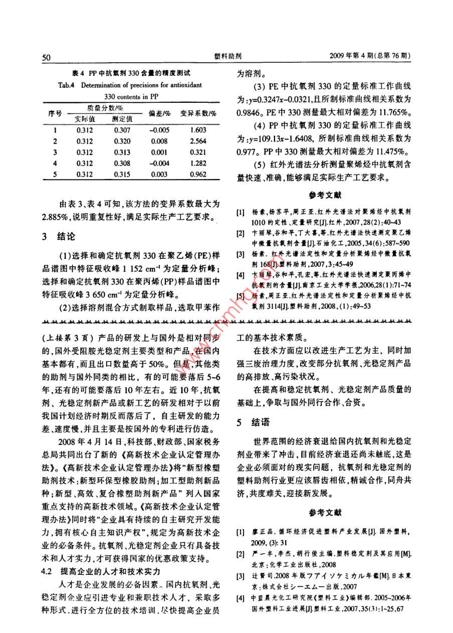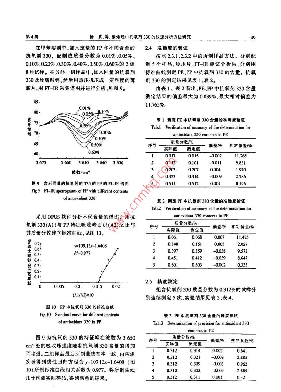 46塑料助削:2009年第4期(總第76期)性能與測(cè)試聚烯烴中抗氧劑330的快速分析方法研究楊素周正亞(中國(guó)石化揚(yáng)子石油化工股份有限公司,南京, 210048)摘要研究了紅外光譜法定性定量分析聚乙烯、聚丙烯中的抗氧劑330。分析了抗氧劑330和PE、PP粉料的FT-IR圖,確定了抗氧劑330在聚乙烯、聚丙烯中的特征吸收峰分別為1152 cm' .3 650 cm",詳細(xì)分析了抗氧劑330分別與定量的PE、PP及硬脂酸鈣所制樣品對(duì)所測(cè)譜圍和所制曲線的影響。抗氧劑330的標(biāo)準(zhǔn)曲線表明,抗氧劑330的含量與其特征峰的吸收強(qiáng)度呈良好的線性關(guān)系,相關(guān)系數(shù)達(dá)0.97以上,相對(duì)百分偏差最大為11.765%。關(guān)鍵詞紅外光譜法 聚烯烴抗氧劑定性分析定量分析Determination of Antioxidants 330 in Polyethylene by Infrared SpectrometryYang Su Zhou Zheng- ya(Yangzi Petrochemical Stock Limited Company, Nanjing, 210048)Abstract: The nature and contents of antioxidant 330 in PE and PP were measured by means of Fouriertransform infrared spectromelry (FT-IR), Suitable solvent commixing method was selecled to mix antioxidantswith PE and PP powders. By comparing FT-IR spectrograms of antioxidant 330, PE and PP, the characteristicpeaks of antioxidant 330 in PE and PP were confirmed at 1 152 cm~' and 3 650 cm", the effect of antioxidant330 with specifically composed PE, PP and calcium stearate respectively on spectrometries test and curvemade by it were analysed in detail respectively. According to standard curves of antioxidant 330,peak areas ofwhich increases linearly and perfectly along with their contents. The correlation cefficient for the test is morethan 0.97. The maximal relatively error is 11.765%.Keywords: infrared spectromelry; antioxidant; polyolefin; qualitative analysis; quantative analysis抗氧劑330屬于多功能抗氧劑類。開(kāi)發(fā)和應(yīng)用效果尤為突出。 抗氧劑的成本高,為了提高聚烯用此類抗氧劑是近期抗氧劑發(fā)展的新動(dòng)向,它集烴的產(chǎn)品質(zhì)量,降低成本,提高經(jīng)濟(jì)效益,有必要多種防老化功能于一身,故其具有一劑多功效的對(duì)聚烯烴中微量抗氧劑進(jìn)行定量研究,而紅外光特性,且常出現(xiàn)自協(xié)同作用,效率高,可從多方面譜法是一種簡(jiǎn)便、快速、準(zhǔn)確的分析方法I-。改善高分子有機(jī)物的抗氧化性能??寡鮿?30適本文研究了用紅外光譜法定性、定量分析聚用于聚烯烴、聚酯、聚苯乙烯、ABS樹(shù)脂和聚氯乙烯烴中微量抗氧劑330,解決了快速測(cè)定聚烯烴中烯等。它是橡膠、聚烯烴、塑料等制品的高效主抗微量抗氧劑330的問(wèn)題,對(duì)分析抗氧劑330在聚氧劑,特別是作為聚乙烯電線電纜料的抗氧劑作烯烴 中的影響和改性有實(shí)際意義。1實(shí)驗(yàn)部分收稿日期:2008-12-19第4期楊素,等. 聚烯烴中抗氨削330的快速分析方法研究471.1 主要儀器與試劑.含量的不同,1152 cm-'特征吸收峰發(fā)生有規(guī)率的德國(guó)BLUCK公司66S型付里葉變換紅外光譜強(qiáng)弱變化,周圍也無(wú)其他強(qiáng)峰覆蓋,PE在該波數(shù)(FI-IR)儀,分束器KBr,檢測(cè)器DTGS,譜圖的波數(shù)處基本無(wú)吸收,故選擇1 152 cm-!處的吸收峰為抗范圍(4 000~400) cm',光源能量>22 000 lm,分辨氧劑330在PE中的定量分析峰。率4.0 cm-,掃描32次,采用OPUS 5.0軟件包采集和處理數(shù)據(jù);SPECAC壓模機(jī)壓力0~15t,溫度0~30060-~C10/聚乙烯(PE)粉料、聚丙烯(PP)粉料,揚(yáng)子石油化工股份有限公司;抗氧劑330,Ciba上海公司;乙發(fā) 20↑醇、丙醇、乙酸乙脂、苯、甲苯,均為分析純;KBr,光3654000300020001000譜純。1.2 試樣的制備波數(shù)/em+用精度為0.000 1 g的電子天平秤取不同量圖2抗氧劑330 的FT-IR譜圖的抗氧劑330,將其充分溶解在溶劑中,然后分別Fig.2 FT-IR spectrogram of antioxidant與PE、PP粉料混合均勻。在通風(fēng)櫥中自然干燥36 h,紅外干燥箱中干燥6 h,直至溶劑完全揮發(fā)。100.00I 抗氧劑330用熱壓機(jī)將此試樣壓成-定厚度的薄膜片,待測(cè)。80.002結(jié)果與討論:盛60.00{PE+抗氧劑3302.1 抗氧劑330特征峰的分析與確定40.002017.392510、152.343967抗氧劑330,化學(xué)名為1,3,5-三甲基-2,4,6-20.002017392510三(3,5-二叔丁基- 4- 羥基苯甲基)苯,含有多種官能團(tuán),分子式CsuH2O3,相對(duì)分子質(zhì)量775,結(jié)構(gòu)式2200 2000 1800 1600 1400 1200 1000 800如圖1,熔點(diǎn)范圍240~260 C,適用于較高溫度加波數(shù)/m"1工的工程塑料和耐候性制品。圖3抗氧劑330.加抗氧劑330的PE及PE的FT-R譜園C(CH)Fig.3 FT-IR spectrograms of antioxidant 330, PE withOHantioxdant 330 and PECH(CH)CCH2100H2C30F(CH)oCC(CH) .i 40圖1抗氧劑330的分子結(jié)構(gòu)式Fig.1 The molecular structrue of antioxidant 3302200180014001000 800紅外光譜譜圖(如圖2)中,較強(qiáng)的特征吸收在波數(shù)/em'1152 cm-及3 650 cm*,分析認(rèn)為1152 cm~|峰是C-C伸縮振動(dòng)的特征吸收峰,3650 cm"|峰是C-0H圖4不同抗氧劑330含量的PE的伸縮振動(dòng)的特征吸收峰。1152em-t特征吸收峰的強(qiáng)弱變化抗氧劑330在PE樣品譜圖1152 cm-'處有較Fig.4 The intersity changes of characteristic peaks in強(qiáng)的吸收(如圖3、圖4),且隨著PE中抗氧劑3301 152 cm-' of PE with diferent contents of antioxidant 33048塑料助刑2009年第4期(總第76期)抗氧劑330在PP樣品譜圖3 650 cm~'處有的抗氧劑330,配制成質(zhì)量分?jǐn)?shù)為0.01%.0.05%、較強(qiáng)的吸收(如圖5,圖6),月隨著PP中抗氧劑0.10% .0.20%、0.30%、0.40%、0.50%、0.60%的2組330含量的變化,3650 cm-'特征吸收峰發(fā