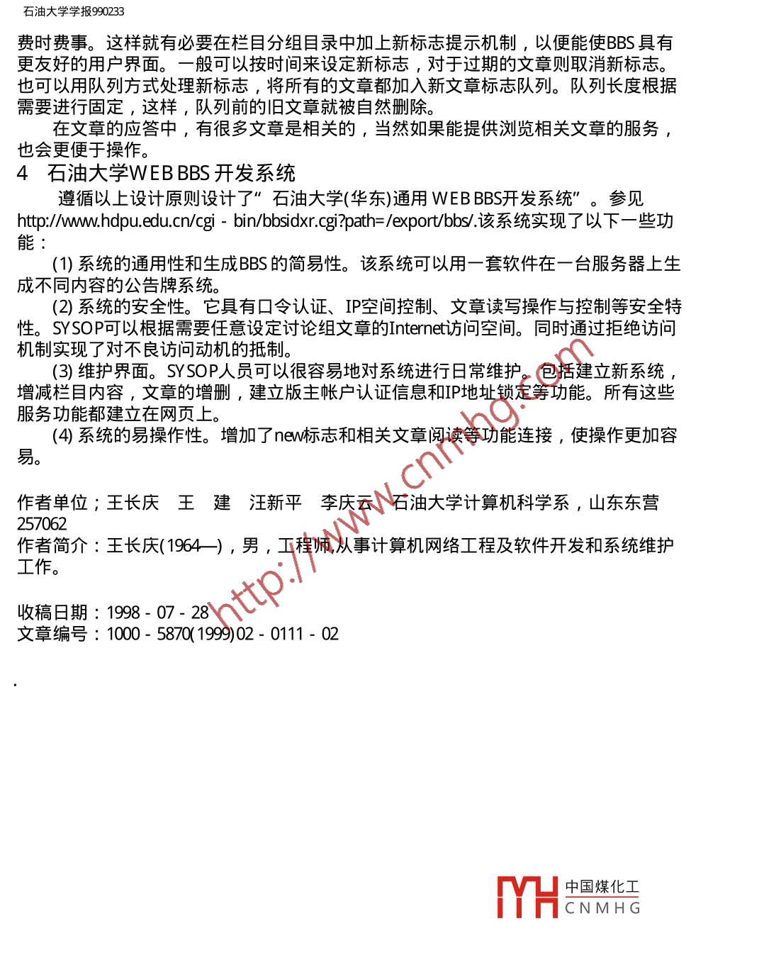 石油大學(xué)學(xué)報990233五油大學(xué)學(xué)報JOURNAL OFUNIVERSITY OF科技期刊。田Chinalnfo'PETROLEUM,WANFANG DATACHINA1999年第2期No.2,1999WEB BBS的設(shè)計及分析王長慶王建汪新平李慶云摘要:隨著萬維網(wǎng)WWW的發(fā)展, BBSTELNET版正逐步滲透到WEB頁面上來,研究高效、通用、安全的BBS軟件系統(tǒng)是非常必要的。通過分析現(xiàn)有的WEBBBS ,提出了通用WEB BBS的實現(xiàn)技術(shù)和方案,分析了WEB BBS的結(jié)構(gòu)層次、存儲方式以及系統(tǒng)安全,在校園網(wǎng)絡(luò)的建設(shè)中取得了較好的效果。關(guān)鍵詞:電子公告牌;萬維網(wǎng);設(shè)計;計算機應(yīng)用中圖法分類號: TP4文獻標(biāo)識碼: AWEB BBS作為電子公告牌必須具備以下一些功能: (1)提供文章發(fā)表及回復(fù)功能。(2)系統(tǒng)的維護功能。比如:系統(tǒng)的建立,欄目及文章的增刪,版主的設(shè)定等維護功能。(3) 系統(tǒng)的安全性能。安全性能包括禁止惡意人物的胡言亂語,禁止非授權(quán)人士對系統(tǒng)的刪改,比如提供版主特權(quán)的安全口令保護機制等。1 WEB BBS的基本結(jié)構(gòu)BBS設(shè)計人員一般將WEB BBS結(jié)構(gòu)按其功能分為三個層次。第一個層次是欄目分類目錄層,第二個層次是文章列表目錄層,第三個層次是文章發(fā)表及閱讀層。欄目分類目錄定義了在欄目級對文章的檢索或?qū)б?,即本BBS有那些文章討論組,并且生成進入某一文章討論組的超級鏈接。當(dāng)點擊某- -個欄目分類目錄的超級鏈接時就可以進入文章列表目錄層,該層對該欄目所有的文章進行列表及超級鏈接。點擊該層次的文章超級鏈接則進入文章的閱讀及發(fā)表層。三個層次的網(wǎng)站可用WEB主頁制作,也可用CGI(C ommon Gateway Interface)來做。后者功能十分靈活,但是需要編程人員對CGI所用的系統(tǒng)及其編程軟件和網(wǎng)絡(luò)環(huán)境有較高的理解。目前可以利用C和Per|等語言實現(xiàn)此類工作。石油大學(xué)(華東)BBS采用的是C編程語言, 因為這樣會充分利用C語言的靈活特性。2存儲方式及結(jié)構(gòu)中國煤化工-般將數(shù)據(jù)庫作為文章的存儲數(shù)據(jù)源。目前有很多的數(shù)振MHCNMH接口,所以,開發(fā)一個以數(shù)據(jù)庫為存儲底層的BBS并不困難。當(dāng)然,如果缺乏數(shù)據(jù)庫的知識,fle//E 0高數(shù)據(jù)syqkyx5sy*99syd992/990233.htm(第1/ 3頁) 2010-3-23 8:10:58石油大學(xué)學(xué)報990233直接用文件系統(tǒng)自己構(gòu)造-一個文章庫也并非難事。以數(shù)據(jù)庫做-個BBS,需要更復(fù)雜的數(shù)據(jù)庫的維護知識,并且數(shù)據(jù)庫與BBS的聯(lián)系并非十分緊密。即便是同樣的計算機系統(tǒng), BBS的推廣移植也可能會出現(xiàn)缺乏合法數(shù)據(jù)庫的問題。所以,如果希望制造- -個獨立完整的不依賴其他系統(tǒng)的BBS ,就只有利用文件系統(tǒng)去構(gòu)造了。目前,利用文件系統(tǒng)構(gòu)造文章庫有兩種方法。一種是將一篇文章以一個文件的方式存儲, 文件名以起始為000的數(shù)字增序序號來構(gòu)造,如清華大學(xué)和南京大學(xué)的BBS.另一種是將所有的文章都放進文章庫內(nèi)進行組織,當(dāng)然這種方式對編程人員的要求較高,因為圍繞該文件庫需要編寫-些維護過程,并且對于文章讀寫的并發(fā)操作需要加鎖控制等。對應(yīng)上述的BBS層次分析,需要以下一些存儲文件或數(shù)據(jù)庫表來存儲BBS信息。(1)討論組目錄層。需要數(shù)據(jù)文件或數(shù)據(jù)庫文件來存儲本BBS具有的討論組目錄的定義信息。該存儲文件或數(shù)據(jù)庫表以記錄方式記錄了所有討論組的信息。通常每一條記錄必須能給出以下屬性表達:某一討論組記錄的討論組標(biāo)題、該組存儲位置或超級鏈接、讀寫屬性、IP限定空間、版主和新文章標(biāo)志。這一層可以用文件或數(shù)據(jù)庫實現(xiàn)。在訪問網(wǎng)頁的制作上可以簡單地用一個循環(huán)CGI程序來構(gòu)造。每一層網(wǎng)頁的超級鏈接指向第二層CGI程序。(2)文章目錄層。定義某-討論組的所有文章的屬性表達:某一文章記錄的文章標(biāo)題,該文章存儲位置及超級鏈接,作者,發(fā)表日期。同樣,這一層也可以用文件與數(shù)據(jù)庫實現(xiàn)。該層的程序?qū)崿F(xiàn)類似于第一層的CGI實現(xiàn)。(3)文章發(fā)表和閱讀層。本層直接面對文章存儲類型。不同的文章存儲類型有不同的讀寫方式,最簡單的就是一篇文章一個文件。數(shù)據(jù)庫也很簡單,所有數(shù)據(jù)庫都提供長字符類型的字段用于存儲文章。所以,只要打開文件讀寫操作或數(shù)據(jù)庫讀寫操作就可以解決問題。如果希望開發(fā)一個完整的BBS ,就只能自己開發(fā)文件庫和訪問接口。3系統(tǒng)的安全措施首先要考慮的是用戶的安全口令認(rèn)證機制。由于系統(tǒng)維護管理人員和版主具有增刪等維護特權(quán),所以,在WEB頁進入維護頁面時需要口令認(rèn)證機制進行保護。還可以在IP地址空間.上進行鎖定,讓某些功能只允許某臺或某些機器進行訪問,這樣就在最大限度上保護了系統(tǒng)的安全。所以,建立WEB BBS用戶注冊與認(rèn)證機制十分必要。網(wǎng)絡(luò)_上的普通用戶不必建立口令帳戶。雖然WEBBBS作為公共的布告欄系統(tǒng),有時還希望對外來IP進行分類,比如內(nèi)部公告的信息就只能由內(nèi)部人