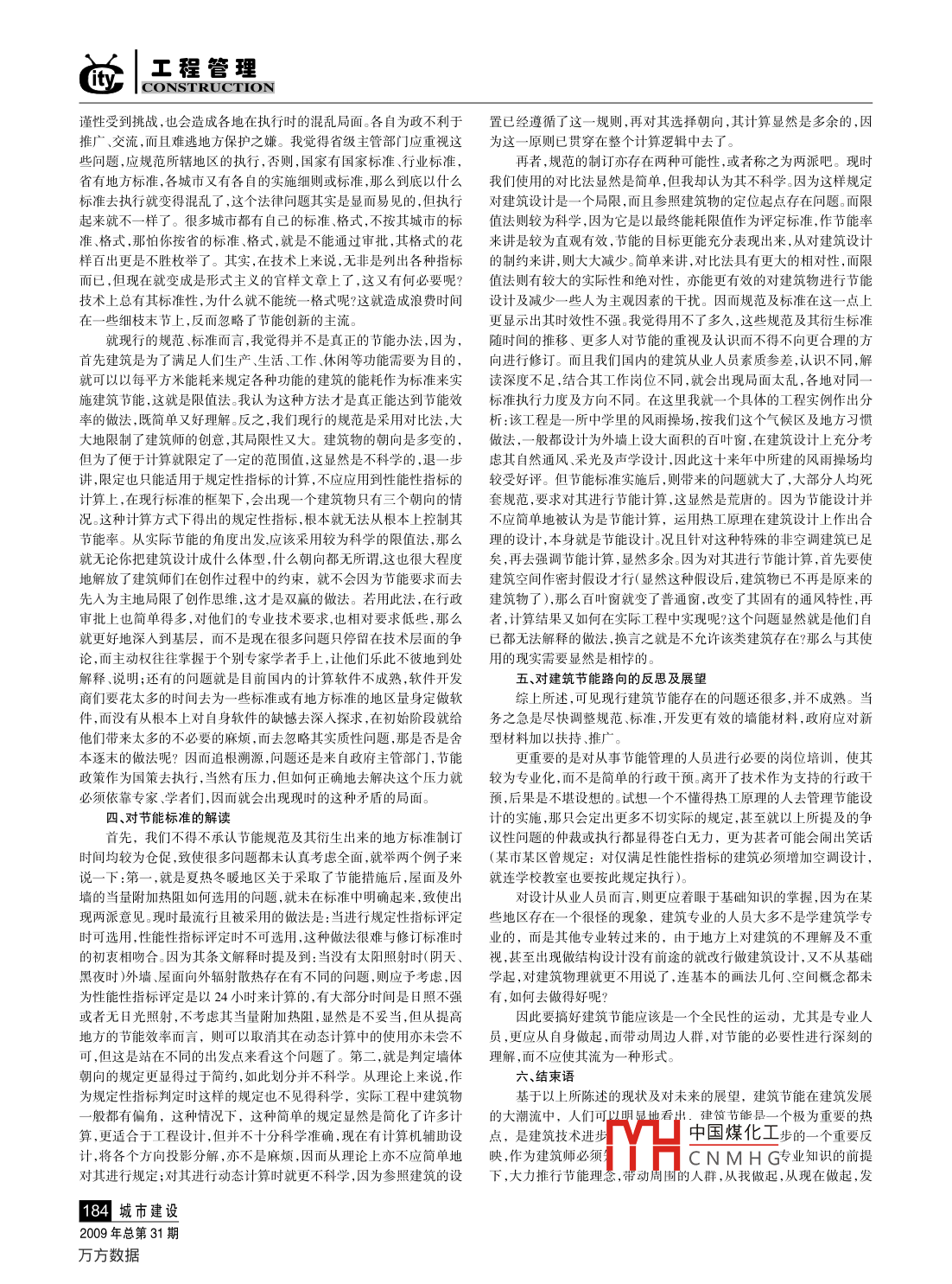 工程管理CONSTRUCTIONc空談建筑節(jié)能林楚燾佛山市順德建筑設(shè)計(jì)院有限公司廣東佛山528300摘要:能源匱乏是世界性的問(wèn)題,節(jié)能是世界的當(dāng)務(wù)之急,也是我國(guó)可持續(xù)發(fā)展的倸障。本文從迫切性、可行性、技術(shù)性及現(xiàn)實(shí)性等幾方面闡述我國(guó)的建筑節(jié)能路向關(guān)鍵詞:空談建筑節(jié)能關(guān)鍵行政技術(shù)前言工方向,當(dāng)年師從張家璋先生從事農(nóng)村被動(dòng)式太陽(yáng)房的設(shè)計(jì)與研究近幾十年來(lái),特別是1973年爆發(fā)石油危機(jī)以來(lái),建筑節(jié)能在其對(duì)建筑熱工的認(rèn)識(shí)較深刻。在當(dāng)時(shí)的課題里,采用大面積的玻璃令室風(fēng)靡世界的過(guò)程中,其內(nèi)容和含義不斷更新,在發(fā)達(dá)國(guó)家,已經(jīng)經(jīng)歷內(nèi)產(chǎn)生溫室效應(yīng),以求達(dá)到采暖的目的,可見(jiàn)日照對(duì)寒冷地區(qū)的重要了三個(gè)階段。開(kāi)始時(shí)一般說(shuō)成是 energy saving in buildings,就是我們性(當(dāng)時(shí)項(xiàng)目地點(diǎn)在河北石家莊市)。但畢業(yè)后回到廣東從事建筑設(shè)現(xiàn)在所說(shuō)的建筑節(jié)能;不久則改稱 energy conservation in buildings,即計(jì)就大感不一了。因?yàn)閺V東這個(gè)地區(qū)是亞熱帶氣候,日照充足,從傳在建筑中保持能源,意思是要減少能源的散失;近來(lái)則普遍稱作en-統(tǒng)的嶺南園林建筑到現(xiàn)在的新建筑都在很大程度上反映了嶺南人對(duì)ergy efficiency in buildings,其含義是要提高建筑中的能源利用效率,日照有著不同的解讀,總是千方百計(jì)地避免直射陽(yáng)光的照射,這就可不是消極意義上的節(jié)省,而是從積極意義上提高利用效率。在我國(guó),見(jiàn),不同的地區(qū)對(duì)日照有著不同的需求和喜惡現(xiàn)在仍然通稱為建筑節(jié)能,但含義應(yīng)該是第三層意思,要比字面上的然而除了對(duì)日照有不同的需求外,還有對(duì)地表熱源的不同看意義豐富、深刻得多。(引自楊善勤、郎四維、涂逄祥編著的《建筑節(jié)采暖地區(qū)到了采暖期,地面在未經(jīng)處理的情況下,會(huì)耗掉相當(dāng)大的熱能》一書(shū))能,因而需要做好地面保溫,使之與地表的低溫土壤隔開(kāi),避免熱量二、建筑節(jié)能實(shí)施的關(guān)鍵散失,因而它需要的地面熱阻就較大,反之,非采暖地區(qū)則以空調(diào)制根據(jù)我國(guó)的體制,建筑節(jié)能實(shí)施的關(guān)鍵所在可分為兩個(gè)方面去冷能耗為主,則室內(nèi)地面就有不同的處理方法了,因?yàn)榈厍蚴呛芎玫姆治?其一是的行政方面的政策、法律、規(guī)范;其二是建筑節(jié)能的技術(shù)調(diào)溫蓄熱體,在長(zhǎng)期沒(méi)有直射陽(yáng)光照射的地面,其地面溫度是較室溫支持低的,它反過(guò)來(lái)吸收室內(nèi)的熱量,因此就沒(méi)有必要去對(duì)其熱阻再作人先從行政方面去分析。立法是必然的,也是關(guān)鍵的第一步。有了為處理,但規(guī)范上還對(duì)其進(jìn)行強(qiáng)制性的規(guī)定,這就不太必要了(最起法律、法規(guī)的規(guī)定,執(zhí)法就有了依據(jù),政府行使其審批權(quán)、監(jiān)督權(quán)就有碼在夏熱冬暖的南區(qū)就沒(méi)這必要)。這樣做的話,一方面可能會(huì)增法可依,才能在節(jié)能工作中起到主導(dǎo)作用。按常規(guī)而論,先制定節(jié)約投資,另一方面使之大大減弱了其調(diào)溫作用,不大可取,應(yīng)區(qū)別對(duì)待能源法作為一切節(jié)能法的母法是當(dāng)然的事,在母法的基礎(chǔ)上可產(chǎn)生這僅是其中的一個(gè)小問(wèn)題。然而更大的問(wèn)題在于到底怎樣的建筑才出新的法規(guī)、國(guó)家標(biāo)準(zhǔn)、行業(yè)標(biāo)準(zhǔn)、地方標(biāo)準(zhǔn)等一系列的規(guī)范性文件是真正的節(jié)能建筑。按目前,因?yàn)楦鞯氐慕?jīng)濟(jì)實(shí)力不同,墻材不一,某及標(biāo)準(zhǔn)來(lái)完善這個(gè)體系,但是由于我國(guó)幅員遼闊、氣候區(qū)多,涉及的些地區(qū)建成了一批高能耗的建筑,反而說(shuō)是節(jié)能建筑。各地行政主管區(qū)域由嚴(yán)寒地區(qū)至夏熱冬暖地區(qū),從技術(shù)上跨度較大,所以在制定規(guī)部門(mén)對(duì)建筑節(jié)能的理解不一,有很大的差異,究其原因,可能有三種范及標(biāo)準(zhǔn)時(shí)難度相當(dāng)髙,需要的技術(shù)支持力量也較大。從目前來(lái)看,其一,對(duì)節(jié)能的認(rèn)知度不同,執(zhí)行力度不同;其二,對(duì)節(jié)能原理不太明立法基本上是做到了,但同時(shí)也產(chǎn)生了很多地方標(biāo)準(zhǔn),難以統(tǒng)一。同白,主觀地解讀規(guī)范,盲目地執(zhí)行;其三,規(guī)范的問(wèn)題。這可能是最大氣候區(qū),根據(jù)不同的行政區(qū)域,有著不同的一套標(biāo)準(zhǔn),同一氣候區(qū)的問(wèn)題。因?yàn)槲覀儸F(xiàn)在使用的是對(duì)比法來(lái)評(píng)定是否達(dá)標(biāo),標(biāo)準(zhǔn)提出的由于不同的行政區(qū)域,標(biāo)準(zhǔn)也會(huì)不一樣(例如廣東境內(nèi)的夏熱冬冷地50%節(jié)能目標(biāo),是有其比較基準(zhǔn)的,即以20世紀(jì)80年代改革開(kāi)放初區(qū)要進(jìn)行東、西外墻及屋頂內(nèi)表面溫度限定的要求,其它省就不用),期建造的建筑作為比較能耗的基礎(ch