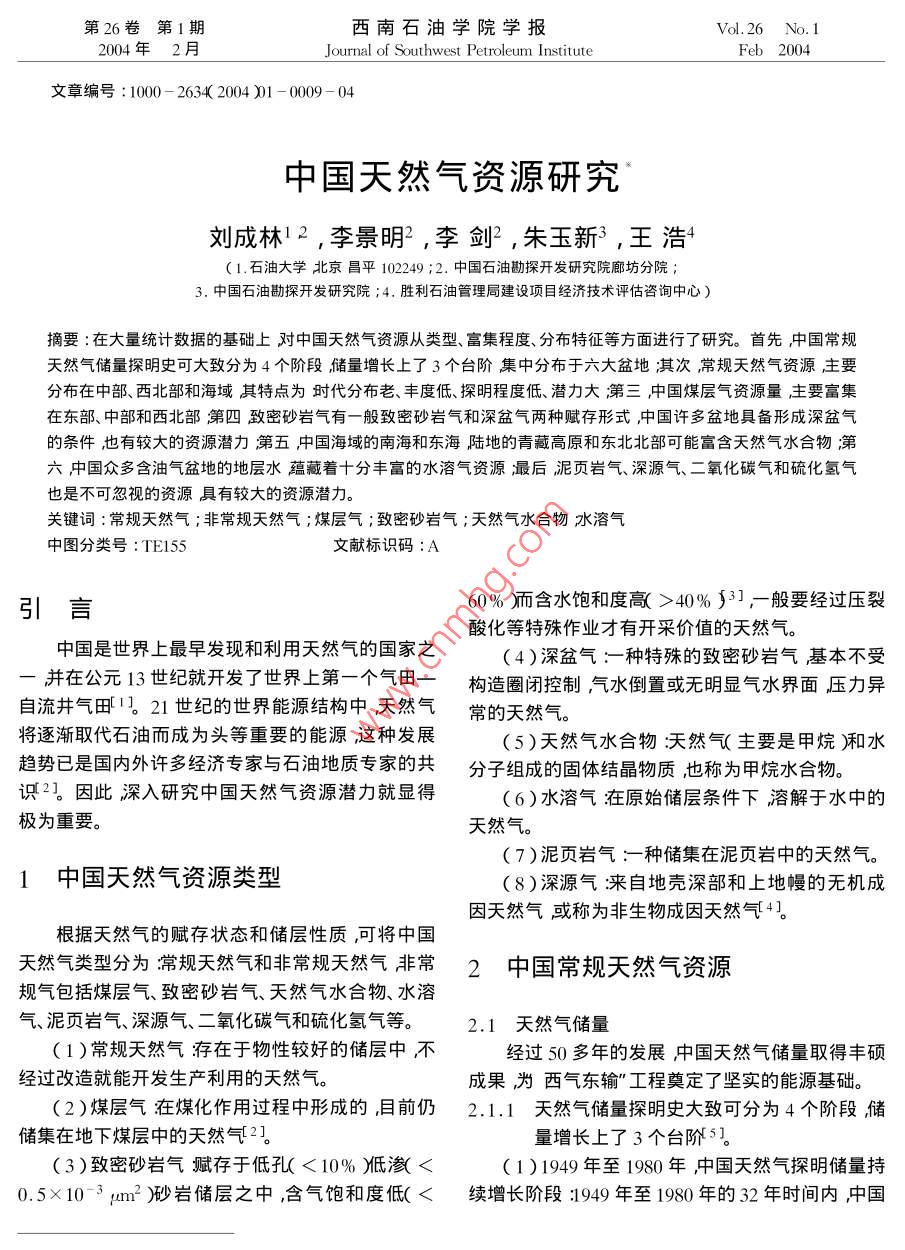 第26卷第1期西南石油學(xué)院學(xué)報(bào)Vol.26 No. 12004年2 月Journal of Southwest Petroleum InstituteFeb 2004文章編號(hào):1000 - 2634( 2004 )01 - 0009 - 04中國(guó)天然氣資源研究劉成林12 ,李景明2 ,李劍2 ,朱玉新,王浩+(1.石油大學(xué)北京昌平102249 ;2.中國(guó)石油勘探開(kāi)發(fā)研究院廊坊分院;3.中國(guó)石油勘探開(kāi)發(fā)研究院;4.勝利石油管理局建設(shè)項(xiàng)目經(jīng)濟(jì)技術(shù)評(píng)估咨詢中心)摘要:在大量統(tǒng)計(jì)數(shù)據(jù)的基礎(chǔ)上對(duì)中國(guó)天然氣資源從類(lèi)型、富集程度、分布特征等方面進(jìn)行了研究。首先,中國(guó)常規(guī)天然氣儲(chǔ)量探明史可大致分為4個(gè)階段,儲(chǔ)量增長(zhǎng)上了3個(gè)臺(tái)階集中分布于六大盆地;其次常規(guī)天然氣資源,主要分布在中部、西北部和海域其特點(diǎn)為時(shí)代分布老、豐度低、探明程度低、潛力大;第三,中國(guó)煤層氣資源量主要富集在東部、中部和西北部第四致密砂巖氣有一般致密砂巖氣和深盆氣兩種賦存形式,中國(guó)許多盆地具備形成深盆氣的條件也有較大的資源潛力第五中國(guó)海域的南海和東海陸地的青藏高原和東北北部可能富含天然氣水合物;第六中國(guó)眾多含油氣盆地的地層水蘊(yùn)藏著十分豐富的水溶氣資源最后泥頁(yè)巖氣、深源氣、二氧化碳?xì)夂土蚧瘹錃庖彩遣豢珊鲆暤馁Y源具有較大的資源潛力。關(guān)鍵詞:常規(guī)天然氣;非常規(guī)天然氣;煤層氣;致密砂巖氣;天然氣水合物水溶氣中圖分類(lèi)號(hào):TE155文獻(xiàn)標(biāo)識(shí)碼:A引言60%而含水飽和度高( > 40% 53] ,一般要經(jīng)過(guò)壓裂酸化等特殊作業(yè)才有開(kāi)采價(jià)值的天然氣。中國(guó)是世界上最早發(fā)現(xiàn)和利用天然氣的國(guó)家之(4)深盆氣: -種特殊的致密砂巖氣基本不受一并在公元13世紀(jì)就開(kāi)發(fā)了世界上第-個(gè)氣田一構(gòu)造圈閉控制,氣水倒置或無(wú)明顯氣水界面壓力異自流井氣田1。21世紀(jì)的世界能源結(jié)構(gòu)中天然氣常的天然氣。.將逐漸取代石油而成為頭等重要的能源這種發(fā)展(5)天然氣水合物:天然氣(主要是甲烷)和水趨勢(shì)已是國(guó)內(nèi)外許多經(jīng)濟(jì)專(zhuān)家與石油地質(zhì)專(zhuān)家的共分子組成的固體結(jié)晶物質(zhì),也稱(chēng)為甲烷水合物。識(shí)2。因此深入研究中國(guó)天然氣資源潛力就顯得(6)水溶氣在原始儲(chǔ)層條件下溶解于水中的極為重要。天然氣。(7)泥頁(yè)巖氣- -種儲(chǔ)集在泥頁(yè)巖中的天然氣。1中國(guó)天然氣資源類(lèi)型(8)深源氣:來(lái)自地殼深部和上地幔的無(wú)機(jī)成因天然氣或稱(chēng)為非生物成因天然氣[4]。根據(jù)天然氣的賦存狀態(tài)和儲(chǔ)層性質(zhì),可將中國(guó)天然氣類(lèi)型分為常規(guī)天然氣和非常規(guī)天然氣非常;2中國(guó) 常規(guī)天然氣資源規(guī)氣包括煤層氣、致密砂巖氣、天然氣水合物、水溶氣、泥頁(yè)巖氣、深源氣、二氧化碳?xì)夂土蚧瘹錃獾取?.1天然氣儲(chǔ)量(1)常規(guī)天然氣存在于物性較好的儲(chǔ)層中,不經(jīng)過(guò)50多年的發(fā)展中國(guó)天然氣儲(chǔ)量取得豐碩經(jīng)過(guò)改造就能開(kāi)發(fā)生產(chǎn)利用的天然氣。成果,為西氣東輸"工程奠定了堅(jiān)實(shí)的能源基礎(chǔ)。(2 )煤層氣在煤化作用過(guò)程中形成的,目前仍2.1.1天然氣儲(chǔ)量探明史大致可分為 4個(gè)階段,儲(chǔ)儲(chǔ)集在地下煤層中的天然氣2。量增長(zhǎng)上了3個(gè)臺(tái)階51。,(3)致密砂巖氣賦存于低孔( < 10% )低滲<(1 )1949年至1980年,中國(guó)天然氣探明儲(chǔ)量持0.5x10-3 pum2 )砂巖儲(chǔ)層之中,含氣飽和度低( <續(xù)增長(zhǎng)階段:1949 年至1980年的32年時(shí)間內(nèi),中國(guó)10西南石油學(xué)院學(xué)報(bào)2004年天然氣探明儲(chǔ)量增長(zhǎng)了2613.63x 108 m3增長(zhǎng)速率程度地進(jìn)行了油氣資源評(píng)價(jià)戴金星( 2000 )匯總這81.68X 108 m2/年。些成果,得到全國(guó)天然氣資源量為50. 6X 1012(2)1981至1989年,中國(guó)天然氣探明儲(chǔ)量增長(zhǎng)m1-6]上了第一個(gè)臺(tái)階:1981至1989年9年時(shí)間內(nèi)增長(zhǎng)儲(chǔ)2.2.1天然氣資源地理分布特征量2979.35* 108 m3增長(zhǎng)速率331.04x 108 m2/年,根據(jù)中國(guó)區(qū)域地質(zhì)構(gòu)造特征和天然氣勘探程:天然氣探明儲(chǔ)量年增長(zhǎng)速率是前期的4倍多。度中國(guó)天然氣資源分布大體可劃分出六大區(qū)(南中(3)1990年至1999年,中國(guó)天然氣探明儲(chǔ)量增國(guó)海諸盆地由于資料不全未包括在內(nèi)),即東部、中長(zhǎng)上了第二個(gè)臺(tái)階:1990年至1999年10年時(shí)間內(nèi)部、西北部、海域、南方和西藏。增長(zhǎng)儲(chǔ)量15038. 89x108 m3增長(zhǎng)速率1 503. 89x天然氣資源地理分布極不均衡主要分布在中108 m2/年天然氣探明儲(chǔ)量年增長(zhǎng)速率是前9年的部、西北部和海域,占全國(guó)天然氣資源總量的近4.5倍。80%具體表現(xiàn):東部主要包括松遼盆地和渤海灣盆(4)2000年起,中國(guó)天然氣探明儲(chǔ)量增長(zhǎng)上了地(陸地),天然氣資源量為6.57X 1012 m3 ,占全國(guó)第三個(gè)臺(tái)階2000年開(kāi)始的2年時(shí)間內(nèi)天然氣探明天然氣資源總量的近12.98%;中部主要包括四川儲(chǔ)量增長(zhǎng)速率4 694. 08x 108 m2/