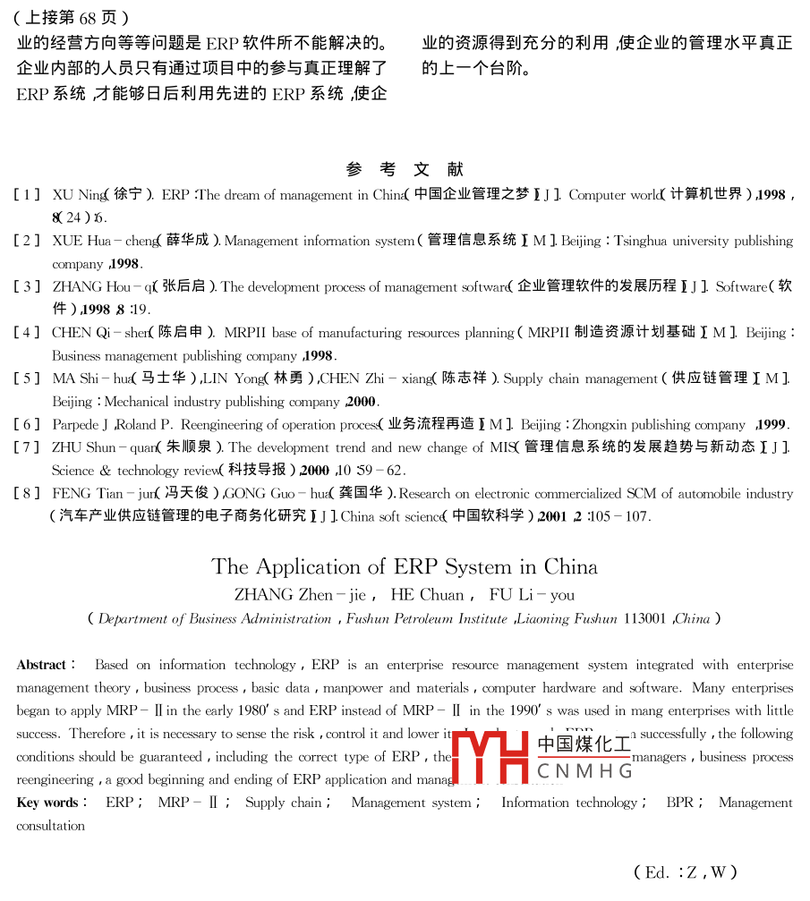 第21卷第4期撫順石油學(xué)院學(xué)報Vol 21 No 42001年12月JOURNAL OF FUSHUN PETROLEUM INSTITUTE2001文章編號:1005-38832001)4-0066-03ERP系統(tǒng)在我國的應(yīng)用張鎮(zhèn)潔,何川,富立友撫順石油學(xué)院工商管理系遼寧撫順113001摘要:ER企業(yè)資源計劃系統(tǒng)湜建立在信息技術(shù)基礎(chǔ)上整合了企業(yè)管理理念、業(yè)務(wù)流程、基礎(chǔ)數(shù)據(jù)、人力物力、計算機硬件和軟件于一體的企業(yè)資源管理系統(tǒng)。在我國有許多企業(yè)從80年代起就開始應(yīng)用MRP-Ⅱ剄90年代后ERP取代了MRP-Ⅱ成為許多企業(yè)應(yīng)用的工具但是成功率不高。因此應(yīng)用ERP時必須正確認識風(fēng)險控制風(fēng)險降低風(fēng)險。在此基礎(chǔ)上企業(yè)要成功實施ERP系統(tǒng)應(yīng)該有正確的ERP選型高層領(lǐng)導(dǎo)態(tài)度明確進行業(yè)務(wù)流程的重組培訓(xùn)要貫穿ERP系統(tǒng)實施的始終進行管理咨詢等。關(guān)鍵詞:ERP;MRP-Ⅱ;供應(yīng)鏈;管理系統(tǒng);信息技術(shù);BPR;管理咨詢中圖分類號935文獻標(biāo)識碼ERP是在80年代的MRP-Ⅱ的基礎(chǔ)上演變想為靈魂的軟件產(chǎn)品21;和發(fā)展而來的。進入90年代隨著市場競爭的進3膣整合了企業(yè)管理理念、業(yè)務(wù)流程、基礎(chǔ)數(shù)據(jù)、步加劇企業(yè)竟?fàn)幙臻g與范圍的進一步擴大80年人力物力、計算機硬件和軟件于一體的企業(yè)資源管代MRP-Ⅲ( Manufacturing Resources planning"制理系統(tǒng)。造資源計劃”莊要面向企業(yè)內(nèi)部資源全面計劃管理ERP無論是在中國還是在全世界都掀起了的思想逐步發(fā)展為0年代怎樣有效利用和管理整場關(guān)于管理思想和管理技術(shù)的革命。這一新的管理體資源的管理思想ERR企業(yè)資源計劃池就隨之方法和管理手段正在以一種人們無法想象的速度在產(chǎn)生。ERP是在MRP-Ⅱ的基礎(chǔ)上擴展了管理范中國的企業(yè)中被應(yīng)用和發(fā)展起來。ERP的應(yīng)用可圍給出了新的結(jié)構(gòu)把客戶需求和企業(yè)內(nèi)部的制造以有效地促進現(xiàn)有企業(yè)管理的現(xiàn)代化、科學(xué)化適應(yīng)活動、以及供應(yīng)商的制造資源整合在一起體現(xiàn)了完竟?fàn)幦找婕ち业氖袌鲆笏膶?dǎo)入已經(jīng)成為大勢全按用戶需求制造的思想。所趨1ERP的內(nèi)涵2ERP在中國的應(yīng)用現(xiàn)狀ERP-Enterprise Resource Planning企業(yè)資源計劃系統(tǒng)是指建立在信息技術(shù)基礎(chǔ)上以系統(tǒng)化隨著市場經(jīng)濟的發(fā)展中國企業(yè)原有的經(jīng)營管的管理思想為企業(yè)決策層及員工提供決策運行手理方式早已不適應(yīng)劇烈競爭的要求。企業(yè)面臨的是段的管理平臺??梢詮墓芾硭枷?、軟件產(chǎn)品、管理系一個越來越激烈的竟?fàn)幁h(huán)境上RP由于具有更多的統(tǒng)三個層次給出定ⅹ1功能而漸被企業(yè)所青睞。它可為企業(yè)提供投資管(1油美國著名的計算機技術(shù)咨詢和評估集團理、風(fēng)險分析、跨國家跨地區(qū)的集團型企業(yè)信息集Garter Group Inc提出的一整套企業(yè)管理系統(tǒng)體系成、獲利分析銷售分析市場預(yù)測、決策信息分析、標(biāo)準(zhǔn)其實質(zhì)是在MRP-Ⅱ基礎(chǔ)上進一步發(fā)展而促銷與分銷、售后服務(wù)與維護、全面質(zhì)量管理、運輸成的面向供應(yīng)鏈 Supply chain舶管理思想管理、亼力資源管理、項目管理以及利用 Internet實(2蹤合應(yīng)用了客戶機服務(wù)器體系、關(guān)系數(shù)據(jù)現(xiàn)電中國煤化工用這些工具來擴大經(jīng)庫結(jié)構(gòu)采用 DBMS CASE北1、網(wǎng)絡(luò)通訊等信息營冒CNMHG市場動態(tài)參與國際大產(chǎn)業(yè)成果可移植到各種硬件平臺以ERP管理思市場的競爭獲得豐厚的回報。在當(dāng)前形勢下企業(yè)應(yīng)用ERP面臨許多問題其收稿日期2001-02-03主要表現(xiàn)在作者簡介張鎮(zhèn)漬1972-),女遼寧撫順市講師(1對應(yīng)用ERP的根本目的認識有偏差。應(yīng)用第4期張鎮(zhèn)潔等.ERP系統(tǒng)在我國的應(yīng)用ERP不是一般意義上的企業(yè)信息化建設(shè)更不是一業(yè)來說需要對從ERP系統(tǒng)選型開始到系統(tǒng)上線的個簡單的計算機硬件、應(yīng)用軟件和互聯(lián)網(wǎng)系統(tǒng)的建實施全過程中存在的種種主要風(fēng)險有系統(tǒng)性的認設(shè)應(yīng)用ERP的根本目的是在學(xué)習(xí)、研究和應(yīng)用國識增強風(fēng)險意識積極地防范風(fēng)險建立起一整套外現(xiàn)代企業(yè)管理思想、方法和信息技術(shù)的基礎(chǔ)上盡行之有效的項目和風(fēng)險管理機制從而提高ERP系快改變我國企業(yè)管理粗放、落后的面貌建立起一套統(tǒng)的實施成功率最終達到提高企業(yè)管理水平提高符合市場經(jīng)濟體制的現(xiàn)代企業(yè)管理模式實現(xiàn)企業(yè)經(jīng)濟效益的目的。管理的跨越式發(fā)展從而提高企業(yè)管理水平加快工企業(yè)實施ERP時,必須認真考慮以下3種風(fēng)業(yè)化進程確保國民經(jīng)濟可持續(xù)發(fā)展。然而就是這險個根本目的時至今日仍未被多數(shù)企業(yè)所全面、深入(1企業(yè)外部風(fēng)險——環(huán)境風(fēng)險。ERP實施的地認識并貫穿于ERP應(yīng)用全過程外部風(fēng)險包括政治風(fēng)險、經(jīng)濟風(fēng)險、社會風(fēng)險、法律(2忽視了E