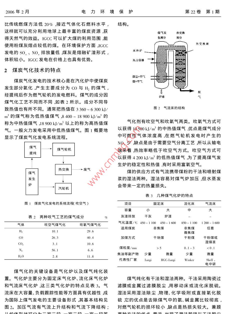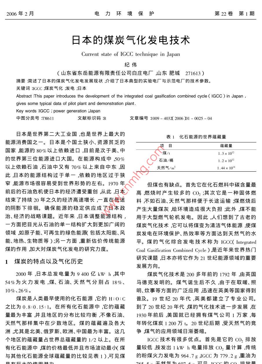 2006年2月電力環(huán)境保護(hù)第22卷第1期日本的煤炭氣化發(fā)電技術(shù)Current state of ICCC technique in Japan紀(jì)偉(山東省東岳能源有限責(zé)任公司白莊電廠山東肥城271613)摘要簡(jiǎn)述了日本的煤炭氣化發(fā)電發(fā)展現(xiàn)狀介紹了日本典型的實(shí)驗(yàn)電廠與示范電廠的技術(shù)參數(shù)。關(guān)鍵詞:CCC ;煤炭氣化;發(fā)電;日本Abstract :This paper introduces the development of the integrated coal gasification combined cycle ( IGCC ) in Japan ,gives some typical data of pilot plant and demonstration plant.Key words :1GCC ; power generation Japan中圖分類號(hào):TM611 .文獻(xiàn)標(biāo)識(shí)碼:B文章編號(hào):1009- 403X 2006 01- 0025 - 04日本是世界第二大工業(yè)國(guó),也是世界上最大的表1化石能源的世界蘊(yùn)藏量能源消費(fèi)國(guó)之一。日本是個(gè)國(guó)土狹小、資源貧乏的項(xiàng)目蘊(yùn)藏量國(guó)家能源的80%以上依賴進(jìn)口,目前是次于美、中煤/t1.3x 1012的世界第三位能源進(jìn)口大國(guó)。在能源構(gòu)成中,50%石油/桶.1.2x 1012以上依賴石油,石油中又有70%以上來(lái)自中東,因天然氣/m'1.44x 10' .此,日本的能源結(jié)構(gòu)過(guò)于單一,依賴的地區(qū)過(guò)于狹窄能源市場(chǎng)很容易受到世界形勢(shì)的左右。1970 年但煤也有缺點(diǎn)。首先它在化石燃料中碳含量最前后的石油危機(jī)使日本的經(jīng)濟(jì)遭受重創(chuàng),從此,日本高燃燒時(shí)產(chǎn)生較多的CO2 ;其次它是一種固體燃結(jié)束了持續(xù)20年之久的經(jīng)濟(jì)高速增長(zhǎng),-直在低迷料不如石油、天然氣那樣便于長(zhǎng)途運(yùn)輸;煤燃燒后的陰影下徘徊。確保能源的穩(wěn)定供應(yīng)成了日本政產(chǎn)生大量煤灰給環(huán)境造成很大負(fù)擔(dān);此外煤不能治、經(jīng)濟(jì)的戰(zhàn)略課題。近年來(lái),日本調(diào)整能源結(jié)構(gòu),用于大型燃?xì)廨啓C(jī)發(fā)電。因此,人們想到了古老的一方面把目光從石油的單-結(jié)構(gòu)擴(kuò)大到更加廣闊的煤炭氣化技術(shù),它可以將煤變?yōu)榍鍧崥怏w能源使煤領(lǐng)域,如原子能、可再生的綠色能源(包括太陽(yáng)能、風(fēng)炭發(fā)電在環(huán)境保護(hù)、熱效率等方面達(dá)到天然氣的水能、地?zé)?、生物質(zhì)等);另一方面,重新估價(jià)傳統(tǒng)能源平。煤的氣化綜合發(fā)電技術(shù)稱為ICCC Integrated煤的作用加大對(duì)煤炭氣化發(fā)電的研究力度。Coal Gasification Combined Cycle )是近年來(lái)世界熱門(mén)研究課題,日本亦將它作為21世紀(jì)能源領(lǐng)域的重要1煤炭的特 點(diǎn)以及氣化歷史發(fā)展方向。2000年,日本總發(fā)電量為9400億kWw h ,其中煤炭氣化技術(shù)是200多年前的1792年,由英國(guó)54%為火力發(fā)電,煤、石油、天然氣分別占18%、馬德克發(fā)明的。煤氣誕生后不久,由于在取暖、照10%、26%。明、炊事等方面的廣泛應(yīng)用迅速在英美等國(guó)家得到煤炭是人類最早使用的化石能源,它的H:O:C普及。19 世紀(jì)20年代,英美都建立了專業(yè)公司。之比為0.8:0.15:1。在所有化石能源中,它的蘊(yùn)藏到了20世紀(jì)20年代煤的氣化技術(shù)進(jìn)一步發(fā)展在量最為豐富并且地區(qū)的分布比較均衡,不像石油、1930年前后,美國(guó)就已經(jīng)擁有煤氣公司1萬(wàn)家,每天然氣那樣集中在少數(shù)地區(qū)。煤的蘊(yùn)藏遍及各大年轉(zhuǎn)化煤炭1200萬(wàn)to 20世紀(jì)后期受天然氣的競(jìng)洲,尤其是北美、俄羅斯、歐洲、中國(guó)最為豐富。這幾爭(zhēng)煤氣的應(yīng)用領(lǐng)域日漸萎縮。個(gè)地區(qū)的蘊(yùn)藏量占世界總蘊(yùn)藏量的1/2以上。在所IGCC技術(shù)有很多優(yōu)點(diǎn)。首先是它的CO2排放有化石能源中煤的價(jià)格最低并且市場(chǎng)波動(dòng)最小煤量較低按發(fā)出1kW h電量排放CO2量計(jì)算,傳統(tǒng)與其他化石能源全球蘊(yùn)藏量的比較見(jiàn)表1 ),可見(jiàn)煤的粉煤火力發(fā)電為964.7g ,IGCC為779.2g重油為2006年2月電力環(huán)境保護(hù)第22卷第1期比傳統(tǒng)燃煤方法低20%接近氣體化石燃料水平,結(jié)構(gòu)。這樣就可以充分利用地球上最豐富的煤炭資源,獲煤氣發(fā)熱交換得天然氣的效益。IGCC 可以擴(kuò)大煤的利用范圍,能生那分使用粉煤灰熔點(diǎn)較低的煤。在環(huán)境保護(hù)方面,ICGCC發(fā)電的S0,、NO,排放量低煤灰是熔融礦渣形式,水冷爐體積較小。IGCC 發(fā)電在價(jià)格上也具有優(yōu)勢(shì)。用川容器十2煤炭氣化技術(shù)的特點(diǎn)煤炭氣化發(fā)電的技術(shù)核心是在汽化爐中使煤炭煤+窄氣發(fā)生部分氧化,產(chǎn)生主要成分為CO與H2的煤氣,經(jīng)提純后作為燃?xì)廨啓C(jī)的發(fā)電燃料。煤氣的成分因爐渣煤氣化工藝不同而不同,如表2所示。成分不同導(dǎo)致熱值也有所不同。通常把熱值在3360~6300kJ/圖2氣流床的結(jié)構(gòu)m3的煤氣稱為低熱值煤氣,8 400~ 18 900kJ/m3的稱為中熱值煤氣,18900kJ/m3以上的稱為高熱值煤氣化劑有吹空氣和吹氧氣兩類。吹氧氣方式可氣。一般火力發(fā)電采用中低熱值煤氣。圖1概要地以獲得10500kJ/m3的中熱值煤氣優(yōu)點(diǎn)是煤氣成分中可燃性氣體濃度高,在燃?xì)廨啓C(jī)發(fā)電時(shí)產(chǎn)生的顯示了煤炭氣化發(fā)電系統(tǒng)流程。NO,少缺點(diǎn)是由于需要空氣分離工藝所以從輸電煤