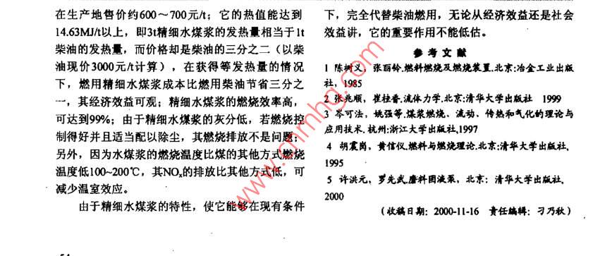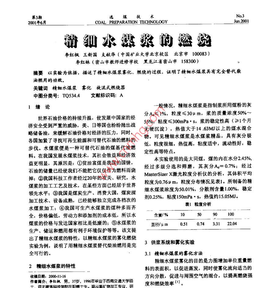 第3期選煤技術(shù)No. 32001年6月COAL PREP ARATION TECHNOLOGYJun 2001獵駟水猓漿的盎燒李紅楓王新國支獻(xiàn)華(中國礦業(yè)大學(xué)北京校區(qū)北京市100083)李紅妹(密山市教師進(jìn)修學(xué)校黑龍江省密山市158300摘要以實(shí)驗(yàn)為依據(jù),描述了精細(xì)水煤漿霧化、燃燒的過程,證明了精細(xì)水煤漿具有完全替代柴油然用的功效關(guān)鍵詞精細(xì)水煤漿霧化旋流式燃燒器中圖分類號(hào):TQ5344文獻(xiàn)標(biāo)識(shí)碼:A緒論般情況,精細(xì)水煤漿是指制漿所用煤粉的灰世界石油價(jià)格的持續(xù)升溫,使發(fā)展中國家的經(jīng)分A≤1%,粒度≤30pm,漿的質(zhì)量濃度50%濟(jì)安全受到嚴(yán)重的威脅,美、日等國也紛紛拋出戰(zhàn)5%,粘度≤300mPa·s,漿的穩(wěn)定性高(≥1個(gè)月略儲(chǔ)備油,來緩解石油價(jià)格對(duì)經(jīng)濟(jì)的壓力,同時(shí)無硬沉淀),熱值大于14.63M以上的煤水混合各國加緊了尋找可再生能源和可替代石油的燃料的物??梢娋?xì)水煤漿是水煤漿精品,具有灰分極步伐。水煤漿便是一種可替代石油的煤基代油燃低,粒度很細(xì),熱值高,粘度適中,流動(dòng)性好,穩(wěn)料。在我國發(fā)展水煤漿技術(shù),其社會(huì)效益和經(jīng)濟(jì)效定性高等特點(diǎn)益更明顯,其原因是:①貧油富煤是我國的國情,本實(shí)驗(yàn)使用的是大同煤,煤的內(nèi)在水分245%,石油的儲(chǔ)量已經(jīng)使我們不能把它僅僅作為燃料而燒經(jīng)過多級(jí)分選和篩磨,其灰分A=0.7%;經(jīng)過掉;②我國科技工作者經(jīng)過20年的攻關(guān)、研究,水rasterIzer X激光粒度分析儀的分析,其體積平均煤漿的加工工藝及技術(shù),在某些方面已經(jīng)居于世界粒度為076um,粒度分布情況見表】。所制備的精領(lǐng)先水平;③我國是煤炭生產(chǎn)、消費(fèi)大國,煤炭深細(xì)水煤漿濃度為5001%,分散劑含量100%,穩(wěn)定加工技術(shù)、設(shè)備成熟,已經(jīng)能夠獨(dú)立完成各檔次的劑0.25%,粘度150mPa·s,熱值約15.05MJ。水煤漿加工;④我國可生產(chǎn)水煤漿的煤種多而齊表1粒度分析全,價(jià)格偏低,勞動(dòng)力和添加劑的成本低,所以水含址/%90100煤漿的價(jià)格與發(fā)達(dá)國家相比是低壕的:⑤水煤漿的直徑/m0510743312204生產(chǎn)、儲(chǔ)運(yùn)和燃用都有利于環(huán)境保護(hù)等等。該文提出了精細(xì)水煤漿的特性,以精細(xì)水煤漿的霧化燃燒實(shí)驗(yàn)為例,說明了用精細(xì)水煤漿替代柴油燃用是完供漿系統(tǒng)和霧化實(shí)驗(yàn)全可行的。31精細(xì)水煤漿的霧化方法精細(xì)水煤漿霧化的目的是力圖增加單位重量燃2精細(xì)水煤漿的特性料的表面積,以促進(jìn)蒸發(fā),同時(shí)使霧化流向適當(dāng)?shù)淖髦喗槔詈鐥髂?37歲,196年畢業(yè)于西隋交通學(xué)萬向分散,促進(jìn)與周圍空氣的混合,以提高燃燒強(qiáng)收稿日期:2000-11-16河北建科特學(xué)院在眼博十?!,F(xiàn)從事礦物加工專業(yè),研度和燃燒效率口。算3期李紅楓等:精細(xì)水煤漿的燃燒201年6月25日表性的有以下幾類:①將液體加壓,由噴頭高速噴理圖如圖1所示。根據(jù)燃漿量,計(jì)算出燃燒器內(nèi)徑出的油壓噴霧型:②借助于空氣或蒸汽等流體的噴為0125m,體積為0245m3流,使液體燃料霧化的二流體噴霧型;③將液體燃料供給高速旋轉(zhuǎn)的杯或圓板,借助于離心力使其霧RAY化的旋轉(zhuǎn)型;④使兩種液體燃料相互沖擊,或者液再排體燃料沖擊金屬板,而進(jìn)行霧化的對(duì)沖噴霧型:⑤水煤旅+化空氣借助于聲波、超聲波等的作用,使液體燃料振動(dòng),而進(jìn)行分裂霧化的振動(dòng)霧化型;⑥將液體燃料加以圖1燒原圖高壓靜電,使其霧化的靜電型,等等。42柴油點(diǎn)火過本實(shí)驗(yàn)采用的霧化方法為方法(2),實(shí)驗(yàn)情由于精細(xì)水煤漿的冷態(tài)點(diǎn)火困難,所以采用燃況如下所述柴油預(yù)熱點(diǎn)火,其過程如下:將柴油注入油罐中,3.2供漿系和供漿實(shí)驗(yàn)加04MPa左右的空氣壓力,使其霧化,插入燃燒供漿系統(tǒng)采用壓力輸送,即利用壓縮空氣鋼瓶器內(nèi)點(diǎn)燃,同時(shí)加一次配風(fēng),引導(dǎo)火焰旋轉(zhuǎn),再增的氣壓,將儲(chǔ)漿鋼瓶中的精細(xì)水煤漿壓擠,進(jìn)入噴加二次配風(fēng),使柴油充分燃燒。槍。根據(jù)燃燒漿,用手動(dòng)閥門調(diào)節(jié)壓縮空氣鋼瓶43柴油精細(xì)水煤漿混燃過程的出口壓力,達(dá)到控制燃漿量。經(jīng)實(shí)驗(yàn)觀察,精細(xì)當(dāng)柴油燃燒加熱溫度接近1200℃時(shí),將準(zhǔn)備好水煤漿的供漿系統(tǒng)工況良好。的供漿、霧化裝置與噴嘴連接好,插入噴漿孔,在33主要霧化設(shè)備減少噴油量的同時(shí),開啟供漿、霧化裝置和打開噴噴嘴選用中120mm的內(nèi)混式噴嘴,經(jīng)測(cè)試,嘴開關(guān),此時(shí)會(huì)出現(xiàn)“轟”聲和爆燃現(xiàn)象,燃燒器漿體在04MPa壓力下,精細(xì)水煤漿的流量可達(dá)到內(nèi)的火焰迅速增加,煙氣量也有所增加,適當(dāng)調(diào)整10kgh,能滿足實(shí)驗(yàn)要求。空壓機(jī)釆用的是容量為噴油量、噴漿量和配風(fēng)量,使燃燒器內(nèi)的燃燒達(dá)到10kg,出口最大壓力為07 7MPa,功率為1.kW的最充分XINBAO牌空壓機(jī)。44精細(xì)水煤漿的燃燒過程霧化實(shí)驗(yàn)是在室外進(jìn)行的,在壓縮空氣鋼瓶的經(jīng)過點(diǎn)火、混燃過程