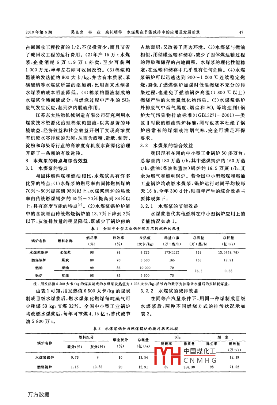 第20卷第6期中國(guó)環(huán)境管理干部學(xué)院學(xué)報(bào)Vol. 20No 62010年12月JOURNAL OF EMCCDec.201010.3969/j.issn.1008-813X.2010.06.013水煤漿在節(jié)能減排中的應(yīng)用及發(fā)展前景吳良忠1,韋業(yè)2,余禮明2,林華榮2(1.北海市海城區(qū)環(huán)境保護(hù)分局,廣西北海536000;2.北海市環(huán)境監(jiān)測(cè)中心站廣西北海536000摘要:水煤漿是由60%~68%的煤和32%~40%的水或廢水經(jīng)研磨混合,在0.5%添加劑作用下形成的一種均勻穩(wěn)定的流體潔凈燃料,以流態(tài)霧化噴燃方式燃燒。水煤漿技術(shù)基本成熟,已被廣泛應(yīng)用于工業(yè)鍋爐和窯爐。在同等條件下,水煤漿與燃煤相比可節(jié)煤32%,減排SO2和煙塵分別達(dá)到77%和82%以上;燃自制水煤漿時(shí)可節(jié)省燃料費(fèi)20%以上。將水煤漿技術(shù)應(yīng)用于治理棉漿粕黑液時(shí),不僅投資比堿回收工程少1/2,而且實(shí)現(xiàn)了零排放。自“十五”以來,國(guó)家一直十分重視水煤漿產(chǎn)業(yè),其發(fā)展前景十分廣闊關(guān)鍵詞:水煤漿;燃燒系統(tǒng);節(jié)能減排;綜合效益;應(yīng)用前景中圖分類號(hào):X24文獻(xiàn)標(biāo)識(shí)碼:A文章編號(hào):1008-813(2010)060045-05The Application and Development Prospect of CoalWater Slurry in Energy Saving and Emission ReductionWu Liangzhong, Wei Ye, Yu Liming, Lin Huarong(l. Haicheng Branch of Beihai Environmental Protection Bureau, Beihai Guangri 536000;2. Beihai Environmental Monitoring Central Station, Beihai Guangri 536000)Abstract: Coal water slurry is a kind of inform and stable clean liquid fuel made up of 60% to68% of coal and 32% to 40% of water or wastewater by adding 5% of additive after mixingand grinding, which is burnt by spraying. The technology of coal water slurry is almost ma-ture,and has been widely used in industrial boiler and furnace. In comparison with coal, onthe same conditions coal water slurry can save 32% of coal, reduce SO2 and dust emissionsbeyond% and 82% respectively. Self-prepared coal water slurry can save more than 20%of cost. When coal water slurry is applied to treat cotton pulp digestion wastewater, the in-vestment is 50% less than alkali recovery project, and can achieve zero emission. Since theTenth Five-year Plan, the Chinese government has attached great importance to coal waterslurry development, it has a wide development prospect.Key words: coal water slurry burning system; energy saving and emission reduction; compre-hensive benefit; development prospect中國(guó)煤化工收稿日期:201007-15CNMHG作者簡(jiǎn)介:吳良忠(1971—一),男,廣西北海人,畢業(yè)于廣西農(nóng)業(yè)大學(xué)環(huán)境保YHs,工贗掌熀聊響評(píng)價(jià)和生態(tài)保護(hù)方面的工作46循環(huán)經(jīng)濟(jì)與可持續(xù)發(fā)展中國(guó)環(huán)境管理干部學(xué)院學(xué)報(bào)2010年12月《國(guó)家“十一五”規(guī)劃綱要》提出了“十一五”期(60%~68%,以水或高濃度的有機(jī)廢水為輔間單位國(guó)內(nèi)生產(chǎn)總值能耗降低20%左右,主要污(32%~40%),經(jīng)專用設(shè)備研磨、充分混合,在染物排放總量減少10%的約束性指標(biāo)。我國(guó)的燃0.5%化學(xué)添加劑的作用下,形成均勻穩(wěn)定的流煤工業(yè)鍋爐(窯爐)和高濃度有機(jī)廢水污染嚴(yán)重,體。水煤漿通常以流態(tài)霧化噴燃方式燃燒2-4是節(jié)能減排工作要解決的重點(diǎn)口。為此,本文淺其基本工作程序是:水煤漿經(jīng)供漿泵輸至過濾器析了一種煤基流體清潔燃料——水煤漿在工業(yè)鍋后,在空氣壓縮機(jī)產(chǎn)生的高壓氣體作用下經(jīng)特制爐(窯爐)和高濃度有機(jī)廢水節(jié)能減排中的應(yīng)用及噴槍送入燃燒器,用油點(diǎn)火,在爐膛內(nèi)燃燒;產(chǎn)生發(fā)展前景。的廢氣經(jīng)高效除塵脫硫處理后,由煙囪排入大氣1水煤漿的制備與燃燒系統(tǒng)水煤漿的制備與燃燒系統(tǒng)工藝流程如圖1。水煤漿以洗精煤或低灰、低硫的原煤為主水或廢水過濾器匚廉機(jī)師漿器煤破碎皮帶秤添加劑計(jì)量泵二級(jí)攪拌器研剪機(jī)一級(jí)攪拌器過濾器空壓機(jī)儲(chǔ)氣健排空儲(chǔ)漿罐供漿泵過濾器燃燒器鍋爐或窯爐除塵脫硫油點(diǎn)火圖1水煤漿的制備與燃燒系統(tǒng)工藝流程2水煤漿技術(shù)的應(yīng)用現(xiàn)狀中的應(yīng)用2.1水煤漿在工業(yè)鍋爐(窯爐)中的應(yīng)用張家港市錦豐軋花剝絨有限責(zé)任公司產(chǎn)生的水煤漿在我國(guó)經(jīng)過近30年的研究開發(fā)、工業(yè)棉漿粕黑液高濃度有機(jī)廢水約6萬t/a。該公司性實(shí)驗(yàn)和商業(yè)性示范應(yīng)用歷程,其生產(chǎn)與應(yīng)用技鑒于黑液堿回收設(shè)施投資大運(yùn)行成本高,委托術(shù)基本成熟,已推廣到絕大部分省、區(qū)、市。據(jù)江蘇東大熱能機(jī)械制造有限公司利用水煤漿技術(shù)2006年8~9月國(guó)家發(fā)改委會(huì)同有關(guān)部門的調(diào)對(duì)棉漿粕黑液進(jìn)行資源化治理。其技術(shù)路線是:查,全國(guó)水煤漿生產(chǎn)能力達(dá)1500萬t/a以上,在將現(xiàn)有的20t/h、35t/h二臺(tái)燃煤鍋爐的燃燒系20多臺(tái)燃油鍋爐、300臺(tái)工業(yè)鍋爐及數(shù)百臺(tái)工業(yè)統(tǒng)進(jìn)行改造,使其適用于燃燒用棉漿粕黑液制成窯爐上替代燃油、燃?xì)夂腿济旱乃簼{;將棉漿粕黑液與洗精煤按一定配比,采由于水煤漿在工業(yè)鍋爐(1~150t/h)和工業(yè)用新型濕式研磨工藝制成水煤漿供鍋爐燃燒。所窯爐(陶瓷行業(yè