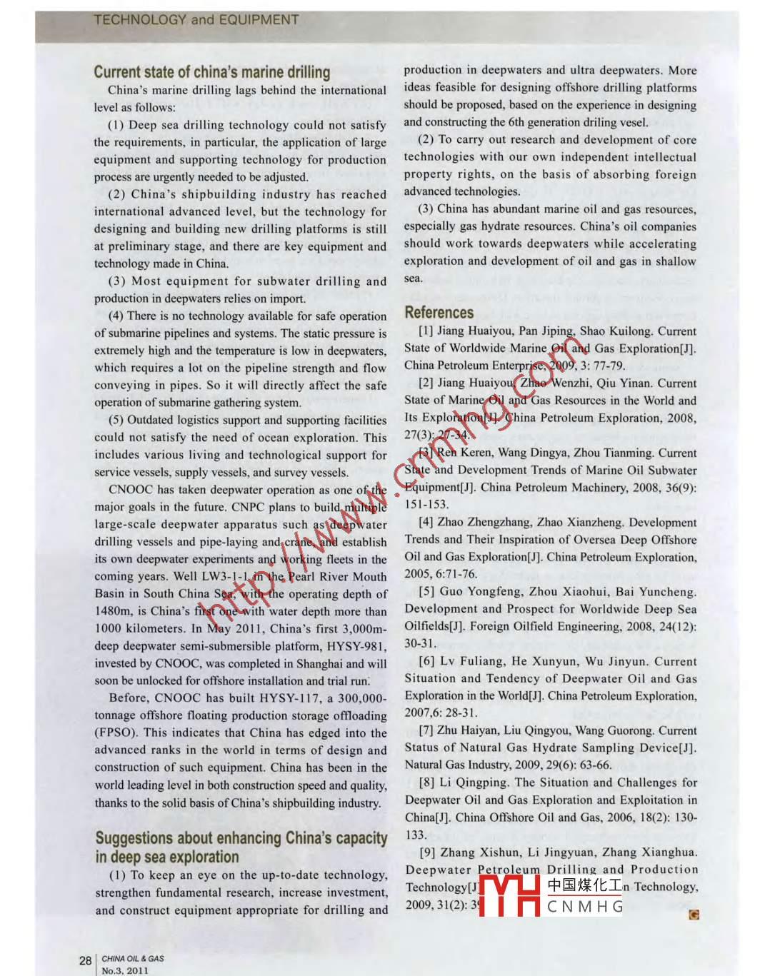TECHNOLOGY and EQUIPMENTCurrent State and DevelopmentTrends of Deep Sea Oil and GasExplorationang wen(SINOPEC Research Inoleum EngineeringAs people probe deeply into submarine exploration will lie in deep water in the future, but only 3% have beenand development of oil, gas hydrates and other mineral produced so far, so it still has a great potential. Newlyreserves,deepwater oil and gas development has become proven oil and gas reserves were 16.4 billion tons of oila hotspot for world petroleum industry and the frontier of and gas equivalent from 2000 to 2005, 41% were in deeptechnological innovation. In the past few years, petroleum sea, 31% in shallow sea, and 28% on land. On the basiscompanies engaged in deep sea exploration put more effort of Offshore Resources, there were 434 marine oil and gason exploration and development of marine resources. development projects worldwide from 2001 to 2007, 48%However, the companies capable of carrying out deep of which were conducted in deepwater with water thesea operation can be reckoned up on the fingers of one depth more than 500m and 22% were in ultra deepwatershand, because such operation involves technological with the water depth more than 1, 200m.support, logistics support, legal issues, warning and Now more than 100 countries have been engaged inavoidance of natural disasters. Technologically, to have a offshore petroleum exploration, and more than 50 havebetter understanding of the technical difficulties in deep carried out deep sea exploration. The U.S. has the largestsea exploration and increase science and technology amount of offshore drilling in the world, and it has moreinvestment could not only ease power shortages in China, than 19,000 wells in the Gulf of Mexico and about 100but enable proven technologies to be integrated and then wells under production in Gulf Area. Besides, UKdevelop high-efficiency technological systemsMalaysia, India, Russia and some other countries havealso been engaged in a great quantity of marine drillingOverview of deepwater and ultra deepwater BP, Petrobras, Statoil, Exxon Mobil, Shell, Unocal,explorationand some other companies equipped with deepwaterBased on international conventions, water domains less exploration and development technologies usuallythan 400m deep, 400-1, 500m deep and more than 1, 500m cooperate with each other to carry out exploration anddeep are named as conventional water depth, deepwater exploitation of中國煤化工 North Seaand ultra deepwater, respectively. As predicted by the the Gulf of Muth China SeaWorld Deepwater Report, 44% of oil and gas reserves became targetsC N MH Go deep sea oil24 CHINA OIL& GASo.3.2011TECHNOLOGY and EQUIPMENTand water activities from 2005 to 2008. Global deepwater few European developed countries have mastered coreoil and gas exploration is witnessing a rapid development, deepwater exploration technologiesas the continental-shelf oil and gas exploration extends tothe oceanTechnological difficulties in deepwater and ultradeepwater drillingCurrent state of deepwater and ultra deepwater (1)Deepwater exploration and development vsoil and gas explorationtraditional drillingCurrent state of deepwater and ultra deepwater Deepwater drilling has to deal with the problems asdrilling technologyfollows: the berth of offshore fixed platforms or freeExploration and development of deepwater oil and gas floating platforms in deep sea, the unstabilizing geofactorresources features in high and new technologies, high of deepwater sea bed, the deepwater well control whilerisk, high investment and high yield, yet the high yield floating, and effective protection of deep sea environment,and huge additional benefits from deepwater oil and gas etc. With respect to traditional onshore drillingexploration and development lure the attention of world's technology, marine drilling technology has the followinglarge petroleum companies. Deepwater drilling data in characteristicsthe past few years show that global drilling capacity has Firstly, how to locate the exact position of oil and gasreached 10,000m, and there have been 15 drilling vessels reservoirs during oil and gas exploration. Reservoir fluidsoperating in deepwaters with the water depth more than get complicated as water depth rises. Some technologies3, 000m, with the maximum lifting capacity being 14,000 for oil and gas exploration in deepwaters have to betons during offshore operation, deepwater pipe-laying employed for offshore drilling engineering, includinglength has reached 12,000km, remedial operation could the long-cable seismic signal measuring and analytibe carried out in the area with the water depth more than technology, the multi-wave field analytic technology, the2,000m, and there have been more than 204 production technology for identification of large reservoirs in deeprigs operating in deepwaters. There were 2, 100 subsea waters, and the technology for identification of subtle oiproduction systems in 2003 and 5, 700 in 2007. The and gas reservoirs, etc. The expenditure for marine oildepth of drilling with semi-submersible platforms in and gas exploration is five to six times land exploration,the world was mostly between 60 and 2,000m, with a drilling cost is higher than 10,000 RMB per meter, 300 tomaximum of 3, 100m. The U.S. is worlds first country 600 million dollars have to be used for construction of aengaged in deep sea research and development, and it medium-sized offshore oilfield, and two to three billionowns advanced platforms and submarine completion dollars are needed to construct a large one. Thereforeequipment. As well some European countries have their various technologies have to be used to thoroughlyown merits in deep sea exploration and development. analyze regional tectonics and hydrocarbon accumulationFig. I presents the statistics of success ratio of deepwater laws, accurately locate hydrocarbon structures of hugeexploration in various places of the world. The success reserve
