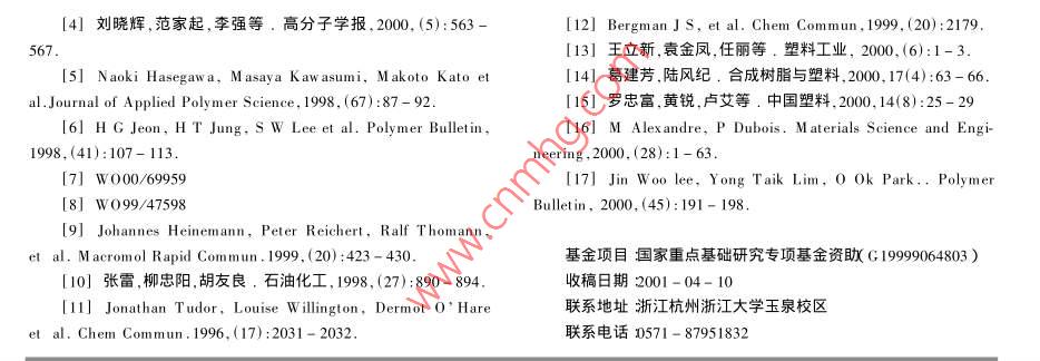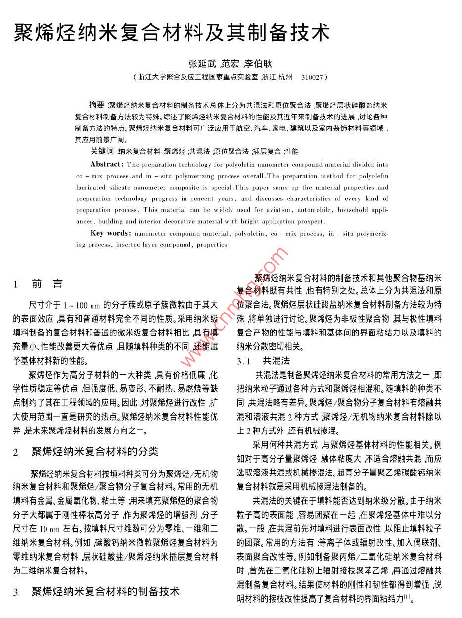 聚烯烴納米復(fù)合材料及其制備技術(shù)張延武范宏李伯耿(浙江大學(xué)聚合反應(yīng)工程國(guó)家重點(diǎn)實(shí)驗(yàn)室浙江杭州310027 )摘要聚烯烴納米復(fù)合材料的制備技術(shù)總體上分為共混法和原位聚合法聚烯烴層狀硅酸鹽納米復(fù)合材料制備方法較為特殊。綜述了聚烯烴納米復(fù)合材料的性能及其近年來(lái)制備技術(shù)的進(jìn)展,討論各種制備方法的特點(diǎn)。聚烯烴納米復(fù)合材料可廣泛應(yīng)用于航空、汽車(chē)、家電、建筑以及室內(nèi)裝飾材料等領(lǐng)域,其應(yīng)用前景廣闊。關(guān)鍵詞納米復(fù)合材料聚烯烴共混法原位聚合法插層復(fù)合;性能Abstract: The preparation technology for poly olefin nanometer compound material div ided intoco - mix process and in - situ polymerizing process overall .The preparation method for polyolefinlaminated silicate nanometer composite is special.This paper sums 中the material properties andpreparation technology progress in rencent years, and discusses characteristics of every kind ofpreparation proess. This malerial can be widely used for aviation ,automobile, household appi-ances, building and interior decorative material w ith bright applicat ion prospeet .Key words: nanometer compound material, polyolefin, co - mix proces, in - situ poly meriz-ing process, inserted layer compound, properties聚烯烴納米復(fù)合材料的制備技術(shù)和其他聚合物基納米1前言復(fù)合材料既有共性,也有特別之處??傮w上分為共混法和原尺寸介于1~ 100 nm的分子簇或原子簇微粒由于其大位聚合法。聚烯烴層狀硅酸鹽納米復(fù)合材料制備方法較為特的表面效應(yīng)具有和普通材料完全不同的性質(zhì)。采用納米級(jí)殊將單獨(dú)進(jìn)行討論。聚烯烴為非極性聚合物其與極性填料填料制備的復(fù)合材料和普通的微米級(jí)復(fù)合材料相比具有填復(fù)合產(chǎn)物的性能與填料和基體間的界面粘結(jié)力以及填料的充量小、性能改善更大等優(yōu)點(diǎn),且隨填料種類(lèi)的不同還能賦納米分散密切相關(guān)。予基體材料新的性能。共混法聚烯烴作為高分子材料的一大種類(lèi)具有價(jià)格低廉化共混法是制備聚烯烴納米復(fù)合材料的常用方法之一即學(xué)性質(zhì)穩(wěn)定等優(yōu)點(diǎn)但強(qiáng)度低、易變形、不耐熱、易燃燒等缺把納米粒 子通過(guò)各種方式和聚烯烴相混和。隨填料的種類(lèi)不點(diǎn)制約了其在工程領(lǐng)域的應(yīng)用。因此對(duì)聚烯烴進(jìn)行改性擴(kuò)同 共混法略有差異。聚烯烴/聚合物分子復(fù)合材料有熔融共大使用范圍一直是研究的熱點(diǎn)。聚烯烴納米復(fù)合材料性能優(yōu)混和溶液共混2種方式聚烯烴/無(wú)機(jī)物納米復(fù)合材料除以異是未來(lái)聚烯烴材料的發(fā)展方向之-。上2種方式外還有機(jī)械摻混。采用何種共混方式與聚烯烴基體材料的性能相關(guān)。例2聚烯烴納米 復(fù)合材料的分類(lèi)如對(duì)于高分子量聚烯烴融體粘度大不適合熔融共混,而應(yīng)聚烯烴納米復(fù)合材料按填料種類(lèi)可分為聚烯烴/無(wú)機(jī)物選取溶液共混或機(jī)械摻混法。超高分子量聚乙烯碳酸鈣納米納米復(fù)合材料和聚烯烴/聚合物分子復(fù)合材料。常用的無(wú)機(jī)復(fù)合材料就是采用機(jī)械摻混法制備的。填料有金屬、金屬氧化物、粘土等;用來(lái)填充聚烯烴的聚合物共混法的關(guān)鍵在于填料能否達(dá)到納米級(jí)分散。由于納米分子大都屬于剛性棒狀高分子作為聚烯烴的增強(qiáng)劑分子粒子高的表面能容易團(tuán)聚在-起在聚烯烴基體中難以分尺寸在10 nm左右。按填料尺寸維數(shù)可分為零維、-維和二散。一般在共混前先對(duì)填料進(jìn)行表面改性,以阻止填料粒子維納米復(fù)合材料。例如碳酸鈣納米微粒聚烯烴復(fù)合材料為的團(tuán)聚。常用的方法有等離子體或輻射改性、加入偶聯(lián)劑、零維納米復(fù)合材料層狀硅酸鹽/聚烯烴納米插層復(fù)合材料表面聚合改性等。例如制備聚丙烯/二氧化硅納米復(fù)合材料為二維納米復(fù)合材料。時(shí)首先在二氧化硅粉上輻射接枝聚苯乙烯再通過(guò)熔融共混制備復(fù)合材料。結(jié)果使材料的剛性和韌性都得到增強(qiáng),說(shuō)3聚烯烴納米 復(fù)合材料的制備技術(shù)明材料的接枝改性提高了復(fù)合材料的界面粘結(jié)力"。3.2原位聚合法制備。剝離吸附法即首先將層狀粘土剝離成單- -片層使聚原位聚合法是在無(wú)機(jī)填料存在的條件下進(jìn)行聚合反應(yīng),合物吸附于片層表面然后各片層間由于聚合物間的親和極在反應(yīng)器中完成復(fù)合材料的制備。與共混法相比原位聚合性重新又結(jié)合為層狀。將聚乙烯和改性粘土分散于二甲苯和法具有以下優(yōu)點(diǎn)(1 )由于是在反應(yīng)器中直接復(fù)合,節(jié)省了設(shè)氰苯混和液(80: 20)中粘土濃度為20%然后在四氫呋喃備降低了成本(2)與熔融共混相比較產(chǎn)物只經(jīng)-次熔融中沉淀即得到聚乙烯基納米復(fù)合材料6。造粒避免了過(guò)程中分子量的降低和氧化( 3對(duì)于難以進(jìn)行3.3.2插層聚合法熔融共混的高分子量聚烯烴原位聚合更容易進(jìn)行(4 )產(chǎn)物插層聚合中單體首先插入填料層間后再進(jìn)行聚合聚結(jié)構(gòu)更均一從而性能更優(yōu)越適合大規(guī)模生產(chǎn