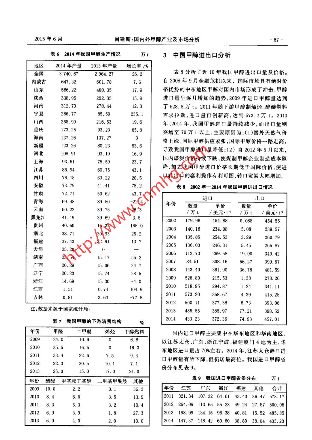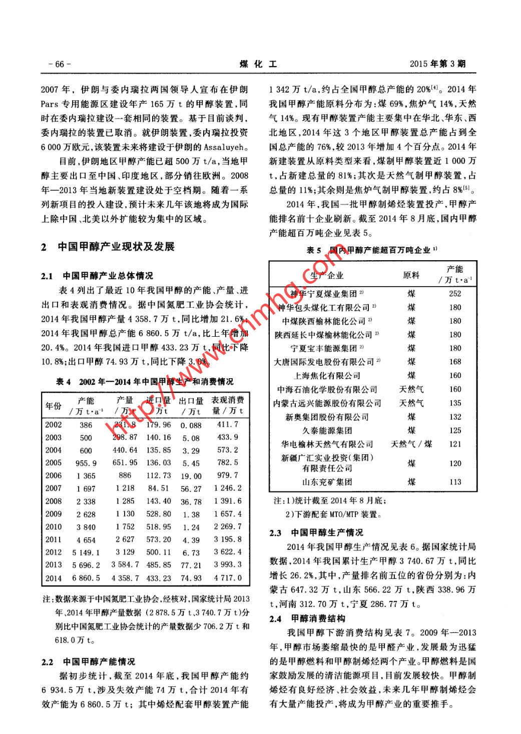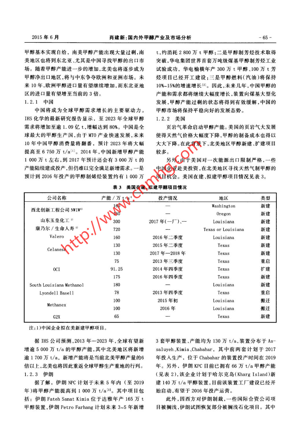 .第43卷第3期煤化工Vol.43 No.32015年6月Coal Chemical IndustryJun. 2015國內(nèi)外甲醇產(chǎn)業(yè)及市場分析肖建新(福州耀隆化工集團(tuán)公司,福建福州350014).摘要分析了世界甲醇市場格局,并對(duì)世界主要大型甲醇裝置、新增甲醇產(chǎn)能情況進(jìn)行了介紹。著重介紹了中國甲醇產(chǎn)業(yè)的現(xiàn)狀,分析了我國甲醇的生產(chǎn)、消費(fèi)、大型裝置、進(jìn)出口情況等。最后對(duì)影響國內(nèi)外甲醇產(chǎn)業(yè)及市場的因素進(jìn)行了分析。關(guān)鍵詞甲醇,市場, 發(fā)展?jié)摿?生產(chǎn),消費(fèi),進(jìn)出口文章編號(hào): 1005- 9598 (2015) -03-0063-07中 圖分類號(hào):TQ223.12°1文獻(xiàn)標(biāo)識(shí)碼:A1世界甲 醇市場情況能12070萬t/a,生產(chǎn)能力主要集中在中國、中東、南美和東歐部分地區(qū),其中中國約4 900萬t/a、中東1.1世界甲醇的生產(chǎn) 、消費(fèi)、進(jìn)出口1 610萬t/a、美洲1 360萬t/a,這3個(gè)區(qū)域產(chǎn)能占甲醇是全球流通的大宗產(chǎn)品,中國、歐洲、北美作全球甲醇產(chǎn)能的2/3以上。除中國是集生產(chǎn)和需求于為甲醇的最主要需求地區(qū),其貿(mào)易量約占全球甲醇貿(mào)一體,其余兩個(gè)地區(qū)均以出口為主,本地消化甲醇極易的3/4。目前甲醇行業(yè)的全球主要貿(mào)易流向是南美少。2013年國際甲醇供需情況見表1。全球(除中國大產(chǎn)品流向北美市場,對(duì)其他區(qū)域的影響力相對(duì)較弱;陸外)主要大型甲醇生產(chǎn)裝置及產(chǎn)能情況見表2。中東產(chǎn)品流向歐洲和東北亞,兼顧東西市場,是全球1.2 世界甲醇主要新增產(chǎn)能甲醇市場的主要供應(yīng)商;另外還有部分東北亞的甲醇未來新增甲醇產(chǎn)能主要集中在中國、南北美、伊來自東南亞市場,但數(shù)量不大。中東、南美為主要出口朗。中國由于MTO/MTP項(xiàng)目大量投產(chǎn),甲醇供大于求地區(qū),東亞、西歐、北美為主要進(jìn)口地區(qū)。的市場情況將發(fā)生改變;加上中國國內(nèi)天然氣價(jià)格上據(jù)安迅思(ICIS)統(tǒng)計(jì),2013年,全球甲醇有效產(chǎn)漲,致使天然氣制甲醇裝置大面積停產(chǎn),和國內(nèi)對(duì)于表12013 年國際甲醇供需情況有效產(chǎn)能/萬t.al產(chǎn)量/萬t需求量/萬t進(jìn)口量/萬t 出口量/ 萬t凈進(jìn)口量/ 萬t全球12 0707 6757 6762703.2 7033302352220-215歐洲8006401010.560190370美洲1 3601 08087059000-210中東1 330581100.-1032亞洲7 9704 390(+1 180) 5 478(+1 328)1480.3921088.印度603(1401300110東北亞地區(qū)7 3303 890(+1 090)50781 1901 188東南亞地區(qū)580470( +90 )260160注:數(shù)據(jù)來源安迅思中國,括號(hào)內(nèi)數(shù)據(jù)為相對(duì)上年變化量。收稿日期:2015-04-10作者簡介:肖建新( 1964- ),男,福建福州,高級(jí)工程師,學(xué)士, 1987年本科畢業(yè)于華僑大學(xué)機(jī)械制造專業(yè),現(xiàn)主要從事煤化工等行業(yè)產(chǎn)品的生產(chǎn)、經(jīng)銷及研發(fā)工作,E mail: 13905929787@139. com..-64-煤化工2015年第3期表2全球( 中國大陸除外)主要甲醇生產(chǎn)裝置及產(chǎn)能統(tǒng)計(jì)”產(chǎn)能公司名稱/地點(diǎn)備注/萬t.al新西蘭(Wai tara Valley和Motunui)2432014年產(chǎn)量219.6萬t特立尼達(dá)和多巴哥(Atlas )3112. 52014年產(chǎn)量90.7萬t特立尼達(dá)和多巴哥( Titan)87.52014年產(chǎn)量66.4萬t埃及》532014年產(chǎn)量41.6萬tMe thanex2)加拿大(Medicine Hat )562014年產(chǎn)量50.5萬t智利1和IV1802014年產(chǎn)量16.5萬t智利兩座工廠搬遷過來,Gei smar100美國路易斯安那州( Geismar 1和Geismar 2)1預(yù)計(jì)2015年初投產(chǎn),Geismar 2預(yù)計(jì)2016年投產(chǎn)合計(jì)9422014年產(chǎn)量485. 3萬t75SABIC與三菱瓦斯公司各投Saudi Methanol Company (A1- Jubail)85資50%的合資公司)0SABIC170(沙特阿拉伯)由巴林王國政府、SABIC和科Gulf Petrochemical Industries Company(巴林)威特PIC共同擁有Nat ional Methanol Company ( Ibn Sina)(Al- Jubail)105SABIC和CTE各50%所有權(quán)6452013年產(chǎn)量約480萬t165Zagros Petrochemical Co. (ZPC )Zagros Petrochemical Co. (ZPC)NPC(伊朗)Fanavaran Petrochemical Co. (FPC )harg Petrochemical Co. (KPC)66Shiraz Petrochemical Co..8.4_604. 44 Methanol Holdings Trinidad Ltd. - (MHTL)(特立尼達(dá)和多巴哥)1895 Petronas Methanol Labuan Sdn Bhd - (PML) (馬來西亞)Salalah Methanol Co. (阿曼)0man Methanol Co. LLC( 0MC)(阿曼)Atlantic Methanol Production Co. - (Ampco) (赤道幾內(nèi)亞)Metafrax(俄羅斯)0Togliatti Azot (Toaz)(俄羅 斯)1International Methanol Co. - (IMC) (沙特阿拉伯)由沙特阿拉伯Sipchem投資65%,日本JAMC投資35%2Qatar Fuel Additives Co. Ltd. - (Qafac) (卡塔爾)99注:1)數(shù)據(jù)主要來源于各公司官方網(wǎng)站;2)考慮天然氣供應(yīng)情況,有效產(chǎn)能約600萬t/a;3)Methanex占股63. 1%, 裝置總產(chǎn)能180萬t/a;4)Methanex占股50% ,裝置總產(chǎn)能130萬t/a。環(huán)境問題的重視,長遠(yuǎn)來看,相對(duì)便宜的國際甲醇價(jià)機(jī)構(gòu)預(yù)測(cè),至2016年北美新增甲醇產(chǎn)能約560萬格將帶動(dòng)中國甲醇進(jìn)口量上升。南北美方面,據(jù)相關(guān)t/a,非洲和南美將新增300萬t/a,2016年以后北美.2015年6月肖建新:國內(nèi)外甲醇產(chǎn)業(yè)及市場分析.65-甲醇基本實(shí)現(xiàn)自給,南美甲醇產(chǎn)能出現(xiàn)大量過剩,南t,約消耗2 800萬t甲醇;二是甲醇制芳烴技術(shù)取得美地區(qū)也將到東北亞、尤其是中國尋找甲醇的出口市突破.華電集團(tuán)世界首套