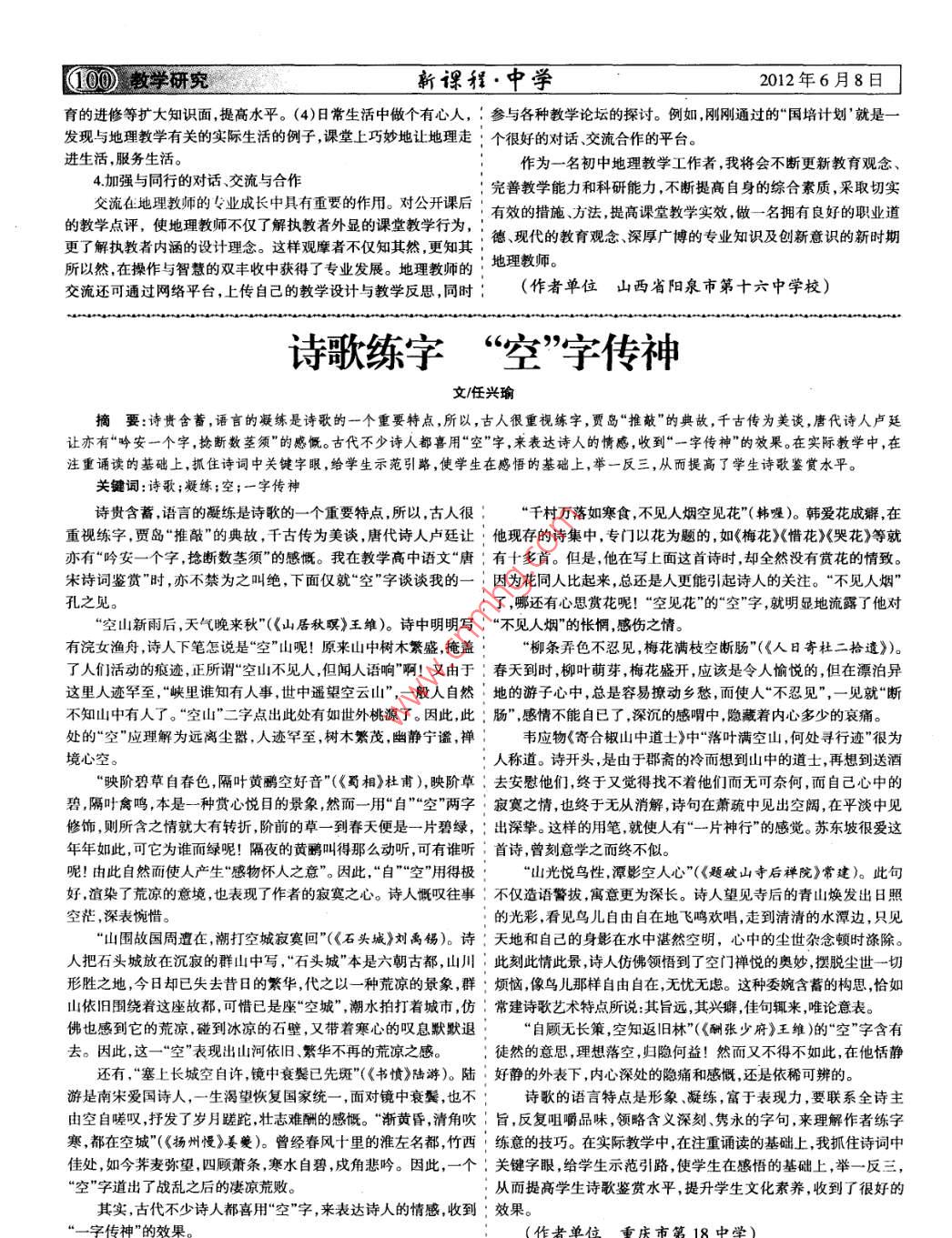 ⑩00教學(xué)研究新課:中學(xué)2012年6月8日育的進(jìn)修等擴(kuò)大知識面提高水平。(4)日常生活中做個有心人,參與各種教學(xué)論壇的探討。例如,剛剛通過的“國培計劃就是發(fā)現(xiàn)與地理教學(xué)有關(guān)的實(shí)際生活的例子,課堂上巧妙地讓地理走:個很好的對話、交流合作的平臺。進(jìn)生活,服務(wù)生活。作為一名初中地理教學(xué)工作者,我將會不斷更新教育觀念、4加強(qiáng)與同行的對話、交流與合作完善教學(xué)能力和科研能力,不斷提高自身的綜合素質(zhì),采取切實(shí)交流在地理教師的專業(yè)成長中具有重要的作用。對公開課后有效的措施、方法,提高課堂教學(xué)實(shí)效,做一名擁有良好的職業(yè)道更了解執(zhí)教者內(nèi)涵的設(shè)計理念。這樣觀摩者不僅知其然更知其:德現(xiàn)代的教育觀念深厚廣博的專業(yè)知識及創(chuàng)新意識的新時期所以然,在操作與智慧的雙豐收中獲得了專業(yè)發(fā)展。地理教師的:地理教師。交流還可通過網(wǎng)絡(luò)平臺,上傳自己的教學(xué)設(shè)計與教學(xué)反思,同時(作者單位山西省陽泉市第十六中學(xué)校)詩歌練字“空”字傳神文/任興瑜摘要:詩貴含蓄,語言的凝練是詩歌的一個重要特點(diǎn),所以,古人很重視練字,賈島“推敲”的典故,千古傳為美談,唐代詩人盧廷讓亦有“吟安一個字,捻斷數(shù)莖須”的感慨。古代不少詩人都喜用“空”字,來表達(dá)詩人的情感,收到“一字傳神”的效果。在實(shí)際教學(xué)中,在注重誦讀的基礎(chǔ)上,抓住詩詞中關(guān)鍵字眼,給學(xué)生示范引路,使學(xué)生在感悟的基礎(chǔ)上,舉一反三,從而提高了學(xué)生詩歌鑒賞水平。關(guān)鍵詞:詩歌;凝練;空;一字傳神詩貴含蓄,語言的凝練是詩歌的一個重要特點(diǎn),所以,古人很:“千村萬落如寒食,不見人煙空見花”(韓喔)。韓愛花成癖,在重視練字,賈島“推敲”的典故,千古傳為美談,唐代詩人盧廷讓·他現(xiàn)存的詩集中,專門以花為題的,如《梅花》《惜花》《哭花》等就亦有“吟安一個字,捻斷數(shù)莖須”的感慨。我在教學(xué)高中語文“唐有十多首。但是,他在寫上面這首詩時,卻全然沒有賞花的情致。宋詩詞鑒賞”時,亦不禁為之叫絕,下面僅就“空”字談?wù)勎业囊弧ひ驗(yàn)榛ㄍ吮绕饋?總還是人更能引起詩人的關(guān)注?!安灰娙藷熆字娏?哪還有心思賞花呢!“空見花”的“空”字,就明顯地流露了他對“空山新雨后,天氣晚來秋(《山居秋暝》王維)。詩中明明寫:“不見人煙”的悵惘,感傷之情。有浣女漁舟,詩人下筆怎說是“空”山呢!原來山中樹木繁盛掩蓋柳條弄色不忍見,梅花滿枝空斷腸"(《人日寄杜二拾遣》)了人們活動的痕跡,正所謂“空山不見人,但聞人語響”啊!又由于:春天到時柳葉萌芽,梅花盛開,應(yīng)該是令人愉悅的,但在漂泊異這里人跡罕至,“峽里誰知有人事,世中遙望空云山”,一般人自然·地的游子心中,總是容易撩動鄉(xiāng)愁,而使人“不忍見”,一見就“斷不知中有人了。“空山”二字點(diǎn)出此處有如世外桃源了。因此,此,腸”,感情不能自已了,深沉的感喟中隱藏著內(nèi)心多少的哀痛。處的“空”應(yīng)理解為遠(yuǎn)離塵器,人跡罕至,樹木繁茂幽靜寧謐禪韋應(yīng)物《寄合椒山中道士》中落葉滿空山,何處尋行跡”很為境心空人稱道。詩開頭,是由于郡齋的冷而想到山中的道士,再想到送酒“映階碧草自春色,隔葉黃鸝空好音”(《蜀相》杜甫),映階草:去安慰他們,終于又覺得找不著他們而無可奈何,而自己心中的碧隔葉禽鳴,本是一種賞心悅目的景象,然而一用“自”“空”兩字·寂寞之情,也終于無從消解,詩句在蕭疏中見出空闊,在平淡中見修飾,則所含之情就大有轉(zhuǎn)折,階前的草一到春天便是一片碧綠,出深摯。這樣的用筆就使人有“一片神行”的感覺。蘇東坡很愛這年年如此,可它為誰而綠呢!隔夜的黃鸝叫得那么動聽,可有誰聽:首詩曾刻意學(xué)之而終不似。呢!由此自然而使人產(chǎn)生“感物懷人之意”。因此,“自”“空”用得極光悅鳥性,潭影空人心”(《題破山寺后禪院》常建)。此句好,渲染了荒涼的意境,也表現(xiàn)了作者的寂寞之心。詩人慨嘆往事:不僅造語警拔,寓意更為深長。詩人望見寺后的青山煥發(fā)出日照空茫,深表惋惜。的光彩,看見鳥兒自由自在地飛鳴歡唱,走到清清的水潭邊,只見“山圍故國周遭在,潮打空城寂寞回”(《石頭城》劉禹錫)。詩天地和自己的身影在水中湛然空明,心中的塵世雜念頓時滌除人把石頭城放在沉寂的群山中寫,“石頭城”本是六朝古都,山川·此刻此情此景,詩人仿佛領(lǐng)悟到了空門禪悅的奧妙,擺脫塵世一切形勝之地,今日卻已失去昔日的繁華代之以一種荒涼的景象,群:煩惱像鳥兒那樣自由自在,無憂無慮。這種委婉含蓄的構(gòu)思,恰如山依舊圍繞著這座故都,可惜已是座“空城”,潮水拍打著城市,仿:常建詩歌藝術(shù)特點(diǎn)所說:其旨遠(yuǎn),其興癖,佳句輒來唯論意表。佛也感到它的荒涼,碰到冰涼的石壁,又帶著寒心的嘆息默默退“自顧無長策,空知返舊林”(《酬張少府》王維)的“空”字含有去。因此,這一“空”表現(xiàn)出山河依舊、繁華不再的荒涼之感。徒然的意思,理想落空,歸隱何益!然而又不得不如此,在他恬靜還有,“塞上長城空自許,鏡中衰鬢已先斑