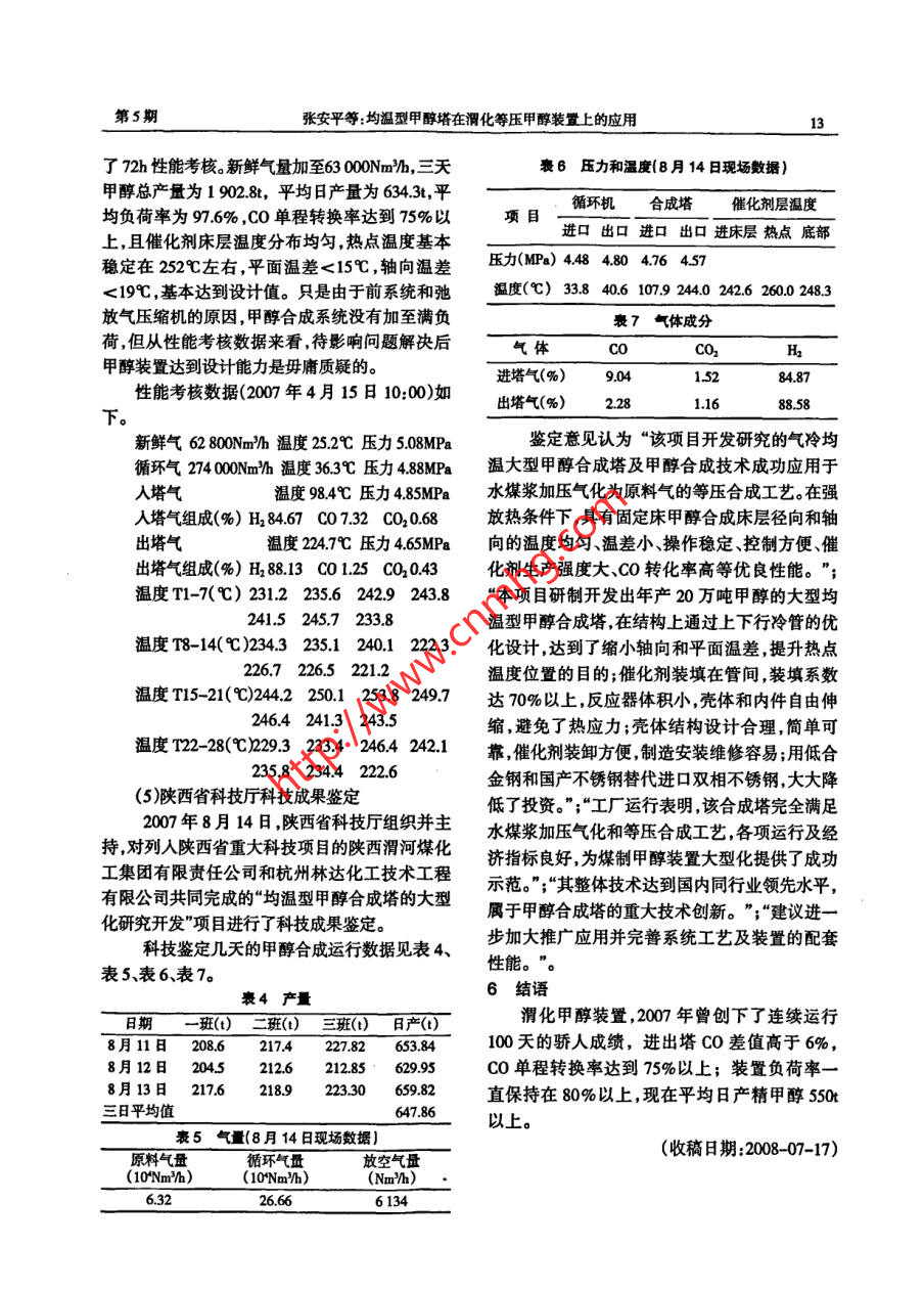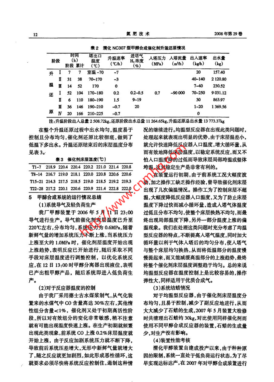 第5期張安平等:均溫型甲醇塔在渭化等壓甲醇裝量上的應(yīng)用11(E2701 )管程,與換熱器殼程的人塔氣體換熱,后又進(jìn)入水冷器(E2702A/B )進(jìn)-步冷卻,溫度降到昌40它以下,然后進(jìn)入甲醇分離器(V2702)進(jìn)行氣液分離。分離出的液體粗甲醇經(jīng)減壓閃蒸除去溶解在其中的大部分氣體后送往粗甲醇貯槽(V2712A/B)。從分離器上部出來的氣體作為循環(huán)氣大部分返回循環(huán)氣壓縮機(jī)(C2701 ),經(jīng)加壓后循環(huán)使用。另有一小部分氣體作為弛放氣,先通過弛放氣洗滌塔(T2701 )用密封水洗滌吸收其中的甲醇自蒸氣,后經(jīng)C2702(弛放氣壓縮機(jī))加壓后送往老廠變換回收。工藝流程方塊圖見圖1。V27017新鮮氣- +脫硫劑罐E270127- -R27011循環(huán)氣壓縮機(jī)中間換熱器甲醇合成塔弛放氣心E2703C V2702. [E202 一級廢鍋溶解氣甲分離路水冷器]E2704V2703 J二級廢鍋圖2甲醇合成塔結(jié)構(gòu)簡圍閃蒸罐V2712測溫?zé)犭娕?,共設(shè)28個(gè)測溫點(diǎn),同平面4個(gè)測溫粗甲醇貯槽圄1甲醇合成工藝方框流程圖點(diǎn),按不同插人深度均勻分布于7個(gè)平面,從而有利于操作工更好的掌握催化劑層的反應(yīng)情況2甲醇合成系統(tǒng)主要設(shè)備(見表1)表1甲醇合成系統(tǒng)主要設(shè)備和溫度分布,以便進(jìn)行相關(guān)操作。渭化中3 000低壓均溫型合成塔是杭州林達(dá)號設(shè)備名稱規(guī)格型號數(shù)量(臺(tái))1甲醇合成塔中3000x14000公司由φ2 000型合成塔直接放大為φ3 000型的,雖然理論上工業(yè)裝置的放大存在- -定的風(fēng)2開工加熱器φ1 200x28x5 6433 - -級廢鍋中11488/中2 400x44/25x 103991險(xiǎn),但經(jīng)過在我廠甲醇裝置上近兩年的應(yīng)用表明4二級廢鍋 φ11488/中2400x44/25x11399 1這次放大改進(jìn)是成功的。5中間換熱器φ1 600x 40x 160084催化劑的升溫還原情況水冷器φ1 600x56x 13 653 .催化劑升溫還原使用的還原氣是我公司合7甲醇分離器中2 400x 12x6520成氨裝置液氮洗分子篩后的凈化氣,壓力為φ2 400x 16x73165.2MPa,其組成(體積分?jǐn)?shù))為:C0:2.6%、H2:循環(huán)機(jī)4V-1S .96.5%。系統(tǒng)采用氮?dú)庋h(huán),催化劑還原壓力根據(jù)3中3 000均溫型甲醇合成塔循環(huán)機(jī)的最大打氣量控制在0.7 ~ 0.8MPao合成裝置的關(guān)鍵設(shè)備合成塔結(jié)構(gòu)簡圖如圖22006年5月5日13時(shí)合成系統(tǒng)開始升溫,升所示。進(jìn)塔氣由上部進(jìn)入合成塔,經(jīng)多根引氣管溫過程共52h,出物理水2 508.72kgo然后開始加進(jìn)入上集氣環(huán),再均勻分布到多排下行管與催化氫還原,至還原結(jié)束,共94.5h,還原階段累計(jì)出水劑層換熱,后又并人下集氣環(huán),均勻分布到多排11 264.65kgo初次加氫人塔氣氫濃度為0.52% ,還上行管與催化劑層再次換熱,達(dá)到反應(yīng)溫度后出原結(jié)束前,,小時(shí)出水量小于8kg達(dá)7h,還原結(jié)束時(shí)上行管進(jìn)入催化劑層進(jìn)行合成反應(yīng)并與管內(nèi)冷合成塔進(jìn)出口氫濃度分別為:21.22%和21%。氣換熱,反應(yīng)氣由下部出塔。合成塔內(nèi)裝有4根升溫還原情況見表2。12氮肥技術(shù)2008年第29卷表2渭化 NC307型甲醇合成催化劑升溫還原情況時(shí)間塔出口升溫速率進(jìn)塔氣入塔壓力人塔流量出入速率出水量階段(h)溫度( Ch)H,濃度(MPa) (m2/h)(kgh)(kg)階段累計(jì)(C)(%)升177窒溫-70~720157.4070~17040-140 2 120.80溫145217007-40230.52104 170-1800.2~0.5).7-900070-250 9 031.126 110 180-1901.59~1930863.9736 146 190-2101-201369.56原IV20166210-225~0.7注:升溫階段出入總量2 508.72kg,還原階段出水總盤11 264.65kg,升溫還原總出水量13 73.37kg在整個(gè)升溫還原過程中出水均勻,溫度易于況的繼續(xù)進(jìn)行。均溫型反應(yīng)器在出現(xiàn)此類問題時(shí),控制且分布均勻,催化劑還原比較徹底,做到了處理起來就表現(xiàn)出明顯的優(yōu)勢,由于床層溫差小,低溫下多出水。升溫還原結(jié)束后的床層溫度分布就允許快速降低反應(yīng)器人口溫度,增大循環(huán)量,從見表3。而有效地降低床層溫度,以穩(wěn)定系統(tǒng)反應(yīng),而又不表3催化劑床層溫度(C)怕入口溫度降的過低而導(dǎo)致床層局部垮溫或整體T1-7 218.9 220.4 220.4 220.2 221.0 221.4 220.8垮溫,這對穩(wěn)定生產(chǎn)是非常有利的。T8-14 216.7 219.0 218.1 220.0 220.8 220.6 220.6在裝置運(yùn)行初期,由于前系統(tǒng)工況大幅度波T15-21 214.3 217.5 218.5 219.0 218.5 219.2 2193動(dòng),加之操作工缺乏操作經(jīng)驗(yàn),曾導(dǎo)致催化劑床層T22- -28 217.2 220.1 220.6 220.9 221.4 222.8 222.0出現(xiàn)了幾次偏溫情況。操作工為了控制床層不超5甲醇合成系統(tǒng)的運(yùn)行情況總結(jié)溫,大幅度降低反應(yīng)器入口溫度,又為了防止床層(1)系統(tǒng)導(dǎo)氣及輕負(fù)荷生產(chǎn)溫度下降過快而減小循環(huán)量,造成入塔氣體溫度我廠甲醇裝置于2006年5月11日23:00過低且分布不均勻,使整個(gè)床層換熱不均勻,而最導(dǎo)氣進(jìn)行生產(chǎn)。導(dǎo)氣前催化劑床層溫度已升至終出現(xiàn)局部溫度下降,另外-部分溫度上漲的偏220C左右,分布均勻,系統(tǒng)壓力為0.6MPa,隨著溫現(xiàn)象。我們在處理這類問題時(shí)充分考慮了均溫新鮮氣量的增加系統(tǒng)壓力不斷上漲,當(dāng)系統(tǒng)壓力型反應(yīng)器的特點(diǎn),不斷提高人塔氣溫度,同時(shí)加大上漲至大約1.0MPa 時(shí),催化劑層溫度開始出現(xiàn)循環(huán)