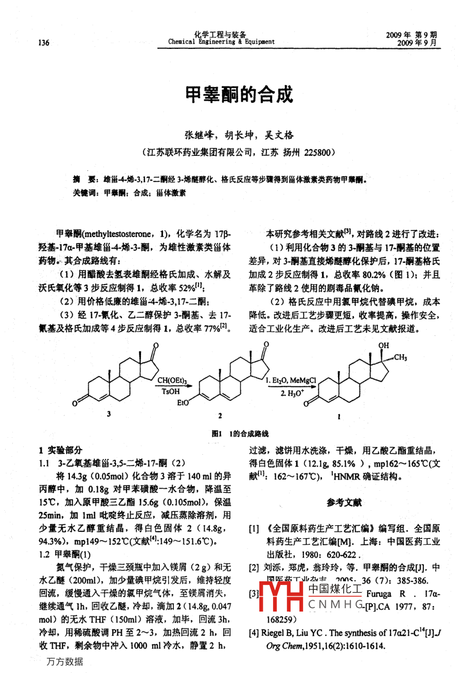 化學(xué)工程與裝備2009年第9期136Chemical Engineering & Equipment2009年9月甲睪酮的合成張繼峰,胡長坤,吳文格(江蘇聯(lián)環(huán)藥業(yè)集團有限公司,江蘇揚州225800)摘要: 雄甾4烯-3,17-二酮經(jīng)3-烯醚醇化、格氏反應(yīng)等步驟得到甾體澉素類藥物甲睪酮.關(guān)鍵詞:甲翠酮:合成:甾體激素甲舉酮(methyltestosterone, 1), 化學(xué)名為17B-本研究參考相關(guān)文獻),對路線2進行了改進:羥基-17a-甲基雄甾4-烯~3-酮,為雄性激素類甾體(1)利用化合物3的3-酮基與17-酮基的位置藥物。其合成路線有:差異,對3~酮基直接烯醚醇化保護后, 17-酮基格氏(1)用醋酸去氫表雄酮經(jīng)格氏加成、水解及加成2步反應(yīng)制得1,總收率80.2% (圖1);并且沃氏氧化等3步反應(yīng)制得1,總收率52%";革除了路線2使用的劇毒品氰化鈉。(2)用價格低廉的雄甾4~烯~3,17-二酮:(2)格氏反應(yīng)中用氯甲烷代替碘甲烷,成本(3)經(jīng)17-氰化、乙二醇保護3-酮基、去17-降低。改進后工藝步驟更短,收率提高,操作安全,氰基及格氏加成等4步反應(yīng)制得1,總收率77%2。適合工業(yè)化生產(chǎn)。改進后工藝未見文獻報道。.wCHCH(OE0)3.r1. Et2O, MeMgClTSOH2. H30+EtO21圖1 1的合成路線1實驗部分.過濾,濾餅用水洗滌,干燥,用乙酸乙酯重結(jié)晶,1.1 3-乙氧基雄留-3,5-二烯-17~酮 (2)得白色固體1 (12.1g 85.1% ) , mp162~165C(文將14.3g (0.05mol) 化合物3溶于140 ml的異獻": 162~167C), 'HNMR 確證結(jié)構(gòu)。丙醇中,加0.18g對甲苯磺酸一水合物,降溫至15C,加入原甲酸三乙酯15.6g (0.10Smol), 保溫參考文獻:25min,加1ml 吡啶終止反應(yīng),減壓蒸除溶劑,用少量無水乙醇重結(jié)晶,得白色固體2 ( 14.8g, .[1]《全國 原料藥生產(chǎn)工藝匯編》編寫組.全國原94.3%), mp149~ 152C(文獻[):149~ 151.6C)。料藥生產(chǎn)工藝匯編[M].上海:中國醫(yī)藥工業(yè)1.2甲睪酮(1)出版社,1980: 620-622 .氮氣保護,干燥三頸瓶中加入鎂屑(2g)和無[2]劉濼,鄭虎,翁玲玲,等.甲睪酮的合成[].中水乙醚(200ml),加少量碘甲烷引發(fā)后,維持輕度國軍藥T業(yè)九吉2m5. _36 (7): 385-386.回流,緩慢通入干燥的氯甲烷氣體,至鎂屑消失,中國煤化工Furuga R . 17a-繼續(xù)通氣1h,回收乙醚,冷卻,滴加2 (14.8g, 0.047TYHC NM H G_[P1.CA 1977, 87:mol) 的無水THF (150ml)溶液,加畢,回流3h,168259)冷卻,用稀硫酸調(diào)PH至2~3,加熱回流2 h,回[4] Riegel B, Liu YC . The synthesis of 17a21-Cl'[J]J收THF,剩余物中沖入1000 ml冷水,靜置2 h,Org Chem,1951,16(2):1610-1614.