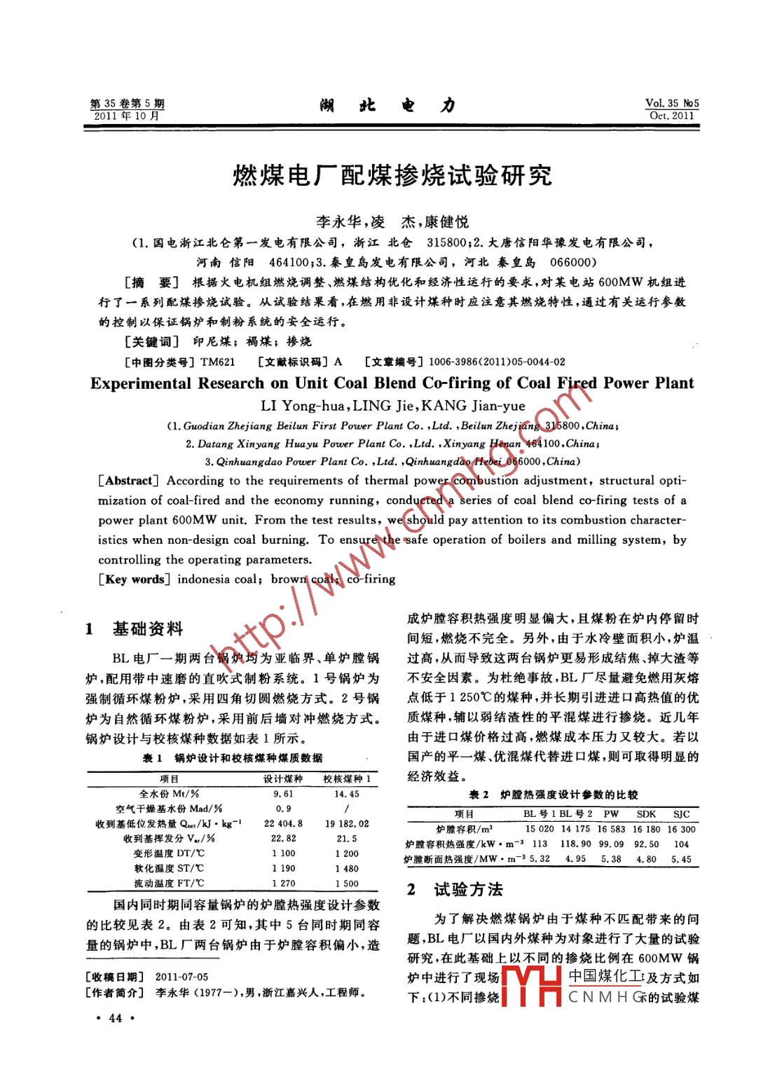 第35卷第5期湖北電力Vol.35 No52011年10月Oct. 2011燃煤電廠配煤摻燒試驗(yàn)研究李永華,凌杰,康健悅(1.國電浙江北侖第一發(fā)電有限公司,浙江北倉315800;2. 大唐信陽華豫發(fā)電有限公司,河南信陽464100;3. 秦皇島發(fā)電有限公司,河北秦皇島066000)[摘要]根據(jù)火電機(jī)組燃燒調(diào)整、燃煤結(jié)構(gòu)優(yōu)化和經(jīng)濟(jì)性運(yùn)行的要求,對(duì)某電站600MW機(jī)組進(jìn)行了一系列配煤摻燒試驗(yàn)。從試驗(yàn)結(jié)果看,在燃用非設(shè)計(jì)煤種時(shí)應(yīng)注意其燃燒特性,通過有關(guān)運(yùn)行參數(shù)的控制以保證鍋爐和制粉系統(tǒng)的安全運(yùn)行。[關(guān)鍵詞]印尼煤; 褐煤;摻燒[中團(tuán)分類號(hào)] TM621[文獻(xiàn)標(biāo)識(shí)碼] A [文章編 號(hào)] 1006-3986<2011)05-0044-02Experimental Research on Unit Coal Blend Co-firing of Coal Fired Power PlantLI Yong- hua,LING Jie, KANG Jian-yue .(1. Grodian Zhejiang Beilun First Power Plant Co. ,Lid. ,Beilun Zhejiang 315800 ,China;2. Datang Xinyang Huayu Power Plant Co. ,Ltd. ,Xinyang Henan 464100 ,China;3. Qinhuangdao Power Plant Co. ,Ltd. ,Qinhuangdao Hebei 066000 ,China)[Abstract] According to the requirements of thermal power combustion adjustment, structural opti-mization of coal-fired and the economy running, conducted a series of coal blend co-firing tests of apower plant 600MW unit. From the test results, we should pay attention to its combustion character-istics when non-design coal burning. To ensure the safe operation of boilers and milling system, bycontrolling the operating parameters.[Key words] indonesia coal; brown coal; co-firing成爐膛容積熱強(qiáng)度明顯偏大,且煤粉在爐內(nèi)停留時(shí)1基礎(chǔ)資料間短,燃燒不完全。另外,由于水冷壁面積小,爐溫BL電廠一期兩臺(tái)鍋爐均為亞臨界、單爐膛鍋過高,從而導(dǎo)致這兩臺(tái)鍋爐更易形成結(jié)焦、掉大渣等爐,配用帶中速磨的直吹式制粉系統(tǒng)。1號(hào)鍋爐為不安全因素。為杜絕事故,BL廠盡量避免燃用灰熔強(qiáng)制循環(huán)煤粉爐,采用四角切圓燃燒方式。2號(hào)鍋點(diǎn)低于1250C的煤種,并長期引進(jìn)進(jìn)口高熱值的優(yōu)爐為自然循環(huán)煤粉爐,采用前后墻對(duì)沖燃燒方式。質(zhì)煤種,輔以弱結(jié)渣性的平混煤進(jìn)行摻燒。近幾年鍋爐設(shè)計(jì)與校核煤種數(shù)據(jù)如表1所示。由于進(jìn)口煤價(jià)格過高,燃煤成本壓力又較大。若以表1鍋爐設(shè)計(jì)和校核煤種 煤質(zhì)數(shù)據(jù)國產(chǎn)的平一煤、優(yōu)混煤代替進(jìn)口煤,則可取得明顯的項(xiàng)目設(shè)計(jì)煤種校核煤種1經(jīng)濟(jì)效益。全水份Mt/%.6114. 45表2爐膛熱強(qiáng)度設(shè)計(jì)參數(shù)的比較空氣干燥基水份Mad/%0.9BL號(hào)1BL號(hào)2 PW SDK SJC收到基低位發(fā)熱量Qn/kJ.kg-' 22 404.8 19 182. 02爐膛容積/m315020 14 175 16 58316 180 16 300收到基揮發(fā)分V.e/%22. 8221.5爐膛容積熱強(qiáng)度/kW.m-3 113 118.90 99.09 92.50 104變形溫度DT/C1 1001 20爐膛斷面熱強(qiáng)度/MW.m-85.32 4.95 5.38 4.80 5. 45軟化溫度ST/C1 1901480流動(dòng)溫度FT/C1 2701 5002試驗(yàn)方法.國內(nèi)同時(shí)期同容量鍋爐的爐膛熱強(qiáng)度設(shè)計(jì)參數(shù)為了解決燃煤鍋爐由于煤種不匹配帶來的問的比較見表2。由表2可知,其中5臺(tái)同時(shí)期同容量的鍋爐中,BL廠兩臺(tái)鍋爐由于爐膛容積偏小,造題,BL電廠以國內(nèi)外煤種為對(duì)象進(jìn)行了大量的試驗(yàn)研究,在此基礎(chǔ)上以不同的摻燒比例在600MW鍋[收稿日期] 2011-07-05爐中進(jìn)行了現(xiàn)場中國煤化工及方式如[作者簡介]李永華 (1977-),男,浙江嘉興人,工程師。下:(1)不同摻燒|YHCNMHG的試驗(yàn)煤●44●第35卷第5期Vol. 35 No5湖北電力2011年10月Oct. 2011種,進(jìn)行不同摻燒比例的調(diào)整試驗(yàn)。(2)磨煤機(jī)運(yùn)行但褐煤的全水分在26%左右。在進(jìn)行褐煤單燒時(shí),組合調(diào)整。根據(jù)試驗(yàn)時(shí)磨煤機(jī)的運(yùn)行和檢修等情煤量最大僅能維持在30~40 t/h左右,分離器出口況,進(jìn)行不同磨煤機(jī)運(yùn)行組合的調(diào)整試驗(yàn),特別進(jìn)行溫度控制在65C ,嚴(yán)重限制了磨煤機(jī)出力。若按照與平六進(jìn)行1 : 1的混配,磨煤機(jī)出力最大在42~下層磨投運(yùn)及上層磨投運(yùn)的試驗(yàn)。45t/h左右,分離器出口溫度控制在70C.因此,3試驗(yàn)過程在試燒時(shí)需要注意混煤的水分,保證磨煤機(jī)出力。由于褐煤發(fā)熱量較低,在14 MJ/kg左右,在同3.1印尼煤摻燒印尼煤炭通常具有高水分、低灰分、低硫分、高等負(fù)荷下,單燒一臺(tái)褐煤,總煤量相對(duì)增加較大,五揮發(fā)分等特性。本次試驗(yàn)中使用印尼煤的發(fā)貨港化磨運(yùn)行下最高負(fù)荷為540 MW,單燒兩臺(tái)褐煤,五磨運(yùn)行下最高負(fù)荷為480 MW左右.驗(yàn)數(shù)據(jù)如表3所示。表3試驗(yàn)煤種的工業(yè)分析數(shù)據(jù)由于褐煤是易結(jié)渣的煤,但是依據(jù)現(xiàn)場實(shí)際情ViAar FCar Qnet,ar Sar T1況來看,爐膛水冷壁及大屏結(jié)渣變化趨勢(shì)不明顯。Mat/% 1% 1% 1%/MJ.kg-1/% /C主要原因是低負(fù)荷時(shí)間較長,由于各臺(tái)磨出力的限印尼煤14.938.34.6842.1224.10.721130制,低負(fù)荷時(shí)磨煤機(jī)運(yùn)行臺(tái)數(shù)增多,燃燒器熱負(fù)荷較通過實(shí)驗(yàn)室研究,推薦的印尼煤與平混煤的摻分散,故未出現(xiàn)結(jié)焦加劇情況。不