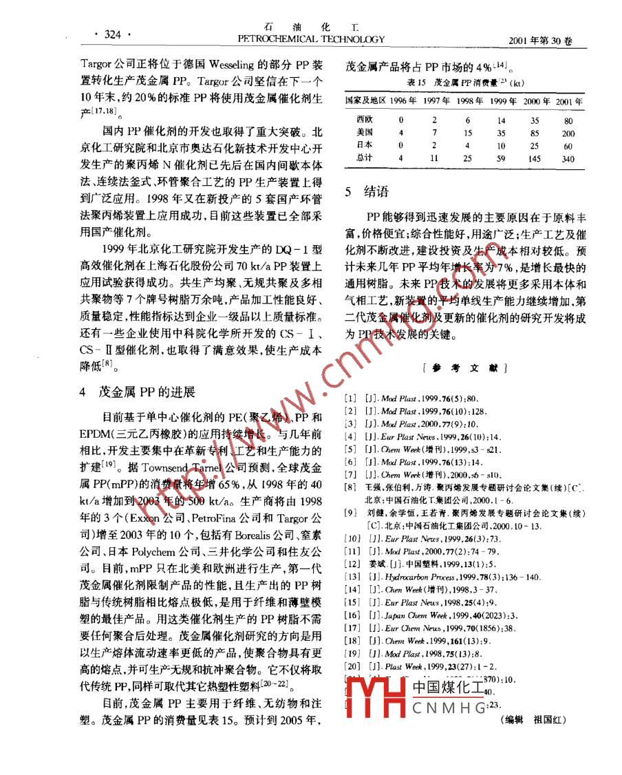 石油化工2001年第30卷第4期PETROCHEMICAL TECHNOLOGY319聚丙烯發(fā)展近況楊維紅(北京化工研究院,北京100013)YANG Wei-hongBeijing Research Institute of Chemical Industry Beijing 100013. China)[關(guān)鍵詞]聚丙烯;工藝技術(shù);催化劑茂金屬;進(jìn)展[Keywords]polypropylene; technological process; catalyst; metallocene; progress文章編號(hào)]1000-8144(2001)04-0319-06[中圖分類(lèi)號(hào)]TQ325.14[文獻(xiàn)標(biāo)識(shí)碼jA聚丙烯(PP)是目前需求增長(zhǎng)最快的聚合物之長(zhǎng)率為9.5%;以下依次為東歐86%;南美7.3%;一,1999年中至2000年中,全世界PP生產(chǎn)能力增北美62%;西歐5.1%;日本4.2%。長(zhǎng)10%,由31Mta增至34Ma-3。1999年底全世界PP消耗量約為24.7Mta。據(jù) T1PP市場(chǎng)概況Tarnell公司預(yù)測(cè){4,1998-2003年間全球PP消耗11生產(chǎn)能力將年增73%,增加共計(jì)10.3Mt/a。中東和非洲需994年底~1999年中,全世界PP生產(chǎn)能力增求增長(zhǎng)最快,由于紡織和薄膜業(yè)需求旺盛,該地區(qū)長(zhǎng)52%,到2003年底,還將增長(zhǎng)34%,使全球PP生PP年增長(zhǎng)率將達(dá)到13.2%;其次是亞太地區(qū),年增產(chǎn)能力達(dá)到41.5Mt/a,詳見(jiàn)表1。表1全世界PP生產(chǎn)能力及其分布1994年底999年中2003年底1994年底~1999年中1999年中-2003年底國(guó)家及地區(qū)生產(chǎn)能所占比生產(chǎn)能所占比生產(chǎn)能所占比增長(zhǎng)量增長(zhǎng)率增長(zhǎng)量增長(zhǎng)率力/Mt例/%力Mt例/%力Mt例/%M西歐259.15H本其它亞/太地區(qū)l1.5528中東非洲3,4中南美中東歐051.854.51516.5美國(guó)和加拿大(墨西哥包括在中南美)。1995年,主要生產(chǎn)商在西歐或北美的最佳PP表9。生產(chǎn)能力為1Mt/ao而今天,擴(kuò)建和合并導(dǎo)致了地997年~1999年我國(guó)新建投產(chǎn)了10套連續(xù)法區(qū)生產(chǎn)能力翻番S。最近Shel公司與德國(guó)BASF表21999年底全球5大PP生產(chǎn)商的生產(chǎn)能力公司簽署了協(xié)議,合并其分別擁有的3家石化公司生產(chǎn)能力公司名稱生產(chǎn)能力Elena、 Montell和 Targor,成立世界上最大的聚烯烴企業(yè)之一。Shd公司與BAF公司各擁有0%Mxd中國(guó)煤化工1270的股權(quán),總部將設(shè)在荷蘭該公司將成為世界第一大TotalLCNMHPP生產(chǎn)商,在西歐的生產(chǎn)能力接近3Ma,占該地區(qū)生產(chǎn)能力的30%。表2為1999年底全球5大PP生產(chǎn)商的生產(chǎn)能力6。[收稿日期]2000-06-02。[作者簡(jiǎn)介]楊維紅(1967-),女,北京市人,大學(xué),工程師。電話2000年中世界各地區(qū)PP生產(chǎn)能力見(jiàn)表3010-64216131-2535。320PETROCHEMICAL TECHNOLOGY2001年第30卷表3西歐PP生產(chǎn)能力表9日本PP生產(chǎn)能力公司名稱生產(chǎn)能力公司名稱生產(chǎn)能力生產(chǎn)能力公司名稱公名稱生產(chǎn)能力420 DSM素石油化學(xué)公司346 Montell SDK SunriseAppryl10Exxon.Mobil730件友化學(xué)公司Beaulieu( Polychim)出光德山曹達(dá)borealis1 390 Repsol-YPE日本Poyc3017215 Targor( BASF)巴陵石化公司、福建煉化公司、九江石化總廠、武漢石化廠、濟(jì)南煉油廠、荊門(mén)石化總廠、大連石化公司表4中/東歐PP生產(chǎn)能力7等7套70kt/a國(guó)產(chǎn)化環(huán)管法T藝,大慶石化總廠1國(guó)家生產(chǎn)能力生產(chǎn)能力套100ka國(guó)產(chǎn)化環(huán)管法工藝,前郭煉油廠40kt/a國(guó)家國(guó)產(chǎn)化釜式法工藝,以及燕山石化公司引進(jìn)Amoo羅馬尼亞捷克共和國(guó)俄羅斯聯(lián)邦公司200kta氣相法工藝。部分原有裝置也進(jìn)行7了擴(kuò)能改造。至1999年底我國(guó)PP總生產(chǎn)能力約哈薩克斯坦烏克蘭3.1Mt,比1998年增長(zhǎng)18.39%。1999年產(chǎn)量達(dá)2646.6kt,比1998年增長(zhǎng)27.55%。表5北美P生產(chǎn)能力71國(guó)內(nèi)的PP裝置主要采用引進(jìn)和國(guó)產(chǎn)化釜式本公司名稱生產(chǎn)能力公司名稱生產(chǎn)能力體法及引進(jìn)和國(guó)產(chǎn)化環(huán)管法技術(shù)。引進(jìn)的環(huán)管技術(shù)Aristech640Huntsman主要是 Montel公司第一代 Spheripol技術(shù),國(guó)產(chǎn)化Atofina環(huán)管法也是第一代國(guó)產(chǎn)環(huán)管技術(shù)(以生產(chǎn)均聚物為BP-Amoco1475主)。大部分裝置規(guī)模較小,開(kāi)發(fā)生產(chǎn)的產(chǎn)品品種EpsilonPhillips住化少,難以面對(duì)國(guó)外進(jìn)口產(chǎn)品的沖擊,以及國(guó)內(nèi)陸續(xù)新Exxon Mobil1055u(+o370建的200kt/a裝置的競(jìng)爭(zhēng),所以各裝置通過(guò)挖潛改Formosa Plastics8445造提高產(chǎn)量、增加品種、降低成本的愿望越來(lái)越迫表6中南美P生產(chǎn)能力7切。有幾套裝置已經(jīng)采用國(guó)產(chǎn)化技術(shù)或引進(jìn)技術(shù)進(jìn)生產(chǎn)能力國(guó)生產(chǎn)能力行了改造89。目前我國(guó)連續(xù)法PP裝置的生產(chǎn)能阿根廷力及所用工藝見(jiàn)表10。委內(nèi)瑞拉1.2消費(fèi)結(jié)構(gòu)在PP應(yīng)用方面,主要包括包裝材料、纖維和汽表7中東/非洲PP生產(chǎn)能力車(chē)部件。薄膜級(jí)PP用于食品、香煙和電容器的包國(guó)家生產(chǎn)能力裝。PP板材用于熱成型的食品容器,可吹塑或注塑。共聚物PP用于汽車(chē)保險(xiǎn)杠的制造,同樣也用伊朗沙特阿拉伯以色列320于醫(yī)藥包裝。PP纖維用于地毯、服裝和非紡織物??仆囟湓跉W洲6.3Mt/a的PP消耗中,包裝應(yīng)用占主尼日利亞表8亞/太地區(qū)PP生產(chǎn)能力(不包括日本)205要份額。1998年,汽車(chē)市場(chǎng)對(duì)PP的