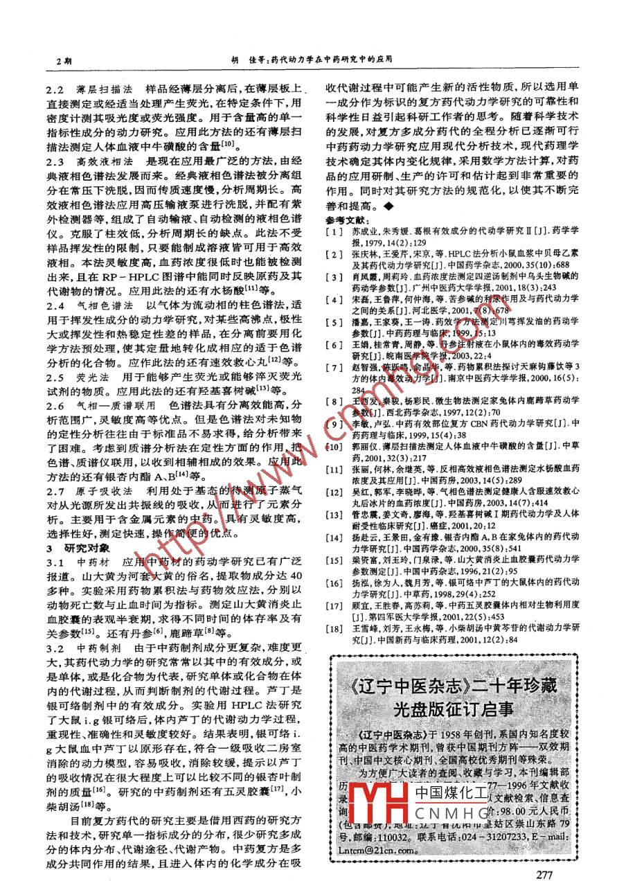 第7卷第3期江寧中醫(yī)學(xué)隗學(xué)報(bào)Vol 7 No 32005年5月JOURNAL OF LIAONING COLLEGE OF TCMMay,2005藥代動(dòng)力學(xué)在中藥研究中的應(yīng)用胡佳,張振秋,劉威(遼寧中醫(yī)學(xué)院藥學(xué)院,遼寧沈陽(yáng)110032)摘要:綜述藥代動(dòng)力學(xué)在中藥研究中的概況。選擇具有較大學(xué)術(shù)意義或?qū)嵱脙r(jià)值的內(nèi)容,按照其不同的研究方法和分析方法等加以介紹。血藥濃度法,藥理效應(yīng)法和高效液相色譜法的研究較多。中藥藥代動(dòng)力學(xué)研究應(yīng)用現(xiàn)代分析技術(shù),現(xiàn)代藥理技術(shù),確定其體內(nèi)變化規(guī)律,采用數(shù)學(xué)方法計(jì)算,對(duì)藥品的應(yīng)用研制、生產(chǎn)的許可和估計(jì)起到非常重要的作用。關(guān)鍵詞:藥代動(dòng)力學(xué);中藥;研究應(yīng)用中圖分類號(hào):R284.2文獻(xiàn)標(biāo)識(shí)碼:B文章編號(hào):1008-4231(2005)03-0276-02由于中藥成分復(fù)雜,干擾因素多,其藥代動(dòng)力學(xué)物,將藥代動(dòng)力學(xué)多點(diǎn)動(dòng)態(tài)測(cè)定的原理同動(dòng)物死亡研究不同于化學(xué)藥物,難度大,197年國(guó)內(nèi)第1篇率測(cè)定蓄積性的方法結(jié)合起來(lái)使某些給藥時(shí)間盡研究報(bào)告發(fā)表1。近年來(lái)經(jīng)不斷創(chuàng)新摸索,取得了量縮短,較準(zhǔn)確地觀察動(dòng)物體存率的變化情況,進(jìn)而一定成績(jī)特別是復(fù)方效應(yīng)成分動(dòng)力學(xué),血清藥理學(xué)估計(jì)藥代動(dòng)學(xué)的表觀參數(shù)。主要用于具有一定毒性的提出在很大程度上促進(jìn)了中藥藥代動(dòng)力學(xué)研究的的中藥的藥動(dòng)學(xué)研究。發(fā)展?,F(xiàn)對(duì)藥代動(dòng)力學(xué)的研究方法、分析方法的研實(shí)驗(yàn)測(cè)定丹參注射液的毒效藥動(dòng)力學(xué)參數(shù),探究進(jìn)展評(píng)述如下。討其體內(nèi)經(jīng)時(shí)過(guò)程。以小鼠死亡率為指標(biāo),于不同1研究方法時(shí)間先后2次給予丹參素36,85mg/kg,ip。測(cè)定首1.1血藥濃度法通過(guò)測(cè)定中藥中已知成分在體次給藥后不同時(shí)間藥物的體存量,進(jìn)行房室模型擬中的濃度,計(jì)算各中藥動(dòng)力學(xué)參數(shù),以其代表研究合并計(jì)算藥動(dòng)學(xué)參數(shù)。結(jié)果顯示,丹參注射液在小中藥在體內(nèi)的代謝過(guò)程。在貝母乙素的藥代動(dòng)力學(xué)鼠體內(nèi)呈一級(jí)動(dòng)力學(xué)消除,主要毒效動(dòng)力學(xué)參數(shù):研究中,取昆明種小鼠,貝母乙素溶于稀鹽酸后,再t1/2a=0.90h,t1/2B=2248h丹參注射液在小鼠體用稀堿溶液中和至中性,腹腔注射給小鼠(15mg/內(nèi)的毒效動(dòng)力學(xué)過(guò)程呈二室模型。用藥物累積法kg)后,不同時(shí)間點(diǎn)(5,10,20,30,60,120,240,480,探討成分復(fù)雜、有效成分尚不明確的中藥制劑在體720min)取血,肝素抗凝,離心10min后取出血漿內(nèi)的代謝動(dòng)力學(xué)過(guò)程,有助于實(shí)現(xiàn)中藥的合理用藥。-20℃冷凍保存。取0.5mL血漿加入2mL乙醚應(yīng)用此法的還有天麻鉤藤飲等。后,混合振蕩2min,離心后放置-20℃冰箱中。用1.4微生物指標(biāo)法主要用于具有抑菌的中藥動(dòng)高效液相色譜法測(cè)定血漿中貝母乙素的濃度。結(jié)果力學(xué)研究,方法簡(jiǎn)單,指標(biāo)明確,靈敏度高,重現(xiàn)性顯示,小鼠注射貝母乙素(1.5mg/kg)的血藥濃度好。鹿蹄草具有補(bǔ)腎祛風(fēng)的功效,其有效的成分是時(shí)間曲線符合一室開(kāi)放模型,t為0.84h,Cm為鹿蹄草素。實(shí)驗(yàn)選用鹿蹄草素最敏感的金黃色葡萄0.87kg/mL,tm為015h21。應(yīng)用此方法的還有烏球菌作指示菌。家兔給藥后,按規(guī)定時(shí)間采血,離頭生物堿的藥動(dòng)學(xué)研究等。心,取血清,分別將樣品和標(biāo)準(zhǔn)血藥樣加入同一平板12藥理效應(yīng)法以藥效為指標(biāo)測(cè)定藥動(dòng)學(xué)參數(shù),的孔中,37℃培養(yǎng)8-10h,取出,將樣品與標(biāo)準(zhǔn)血藥主要用于有效成分不清楚及成分復(fù)雜難以控制的中樣的抑菌圈直徑作比較,用標(biāo)準(zhǔn)曲線法求出被測(cè)血藥的藥動(dòng)學(xué)研究清中藥物的血藥濃度。得出ⅳv的t1/2a=8.62581苦參堿具有利尿的作用,實(shí)驗(yàn)運(yùn)用家兔導(dǎo)尿管t12B=2709829,im的t1/2a=7019673,t1/2B=集尿法,觀察灌服苦參堿后家免尿量的變化,研究苦198.53760。表明鹿蹄草素在家兔體內(nèi)動(dòng)力學(xué)過(guò)程參堿的利尿作用及作用時(shí)間與其藥代動(dòng)力學(xué)特征之符合雙室模型微生物法能測(cè)定鹿蹄草素體內(nèi)動(dòng)力間的相關(guān)性。用HPLC法測(cè)定苦參堿在大鼠口服學(xué)參數(shù),為成分復(fù)雜、有抗菌作用的中藥制劑的動(dòng)力后的血漿濃度。結(jié)果顯示,苦參堿90mg/kg灌服可學(xué)研究提供一個(gè)費(fèi)用低、操作簡(jiǎn)便的研究方法顯著增加家兔的尿量。最大效應(yīng)出現(xiàn)在灌服的2分析方法60min后,且維持時(shí)間可達(dá)灌服后的180min,大鼠2.1分光光度法包括可見(jiàn)分光光度法,紅外分光口服后血漿藥物達(dá)峰時(shí)間tmx=55min,t12B=光度法和紫外分光光度法,是指在一定波長(zhǎng)下,被測(cè)102min,苦參堿對(duì)家兔有顯著的利尿作用,其效應(yīng)溶液程扉與溶中組分的濃度之間存的維持相對(duì)滯后于藥物在血漿中的衰減(