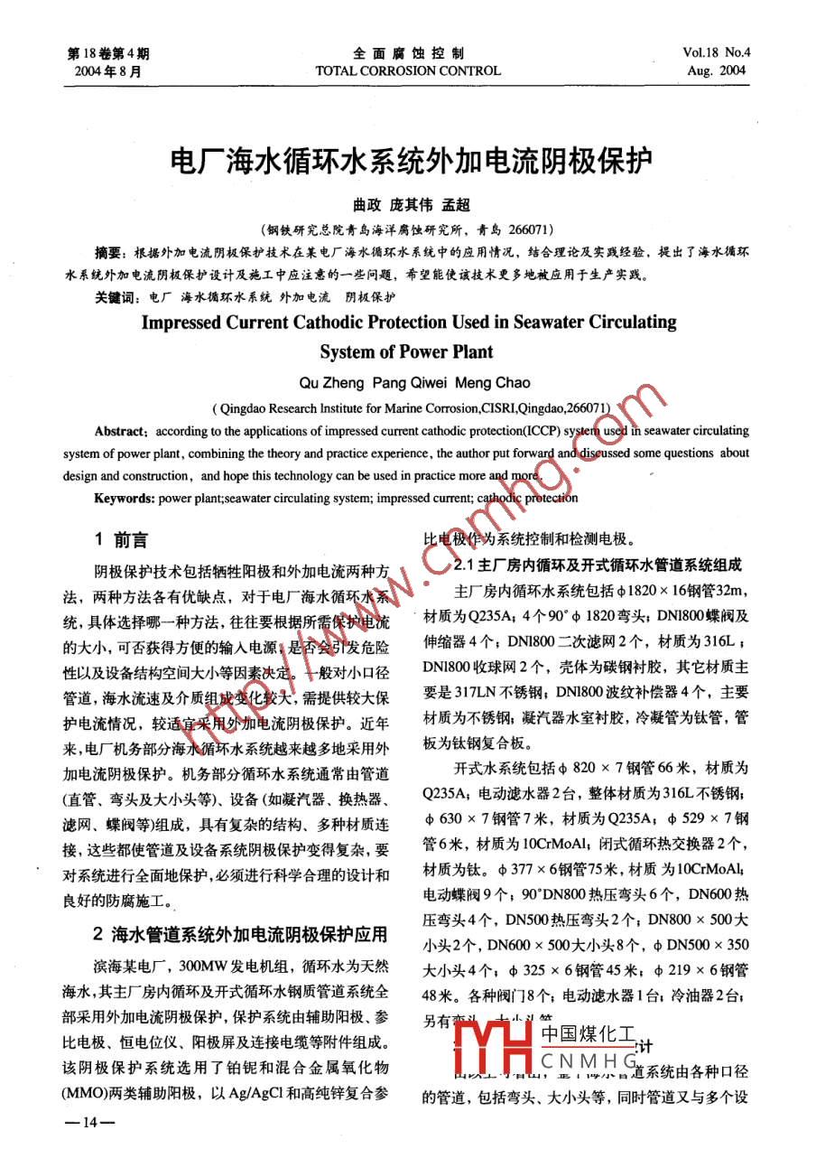 第18卷第4期全面腐蝕控制Vol.18 No.42004年8月TOTAL CORROSION CONTROLAug.2004電廠海水循環(huán)水系統(tǒng)外加電流陰極保護(hù)曲政龐其偉孟超(鋼鐵研究總院青島海洋腐蝕研究所,青島266071)摘要:根據(jù)外加電流陰極保護(hù)技術(shù)在某電廠海水循環(huán)水系統(tǒng)中的應(yīng)用情況,結(jié)合理論及實(shí)踐經(jīng)驗(yàn),提出了海水循環(huán)水系統(tǒng)外加電流陰極保護(hù)設(shè)計(jì)及施工中應(yīng)注意的一些問題,希望能使該技術(shù)更多地被應(yīng)用于生產(chǎn)實(shí)踐。關(guān)鍵詞:電廠海水循環(huán)水系統(tǒng)外加電流陰極保護(hù)Impressed Current Cathodic Protection Used in Seawater CirculatingSystem of Power PlantQu Zheng Pang Qiwei Meng Chao( Qingdao Research Institute for Marine Corrosion,CISRL,Qingdao.266071)Abstract; according to the applications of impressed current cathodic protection(ICCP) system used in seawater circulatingsystem of power plant, combining the theory and practice experience, the author put forward and discussed some questions aboutdesign and construction, and hope this technology can be used in practice more and more .Keywords: power plant;seawater circulating system; impressed current; cathodic protection1前言比電極作為系統(tǒng)控制和檢測(cè)電極。陰極保護(hù)技術(shù)包括犧牲陽極和外加電流兩種方2.1主廠房?jī)?nèi)循環(huán)及開式循環(huán)水管道系統(tǒng)組成法,兩種方法各有優(yōu)缺點(diǎn),對(duì)于電廠海水循環(huán)水系廠房?jī)?nèi)循環(huán)水系統(tǒng)包括中1820 x 16鋼管32m,統(tǒng),具體選擇哪- -種方法,往往要根據(jù)所需保護(hù)電流材質(zhì)為Q235A; 4個(gè)90° φ 1820彎頭; DN1800蝶閥及的大小,可否獲得方便的輸入電源,是否會(huì)引發(fā)危險(xiǎn)伸縮器4個(gè); DN1800二次濾網(wǎng)2個(gè),材質(zhì)為316L;性以及設(shè)備結(jié)構(gòu)空間大小等因素決定。-般對(duì)小口徑DNI800收球網(wǎng)2個(gè),殼體為碳鋼襯膠,其它材質(zhì)主管道,海水流速及介質(zhì)組成變化較大,需提供較大保要是317LN不銹鋼; DN1800 波紋補(bǔ)償器4個(gè),主要護(hù)電流情況,較適宜采用外加電流陰極保護(hù)。近年材質(zhì)為不銹鋼;凝汽器水室襯膠,冷凝管為鈦管,管來,電廠機(jī)務(wù)部分海水循環(huán)水系統(tǒng)越來越多地采用外板為鈦鋼復(fù)合板。加電流陰極保護(hù)。機(jī)務(wù)部分循環(huán)水系統(tǒng)通常由管道開式水系統(tǒng)包括φ 820x 7鋼管66米,材質(zhì)為(直管、彎頭及大小頭等)、設(shè)備(如凝汽器、換熱器、Q235A;電動(dòng)濾水器2臺(tái),整體材質(zhì)為316L不銹鋼;濾網(wǎng)、蝶閥等)組成,具有復(fù)雜的結(jié)構(gòu)、多種材質(zhì)連φ 630x 7鋼管7米,材質(zhì)為Q235A; φ 529 x 7鋼接,這些都使管道及設(shè)備系統(tǒng)陰極保護(hù)變得復(fù)雜,要管6米,材質(zhì)為10CrMoAl,閉式循環(huán)熱交換器2個(gè),對(duì)系統(tǒng)進(jìn)行全面地保護(hù),必須進(jìn)行科學(xué)合理的設(shè)計(jì)和材質(zhì)為鈦。φ 377 x 6鋼管75米,材質(zhì)為10CrMoAl;電動(dòng)蝶閥9個(gè); 90'DN800熱壓彎頭6個(gè),DN600 熱良好的防腐施工。2海水管道系統(tǒng)外加電流陰極保護(hù)應(yīng)用壓彎頭4個(gè),DN500熱壓彎頭2個(gè); DN800 x 500大小頭2個(gè), DN600 x 500大小頭8個(gè), φ DN500 x 350濱海某電廠, 300MW發(fā)電機(jī)組,循環(huán)水為天然大小頭4個(gè),φ 325 x 6鋼管45米; φ 219x 6鋼管海水,其主廠房?jī)?nèi)循環(huán)及開式循環(huán)水鋼質(zhì)管道系統(tǒng)全48米。各種閥門8個(gè);電動(dòng)濾水器1臺(tái):冷油器2臺(tái);部采用外加電流陰極保護(hù),保護(hù)系統(tǒng)由輔助陽極、參另有比電極、恒電位儀、陽極屏及連接電纜等附件組成。中國(guó)煤化工:該陰極保護(hù)系統(tǒng)選用了鉑鈮和混合金屬氧化物MHCNMH道系統(tǒng)由各種口徑(MMO)兩類輔助陽極,以Ag/AgCl和高純鋅復(fù)合參的管道,包括彎頭、大小頭等,同時(shí)管道又與多個(gè)設(shè)-14-全面腐蝕控制曲政等電廠海水循環(huán)水系統(tǒng)外加電流陰極保護(hù)2004年第18卷第4期備相連,系統(tǒng)中所用到的材質(zhì)有Q235A.鎳鉻合金、HFCF-1-1型參比電極,分別布置在進(jìn)水管路的蝶閥10CrMoAl、316L及317LN不銹鋼、鈦等,根據(jù)以下后和管道與凝汽器連接部分,回水管路的蝶閥前和管原則進(jìn)行了外加電流陰極保護(hù)系統(tǒng)的設(shè)計(jì):道與凝汽器連接部分。為了保證陰極匯流線和測(cè)量線(1)考慮全局,重點(diǎn)保護(hù),如在考慮管道達(dá)到保護(hù)的連接,設(shè)置了5個(gè)匯流基座。的前提下,重點(diǎn)考慮管道與設(shè)備相連部分,因?yàn)樵O(shè)備(2)閉式循環(huán)熱交換器部分與管道材質(zhì)的差異,易引發(fā)嚴(yán)重的電偶腐蝕問題;設(shè)計(jì)選用了36支HFLF-1型MMO輔助陽極,能(2)應(yīng)充分考慮海水流速、水溫等對(duì)腐蝕速率的夠保證系統(tǒng)中的每一部分均能得到保護(hù)。為控制和檢影響;測(cè),設(shè)計(jì)安裝4支HFCF-1-2型復(fù)合參比電極,分別(3)應(yīng)保證鈦材不因過保護(hù)而吸氫,在電位布置在閉式循環(huán)熱交換器進(jìn)、出口管道上各一支,濾<- 0.75V(SCE)時(shí),鈦材可能吸氫,引起氫脆腐蝕;水器進(jìn)水口管道- -支及φ820直管段上一支。系統(tǒng)中(4)輔助陽極數(shù)量及設(shè)置應(yīng)充分考慮到系統(tǒng)的設(shè)置了5個(gè)匯流