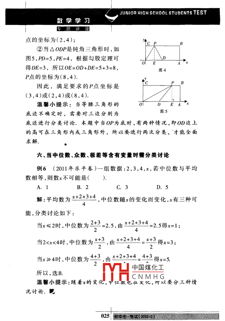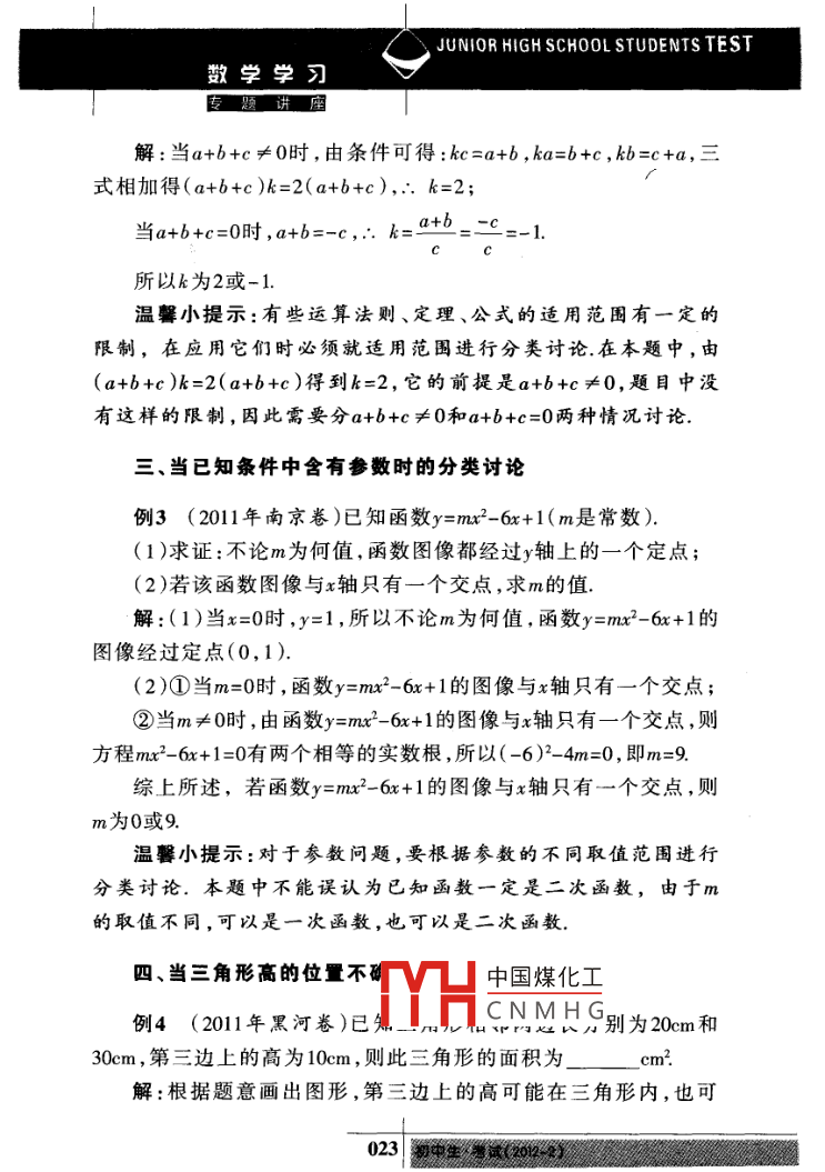 JUNIOR HIGH SCHOOL STUDENTS TEST數(shù)學(xué)學(xué)刀責(zé)任編輯:王二喜分類(lèi)討論思想的應(yīng)用文/陳德前在解題過(guò)程中,將某一數(shù)學(xué)對(duì)象按照一定的原則或標(biāo)準(zhǔn)分成若干類(lèi),然后逐類(lèi)進(jìn)行討論并解決,再把這幾類(lèi)的結(jié)論匯總,得出問(wèn)題的答案.這種解題方法就是分類(lèi)討論.分類(lèi)討論用的是“化整為零,各個(gè)擊破,再積零為整”的解題策略.、含有絕對(duì)值符號(hào)時(shí)要進(jìn)行分類(lèi)討論例1(2010年孝感卷)若lm-n|=n-m,且m|=4,ln|=3,則解:因?yàn)閨m|=4,ln|=3,所以m=±4,n=±3又lm-n|=n-m,所以n-m≥0,即n≥m所以n=3,m=-4或n=-3,m=-4符合題意當(dāng)n=3,m=-4時(shí),(m+n)2當(dāng)n=-3,m=-4時(shí),(m+n)2=(-3-4)2=49所以(m+n)2的值為1或49溫馨小提示:遇到含有絕對(duì)值的問(wèn)題,一般需要去掉絕對(duì)值符號(hào).這就要根據(jù)絕對(duì)值的性質(zhì)進(jìn)行分類(lèi)討論、當(dāng)使用的法則、定理中國(guó)煤化工類(lèi)討論CNMHG例2(2011年畢節(jié)卷)已知+=c=C=k,則k的值是022JUNIOR HIGH SCHOOL STUDENTS TEST數(shù)學(xué)學(xué)習(xí)解:當(dāng)a+b+c≠0時(shí),由條件可得:kc=a+b,ka=b+c,kb=c+a,三式相加得(a+b+c)k=2(a+b+c),;k=2;當(dāng)a+b+c=0時(shí),a+b=-ck、a+b所以k為2或-1.溫馨小提示:有些運(yùn)算法則、定理、公式的適用范圍有一定的限制,在應(yīng)用它們時(shí)必須就適用范圍進(jìn)行分類(lèi)討論在本題中,由(a+b+c)k=2(a+b+c)得到k=2,它的前提是a+b+c≠0,題目中沒(méi)有這樣的限制,因此需要分a+b+c≠0和a+b+c=0兩種情況討論三、當(dāng)已知條件中含有參數(shù)時(shí)的分類(lèi)討論例3(2011年南京卷)已知函數(shù)y=mx2-6x+1(m是常數(shù))(1)求證:不論m為何值,函數(shù)圖像都經(jīng)過(guò)y軸上的一個(gè)定點(diǎn);(2)若該函數(shù)圖像與x軸只有一個(gè)交點(diǎn),求m的值解:(1)當(dāng)x=0時(shí),y=1,所以不論m為何值,函數(shù)y=mx2-6x+1的圖像經(jīng)過(guò)定點(diǎn)(0,1)(2)①當(dāng)m=0時(shí),函數(shù)y=mx2-6x+1的圖像與x軸只有一個(gè)交點(diǎn)②當(dāng)m≠0時(shí),由函數(shù)y=mx2-6x+1的圖像與x軸只有一個(gè)交點(diǎn),則方程mx2-6x+1=0有兩個(gè)相等的實(shí)數(shù)根,所以(-6)2-4m=0,即m=9綜上所述,若函數(shù)y=mx2-6x+1的圖像與x軸只有一個(gè)交點(diǎn),則m為0或9溫馨小提示:對(duì)于參數(shù)問(wèn)題,要根據(jù)參數(shù)的不同取值范圍進(jìn)行分類(lèi)討論.本題中不能誤認(rèn)為已知函數(shù)一定是二次函數(shù),由于m的取值不同,可以是一次函數(shù),也可以是二次函數(shù)四、當(dāng)三角形高的位置不中國(guó)煤化工例4(201年黑河卷)已焦灬和長(zhǎng)別為20cm和30cm,第三邊上的高為10cm,則此三角形的面積為cm2解:根據(jù)題意畫(huà)出圖形,第三邊上的高可能在三角形內(nèi),也可023續(xù)JUNIOR HIGH SCHOOL STUDENTS TEST數(shù)學(xué)學(xué)習(xí)能在三角形外,要分兩種情況求解利用勾股定理可求得BD=10V3CD=20V2.當(dāng)高在三角形內(nèi)時(shí),如圖1,此時(shí)BC=20√2+10√3,三角形的面積為(100V2+50√3)cm當(dāng)高在三角形外時(shí),如圖2,此時(shí)BC=20V2-10√3,面積為(100V2圖50√3)cm三角形面積為(100V2+50√3)cm2或(100V2-503)cm2溫馨小提示:對(duì)于三角形的主要線(xiàn)段(角平分線(xiàn)、中線(xiàn)、高)來(lái)說(shuō),高的位置具有多變性,可在三角形內(nèi),三角形外或三角形的邊上,當(dāng)條件中出現(xiàn)高時(shí),要注意分類(lèi)討論五、當(dāng)?shù)妊切蔚牡撞淮_定時(shí)要進(jìn)行分類(lèi)討論例5(2011年安順卷)如圖3,O為坐標(biāo)原點(diǎn),四邊形OABC為矩形,A(10,0),C(0,4),點(diǎn)D是OA的中點(diǎn),點(diǎn)P在BC上運(yùn)動(dòng),當(dāng)△ODP是腰長(zhǎng)為5的等腰三角形時(shí),則P點(diǎn)的坐標(biāo)為解:根據(jù)已知得OA=10,D為OA中點(diǎn),則OD=5,作PE⊥OA于點(diǎn)E,滿(mǎn)足△POD為等腰三角形的情況有以下三種:當(dāng)PD為底時(shí),如圖3,PO=5,OC=4,根據(jù)勾股定理可得PC=3,因此,P點(diǎn)的坐標(biāo)為(3,4當(dāng)OD為底時(shí),如圖4,OE=25,PE=4,根據(jù)勾股定理可知OP≠所以這種情況不存在當(dāng)OP為底時(shí),又有兩種中國(guó)煤化工B①當(dāng)△ODP是銳角三角CNMHG圖4,PD=5,PE=4,根據(jù)勾股定理可得DE=3,所以O(shè)E=OD-DE=5-3=2,P集!024JUNIOR HIGH SCHOOL STUDENTS TEST數(shù)學(xué)學(xué)刀點(diǎn)的坐標(biāo)為(2,4)②當(dāng)△ODP是鈍角三角形時(shí),如圖5,PD=5,PE=4,根據(jù)勾股定理可得DE=3,所以O(shè)E=OD+DE=5+3=8P點(diǎn)的坐標(biāo)為(8,4)因此,滿(mǎn)足要求的P點(diǎn)坐標(biāo)是(3,4)或(2,4)或(8,4)溫馨小提示:當(dāng)?shù)妊切蔚牡走叢淮_定時(shí),需要對(duì)三邊分別為底邊進(jìn)行分類(lèi)討論.本題中當(dāng)OP為底時(shí),有兩種情況,即OD邊上的高可在三角形內(nèi)或三角形外,所以要進(jìn)行兩次分類(lèi),才能全面求解六、當(dāng)中位數(shù)、眾數(shù)、極差等含有變量時(shí)需分類(lèi)討論例6(2011年樂(lè)平卷)一組數(shù)據(jù):2,3,4,x,若中位數(shù)與平均數(shù)相等,則數(shù)x不可能是()A.1D.5解:平均數(shù)為x+2+3+4,中位數(shù)隨x的變化而變化,x有三種可能,分類(lèi)討論如下當(dāng)x≤2時(shí),中位數(shù)為2+3=2.5,由x+2+3+4-2.5得x=1;當(dāng)2