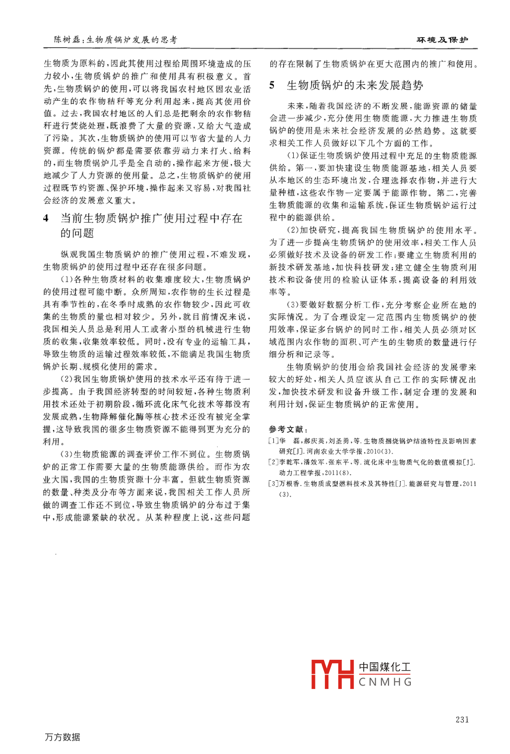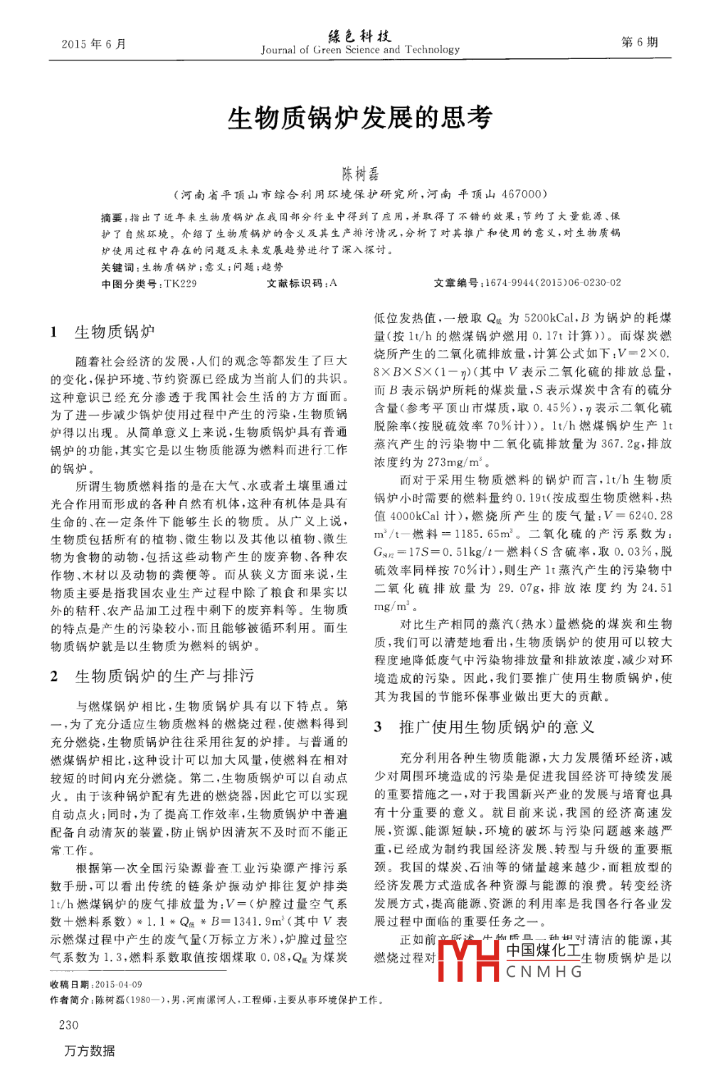 2015年6月緣色科技Journal of green Science and Technology第6期生物質鍋爐發(fā)展的思考陳樹磊河南省平頂山市綜合利用環(huán)境保護研究所,河南平頂山467000摘要:指出了近年來生物質鍋爐在我國部分行業(yè)中得到了應用,并取得了不錯的效果:節(jié)約了大量能源、保護了自然環(huán)境。介紹了生物質鍋爐的含義及其生產排污情況,分析了對其推廣和使用的意義,對生物質鍋爐使用過程中存在的問題及未來發(fā)展趨勢進行了深入探討。關鍵詞:生物質鍋爐;意義;問題;趨勢中圖分類號:TK229文獻標識碼:A文章編號:1674-9944(2015)06-0230-02低位發(fā)熱值,一般取Q低為5200kCal,B為鍋爐的耗煤1生物質鍋爐量(按lt/h的燃煤鍋爐燃用0.17t計算)。而煤炭燃隨著社會經濟的發(fā)展,人們的觀念等都發(fā)生了巨大燒所產生的二氧化硫排放量,計算公式如下:V=2×0的變化,保護環(huán)境、節(jié)約資源已經成為當前人們的共識。8XBXS×(1-n)(其中V表示二氧化硫的排放總量這種意識已經充分滲透于我國社會生活的方方面面而B表示鍋爐所耗的煤炭量,S表示煤炭中含有的硫分為了進一步減少鍋爐使用過程中產生的污染,生物質鍋含量(參考平頂山市煤質,取0.45%),7表示二氧化硫爐得以出現。從簡單意義上來說,生物質鍋爐具有普通脫除率(按脫硫效率70%計),1h燃煤鍋爐生產1t鍋爐的功能其實它是以生物質能源為燃料而進行工作蒸汽產生的污染物中二氧化硫排放量為367.2g,排放的鍋爐濃度約為273mg/m3。所謂生物質燃料指的是在大氣、水或者土壤里通過而對于采用生物質燃料的鍋爐而言,1t/h生物質光合作用而形成的各種白然有機體,這種有機體是具有鍋爐小時需要的燃料量約0.19(按成型生物質燃料,熱生命的、在一定條件下能夠生長的物質。從廣義上說值4000kCal計),燃燒所產生的廢氣量:V=6240.28生物質包括所有的植物、微生物以及其他以植物、微生m/t-燃料=185.65m3。二氧化硫的產污系數為:物為食物的動物,包括這些動物產生的廢棄物、各種農kg/t一燃料(S含硫率,取0.03%,脫作物、木材以及動物的糞便等。而從狹義方面來說,生硫效率同樣按70%計),則生產1t蒸汽產生的污染物中物質主要是指我國農業(yè)生產過程中除了糧食和果實以二氧化硫排放量為29.07g,排放濃度約為24.51外的秸稈、農產品加工過程中剩下的廢棄料等。生物質mg/m。的特點是產生的污染較小,而且能夠被循環(huán)利用。而生對比生產相同的蒸汽(熱水)量燃燒的煤炭和生物物質鍋爐就是以生物質為燃料的鍋爐。質,我們可以清楚地看出,生物質鍋爐的使用可以較大程度地降低廢氣中污染物排放量和排放濃度,減少對環(huán)2生物質鍋爐的生產與排污境造成的污染。因此,我們要推廣使用生物質鍋爐,使與燃煤鍋爐相比,生物質鍋爐具有以下特點。第其為我國的節(jié)能環(huán)保事業(yè)做出更大的貢獻。,為了充分適應生物質燃料的燃燒過程,使燃料得到3推廣使用生物質鍋爐的意義充分燃燒,生物質鍋爐往往采用往復的爐排。與普通的燃煤鍋爐相比,這種設計可以加大風量,使燃料在相對充分利用各種生物質能源,大力發(fā)展循環(huán)經濟,減較短的時間內充分燃燒。第二,生物質鍋爐可以自動點少對周圍環(huán)境造成的污染是促進我國經濟可持續(xù)發(fā)展火。由于該種鍋爐配有先進的燃燒器,因此它可以實現的重要措施之一,對于我國新興產業(yè)的發(fā)展與培育也具自動點火;同時,為了提高工作效率,生物質鍋爐中普遍有十分重要的意義。就目前來說,我國的經濟高速發(fā)配備閂動淸灰的裝置,防止鍋爐因清灰不及時而不能正展,資源、能源短缺,環(huán)境的破壞與污染問題越來越嚴常工作重,已經成為制約我國經濟發(fā)展、轉型與升級的重要瓶根據第一次全國污染源普查工業(yè)污染源產排污系頸。我國的煤炭、石油等的儲量越來越少,而粗放型的數手冊,可以看出傳統的鏈條爐振動爐排往復爐排類經濟發(fā)展方式造成各種資源與能源的浪費。轉變經濟lt/h燃煤鍋爐的廢氣排放量為:V=(爐膛過量空氣系發(fā)展方式,提高能源、資源的利用率是我國各行各業(yè)發(fā)數+燃料系數)*1.1*Q*B=1341.9m(其中V表展過程中面臨的重要任務之一。示燃煤過程中產生的廢氣量(萬標立方米),爐膛過量空正如前岳動對清潔的能源,其氣系數為1.3,燃料系數取值按煙煤取0.08,Q為煤炭燃燒過程對中國煤化工生物質鍋爐是CNMHG收稿日期:2015-04-09作者簡介:陳樹磊(1980—),男,河南漯河人,工程師,主要從事環(huán)境保護工作230陳樹磊:生物質鍋爐發(fā)展的思考環(huán)境及保護生物質為原料的,因此其使用過程給周圍環(huán)境造成的壓的存在限制了生物質鍋爐在更大范圍內的推廣和使用。力較小,生物質鍋爐的推廣和使用具有積極意義。首先,生物質鍋爐的使用,可以將我國農村地區(qū)因農業(yè)活5生物質鍋爐的未來發(fā)展趨勢動產生的農作物秸稈等充分利用起來,提高其使用價未來,隨著我國經濟的不斷發(fā)展,能源資源的儲量值。過去,我國農村地區(qū)的人們總是把剩余的農作物秸會進一步減少,充分使用生物質能源,大力推進生物質稈進行焚燒處理,既浪費了大量的資源,又給大氣造成鍋爐的使用是未來社會經濟發(fā)展的必然趨勢。這就要了污染。其次,生物質鍋爐的使用可以節(jié)省大量的人力求相關工作人員做好以下幾個方面的工作。資源。傳