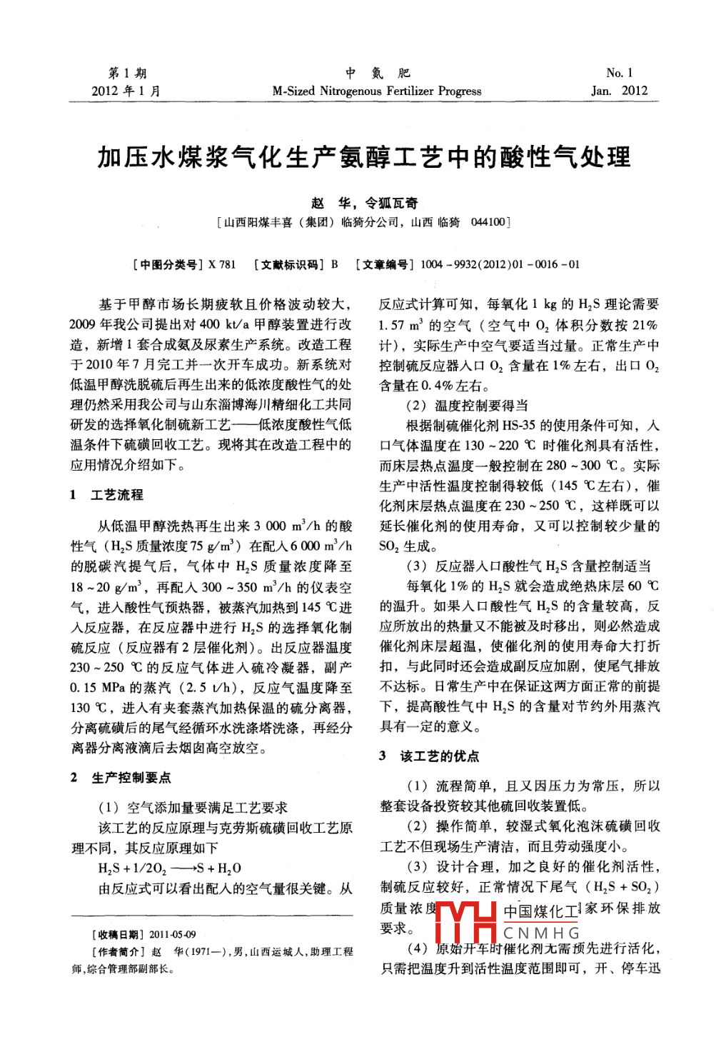 加壓水煤漿氣化生產(chǎn)氨醇工藝中的酸性氣處理