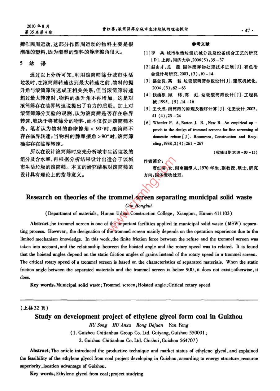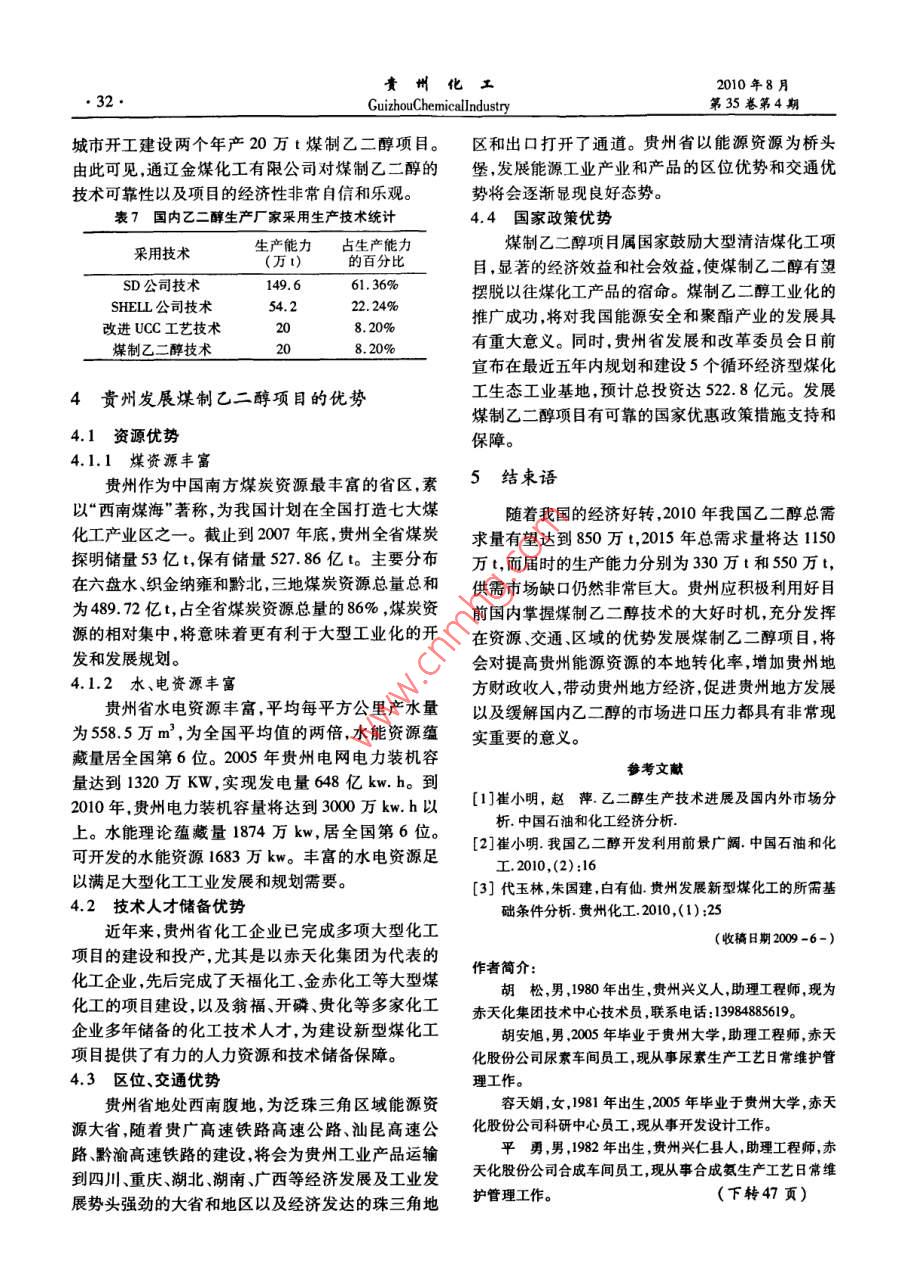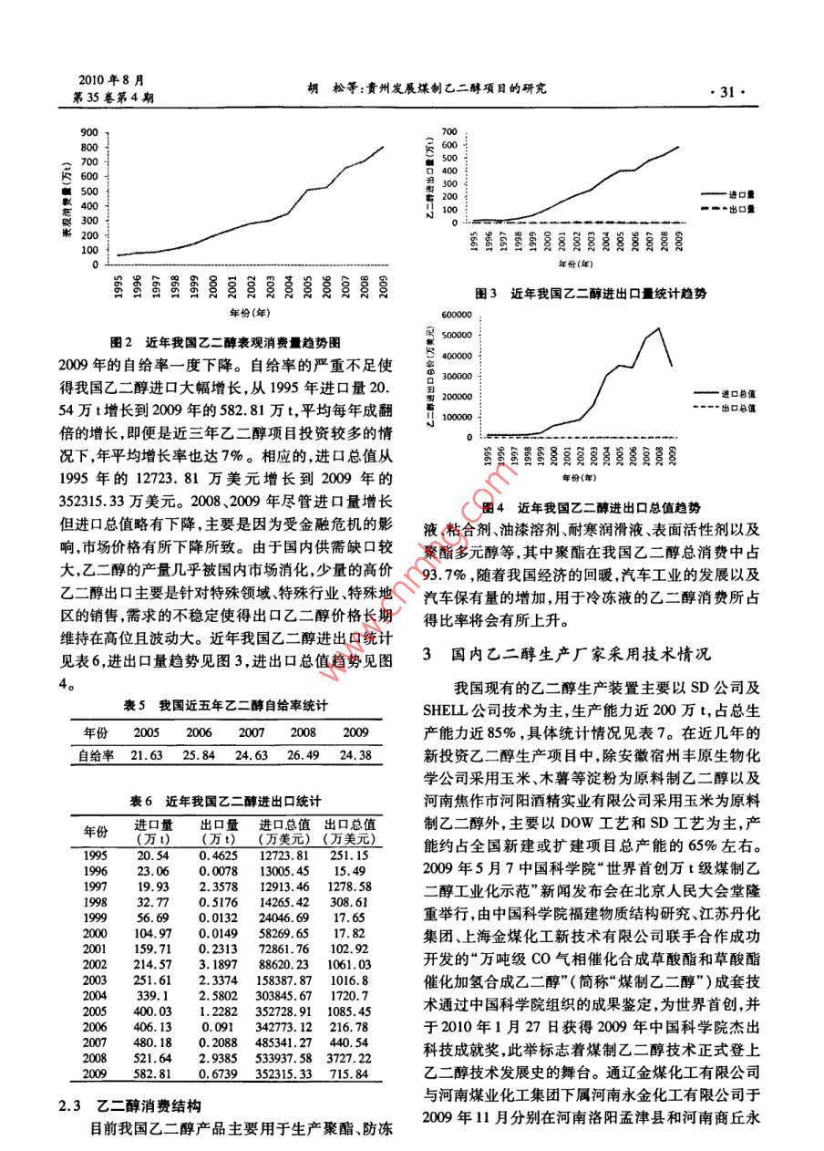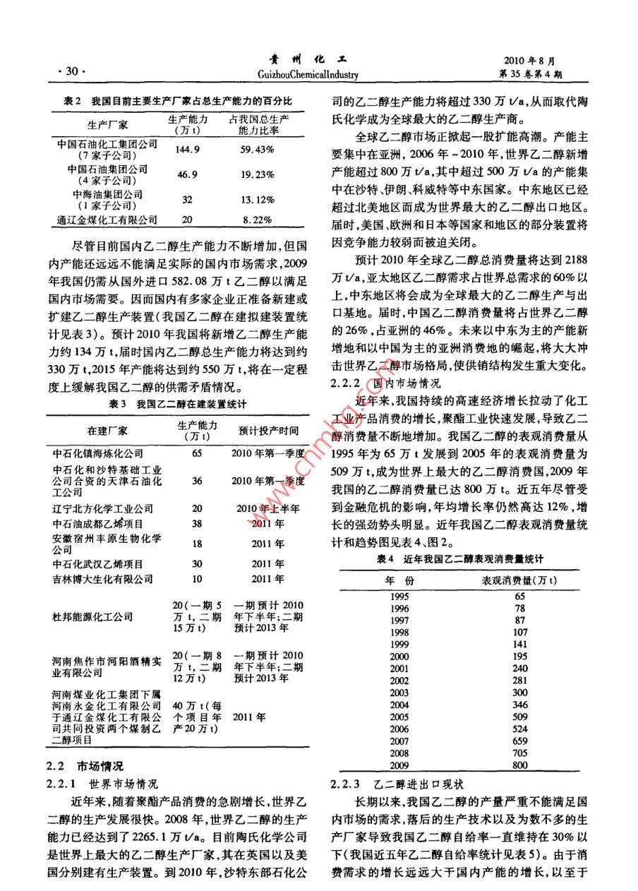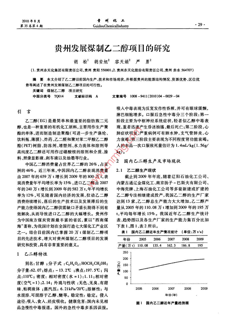 2010年8月州化工第35卷第4期Guizhou Chemicallndustry貴州發(fā)展煤制乙二醇項目的研究胡松'胡安旭2容天娟2嚴勇2(1.貴州赤天化集團有限責任公司,貴州貴陽5500;2.貴州赤天化股份有限責任公司,貴州赤水564707)要本文介紹了乙二醇目前國內(nèi)生產(chǎn)、技術(shù)和市場現(xiàn)狀,并根據(jù)貴州的能源結(jié)構(gòu)情況、資源優(yōu)勢、區(qū)位優(yōu)勢等閘述了在貴州發(fā)展煤制乙二醇項目的可行性。關(guān)鍵詞煤制乙二醇項目研究中圖分類號TQ04文獻標識碼A文章編號1008-9411(2010)04-0029-04引言吸入中毒表現(xiàn)為反復(fù)發(fā)作性昏厥,并可有眼球震顫,淋巴細胞增多??诜蠹毙灾卸痉秩齻€階段:第一乙二醇(EG)是最簡單和最重要的脂肪族二元階段主要為中樞神經(jīng)系統(tǒng)癥狀輕者似乙醇中毒表醇,也是一種重要的有機化工原料,主要用作生產(chǎn)聚現(xiàn)重者迅速產(chǎn)生昏迷抽搐最后死亡;第二階段,心酯的單體,進而制造制造聚酯(可進一步生產(chǎn)滌綸、肺癥狀明顯,嚴重病例可有肺水腫,支氣管肺炎,心飲料瓶、薄膜)、炸藥、乙二醛和聚對苯二甲酸乙二醇力衰竭;第三階段主要表現(xiàn)為不同程度腎功能衰竭。酯(PET)樹脂、防凍劑、增塑劑、水力流體和溶劑等人的本品一次口服致死量估計為1.4mL/kg(1.56g高純度乙二醇還可用作過硼酸銨的溶劑和介質(zhì)涂kg)。料、照像顯影液、剎車液以及油墨等行業(yè)。中國乙二醇消費量占世界乙二醇的26%,占亞2國內(nèi)乙二醇生產(chǎn)及市場現(xiàn)狀洲的46%。近三年來,中國國內(nèi)乙二醇表觀消費量2.1乙二醇生產(chǎn)現(xiàn)狀由2007年的659萬t增長到2009年的800萬t,表截止到2009年年底,隨著遼陽石油化工公司、觀消費量年平均增長率為15%,進口乙二醇由2007內(nèi)蒙古通遼金煤化工南京揚子-巴斯夫有限公司年的240萬t增長到2009年的582萬t,年平均增長中海殼牌、上海石油化工公司等多套新建或擴建的率為12%,可見隨著國內(nèi)經(jīng)濟的發(fā)展,拉動乙二醇乙二醇專注相繼建成投產(chǎn),我國乙二醇的生產(chǎn)廠家消費持續(xù)增長,落后的生產(chǎn)技術(shù)以及發(fā)展滯后的生達到13家,乙二醇總生產(chǎn)能力大大增加,乙二醇產(chǎn)產(chǎn)能力使得國內(nèi)乙二醇供需缺口矛盾長期得不到有量從2005年的110.08萬t增加到2009年的195萬效解決,從而導(dǎo)致進口乙二醇的大幅增長。貴州作t,平均每年增長15%。我國近年乙二醇生產(chǎn)統(tǒng)計為中國南方煤炭資源最豐富的省區(qū),素以“西南煤表趨勢圖以及各生產(chǎn)廠家的生產(chǎn)能力集百分比如?!敝Q,為我國計劃在全國打造七大煤化工產(chǎn)業(yè)區(qū)下表1、圖1、表2所示。之一。結(jié)合目前國內(nèi)已掌握20萬t煤制乙二醇項表1國內(nèi)乙二醇近年生產(chǎn)情況統(tǒng)計(單位:萬ta)目的先進技術(shù),增大對貴州煤制乙二醇項目的發(fā)展年份052006研究和投資,具有非常重要的意義。產(chǎn)量(萬t)110.08135.4162.3186.8195乙二醇特性別名:甘醇;分子式:C2H4QO2;HOCH2CH10H;150分子量:62.07;熔點:-13.2℃;沸點:197.5℃;閃·100點:10℃;密度:相對密度(水=1):1.l1;相對密度(空氣=1):2.14;外觀與性狀:無色、無臭、有甜味、粘稠液體;蒸汽壓:6.2lkPa/20℃;溶解性:與200520082009水混溶,可混溶于乙醇、醚等。穩(wěn)定性:穩(wěn)定。侵入年份(年)途徑:吸入、食入、經(jīng)皮吸收。健康危害:國內(nèi)未見相圖1國內(nèi)乙二醇近年產(chǎn)量趨勢圖品急慢性中毒報道。國外的急性中毒多系因誤報貴州化工2010年8月Guizhou ChemicalIndustry第35卷第4期表2我國目前主要生產(chǎn)廠家占總生產(chǎn)能力的百分比司的乙二醇生產(chǎn)能力將超過330萬va,從而取代陶生產(chǎn)廠家生產(chǎn)能力占我國總生產(chǎn)氏化學成為全球最大的乙二醇生產(chǎn)商。(萬t)能力比率中國石油化工集團公司14.9全球乙二醇市場正掀起一股擴能高潮。產(chǎn)能主59,43%要集中在亞洲,2006年-2010年,世界乙二醇新增中國石油集團公司(4家子公司)46.91923%產(chǎn)能超過800萬ta,其中超過500萬Ua的產(chǎn)能集中海油集團公司中在沙特、伊朗、科威特等中東國家。中東地區(qū)已經(jīng)(1家子公司)超過北美地區(qū)而成為世界最大的乙二醇出口地區(qū)。通遼金煤化工有限公司8.22%屆時,美國歐洲和日本等國家和地區(qū)的部分裝置將盡管目前國內(nèi)乙二醇生產(chǎn)能力不斷增加但國因競爭能力較弱而被迫關(guān)閉。內(nèi)產(chǎn)能還遠遠不能滿足實際的國內(nèi)市場需求,2009預(yù)計2010年全球乙二醇總消費量將達到2188年我國仍需從國外進口582.08萬t乙二醇以滿足萬va,亞太地區(qū)乙二醇需求占世界總需求的6%以國內(nèi)市場需要。因而國內(nèi)有多家企業(yè)正準備新建或上,中東地區(qū)將會成為全球最大的乙二醇生產(chǎn)與出擴建乙二醇生產(chǎn)裝置(我國乙二醇在建擬建裝置統(tǒng)口基地。屆時中國乙二醇消費量將占世界乙二醇計見表3)。預(yù)計2010年我國將新增乙二醇生產(chǎn)能的26%,占亞洲的46%。未來以中東為主的產(chǎn)能新力約134萬t,屆時國內(nèi)乙二醇總生產(chǎn)能力將達到約增地和以中國為主的亞洲消費地的崛起將大大沖30萬t,2015年產(chǎn)能將達到約50萬t,將在一定程擊世界乙二醇市場格局,使供銷結(jié)構(gòu)發(fā)生重大變化度上緩解我國乙二醇的供需矛盾情況。2.2.2國