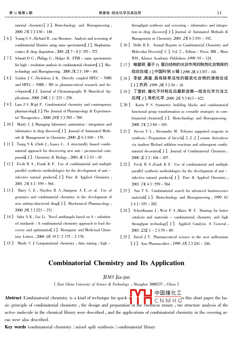 第31卷第6期江蘇化工Vol 31 No 62003年12月Jiangsu Chemical IndustryDec.2003組合化學及其應用焦家俊①華東理工大學化學與制藥學院,上海200237)摘要組合化學是一種快速大量的合成技術。簡明地介紹了組合化學的基本原理、化合物庫的設計與制備方法、活性分子結構的表征以及組合化學在許多領域里的應用。關鍵詞組合化學混合-均分法組中圖分類號06.0文獻標識碼:A文章編號100-111(2003)6-0008-04組合化學( combinatorial chemistry),又稱多重合成法 simultaneous multiple synthesis),是一種大量而1組合化學原理快捷的合成方法。它是根據組合論的思想將各種化組合化學的本質是一種快速大量的合成方法,學構建單元( building block)以系統(tǒng)平行的方式進行它是一種將分子設計、化學合成、組合理論及分子識反應可以在極短的時間內迅速獲得大量的化合物。別融合為一體的技術。若按照傳統(tǒng)的化學合成模組合化學的概念最初起源于20世紀60年代問世的式反應起始物通常是兩兩相對每一次合成反應僅固相多肽合成法。在固相多肽合成中,由于采用產生一個化合物生成物經過分離、純化后作為中高分子聚合物固相作載體產物的分離與純化十分間體再進行第二步反應如此反復直至獲得終產物方便漢由于多肽合成中許多反應條件都是相同的,[見式1)~(3)傳統(tǒng)化學合成模式的特點是一次從而使各種肽分子能夠在同一反應器內按照預設程合成一個產物。序合成出來。 Houghten于1985年提出了茶葉袋A+B->AB( tea bags冾成法1使不同序列的肽在同一個反應AB+C->ABC器內同時進行多肽偶聯(lián)反應至此組合化學的雛形初步呈現(xiàn)出來。1991年Fuka提出的混-分合成法ABC…M+N一>ABC,MN( mix and split)標志著組合化學的研究步入成熟階如果以兩組化合物作起始物其中一組含M個段。采用混-分合成法人們可以在短時間內僅經不同的化合物另一組含N個不同的化合物當這過幾步化學反應就可以產生成千上萬種不同的化合兩組化合物同時進行交又(組合嚴行反應僅一步物也稱化合物庫 hemical library)組合化學的誕應就會生成MxN個化合物見式4)]生是合成化學領域里的一次重大突破,它為快捷合M1112131…MN1成及篩選具特定功能性目標分子提供了強有力的工M2N2M1N2M2N2M3N2MnN2具。1998年, Science將組合化學技術列為科學研究M3+N3->M1N3+M2N3+M3N3+MnN3領域里的重大成果之一。組合化學最初主要應用于藥物合成及篩選現(xiàn)在已迅速擴展至有機、無機、生MnNM1NnM2NnM3..物、高分子合成等領域。顯然組合化學已成為當今(中國煤化工的基本原理。顯然按化學研究領域中的新熱點。CNMH氣可以制備出成千上萬①收稿日期2003-08-17作者簡介焦家傚1958-)男武漢人華東理工大學副教授博士主要研究液晶合成、環(huán)氧化反應、感光材料研究等。E-mail:jiaoji@ecust.edu.cno第31卷第6期焦家俊組合化學及其應用種不同的化合物見表1由此篩選而得到的數據比較準確可靠。表1組合化學中的構建單元數與生成物數量關系其它的化合物庫構建方法有位置掃描法、正交構建單元數法、迭代展開法2等。反應步驟數生成物數量M組D2312100A BC DA BC DJA BC DJABCD1001003A反應2化合物庫的合成AA BA CA DAL AB BB CB DB JAC BC CC DC AD BD CD如前所述組合化學合成方法最初是應用在新藥的研制與篩選。通常根據已有的分子構效知識混合-均分以某種藥物先導化合物為起始原料采用組合化學AA BA CA DA AA BA CA DA AA BA CA DA AA BA CA DA方法快速地合成出大量衍生物從而為藥物的篩選AB BB CB DB AB BB CB DB AB BB CB DB AB BB CB DB提供足夠的候選化合物。AC BC CC DC AC BC CC DC AC BC CC DC AC BC CC DCAD BD CD DD AD BD CD DD AD BD CD DD AD BD CD DI按照組合化學原理將不同分子有計劃、有規(guī)律、系統(tǒng)的合成出來的分子數量龐大的化合物群即反應稱為化合物庫3在化合物庫的設計與合成中常AAA BAA CAA DAA AAB BAB CAB DAB AAC BAC CAC DAC AAD BAD CAD DAD見的方法有混合均分法med- split synthesis同步80::8 DBC ABD BD CBD DB平行法 parallel method)2。簡單地說混合均分法CA BCA CCA DCA ACB BCB CCB DCB ACC BCC CCC DCC ACD BCD CCD DCI就是將若干起始物先混合在一起再等分為若干份ADA BDA CDA DDA ADB BDB CDB DDB ADC BDC CDC DDC ADD BDD CDD DDD其中每一份都可看作為一個子庫。各子庫分別與不圖1混合-均分法原理示意圖同的化合物反應后再混合在一起然后經等分為若干份再分別與另外幾種不同的化合物反應。反應3活性分子結構表征結束后不經過分離、純化,直接再混合、分組、反應如此反復直到完成預定合成目標。以A、B、C、D四分子的多樣性是化合物庫的特征之一。要從龐雜的化合物庫中篩選并表征出具有預期功能活性的個化合物為例進行兩步組合合成每次混合后均分為四組當兩步反應完成后得四個子庫各子庫中含目標分子是組合化學工作中的一個重要方面在固相多肽自動合成過程中,目標分子的結構16個化合物A個子庫共計64個(4)不同的化合只要通過多肽測序儀測序就可以確切地表征。但是物。從圖1可知采用混合-均分法合成化合物庫多肽測序法僅限于多肽的結構分析。1993年編碼庫中生成物數與反應起始物數目相關與反應次數同步合成法的出現(xiàn)為化合物庫的組建及一般分子結呈指數關系。如果以20種化合物作起始物經混合構的表征提供了一條有效的途徑2。編碼同步合成均分后與20種不同的試劑進行反應只要反復進行法是基于固相合成的原理在一