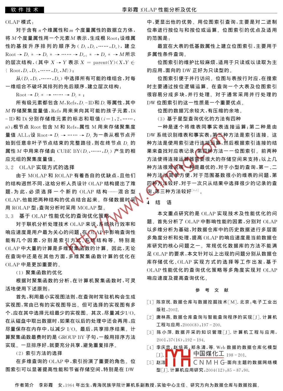 軟件技術(shù)李彩霞:OLAP性能分析及優(yōu)化OLAP性能分析及優(yōu)化李彩霞(青海民族學院計算機科學與技術(shù)系 青海西寧810007)摘要:數(shù)據(jù)倉庫存儲大量歷史數(shù)據(jù),OLAP應(yīng)用涉及到對大面積歷史數(shù)據(jù)的復(fù)雜查詢,查詢優(yōu)化是提高OLAP響應(yīng)速度的關(guān)鍵。目前最有效的方法是增加綜合數(shù)據(jù)存儲及查詢方式的優(yōu)化,但存儲空間的有限限制了綜合數(shù)據(jù)的存儲量。常規(guī)優(yōu)化數(shù)據(jù)庫的方法不能滿足OLAP的要求,針對以上出現(xiàn)的問題分別從數(shù)據(jù)倉庫存儲優(yōu)化.OLAP實現(xiàn)方式的選擇等工作出發(fā),基于OLAP性能優(yōu)化的查詢優(yōu)化策略等多角度實現(xiàn)對OLAP響應(yīng)速度及提高查詢優(yōu)化。對這個問題進行了深入的研關(guān)鍵詞:數(shù)據(jù)倉庫;OLAP;變粒度存儲策略;X-OLAP中圖分類號:TP311.131文獻標識碼:B文章編號:1004 - 373X(2006)18- 116-03Analysis and Optimization on OLAP CapabilityLI Caixia .(Department of Computer Science of Technology ,Qinghai Nationality University, Xining .810007.China)Abstract: Data warehouse stores volumes of historical data, and OLAP applications involve complex queries on these data.Queries optimization is the key of improving the speed of OLAP response. At present the most eftive way is to increase thestorage of general data and the way of queries, but the limited spaces restrict the storage of general data. The normal regula-tions is excellent to turn the method of the database can't satisfy the OLAP request, this text aims at the problem of the aboveemergence respectively from the data warehouse saving excellent turn, the OLAP realizes choice. work of the way sets out. Ac-cording to the function of OLAP the excellent the search that turn is excellent to turn strategy , many the angle realizes to re-spond to the OLAP speed and increase the search is excellent to turn, This paper studies it deeply on this problem.Keywords:data warehouse;OLAP ;variable granularity storage method;X - OLAP數(shù)據(jù)進行多層面多角度分析和處理。由于歷史數(shù)據(jù)只能1引言追加而不能被刪除的特點使得數(shù)據(jù)倉庫中的數(shù)據(jù)量極大,聯(lián)機數(shù)據(jù)分析系統(tǒng)(On - Line Analytical Processing,而且隨時間推移,數(shù)據(jù)量不斷按年增長,嚴重影響了OLAP)是關(guān)系型數(shù)據(jù)庫之父E. F. Codd 1993 提出的,當OLAP的響應(yīng)速度。因此,提高OLAP的響應(yīng)速度是當前時,E. F. Codd認為OLTP已不能滿足終端用戶對數(shù)據(jù)庫.數(shù)據(jù)倉庫研究的核心問題之一。常規(guī)優(yōu)化數(shù)據(jù)庫的方法查詢分析的需要,用戶的決策分析需要對關(guān)系數(shù)據(jù)庫進行不能滿足OLAP的要求,減小OLAP過程中的動態(tài)計算大量計算才能得到結(jié)果,而查詢的結(jié)果并不能滿足決策者機,事先存儲OLAP查詢所需要綜合數(shù)據(jù)等手段是提高提出的需求,因此他提出了多維數(shù)據(jù)庫和多維分析的概.OLAP響應(yīng)速度的有效途徑。以往研究數(shù)據(jù)倉庫時都是念,即OLAP。將數(shù)據(jù)以最小粒度存儲在數(shù)據(jù)倉庫中作為基本數(shù)據(jù)。OLAP是針對特定問題的聯(lián)機數(shù)據(jù)訪問和分析。通OLAP更關(guān)心數(shù)據(jù)發(fā)展變化的趨勢,大量的細粒度數(shù)據(jù)具過對信息很多種可能的觀察形式進行快速穩(wěn)定.-致和有很大的隨機性,0LAP很少直接對他進行分析處理,往交互性的存取,允許管理決策人員對數(shù)據(jù)進行深入觀察。往要將這些數(shù)據(jù)聚集到-定的粗粒度數(shù)據(jù)后才用來進行OLAP的基本分析動作包括:數(shù)據(jù)切片、 數(shù)據(jù)切塊、數(shù)據(jù)鉆分析處理。本文針對以上出現(xiàn)的問題從多角度實現(xiàn)對取、數(shù)據(jù)聚合、數(shù)據(jù)旋轉(zhuǎn)。OLAP通過對數(shù)據(jù)庫中的數(shù)據(jù)OLAP響應(yīng)速度及提高查詢優(yōu)化。進行相應(yīng)的操作從多個角度、多個側(cè)面進行快速、一致和2相關(guān) 知識點交互地存取,從而使分析人員能夠?qū)?shù)據(jù)進行深入的分析觀察凹。中國煤化工的邏輯通常稱為OLAPOLAP是基于數(shù)據(jù)倉庫的,而數(shù)據(jù)倉庫存儲大量的歷的實現(xiàn)MYHC N M H C接影響其響應(yīng)速度。現(xiàn)史數(shù)據(jù)。OLAP以多維分析為基礎(chǔ),對數(shù)據(jù)倉庫中的歷史階段OLAP實現(xiàn)途徑主要有3種: ROLAP, MOLAP和HOLAP。ROLAP 基于關(guān)系數(shù)據(jù)庫的數(shù)據(jù)存儲,通常采用收稿日期:2006 -05-16星型模式或雪花模式存儲數(shù)據(jù),而MOLAP采用多維數(shù)組116《現(xiàn)代電子技術(shù)》2006年第18期總第233期D嵌入式與單片機<模式進行數(shù)據(jù)存儲。ROLAP可擴展性好,但查詢過程中調(diào)整。因此,對數(shù)據(jù)集的粒度訪問頻率f。設(shè)定一個閾值需要進行表關(guān)聯(lián),很難滿足聯(lián)機分析處理要求的快速響.fn。訪問頻率隨時間推移不斷變化,為防止動態(tài)調(diào)整過于應(yīng);MOLAP響應(yīng)速度快,但可擴展性差;HOLAP是RO-頻繁,并由此影響OLAP響應(yīng)速度,設(shè)定一個訪問頻率下LAP和MOLAP的混合,希望能兼具ROLAP的可擴展優(yōu)偏系數(shù),即當連續(xù)出現(xiàn)多個訪問頻率小于設(shè)定的閾值時,勢和MOLAP的快速響應(yīng)優(yōu)勢凹才進行動態(tài)調(diào)整。視圖物化數(shù)據(jù)倉庫的數(shù)據(jù)量 規(guī)模