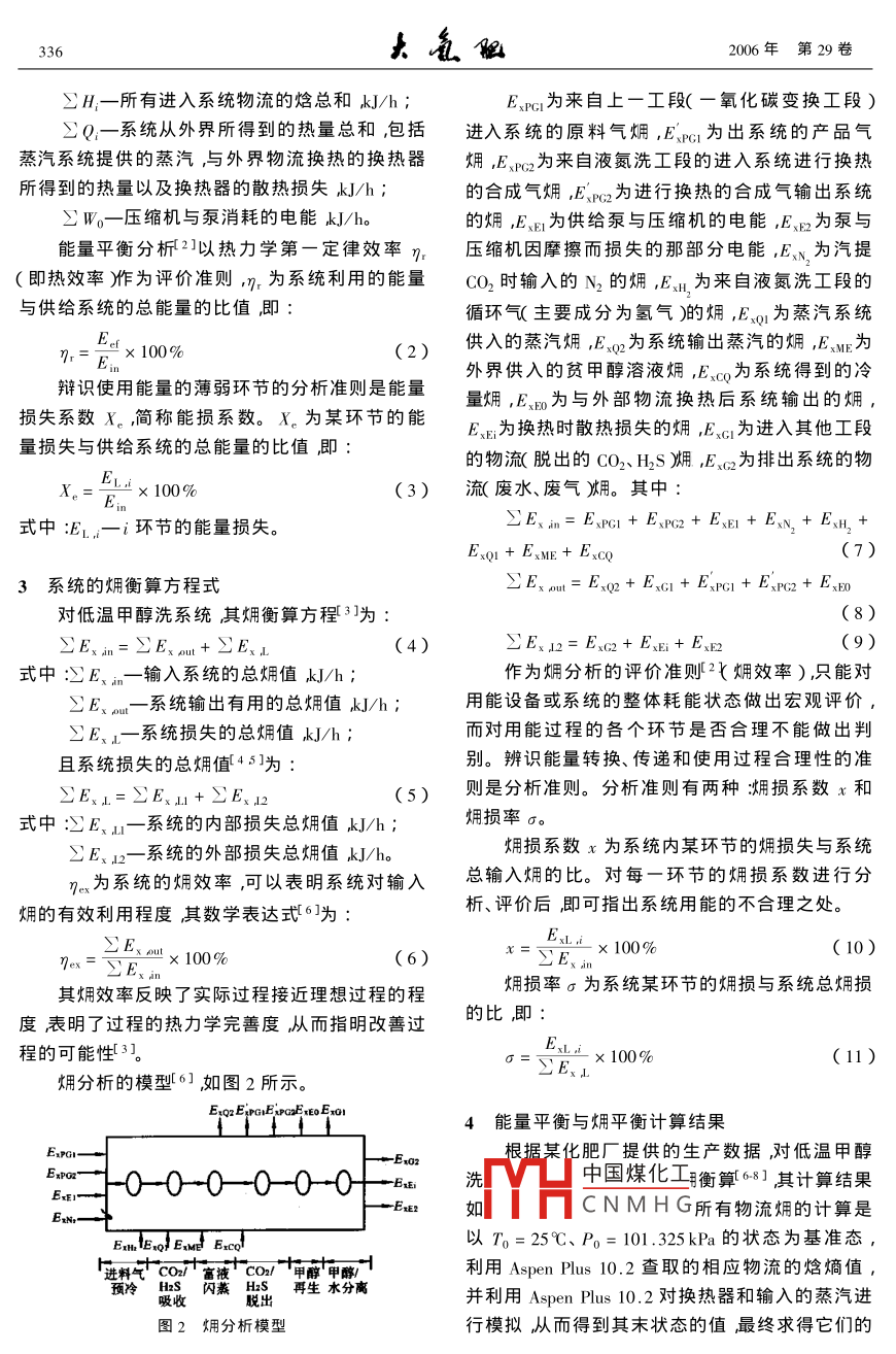2006年10月Oct,2006第29卷第5期Large Scale Nitrogenous Fertilizer IndustryVol 29 No 5低溫甲醇洗過(guò)程爛分析雷云霞馮霄(西安交通大學(xué)化工系陜西西安,710049)摘要根據(jù)某化肥廠合成氨系統(tǒng)中的低溫甲醇洗工段的工藝建立了爛分析模型。對(duì)甲醇洗系統(tǒng)進(jìn)行了烱分析并且與能量分析進(jìn)行了比較分析系統(tǒng)用能的薄弱之處提岀相應(yīng)的改進(jìn)措施。關(guān)鍵詞低溫甲醇洗系統(tǒng)傭分析改進(jìn)途徑中圖分類號(hào):rQ113.26文獻(xiàn)標(biāo)識(shí)碼B文章編號(hào):002-578x200605-0335-04在凈化氬氣的一系列工段中需要耗費(fèi)大量1低溫甲醇洗系統(tǒng)的組成的能量。為了揭示系統(tǒng)用能的合理性達(dá)到節(jié)能低溫甲醇洗系統(tǒng)采用林德技術(shù)五塔流程分的目的本文采用以熱力學(xué)第二定律為基礎(chǔ)的烔為冷區(qū)和熱區(qū)。冷區(qū)由甲醇洗滌塔、二氧化碳解分析法對(duì)凈化氬氣工藝中的低溫甲醇洗工段進(jìn)吸塔和硫化氬濃縮塔組成;熱區(qū)由甲醇熱再生塔行分析和甲醇/水分離塔組成流程如圖1SIcCHE3SIc圖1低溫甲醇洗系統(tǒng)流程CI—甲醇洗滌塔匯2—二氧化碳解吸塔;3—-硫化氬濃縮塔;4—甲醇熱再生塔;5—甲醇/水分離塔;I-原料氣;2一尾氣3-CO3δ4一產(chǎn)品氣δ5一N2S6-H2S7一廢水8—甲醇⑧9一—H2S10—來(lái)自液氮洗工段進(jìn)行換熱的合成氣“1|一換熱后的合成氣配—原料氣冷卻器Σ一甲醇氨冷器霪3—循環(huán)甲醇冷卻器;4—甲醇冷卻器;—甲醇/水分離罐;V2-1循環(huán)氣閃蒸罐;3一2*循環(huán)氣閃蒸罐;4—硫化氬分離罐;5一甲醇閃蒸罐整個(gè)系統(tǒng)主要是為了凈化來(lái)自一氧化碳變換2系統(tǒng)的能量衡算方程式工段的進(jìn)料氣。由于一氧化碳變換后的變換氣中對(duì)于低溫甲醇洗系統(tǒng),它的能量平衡方程1除了含有氨合成反應(yīng)所需要的H2、N2以外還含為有CO、CO2、H2S以及COS等成分這些氧化物和中國(guó)煤化工:w(1)硫化物都是合成氨催化劑的毒物然而CO2又是式THCNMHG物流的焓總和A/h生產(chǎn)尿素的原料而且一氧化碳、硫化物又可進(jìn)步回收利用故在此采用低溫甲醇洗滌法得到純收稿日期2006-03-07收到修改稿日期200607-25。凈H2的同時(shí),又對(duì)它們分別脫出并加以回收利作者簡(jiǎn)介雷云霞女,1980年出生,西安交通大學(xué)化學(xué)工程用專業(yè)碩士研究生。E- mail yxlei@ stu. xJtu,edu,cn2006年第29卷∑H一所有進(jìn)入系統(tǒng)物流的焓總和kJ/hEsr為來(lái)自上一工段(一氧化碳變換工段)∑Q一系統(tǒng)從外界所得到的熱量總和,包括進(jìn)入系統(tǒng)的原料氣嫻,E1為出系統(tǒng)的產(chǎn)品氣蒸汽系統(tǒng)提供的蒸汽與外界物流換熱的換熱器嫻,E、為來(lái)自液氮洗工段的進(jìn)入系統(tǒng)進(jìn)行換熱所得到的熱量以及換熱器的散熱損失kJ/h的合成氣,E為進(jìn)行換熱的合成氣輸出系統(tǒng)∑W一壓縮機(jī)與泵消耗的電能kJ/h的,E、E為供給泵與壓縮機(jī)的電能,E為泵與能量平衡分析2以熱力學(xué)第一定律效率n壓縮機(jī)因摩擦而損失的那部分電能,EN為汽提(即熱效率作為評(píng)價(jià)準(zhǔn)則,為系統(tǒng)利用的能量CO2時(shí)輸入的N2的嫻,EM為來(lái)自液氮洗工段的與供給系統(tǒng)的總能量的比值即循環(huán)氣主要成分為氫氣)的烔,E、o為蒸汽系統(tǒng)E7r=p×100%(2)供入的蒸汽烔,E2為系統(tǒng)輸出蒸汽的煩,E3M為外界供入的貧甲醇溶液烔,E3c為系統(tǒng)得到的冷辯識(shí)使用能量的薄弱環(huán)節(jié)的分析準(zhǔn)則是能量量爛,E為與外部物流換熱后系統(tǒng)輸岀的燸損失系數(shù)κ。簡(jiǎn)稱能損系數(shù)。X。為某環(huán)節(jié)的能E、.為換熱時(shí)散熱損失的,E、c為進(jìn)入其他工段量損失與供給系統(tǒng)的總能量的比值即的物流(脫出的CO2H2S嫻,E2為排出系統(tǒng)的物EX,=E=×100%(3)流廢水、廢氣冰用。其中式中:E1,一i環(huán)節(jié)的能量損失∑E、m=E、P1+E、P+EE1+EN+E3H,+E3系統(tǒng)的煳衡算方程式∑E3xmt=E、+En+EP1+E2+E對(duì)低溫甲醇洗系統(tǒng)其畑衡算方程3)為(8)∑Exmn=∑Exm+∑E(4)∑E、12=E2+E、E+E、B(9)式中E、一輸入系統(tǒng)的總焆值kJ/h作為爛分析的評(píng)價(jià)準(zhǔn)則嫻效率)只能對(duì)∑E、灬一系統(tǒng)輸出有用的總爛值kJ/h用能設(shè)備或系統(tǒng)的整體耗能狀態(tài)做出宏觀評(píng)價(jià)ΣE、』一系統(tǒng)損失的總焆值忒J/h而對(duì)用能過(guò)程的各個(gè)環(huán)節(jié)是否合理不能做出判且系統(tǒng)損失的總傭值451為別。辨識(shí)能量轉(zhuǎn)換、傳遞和使用過(guò)程合理性的準(zhǔn)∑E、=∑E、M+∑E、n2(5)則是分析準(zhǔn)則。分析準(zhǔn)則有兩種:損系數(shù)x和式中E、1一系統(tǒng)的內(nèi)部損失總煳值kJ/h傭損率σ?!艵、』2一系統(tǒng)的外部損失總煳值kJ/h烱損系數(shù)x為系統(tǒng)內(nèi)某環(huán)節(jié)的畑損失與系統(tǒng)的為系統(tǒng)的效率可以表明系統(tǒng)對(duì)輸入總輸入的比。對(duì)每一環(huán)節(jié)的損系數(shù)進(jìn)行分燈的有效利用程度其數(shù)學(xué)表達(dá)式6為析、評(píng)價(jià)后即可指出系統(tǒng)用能的不合理之處。100%(6)∑E×100%(10)∑E、其爛效率反映了實(shí)際過(guò)程接近理想過(guò)程的程煩損率σ為系統(tǒng)某環(huán)節(jié)的畑損與系統(tǒng)總損度表明了過(guò)程的熱力學(xué)