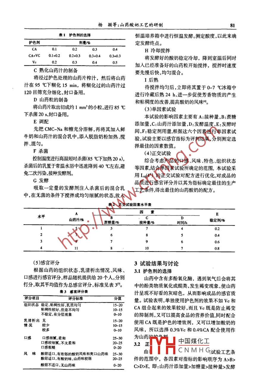 〈窕業(yè)科學(xué)與披木》2008年第2期(總第129期)山藥酸奶工藝的研制楊穎,徐桂花(寧夏大學(xué)農(nóng)學(xué)院食品系,寧夏銀川750021)摘要:以新鮮牛奶為原料加入熟化后的山藥汁經(jīng)處理后通過(guò)正交試驗(yàn),再添加山藥果粒加工而研制出一種氣味濃郁、口感爽滑、酸甜可口,集酸奶和山藥的營(yíng)養(yǎng)保健于一體的新型發(fā)酵飲料。關(guān)鍵詞:山藥酸奶;發(fā)酵;制備工藝中田分類號(hào):TS25254文獻(xiàn)標(biāo)識(shí)碼:A文章編號(hào):1671-5187(200802-008004Study on Technology of Chinese Yam YogurtYang Ying, Xu Guihua(Food Department College of Agriculture Ningxia University, Yinchuan of Ningxia 750021, P. R. China)Abstract: This experiment develops a new fermen ted beverage using chinese yam and milk as rawmaterial by orthogonal test and other processing. Granules of Chinese yam are added into thehas full-bodied flavor, smooth and good acid-sweet taste, and has nouritionalvaluechineseKey word: Chinese yam yogurt; fermentation; processing technology1前言2試驗(yàn)材料與方法山藥又稱薯蕷,其塊莖呈圓柱形。據(jù)試驗(yàn)分21試驗(yàn)材料析,鮮山藥中含有3%的蛋白質(zhì)16%的淀粉。山新鮮山藥(市售),鮮牛奶(市售,脫脂奶粉(內(nèi)藥的含鐵量是人參的3-4倍,其還含有豐富的黏蒙古伊利實(shí)業(yè)集團(tuán)股份有限公司提供),蔗糖(超液質(zhì)、膽堿、皂甙、植酸、自由氨基酸、多酚氧化酶市售),乳酸菌:雙歧桿菌(北京川秀公司提供),羧以及鎂、磷、鉀等金屬元素。甲基纖維素鈉(CMC-Na),抗壞血酸(VC),檸檬酸山藥對(duì)于預(yù)防冠心病有很大作用;可以提高(CA)(均來(lái)自北京化工廠)。身體抗病能力;可作為高血壓的預(yù)防食品。在實(shí)萬(wàn)分之一分析天平(梅特勒托力多儀器(上際應(yīng)用中,可用于消除疲勞,對(duì)于精力減退及虛弱海)有限公司);恒溫水浴鍋HHs型(上海醫(yī)療器體質(zhì)者特具功效。在民間療法中,山藥被用為外科械廠);控溫儀電熱鼓風(fēng)干燥箱WK-126型(江蘇消炎退腫藥,對(duì)火傷及霜凍的療效頗佳。電器冷作五金廠);生化培養(yǎng)箱LRH-150B型(廣山藥酸奶是以新鮮山藥和牛奶為主要原料加?xùn)|省醫(yī)療器械廠);安蜜爾多功能食品加工機(jī)(廣工而成的一種綜合了山藥和酸奶的營(yíng)養(yǎng)價(jià)值東省中山市東風(fēng)鎮(zhèn)安蜜爾電器廠)。體的新型酸奶,它更利于吸收,且適合各類人群飲22試驗(yàn)方法用,添加的山藥果粒同時(shí)賦予產(chǎn)品獨(dú)特的品質(zhì),是(1)工藝流程理想的健康飲品。過(guò)篩←糊化←榨汁←護(hù)色←切片←清洗去皮←新鮮山藥新鮮山藥→切?!o(hù)色→預(yù)煮熟化鮮牛奶→預(yù)熱調(diào)配→殺菌→接種→攪拌混合→恒溫培養(yǎng)→冷卻→加入預(yù)備好的山藥粒攪拌→后熟→成品(2)操作要點(diǎn)A山藥預(yù)處理M凵中國(guó)煤化工用一些試劑目將新鮮的山藥洗凈后去皮,切成厚度均勻的前供CNMHG酸、抗壞血酸片立即放入已配好的護(hù)色液。亞硫酸型評(píng)這里遠(yuǎn)兒種不同濃度的組合進(jìn)行護(hù)色效果的試驗(yàn)收稿日期:2007-12-23楊穎等:山藥酸奶工藝的研制表1護(hù)色劑的選擇恒溫培養(yǎng)箱中進(jìn)行恒溫發(fā)酵。測(cè)定酸度,以此來(lái)確護(hù)色劑劑量/%定發(fā)酵終點(diǎn)。H冷卻攪拌CA+vC0.1+0.20.2+030.3+0403+03將發(fā)酵好的酸奶穩(wěn)定冷卻,降到室溫后同時(shí)加人已經(jīng)準(zhǔn)備好的山藥粒開(kāi)始攪拌,攪拌時(shí)速度C熟化山藥汁的制備要先慢后快,均勻混合。將經(jīng)過(guò)護(hù)色處理的山藥片榨汁,然后將山藥I后熟汁在95℃下糊化15將糊化過(guò)的山藥汁過(guò)待攪拌均勻后,立即將其置于0-7℃冰箱中120目篩充分細(xì)化,封口備用進(jìn)行冷藏后熟24h,進(jìn)一步促使芳香物質(zhì)的產(chǎn)生D山藥粒的制備和粘稠度的改善提高酸奶的風(fēng)味門(mén)。將山藥片取出切成約1mm3的小粒進(jìn)行85℃(3)單因素試驗(yàn)下殺菌20s,封口備用。本試驗(yàn)的影響因素主要有A:接種量,B:蔗糖E調(diào)配添加量,C:山藥汁添加量,D:發(fā)酵溫度,E:發(fā)酵時(shí)先把CMC-Na和糖充分溶解,再將其加入鮮間,F:穩(wěn)定劑用量根據(jù)這六個(gè)因素進(jìn)行單因素試牛奶和山藥汁的混合乳中,添人脫脂奶粉加熱、攪驗(yàn)試驗(yàn)主要以感官指標(biāo)為評(píng)判結(jié)果,分別測(cè)定選拌、混勻。擇最佳的因素?cái)?shù)值。F殺菌(4)正交試驗(yàn)控制溫度進(jìn)行高溫短時(shí)殺菌(85℃下加熱20s)綜合考慮產(chǎn)品的口感風(fēng)味特色、組織狀態(tài)殺菌后的乳置于常溫水浴中迅速降到40℃左右避等因素結(jié)合單因素試驗(yàn)所確定的范圍,本試驗(yàn)采免二次污染,接種發(fā)酵劑用Ld45)的正交試驗(yàn)對(duì)配方進(jìn)行優(yōu)化,對(duì)成品的G發(fā)酵品質(zhì)進(jìn)行感官評(píng)分并以其為指標(biāo)確定最佳的生產(chǎn)吸取一定量的發(fā)酵劑注入殺菌后的混合乳工藝條件得出最佳的山藥酸奶的配方。中,在無(wú)菌的條件下攪拌成均勻細(xì)膩的狀態(tài)放入2正交試驗(yàn)因素水平表水平E山藥汁偉蔗糖量%接種量穩(wěn)定劑%10(5)感官評(píng)分3試驗(yàn)結(jié)果與討論根據(jù)山藥的組織狀態(tài)乳清析出情況、風(fēng)味、3.1護(hù)色劑的選擇口感進(jìn)行感官評(píng)分樣品隨機(jī)提供給20個(gè)人,分別山藥中含有多酚