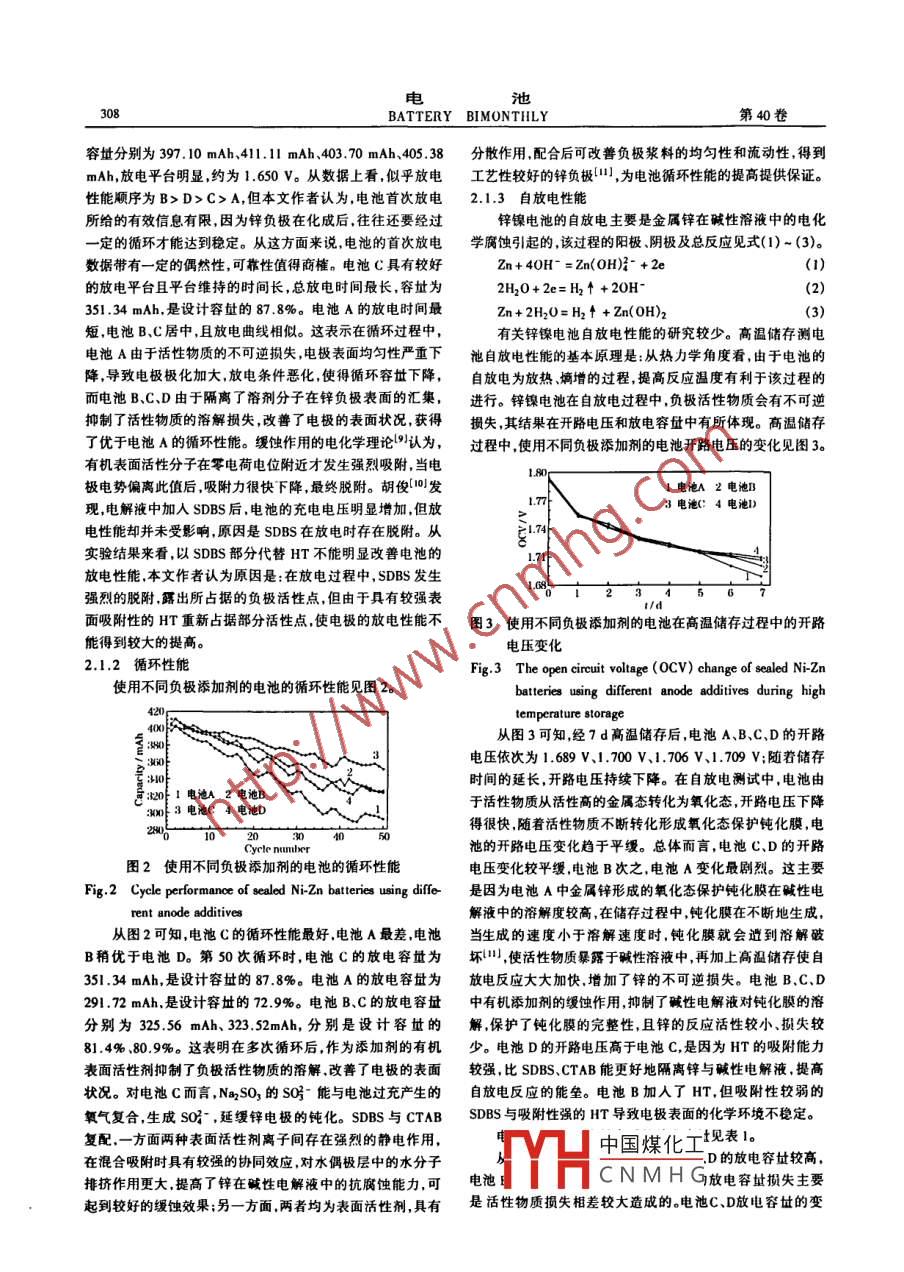 第40卷第6期電Vol. 40, No.62010年12月BATTERY BIMONTHLYDc. ,2010電解液用量及負極添加劑對鋅鎳電池的影響曾冬青',楊占紅',王升威',申松勝2(1.中南大學化學化工學院,湖南長沙410083; 2.新鄉(xiāng)聯(lián)達華中電源有限公司,河南新鄉(xiāng)453731)摘要:考察了六次甲基四胺(HT).+二烷基苯磺酸鈉(SDBS).十六烷基三甲基溴化銨(CTAB).亞硫酸鈉( NarSO3)作為負極添加劑對密封AA型鋅鎳電池充放電、循環(huán)和自放電性能的影響,以及電解液用量對電池循環(huán)性能的影響。鋅負極中同時加入SDBS、CTAB、Na2SO3的電池,第50次循環(huán)(1.0 C恒流充放電)的放電容量為設(shè)計容量(400 mAh)的87.8%,常溫存放28 d后和50 C下存放7 d后的放電容量分別為331.00 mAh和309. 10 mAh,是設(shè)計容量的82.8%和77.3%。對于設(shè)計容量為400 mAh的電池,電解液的較佳用量為2.5 go關(guān)鍵詞:鋅鎳電池;鋅負極;添加劑;電解液; 自放電 .中圍分類號:TM912.2文獻標識碼:A文章編號: 1001 - 1579(2010)06 - 0306- 04Effects of electrolyte amount and anode additives on Ni-Zn batteryZENG Dong-qing' , YANG Zhan-hong , WANG Sheng- wei',SHEN Song-sheng2(1. Colle of Chemistry & Chemical Engiering. Central South University, Changsha, Hunan 410083, China;2. Xinxiang Lianda Huazhong Power Source Lid.,Xinxiang , Henan 453731, China)Abstract: The efects of anode additives such as hexamethylene tetramine ( HT), sodium dodecyl benzene sulfonate ( SDBS),cetyl-trimethyl ammonium bromide (CTAB) and sodium sulfite (Na2SO3) on the performance of charge discharge ,cyele and sel-.discharge of sealed AA type Ni-Zn battery , and the efcets of electrolyte amount on the cycle performance of the battery were inves-tigated. The discharge capacity of the battery adding SDBS, CTAB, Na2SO3 simulancously was 87.8% of the designed capacity(400 mAh)at the 50th cycle( galvanostatic charge discharge at 1.0 C). The discharge capacities of the same after stored at normaltemperature for 28 d and 50心for 7 d were 331.00 mAh and 309. 10 mAh, rspectiveye, which represented 82.8% and 77.3% ofthe designed capacity. The prelerable electrolyte amount was 2.5 g to the Ni-Zn battery with a designed capacity of 400 mAh.Key words: Ni-Zn battery; zinc electrode; additive; ectrolyte; self discharge提高鋅鎳電池實用性能的重點在鋅負極和電解液,并可得結(jié)論具有局限性,它們在密封電池中的應(yīng)用值得探討。歸結(jié)為兩類:①對鋅負極的活性物質(zhì),如鋅酸鈣[1.ZnO的本文作者以六次甲基四胺(HT).十二烷基苯磺酸鈉Sn包覆物(2等改性或再造.以降低金屬鋅的反應(yīng)活性,抑制(SDBS)、十六烷基三甲基溴化銨(CTAB)、亞硫酸鈉ZnO在堿性電解液中的不可逆溶解.但工藝復(fù)雜,尚不能大(Na2S0O,)或它們的組合為鋅負極添加劑,研究了鋅負極添加規(guī)模生產(chǎn);②向鋅負極或電解液中加入添加劑.對鋅電極的劑及電解液用址對密封鋅鎳電池的影響。陽極或陰極過程施加影響,無機添加劑有In$3、.Bi、Sn 等元1實驗素的氧化物. ZnSO}4]等,有機添加劑有聚乙二醇600l51、含氟表面活性劑(0]、吐溫-20171、烷基數(shù)為12~ 16的烷基三甲1.1 極片的制作基溴化銨[B等。對添加劑的研究多為開口或半開口體系,所.將質(zhì)址比為79.6: 10.0:7.0:3.0:0.4:45.0的Ni(OH)2作者簡介:曾冬青(1985-),男,湖南人,中南大學化學化工學院碩士生,研究方向:化學電源及新材料;楊占紅(1969- ),男,河南人,中南大學化學化工學院教授,博士生中國煤化工,本文聯(lián)系人: .王升威(1982-).男,山東人,中南大學化學化工學院博士生,研究申松勝(1975-),男,河南人,河南新鄉(xiāng)聯(lián)達華中電源有限公司工程MYHCNMHG基金項目:廣東省教育部產(chǎn)學研結(jié)合項目(2010B090400341) ,2010年度科技型中小企業(yè)技術(shù)創(chuàng)斷基金( 10C26214104497)第6期曾冬青,等:電解液用量及負極添加劑對鋅鎳電池的影響07(無錫產(chǎn),電池級)、CoO(無錫產(chǎn),電池級)、石墨(青島產(chǎn),電池2.15廠I a首次循環(huán)2rx級)、聚四氟乙烯(PTFE,上海產(chǎn),電池級)、羧甲基纖維素鈉1.00(CMC,上海產(chǎn),電池級)和水在不斷攪拌的條件下調(diào)成璺綠色漿料,用刮板將漿料均勻涂牧于1.60土0.05 mm厚的泡1.85沫鎳(無錫產(chǎn),孔數(shù)PPI為70~ 110)基體上。在30心下自然1.70干燥16 h后,輥壓至0.65土0.02 mm厚,再剪切為30 mmxld1.5550 mm,經(jīng)清粉點焊等工序,制得正極片。將質(zhì)址比為69. 3:9.9:9.9:4.9:3.0: 1.0:1.0:0.4:0.4:1.400.2:42.0的Zn0(上海產(chǎn),AR) .Zn粉(上海產(chǎn),AR,300目)、11 min自制鋅酸鈣川、石壘、PTFE、Ca( OH)2(上海產(chǎn), AR).CMC.215-fb第5)次循環(huán)SnO2(長沙產(chǎn),AR)、六偏磷酸鈉(天津產(chǎn), AR)、負極添加劑2.00和水在不斷攪拌的條件下調(diào)成粘稠狀漿料,通過拉漿法制得濕態(tài)負極。在30 C下自然干燥12 h后,輥壓至0.30x 0.01mm厚,再剪切為34 mmx 100 mm,制得負極片。以HT(長沙產(chǎn),AR)、SDBS(天津產(chǎn),AR)+ CTAB(長沙產(chǎn),AR) +Na2SO3(長沙產(chǎn), AR)(質(zhì)址比為2:1:1)及HT + SDBS(質(zhì)址比為1:1)為添加劑的負極,依次記為負極B.C、D,不使用添1.4d小56 70加劑的負極記為負極A。1/min1.2密封鋅鎳電池的組裝I電池^2電池B3電池(°4電池Dc充電d|放電電池的設(shè)計容址為400 mAh,正極限容.正、負極容址比圖1使用不同負 極添加劑的電池的充放電曲線為1.0:2.8。隔膜為CP-1聚乙烯微孔膜(上海產(chǎn))和維綸18Fig. 1 The charge discharge curves of sealed Ni-Zn batteries隔膜(河南產(chǎn))兩層(聚乙烯微孔膜靠近負極);電解液為using different anode additives6.3 mol/L KOH(廣東產(chǎn),