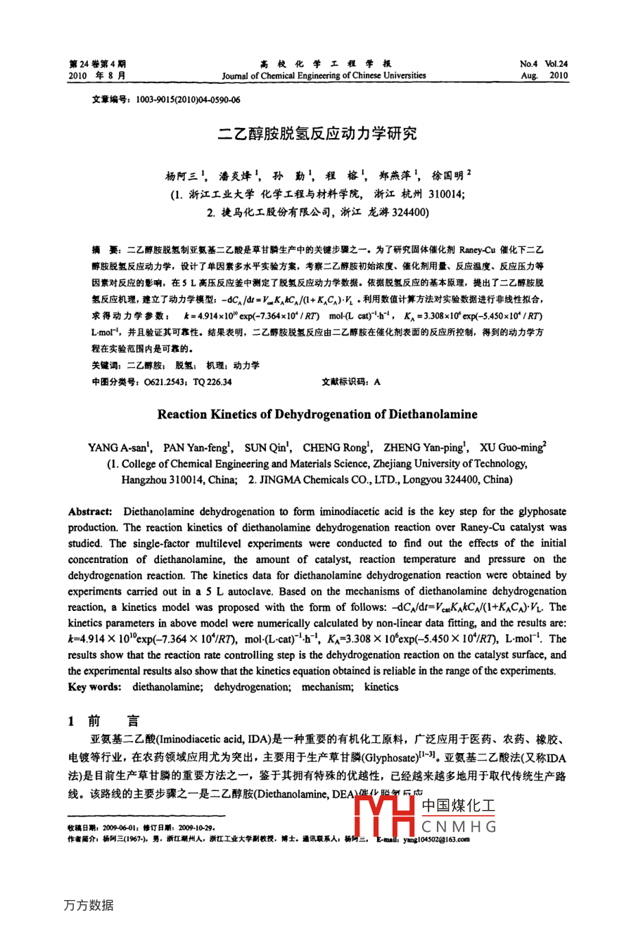 第24卷第4期No 4010年8月Joumal of Chemical Engineering of Chinese Universities文章編號(hào):1003-9015(2010)04059006二乙醇胺脫氫反應(yīng)動(dòng)力學(xué)研究櫪阿三,潘炎烽!,孫勤!,程榕!,鄭燕萍,徐國(guó)明(1.浙江工業(yè)大學(xué)化學(xué)工程與材料學(xué)院,浙江杭州310014;2.捷馬化工股份有限公司,浙江龍游324400搞要:二乙醇胺脫氫制亞氨基二乙酸是草甘瞬生產(chǎn)中的關(guān)鍵步驟之一·為了研究固體催化劑 Raney-Cu催化下二乙醇胺脫氫反應(yīng)動(dòng)力學(xué),設(shè)計(jì)了單因素多水平實(shí)驗(yàn)方案,考察二乙醇胺初始濃度、催化劑用量、反應(yīng)溫度、反應(yīng)壓力等因素對(duì)反應(yīng)的影響,在5L高壓反應(yīng)釜中測(cè)定了脫氫反應(yīng)動(dòng)力學(xué)數(shù)據(jù)。依據(jù)脫氫反應(yīng)的基本原理,提出了二乙醇胺脫氫反應(yīng)機(jī)理,建立了動(dòng)力學(xué)模型:-dC4/d= VK.k/(+KCA),F,利用數(shù)值計(jì)算方法對(duì)實(shí)驗(yàn)數(shù)據(jù)進(jìn)行非線性擬合,求得動(dòng)力學(xué)參數(shù):k=4.914×10°exp(-7-364×10°/Rn) mol-L cat)"h",KA=3308x10°sxp(-5450×10°/RnLmor,并且驗(yàn)證其可靠性。結(jié)果表明,二乙醇胺脫氫反應(yīng)由二乙醇胺在催化劑表面的反應(yīng)所控制,得到的動(dòng)力學(xué)方程在實(shí)驗(yàn)范圍內(nèi)是可靠的關(guān)鍵詞:二乙醇胺;脫氫;機(jī)理;動(dòng)力學(xué)中圖分類號(hào):06212543;TQ22634文獻(xiàn)標(biāo)識(shí)碼:AReaction Kinetics of Dehydrogenation of DiethanolamineYANG A-san, PAN Yan-feng, SUN Qin, CHENG Rong, ZHENG Yan-ping, XU Guo-ming(1. College of Chemical Engineering and Materials Science, Zhejiang University of Technology,Hangzhou 310014, China; 2. JINGMA Chemicals CO, LTD, Longyou 324400, China)Abstract: Diethanolamine dehydrogenation to form iminodiacetic acid is the key step for the glyphosateproduction. The reaction kinetics of diethanolamine dehydrogenation reaction over Raney-Cu catalyst wasstudied. The single-factor multilevel experiments were conducted to find out the effects of the initialconcentration of diethanolamine, the amount of catalyst, reaction temperature and pressure on thedehydrogenation reaction. The kinetics data for diethanolamine dehydrogenation reaction were obtained byexperiments carried out in a 5L autoclave. Based on the mechanisms of diethanolamine dehydrogenationreaction, a kinetics model was proposed with the form of follows: -dcw/dr=VeakAkCN/(1+KACA VL Thekinetics parameters in above model were numerically calculated by non linear data fitting, and the results are:k=4914×10xp(-7.364×10Rn, mol ( L cat).H',K-308×10exp(-5450×10/Rn, L-mol.Theresults show that the reaction rate controlling step is the dehydrogenation reaction on the catalyst surface, andthe experimental results also show that the kinetics equation obtained is reliable in the range of the experimentsKey words: diethanolamine; dehydrogenation; mechanism; kinetics1前言亞氨基二乙酸( minodiacetic acid,DDA)是一種重要的有機(jī)化工原料,廣泛應(yīng)用于醫(yī)藥、農(nóng)藥、橡膠電鍍等行業(yè),在農(nóng)藥領(lǐng)域應(yīng)用尤為突出,主要用于生產(chǎn)草甘膦( Glyphosate-亞氨基二乙酸法(又稱DA法)是目前生產(chǎn)草甘膦的重要方法之一,鑒于其擁有特殊的優(yōu)越性,已經(jīng)越來(lái)越多地用于取代傳統(tǒng)生產(chǎn)路線。該路線的主要步驟之一是二乙醇胺( Diethanolamine,DEA化中國(guó)煤化工收稿日期:2000601:修訂日期:2009-1029CNMHG作者簡(jiǎn)介:楊阿三(1967),男,浙江湖州人,浙江工業(yè)大學(xué)副教授,博士,通訊聯(lián)系人:楊阿算24卷第4期楊阿三等:二乙醇胺脫氬反應(yīng)動(dòng)力學(xué)研究當(dāng)前國(guó)內(nèi)使用IDA路線生產(chǎn)草甘膦的企業(yè),對(duì)于二乙醇胺脫氫反應(yīng)采用的都是間歇釜式工藝,國(guó)內(nèi)外的研究主要集中在二乙醇胺脫氫催化劑的研究、制備及其改良,以及脫氫反應(yīng)工藝條件的優(yōu)化上,力求提高產(chǎn)品收率,但未見(jiàn)關(guān)于脫氫動(dòng)力學(xué)的報(bào)道,沒(méi)有從反應(yīng)機(jī)理出發(fā)研究二乙醇胺脫氫反應(yīng)。未來(lái)關(guān)于二乙醇胺脫氫反應(yīng)的研究將逐步轉(zhuǎn)變到操作方式上,建立新的連續(xù)反應(yīng)系統(tǒng)將是研究的主要方向而連續(xù)化反應(yīng)系統(tǒng)的設(shè)計(jì)放大則必須以合適的脫氫反應(yīng)機(jī)理、準(zhǔn)確的本征動(dòng)力學(xué)模型1為基礎(chǔ)。本研究以 Raney-cu為催化劑,進(jìn)行二乙醇胺脫氫反應(yīng)動(dòng)力學(xué)實(shí)驗(yàn),獲取反應(yīng)動(dòng)力學(xué)數(shù)據(jù),探索脫氫反應(yīng)機(jī)理并建立動(dòng)力學(xué)模型。2實(shí)驗(yàn)部分Electromotor Pressure gauge21實(shí)驗(yàn)原料Raney-Cu負(fù)載型催化劑,二乙醇胺(≥99%),NaOH溶液Exhaustregulator(32%),去離子水,氮?dú)狻?2實(shí)驗(yàn)裝置脫氫反應(yīng)裝置為5L高壓反應(yīng)釜,帶無(wú)級(jí)變速磁力攪拌器和自動(dòng)控溫加熱套;氫氣排出量采用濕式氣體流量計(jì)計(jì)量。N2 ylinder stied autoclave Wet gas meter裝置流程圖見(jiàn)圖1。圖1實(shí)驗(yàn)裝置圖23實(shí)驗(yàn)條件Fig. I Scheme of experimental installation乙醇胺脫氫反應(yīng)動(dòng)力學(xué)實(shí)驗(yàn),考察二乙醇胺初始濃度、催化劑用量、反應(yīng)溫度以及反應(yīng)壓力對(duì)脫氫反應(yīng)速率的影響,進(jìn)行單因素下多水平實(shí)驗(yàn)考察,各因素水平以實(shí)際生產(chǎn)中的