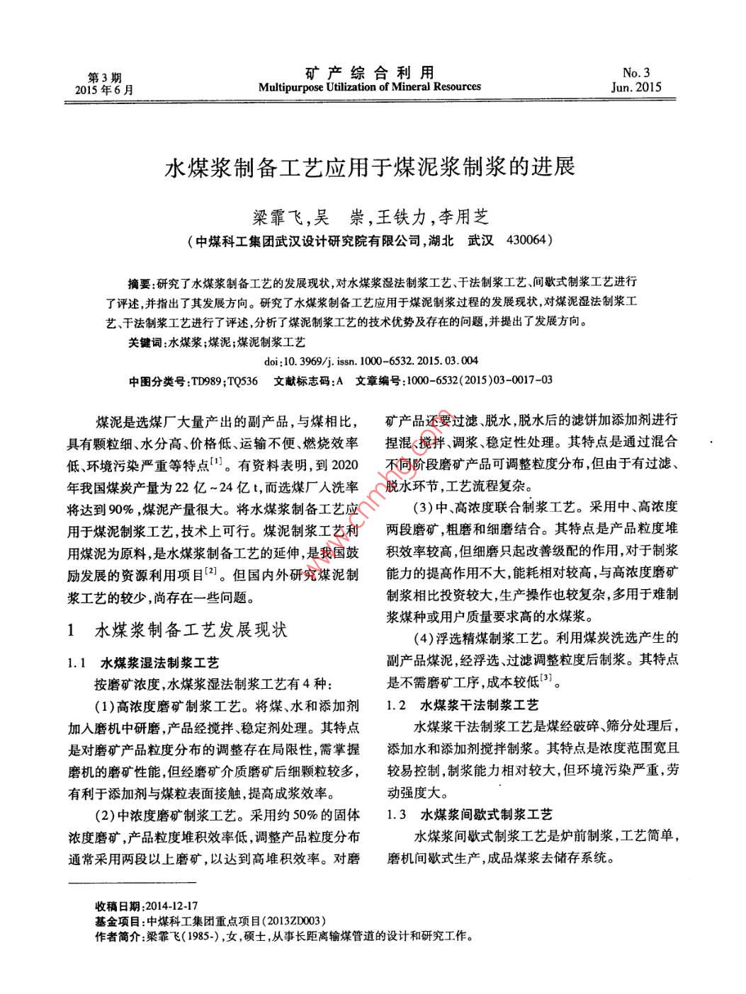 第3期礦產(chǎn)綜合利用No. 32015年6月Multipurpose Utilization of Mineral ResourcesJun.2015水煤漿制備工藝應(yīng)用于煤泥漿制漿的進(jìn)展梁霏飛,吳崇,王鐵力,李用芝(中煤科工集團(tuán)武漢設(shè)計研究院有限公司,湖北武漢430064)摘要:研究了水煤漿制備工藝的發(fā)展現(xiàn)狀,對水煤漿濕法制漿工藝、干法制漿工藝、間歇式制漿工藝進(jìn)行了評述并指出了其發(fā)展方向。研究了水煤漿制備工藝應(yīng)用于煤泥制漿過程的發(fā)展現(xiàn)狀,對煤泥濕法制漿工藝、干法制漿工藝進(jìn)行了評述,分析了煤泥制漿工藝的技術(shù)優(yōu)勢及存在的問題并提出了發(fā)展方向。關(guān)鍵詞:水煤漿;煤泥;煤泥制漿工藝doi:10.3969/jisn.1000-6532.2015.03.004中圖分類號:TD989;TQ536文獻(xiàn)標(biāo)志碼:A文章編號:10006532(201503-0017-03煤泥是選煤廠大量產(chǎn)出的副產(chǎn)品,與煤相比,礦產(chǎn)品還要過濾脫水脫水后的濾餅加添加劑進(jìn)行具有顆粒細(xì)、水分高、價格低、運輸不便、燃燒效率捏混、攪拌調(diào)漿穩(wěn)定性處理。其特點是通過混合低、環(huán)境污染嚴(yán)重等特點。有資料表明,到2020不同階段磨礦產(chǎn)品可調(diào)整粒度分布但由于有過濾、年我國煤炭產(chǎn)量為22億~24億t,而選煤廠入洗率脫水環(huán)節(jié),工藝流程復(fù)雜。將達(dá)到90%,煤泥產(chǎn)量很大。將水煤漿制備工藝應(yīng)3)中、高濃度聯(lián)合制漿工藝。采用中、高濃度用于煤泥制漿工藝,技術(shù)上可行。煤泥制漿工藝?yán)麅啥文サV,粗磨和細(xì)磨結(jié)合。其特點是產(chǎn)品粒度堆用煤泥為原料,是水煤漿制備工藝的延伸,是我國鼓積效率較高但細(xì)磨只起改善級配的作用,對于制漿勵發(fā)展的資源利用項目2。但國內(nèi)外研究煤泥制能力的提高作用不大,能耗相對較高,與高濃度磨礦漿工藝的較少,尚存在一些問題。制漿相比投資較大,生產(chǎn)操作也較復(fù)雜,多用于難制水煤漿制備工藝發(fā)展現(xiàn)狀漿煤種或用戶質(zhì)量要求高的水煤漿。(4)浮選精煤制漿工藝。利用煤炭洗選產(chǎn)生的1.1水煤漿濕法制漿工藝副產(chǎn)品煤泥經(jīng)浮選過濾調(diào)整粒度后制漿。其特點按磨礦濃度,水煤漿濕法制漿工藝有4種:是不需磨礦工序,成本較低(1)高濃度磨礦制漿工藝。將煤、水和添加劑1.2水煤漿干法制漿工藝加入磨機(jī)中研磨,產(chǎn)品經(jīng)攪拌、穩(wěn)定劑處理。其特點水煤漿干法制漿工藝是煤經(jīng)破碎、篩分處理后是對磨礦產(chǎn)品粒度分布的調(diào)整存在局限性,需掌握添加水和添加劑攪拌制漿。其特點是濃度范圍寬且磨機(jī)的磨礦性能但經(jīng)磨礦介質(zhì)磨礦后細(xì)顆粒較多,較易控制制漿能力相對較大,但環(huán)境污染嚴(yán)重,勞有利于添加劑與煤粒表面接觸,提高成漿效率。動強(qiáng)度大。(2)中濃度磨礦制漿工藝。采用約50%的固體1.3水煤漿間歇式制漿工藝濃度磨礦,產(chǎn)品粒度堆積效率低,調(diào)整產(chǎn)品粒度分布水煤漿間歇式制漿工藝是爐前制漿,工藝簡單,通常釆用兩段以上磨礦,以達(dá)到高堆積效率。對磨磨機(jī)間歇式生產(chǎn),成品煤漿去儲存系統(tǒng)。收稿日期:2014-127基金項目:中煤科工集團(tuán)重點項目(2013ZD003)作者簡介:梁霏飛(1985-),女,碩士,從事長距離輸煤管道的設(shè)計和研究工作。18礦產(chǎn)綜合利用015年2水煤漿制備工藝發(fā)展方向桶,加水?dāng)嚢璩蓾{,同時可添加添加劑,再經(jīng)泵送到篩子上,過濾去除大顆粒和雜物,篩上物外排,篩下目前我國水煤漿制備工藝正向大型化、規(guī)?;?、的煤漿成品則進(jìn)儲存系統(tǒng)供使用。煤泥干法制漿工多元化發(fā)展,主要發(fā)展方向為藝的優(yōu)點是濃度范圍大、濃度較易控制、制漿能力較(1)改進(jìn)現(xiàn)有水煤漿制備工藝并開發(fā)新工藝。大,缺點是入料量大時很難迅速被水潤濕,勞動強(qiáng)度不同原料煤的水煤漿制備工藝能耗、成本、產(chǎn)品質(zhì)量大,環(huán)境污染較嚴(yán)重。等各不相同,應(yīng)針對不同原料煤性質(zhì)及其成漿特性以及考慮添加劑與原料煤的反應(yīng)特性,選擇合適的4煤泥制漿工藝特點及發(fā)展方向水煤漿制備工藝,并開發(fā)新工藝。4.1煤泥制漿工藝優(yōu)勢及存在的問題2)拓寬水煤漿制備原料選用范圍。水煤漿制4.11煤泥制漿工藝優(yōu)勢備工藝產(chǎn)業(yè)化發(fā)展存在原料局限性問題。拓寬水煤煤泥制漿工藝流程比水煤漿制備工藝流程更簡漿制漿用煤品種我國低階煤價格低廉,儲量高于已單、所需設(shè)備更少。這是由于煤泥制漿工藝?yán)昧颂矫鲀α康?0%,開發(fā)低階煤制漿工藝是水煤漿制煤泥顆粒細(xì)、水分高的特性可不經(jīng)浮選和破碎磨備工藝的一個發(fā)展方向。另外,貧煤、貧瘦煤等變質(zhì)礦工藝也簡化或不需磨礦。煤泥制漿工藝還可與洗程度較高的煤種具有熱值高、成漿性好成本低等特煤工藝結(jié)合應(yīng)用,促進(jìn)洗煤工藝發(fā)展。點,今后利用其制漿是一個發(fā)展方向。工業(yè)排出的廢棄物具有一定的熱值,制漿用水可部分利用工業(yè)煤泥制漿工藝比水煤漿制備工藝更具經(jīng)濟(jì)意義,煤泥制漿工藝原料成本低,可就近制備煤泥漿供排出的廢棄物,制備水煤漿時適量添加,可降低制漿礦區(qū)現(xiàn)有數(shù)量可觀的中小型鍋爐燃用,不需長時