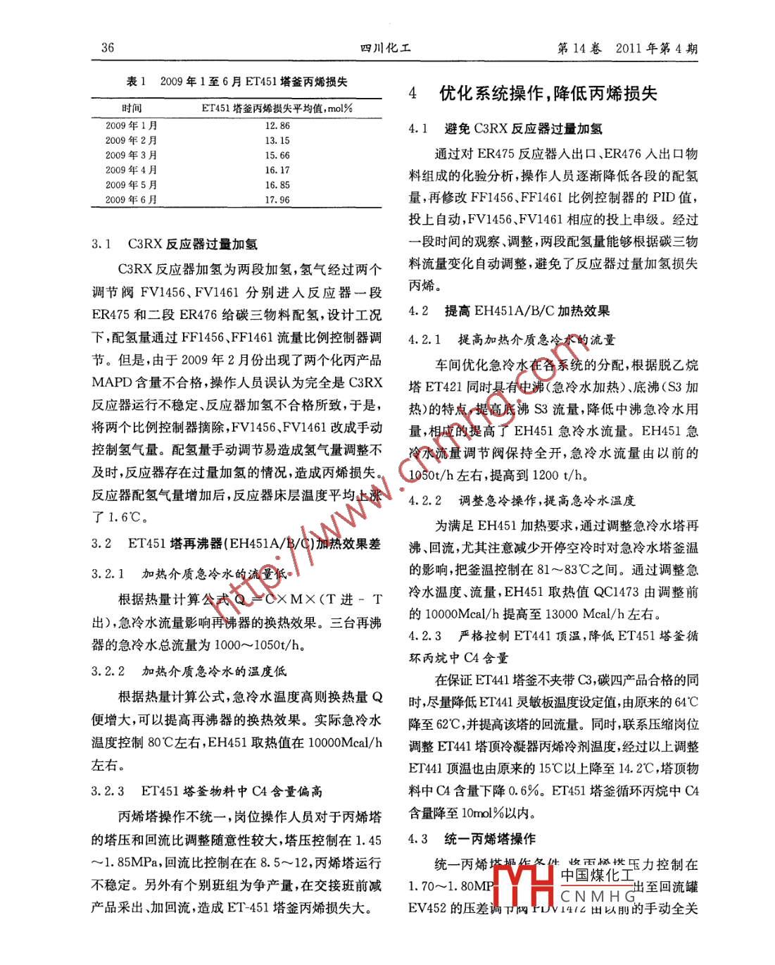 第4期丙烯精餾系統(tǒng)操作的優(yōu)化對(duì)策生產(chǎn)與應(yīng)用Evvvyvvvv丙烯精餾系統(tǒng)操作的優(yōu)化對(duì)策曲曉明(中國(guó)石油大慶石化公司化工一廠,黑龍江省大慶市,163714)摘要針對(duì)大慶老區(qū)乙烯裝置丙烯精餾系統(tǒng)運(yùn)行中岀現(xiàn)的問(wèn)題,對(duì)操作過(guò)程進(jìn)行優(yōu)化調(diào)整,達(dá)到降低丙烯損失的目的。關(guān)鍵詞:丙烯精餾系統(tǒng)操作優(yōu)化降低損失大慶老區(qū)乙烯裝置目前的乙烯生產(chǎn)能力為33萬(wàn)噸/年,丙烯生產(chǎn)能力13萬(wàn)噸/年。作為裂解裝置來(lái)自Er44的主要產(chǎn)品,丙烯產(chǎn)品產(chǎn)量、收率是體現(xiàn)裝置運(yùn)行技脫丙烷塔p不凝氣術(shù)水平及管理水平的重要考核指標(biāo)因此降低加工cR反應(yīng)器E45過(guò)程中丙烯損失是日常生產(chǎn)管理工作的一個(gè)重點(diǎn)??ň郾a(chǎn)品化丙產(chǎn)品1丙烯精餾系統(tǒng)工藝簡(jiǎn)介老區(qū)裝置流程采用的是美國(guó)S&W公司的順序EH45IA/B/C分離流程。其丙烯精餾系統(tǒng)為高壓精餾工藝流循環(huán)丙烷程①。丙烯精餾系統(tǒng)流程簡(jiǎn)圖見(jiàn)圖1。從脫丙烷塔圖1丙烯精餾系統(tǒng)流程簡(jiǎn)圖(ET441)塔頂出來(lái)的碳三組份通過(guò)兩段加氫反應(yīng)器(簡(jiǎn)稱為C3RX反應(yīng)器)除去甲基乙炔(MA)丙二烯(PD),進(jìn)入丙烯汽提塔(ET473),最后進(jìn)入丙矯2丙烯精餾系統(tǒng)運(yùn)行狀況精餾塔。丙烯塔由串聯(lián)兩塔組成,1#丙烯塔目前裂解裝置的運(yùn)行管理方式為三年一檢修。(ET451)塔釜釆出循環(huán)丙烷去裂解爐,2#丙烯塔2007年7月,裝置進(jìn)行了為期一個(gè)月的大檢修。8(ET452)塔頂采出的是純度為99.50mo%的聚合月裝置開(kāi)工后運(yùn)行一年半的時(shí)間里,即到2009年級(jí)丙烯產(chǎn)品、第145層塔盤(pán)側(cè)線釆出的是純度為月,裝置丙烯產(chǎn)量、收率穩(wěn)定,1#丙烯塔ET451塔95.0ml%的化學(xué)級(jí)丙烯產(chǎn)品,聚丙、化丙采出比例釜丙烯損失在設(shè)計(jì)值15mo%以內(nèi)。從2009年可根據(jù)實(shí)際生產(chǎn)需要進(jìn)行調(diào)整。因?yàn)樵?5C下,丙月開(kāi)始,丙烯精餾系統(tǒng)丙烯損失增加,在相同的裂解烯飽和蒸氣壓為1.8MPa,丙烷飽和蒸氣壓為爐進(jìn)料量和COT下,丙烯收率逐漸下降,到6月份1.52MPa,所以丙烯與丙烷的相對(duì)揮發(fā)度接近1,較ET451塔釜丙烯損失逐漸增大至18.0mol%左右。難分離(2。因此,丙烯塔具有回流比大、塔盤(pán)數(shù)多的化驗(yàn)分析數(shù)據(jù)如中國(guó)煤化工特點(diǎn)。兩個(gè)丙烯塔共有188層塔盤(pán),全部為組合導(dǎo)向式高效浮悶塔盤(pán)。3丙烯損爿CNMHG四川化工第14卷2011年第4期表12009年1至6月ET451塔釜丙烯損失4優(yōu)化系統(tǒng)操作,降低丙烯損失時(shí)間Er451塔釜丙烯損失平均值,mol%009年141避免C3RX反應(yīng)器過(guò)量加氫2009年2月13.152009年3月15.66通過(guò)對(duì)ER75反應(yīng)器入出口、ER476入出口物009年4月16.172009年5月16.85料組成的化驗(yàn)分析,操作人員逐漸降低各段的配氫2009年6月量,再修改FF1456、FF1461比例控制器的PID值投上自動(dòng),FV1456、FV1461相應(yīng)的投上串級(jí)。經(jīng)過(guò)3.1C3RX反應(yīng)器過(guò)量加氫段時(shí)間的觀察、調(diào)整,兩段配氫量能夠根據(jù)碳三物G3RX反應(yīng)器加氫為兩段加氫,氫氣經(jīng)過(guò)兩個(gè)料流量變化自動(dòng)調(diào)整,避免了反應(yīng)器過(guò)量加氫損失調(diào)節(jié)閥FV1456、FV1461分別進(jìn)入反應(yīng)器一段丙烯。ER75和二段ER476給碳三物料配氫,設(shè)計(jì)工況4.2提高EH451A/B/C加熱效果下,配氫量通過(guò)FF1456、FF1461流量比例控制器調(diào)4.2.1提高加熱介質(zhì)急冷水的流量節(jié)。但是,由于2009年2月份出現(xiàn)了兩個(gè)化丙產(chǎn)品車(chē)間優(yōu)化急冷水在各系統(tǒng)的分配,根據(jù)脫乙烷MAPD含量不合格,操作人員誤認(rèn)為完全是C3RX塔ET421同時(shí)具有中沸(急冷水加熱)、底沸(S3加反應(yīng)器運(yùn)行不穩(wěn)定、反應(yīng)器加氫不合格所致,于是,熱)的特點(diǎn)提高底沸S3流量,降低中沸急冷水用將兩個(gè)比例控制器摘除,FV1456、FV1461改成手動(dòng)量,相應(yīng)的提高了EH451急冷水流量。EH451急控制氫氣量。配氫量手動(dòng)調(diào)節(jié)易造成氫氣量調(diào)整不冷水流量調(diào)節(jié)閥保持全開(kāi),急冷水流量由以前的及時(shí),反應(yīng)器存在過(guò)量加氫的情況造成丙烯損失。1050t/h左右,提高到1200t/h。反應(yīng)器配氫氣量增加后,反應(yīng)器床層溫度平均上漲4.2.2調(diào)整急冷操作,提高急冷水溫度了1.6C。為滿足EH451加熱要求,通過(guò)調(diào)整急冷水塔再3.2EI451塔再沸器(EH45A/B/C)加熱效果差沸、回流,尤其注意減少開(kāi)停空冷時(shí)對(duì)急冷水塔釜溫3.2.1加熱介質(zhì)急冷水的流量低的影響,把釜溫控制在81~83℃之間。通過(guò)調(diào)整急根據(jù)熱量計(jì)算公式Q=CXMX(T進(jìn)-T冷水溫度、流量,EH451取熱值QC1473由調(diào)整前出),急冷水流量影響再沸器的換熱效果。三臺(tái)再涕的1000Mca/h提高至13000Mca/h左右。器的急冷水總流量為1000~1050t/h4.2.3嚴(yán)格控制ET441頂溫,降低ET451塔釜循環(huán)丙烷中C4含量3.2.2加熱介質(zhì)急冷水的溫度低在保證ET44塔釜不夾帶C3,碳四產(chǎn)品合格的同根據(jù)熱量計(jì)算公式